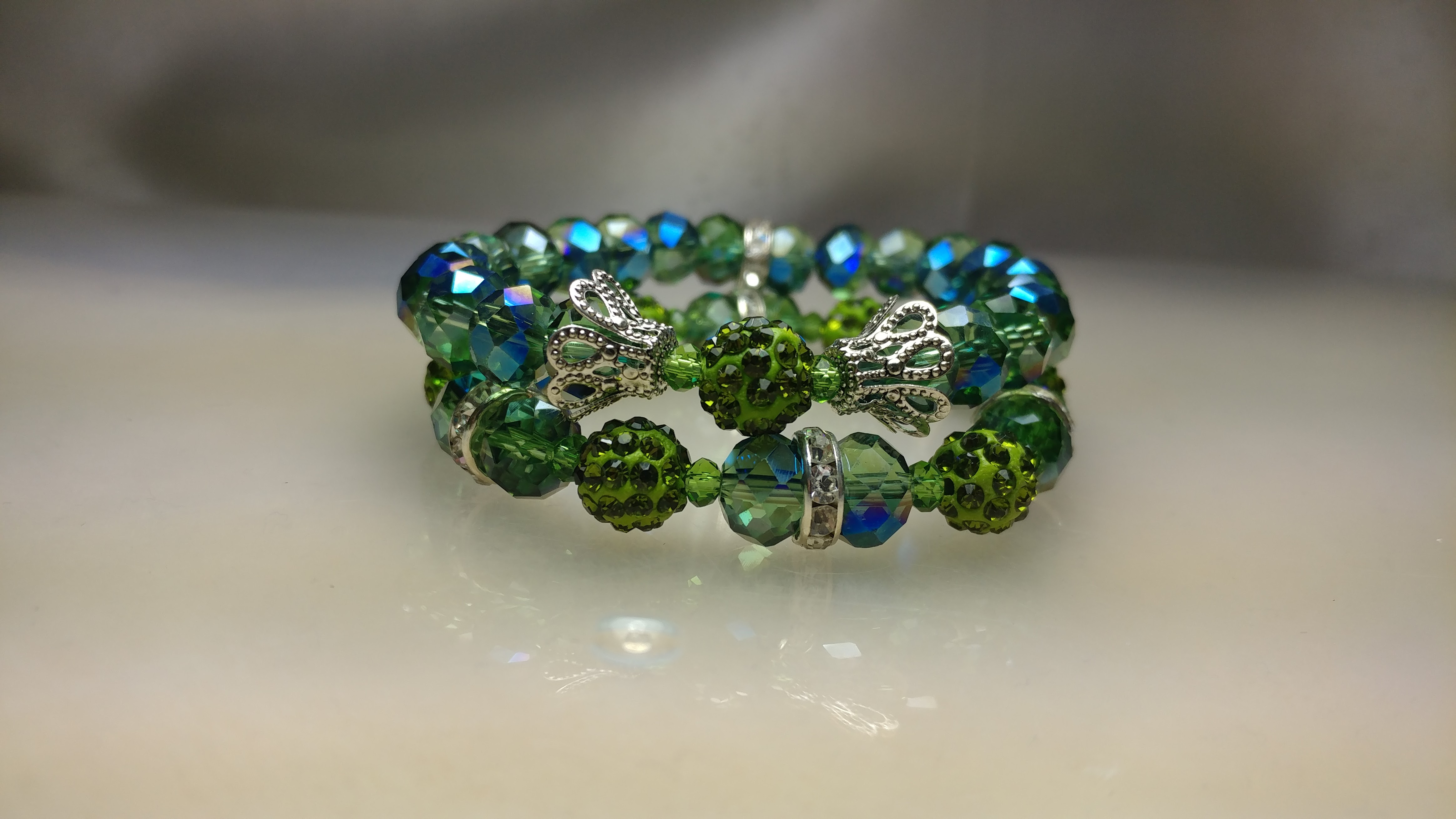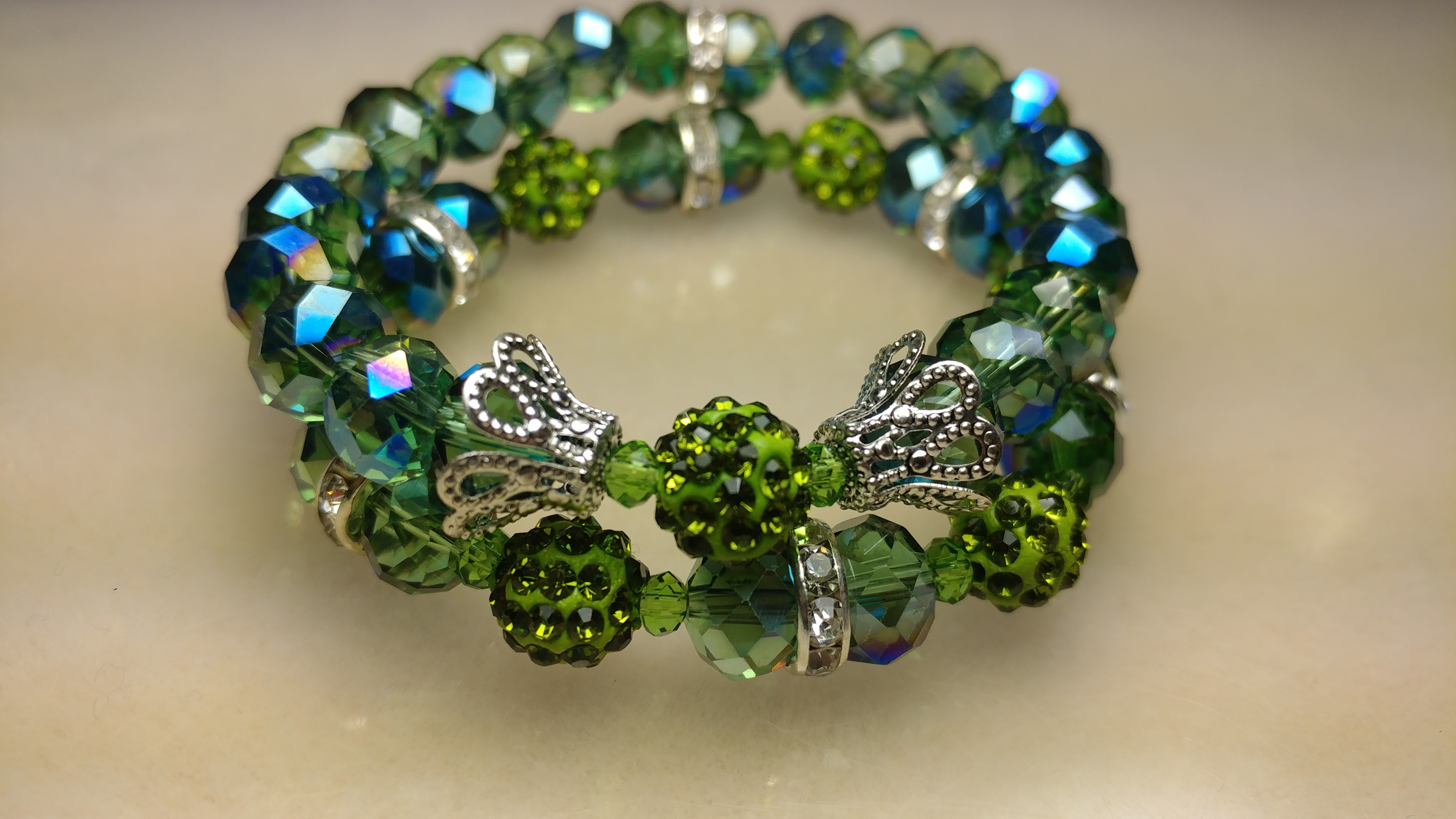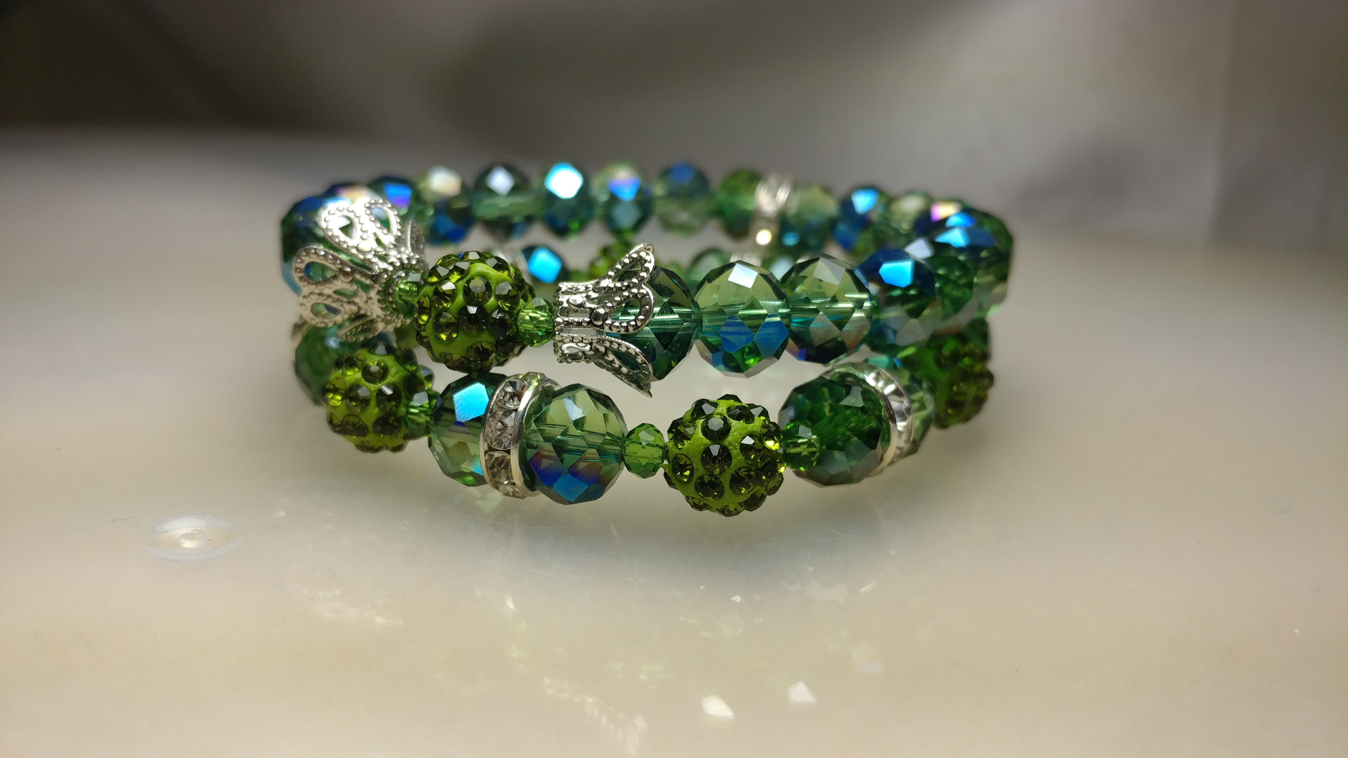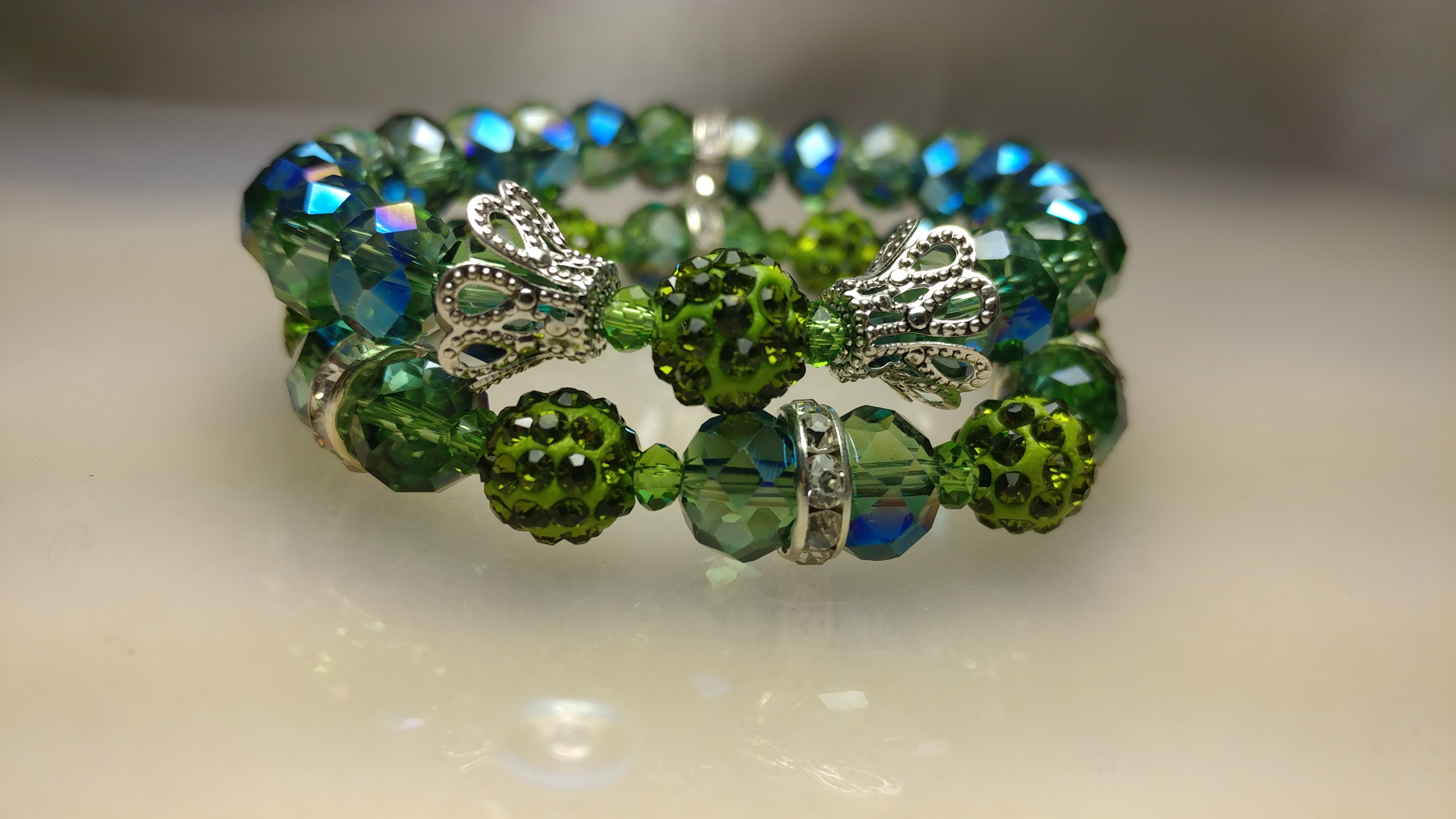 Made with green multicolored glass crystals and pave rhinestone beads, with silver bead cones and rhinestone spacers on a stretchy string