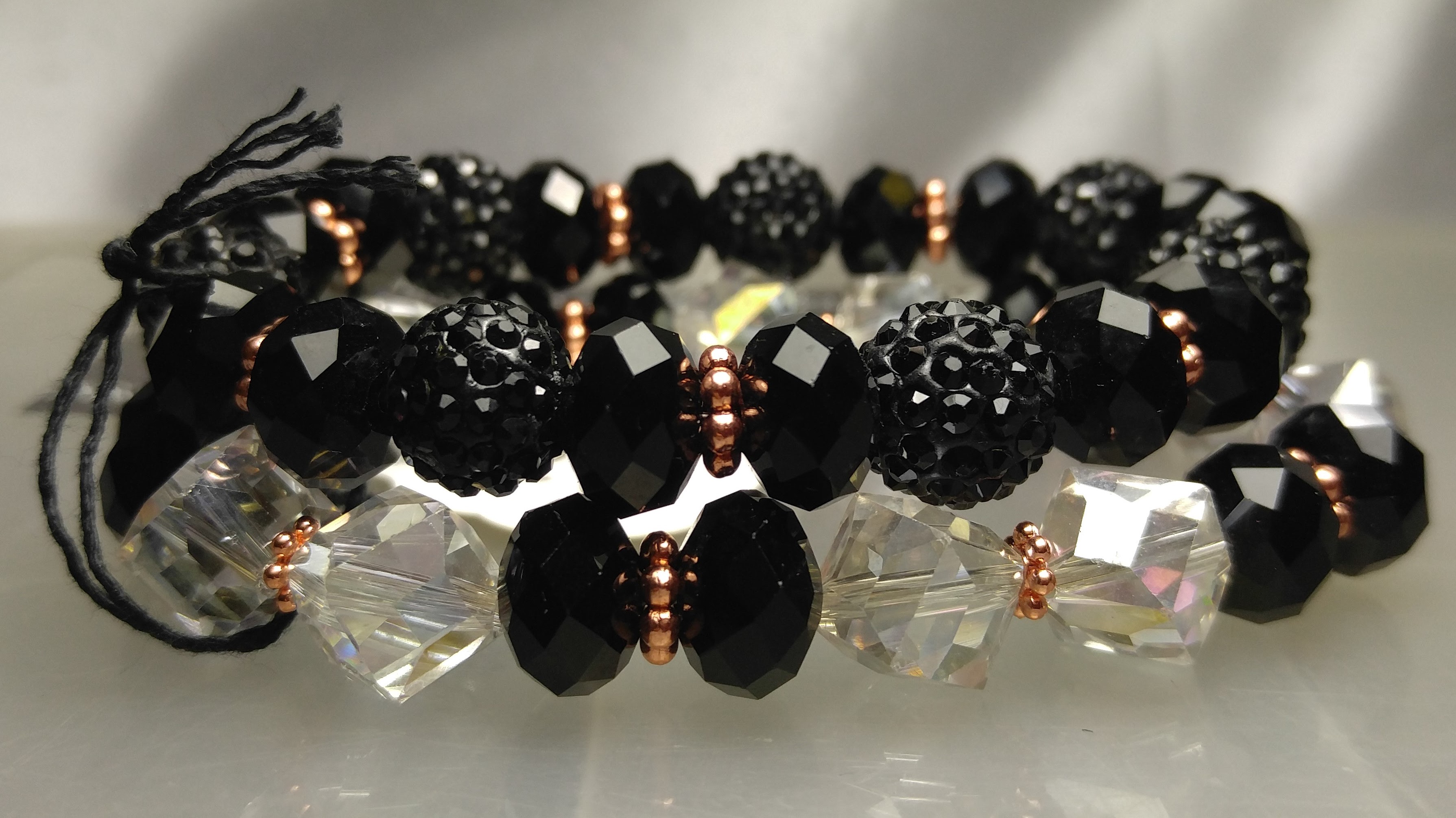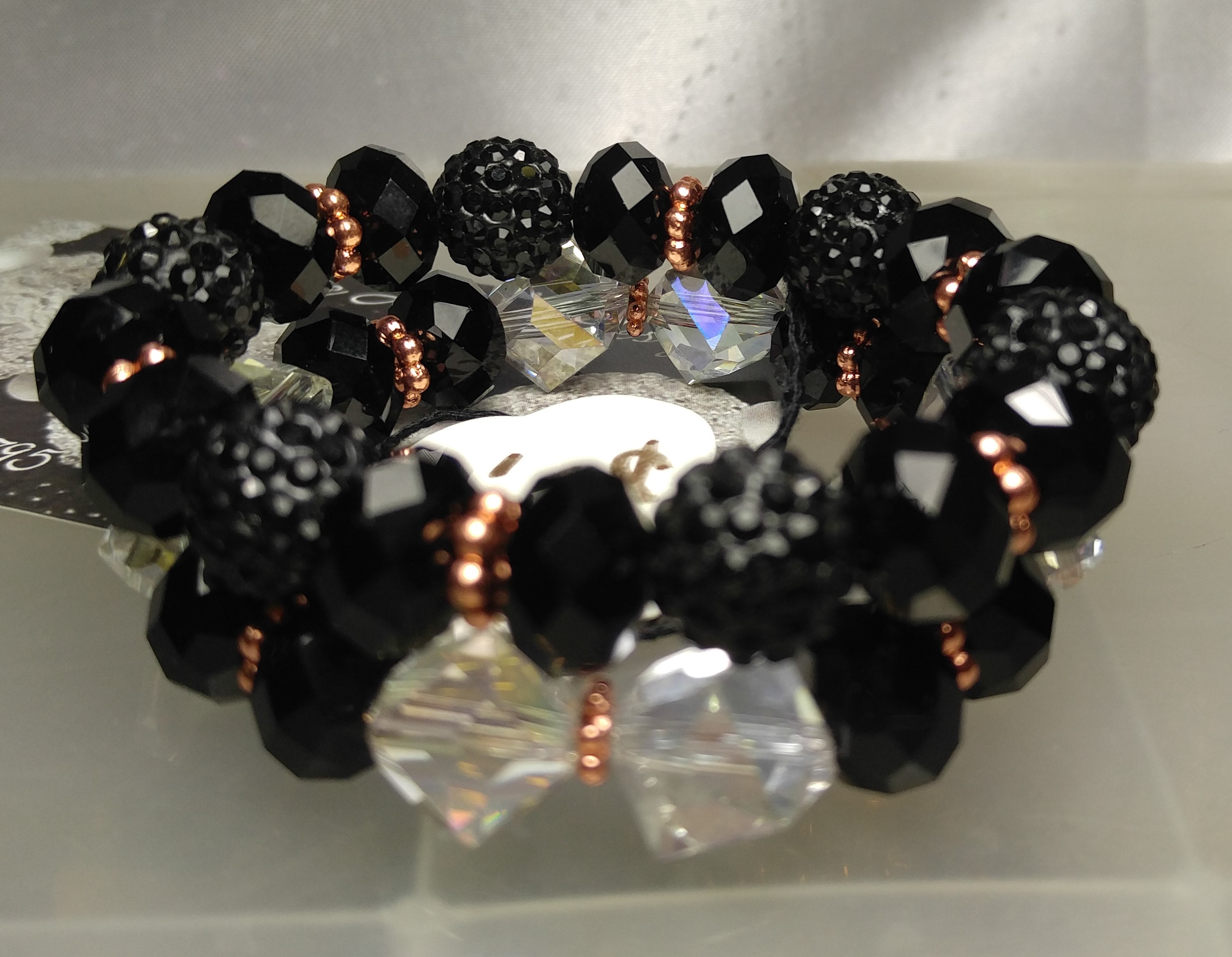 Made with black and clear crystal beads and black rhinestone paved beads and spaced with metal rose gold spacers on a stretchy cord.