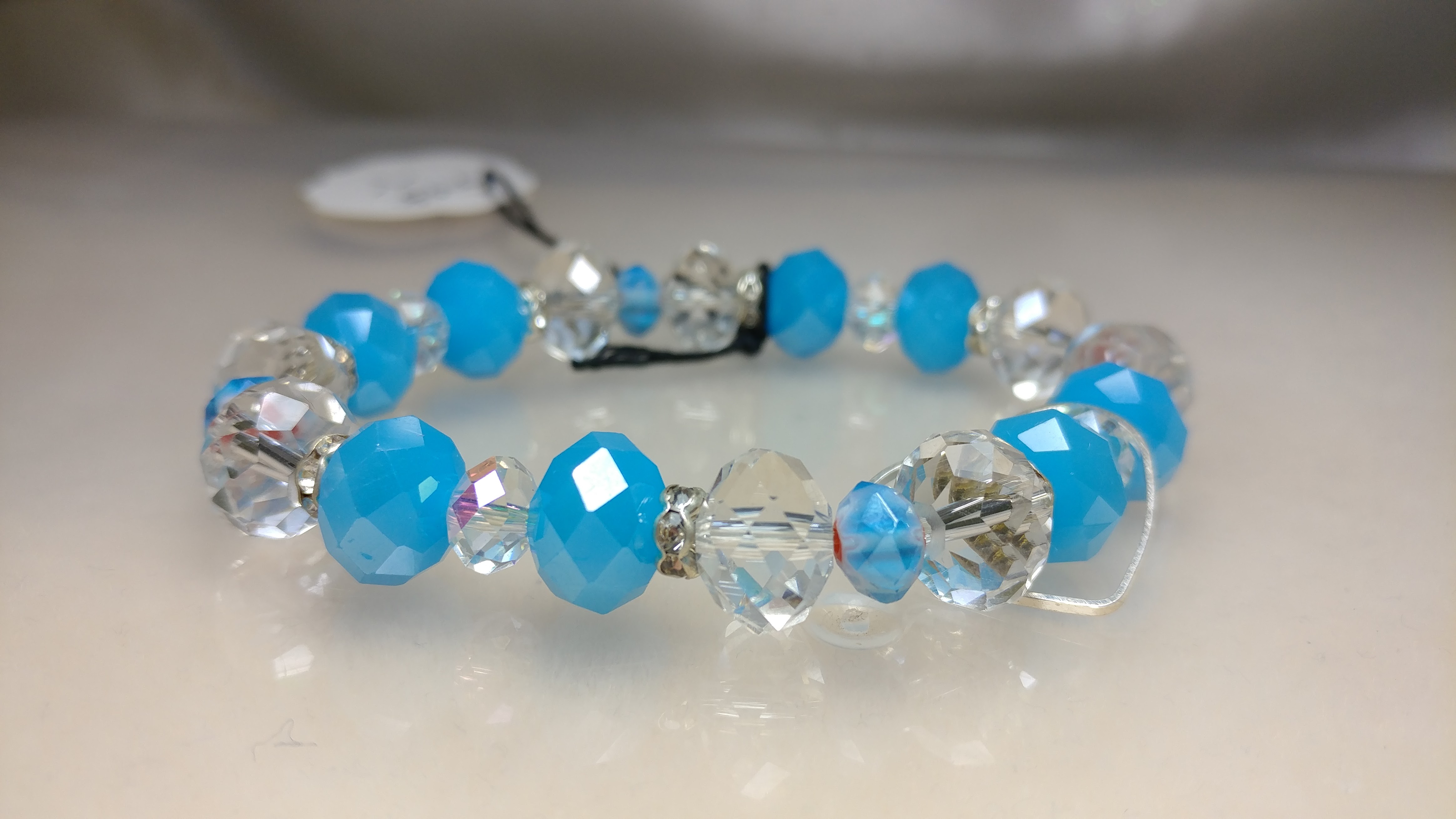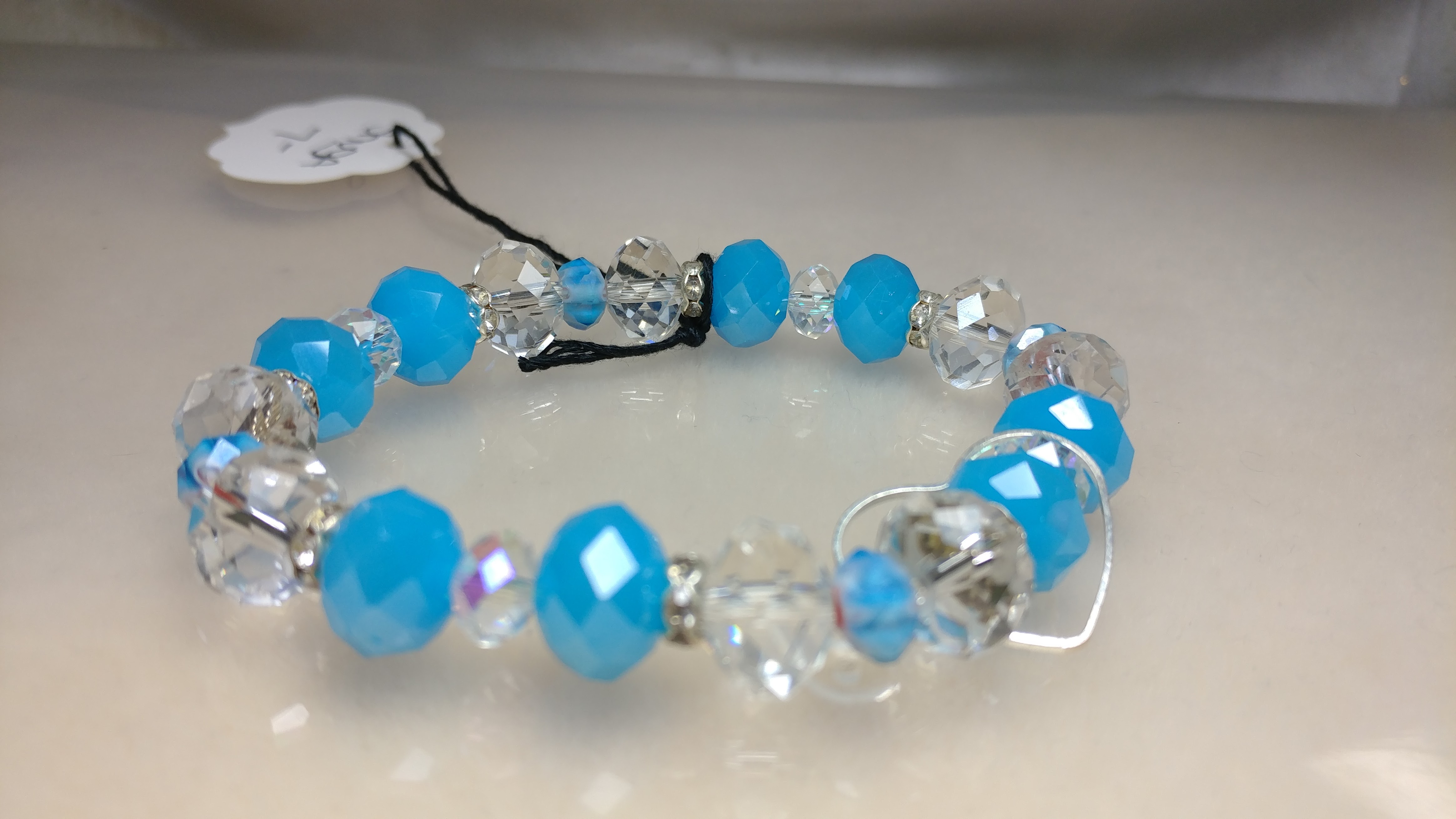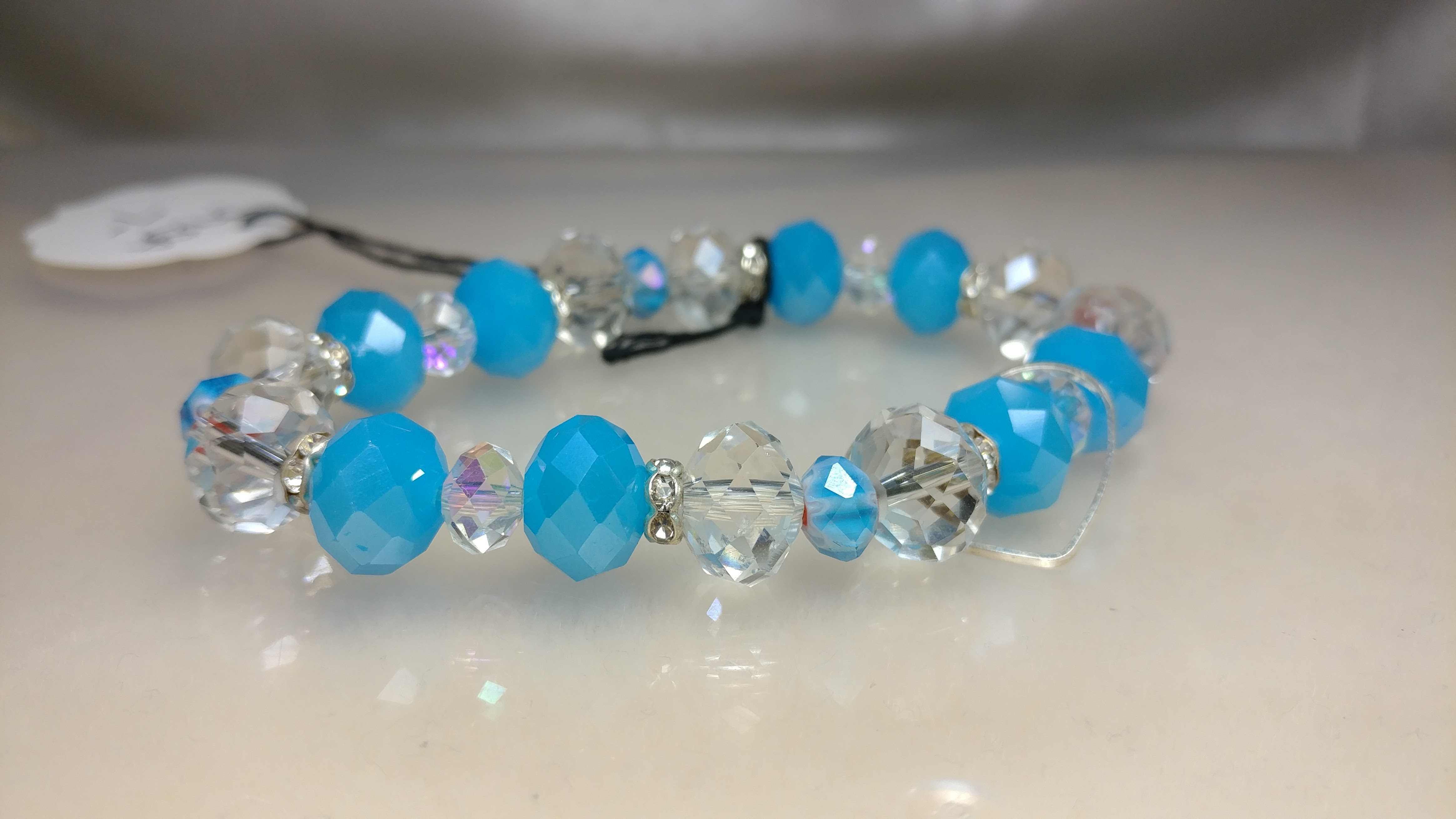 Made with blue and clear glass crystal bead, silver rhinestone spacers on a stretchy cord.