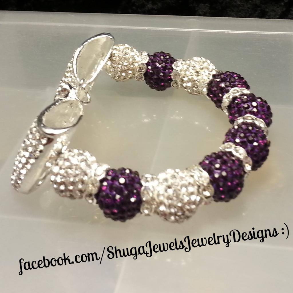 Made with a large rhinestone silver toned bow pair with purple and white rhinestone pave beads on a stretchy string.