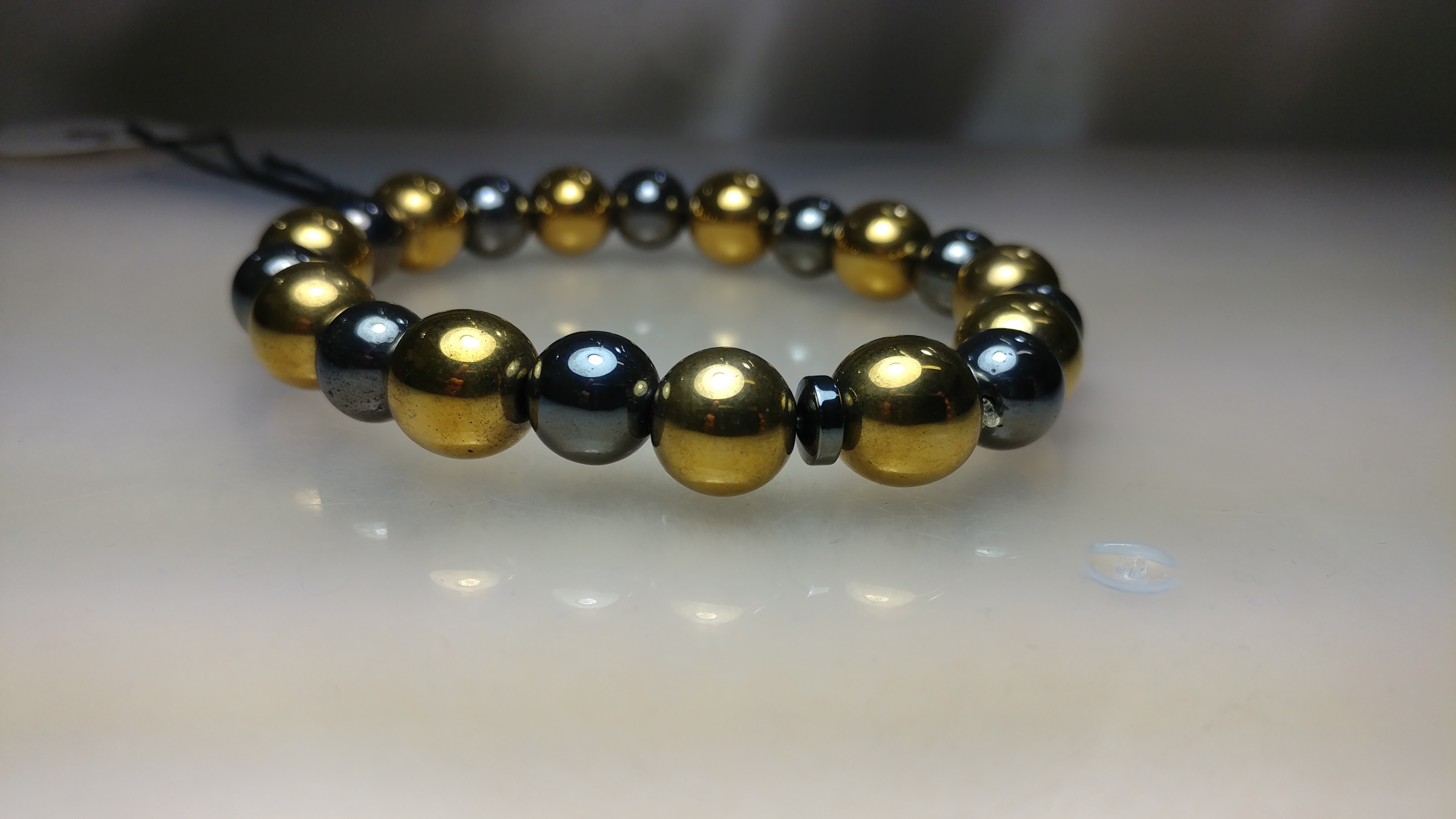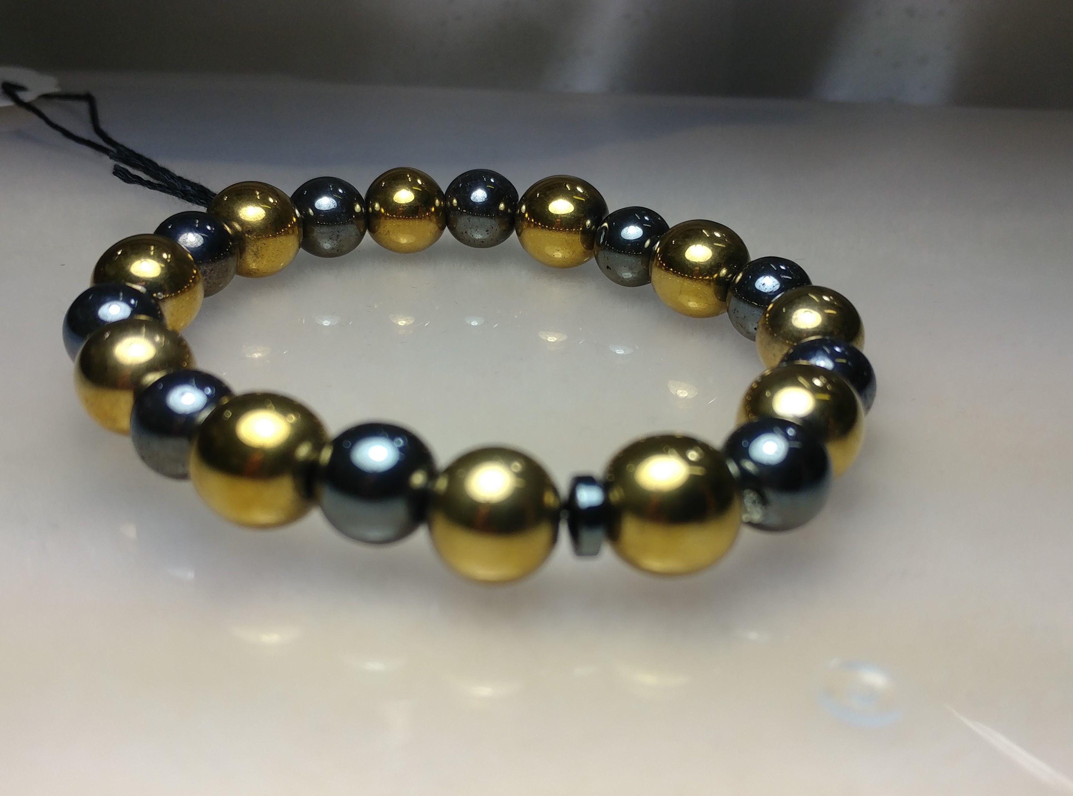 Made with Gold Tone and Gunmetal colored hematite beaded men bracelet on stretchy string