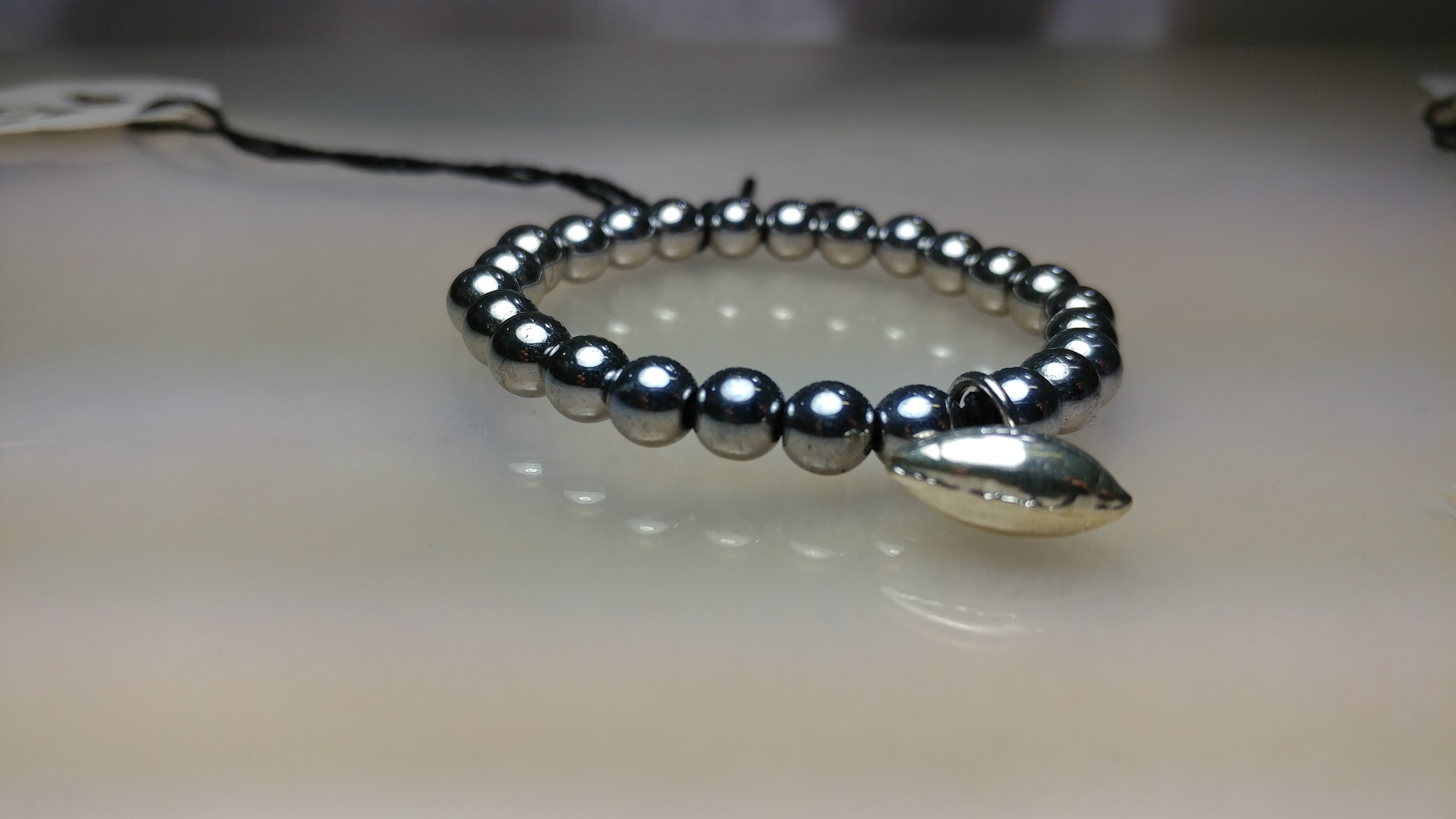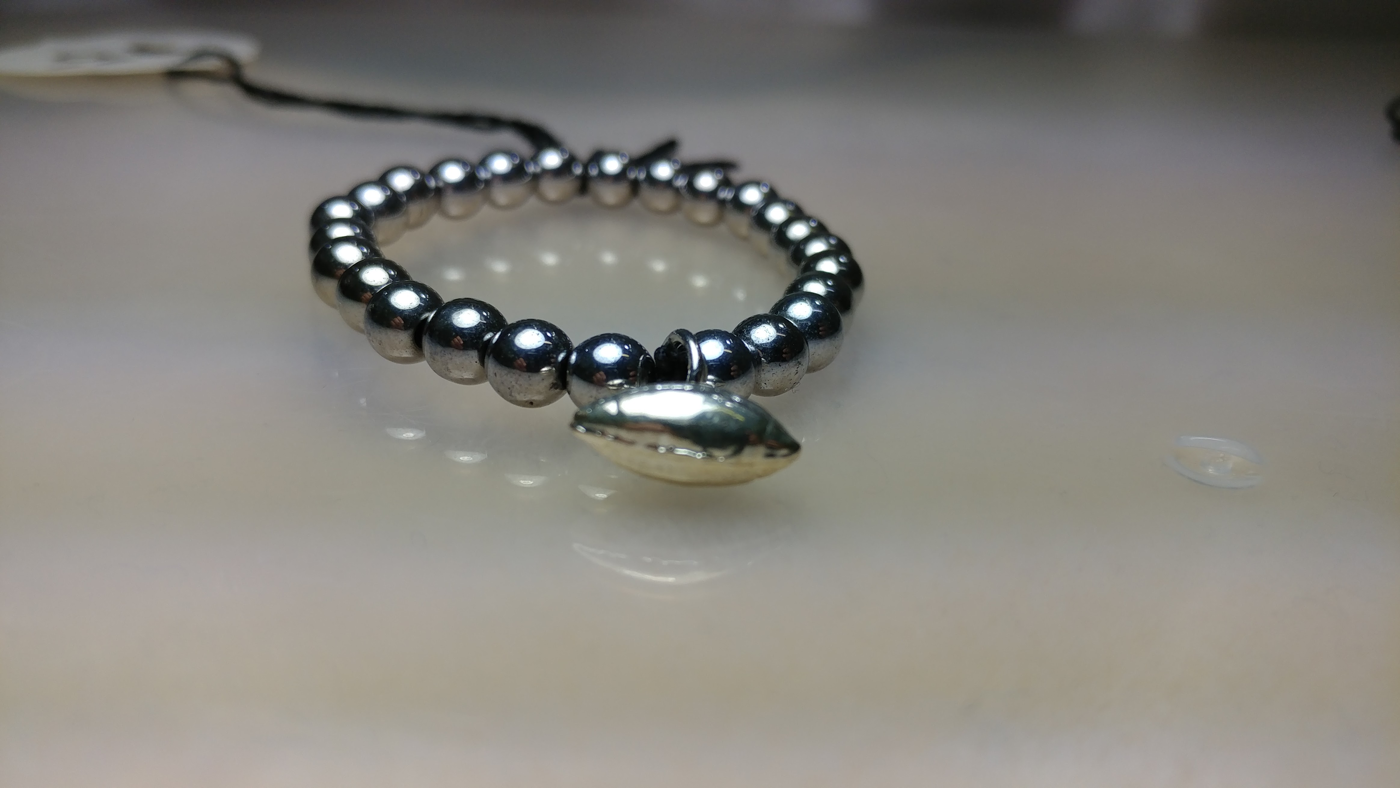 Made with 8 mm hematite beads with silver football charm on a stretchy string cord