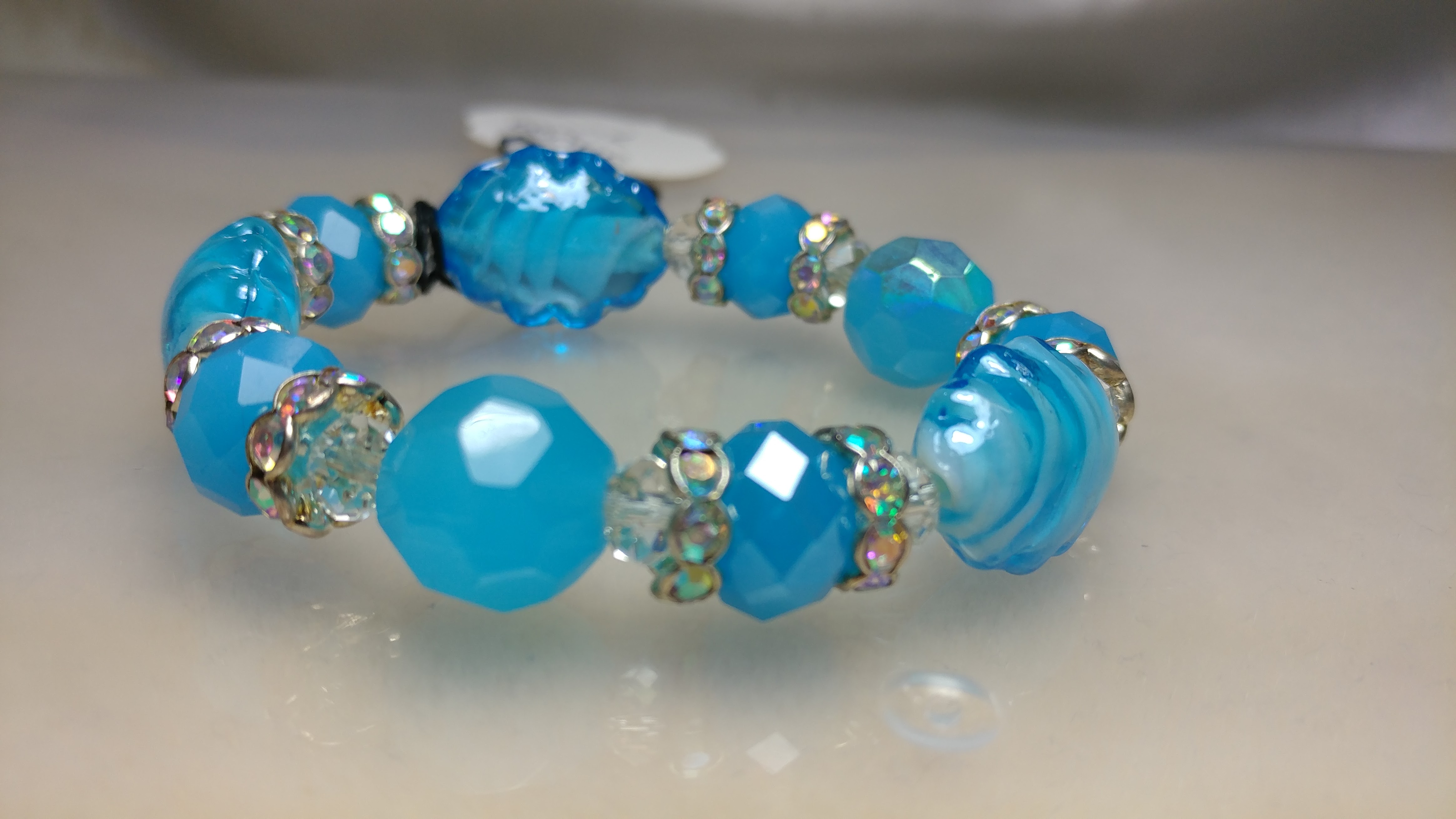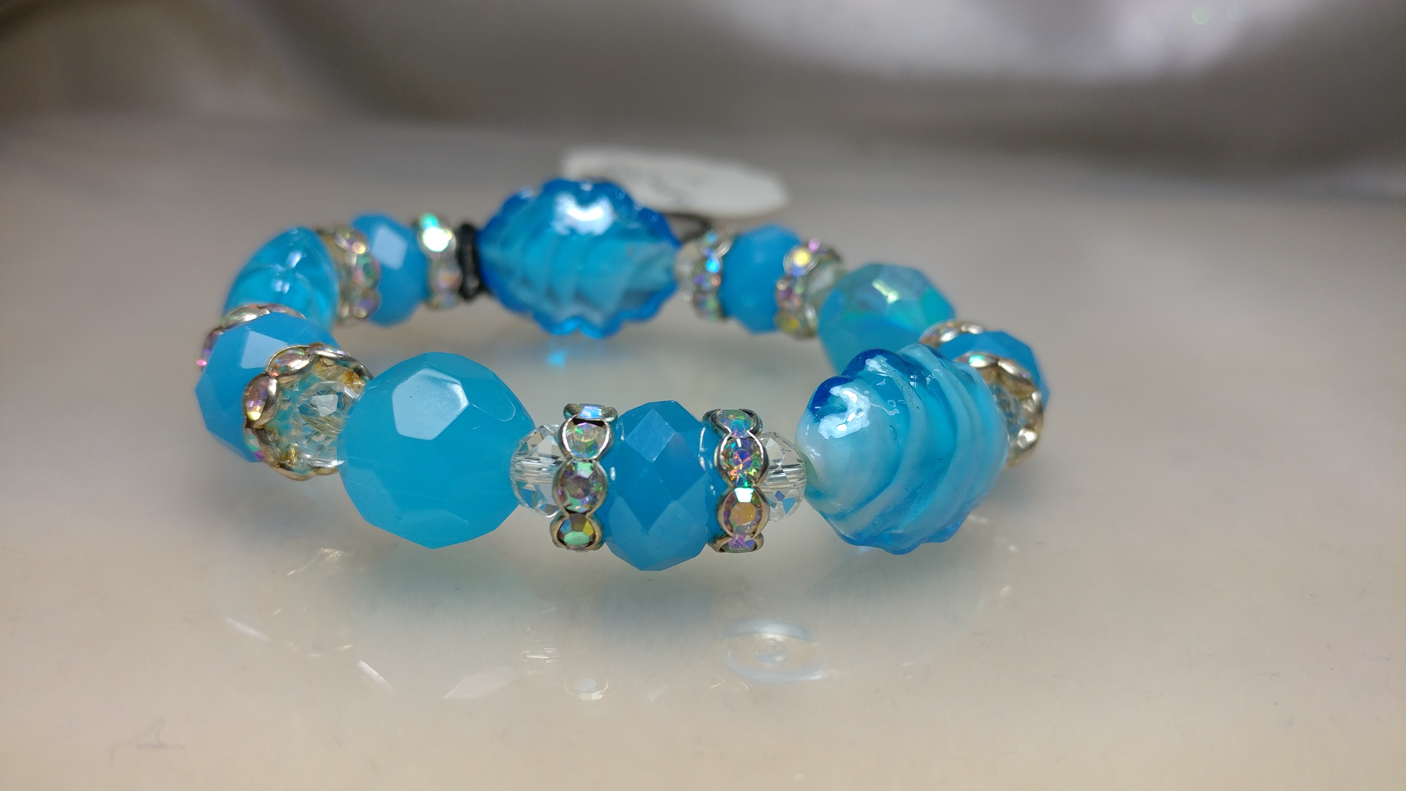 Made with Blue and Clear glass crystal bead with rhinestone spacers on a stretchy cord