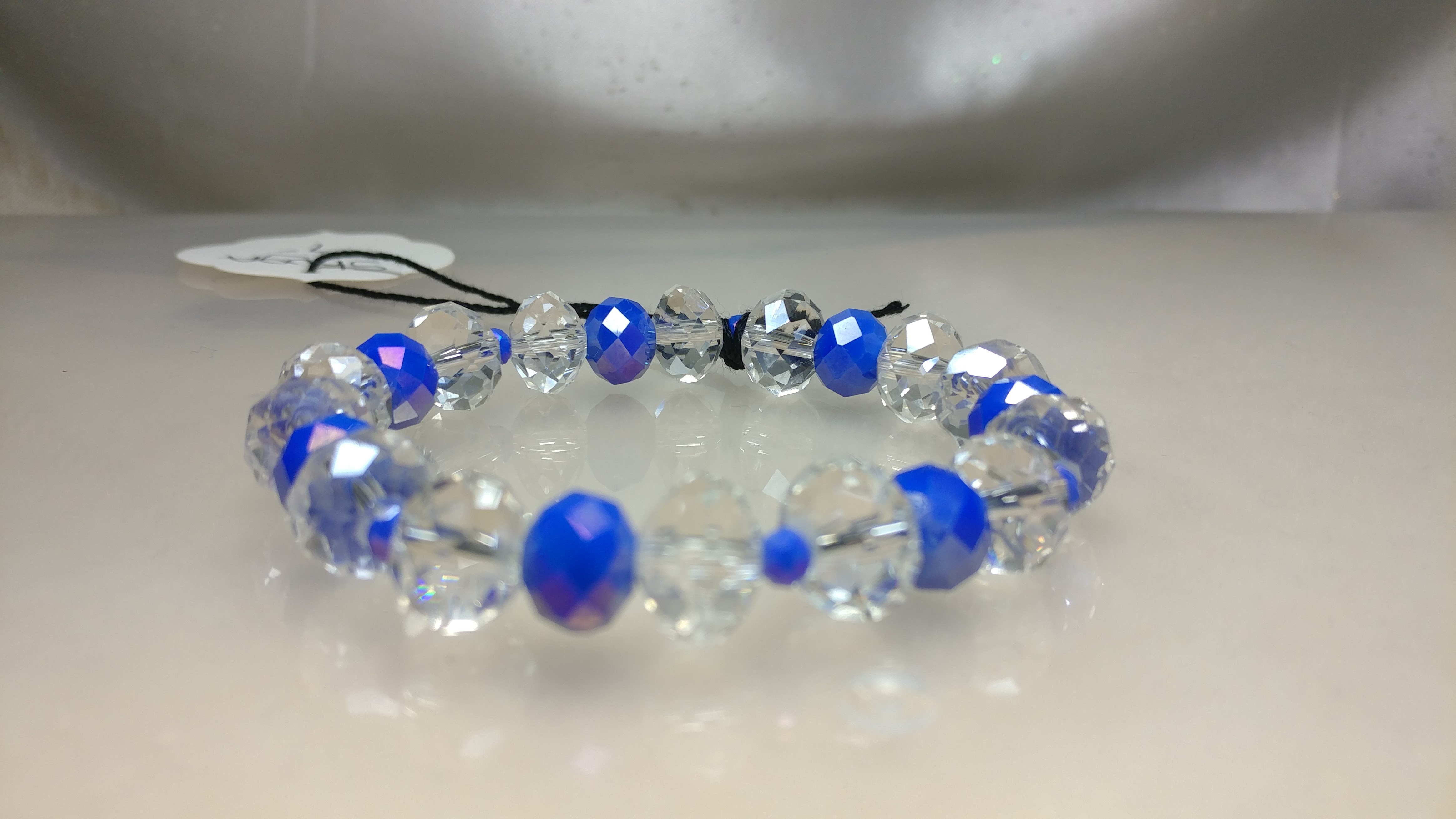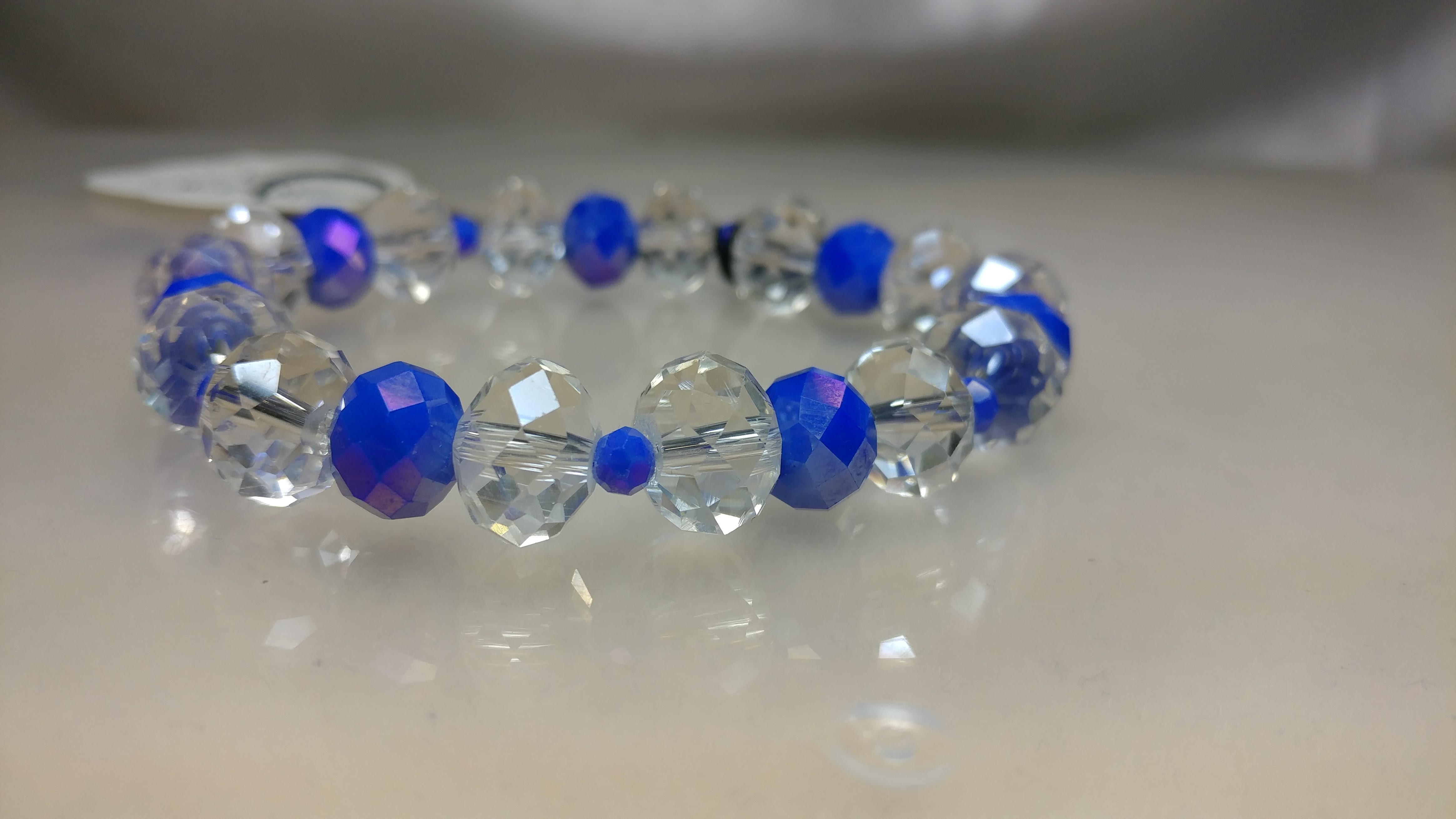Made with Blue and Clear glass crystal bead on a stretch cord