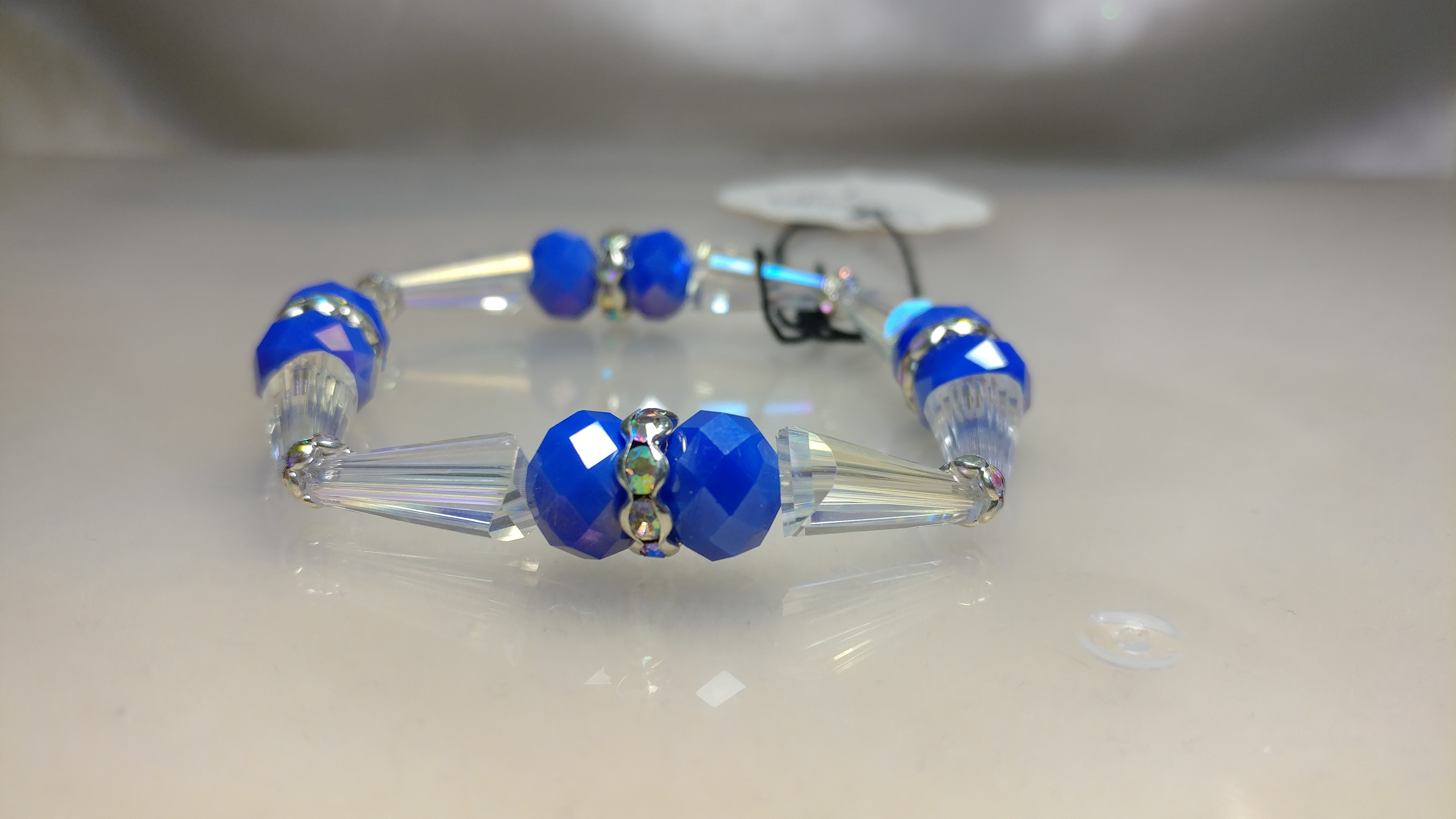 Made with Blue and Clear glass crystal bead and silver AB rhinestone spacers on a stretch cord