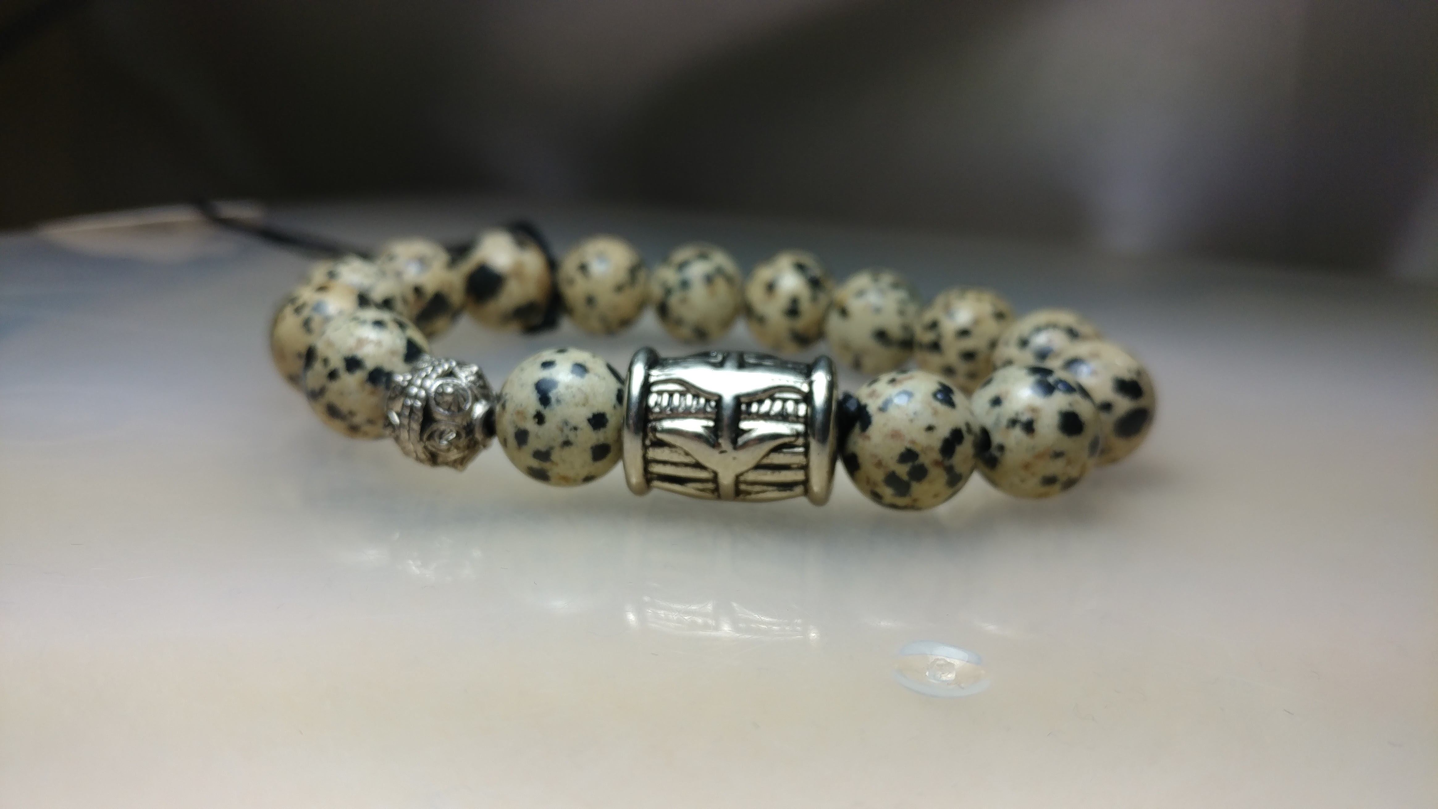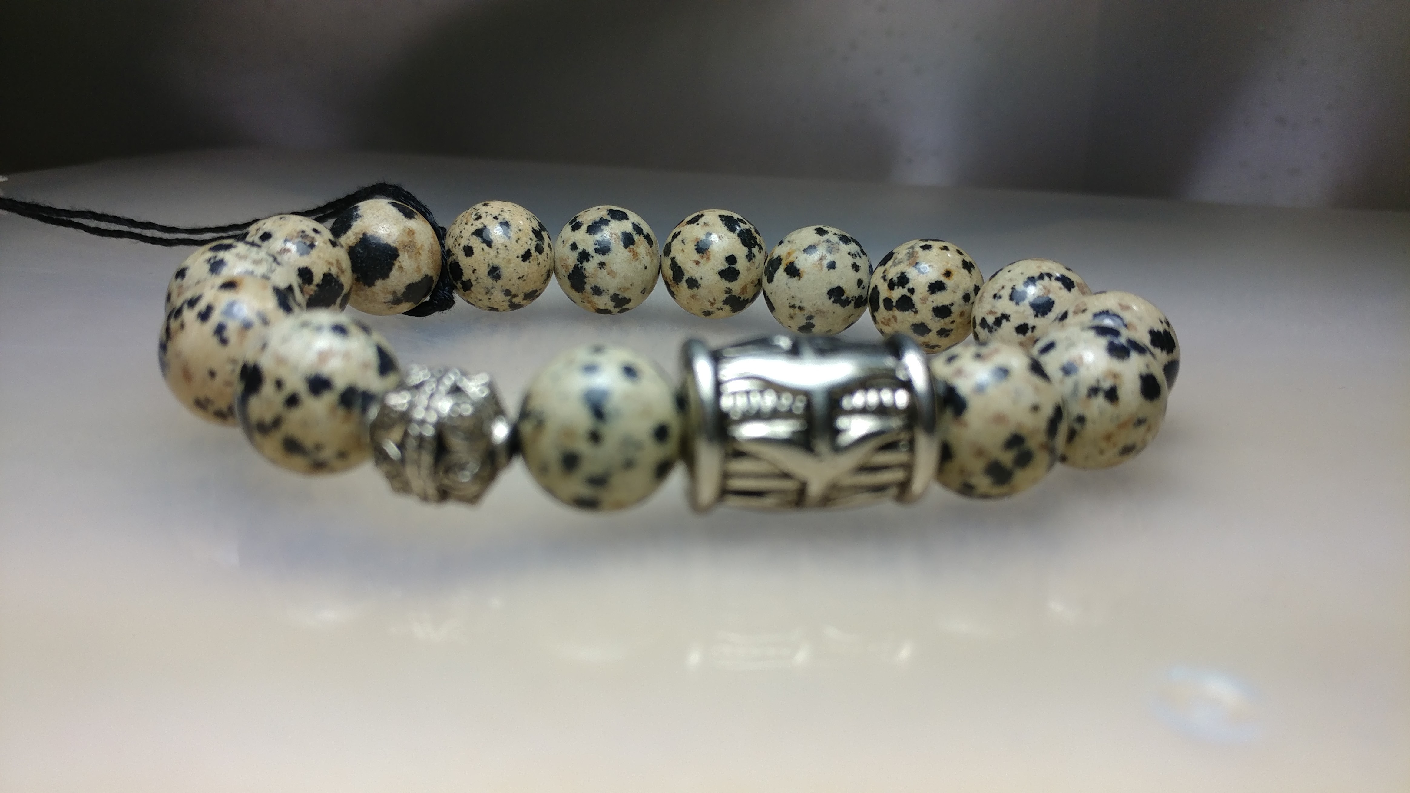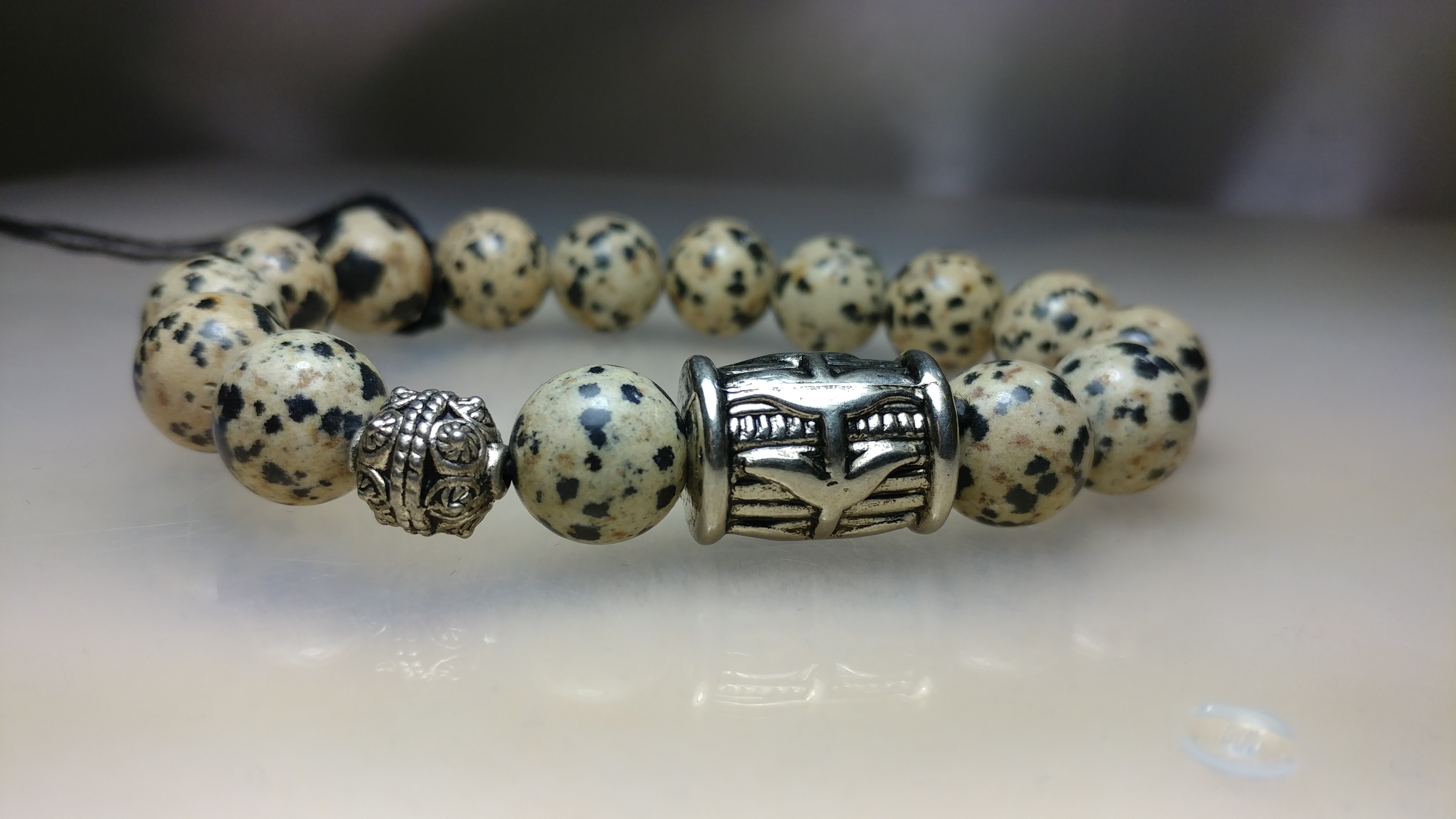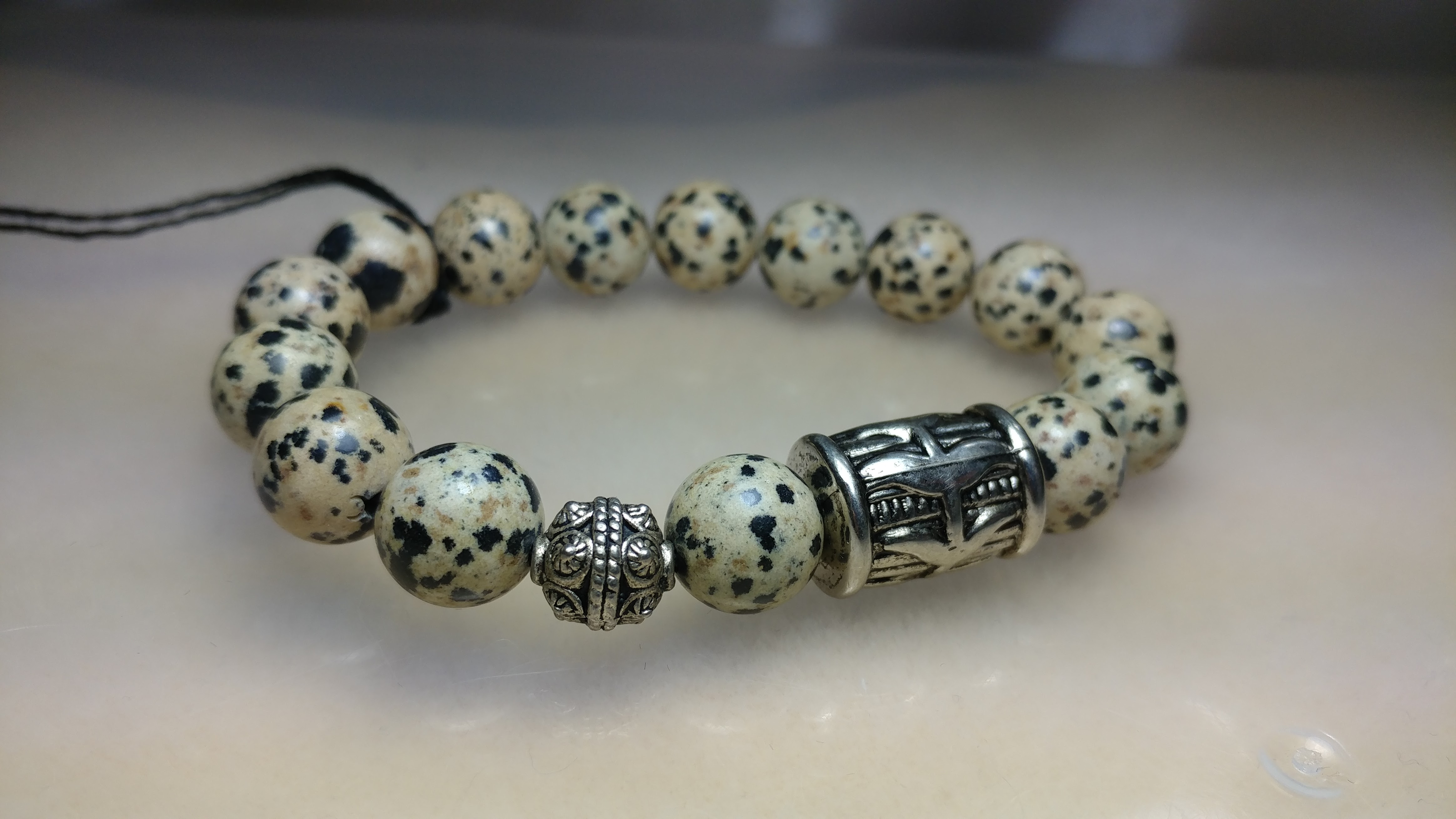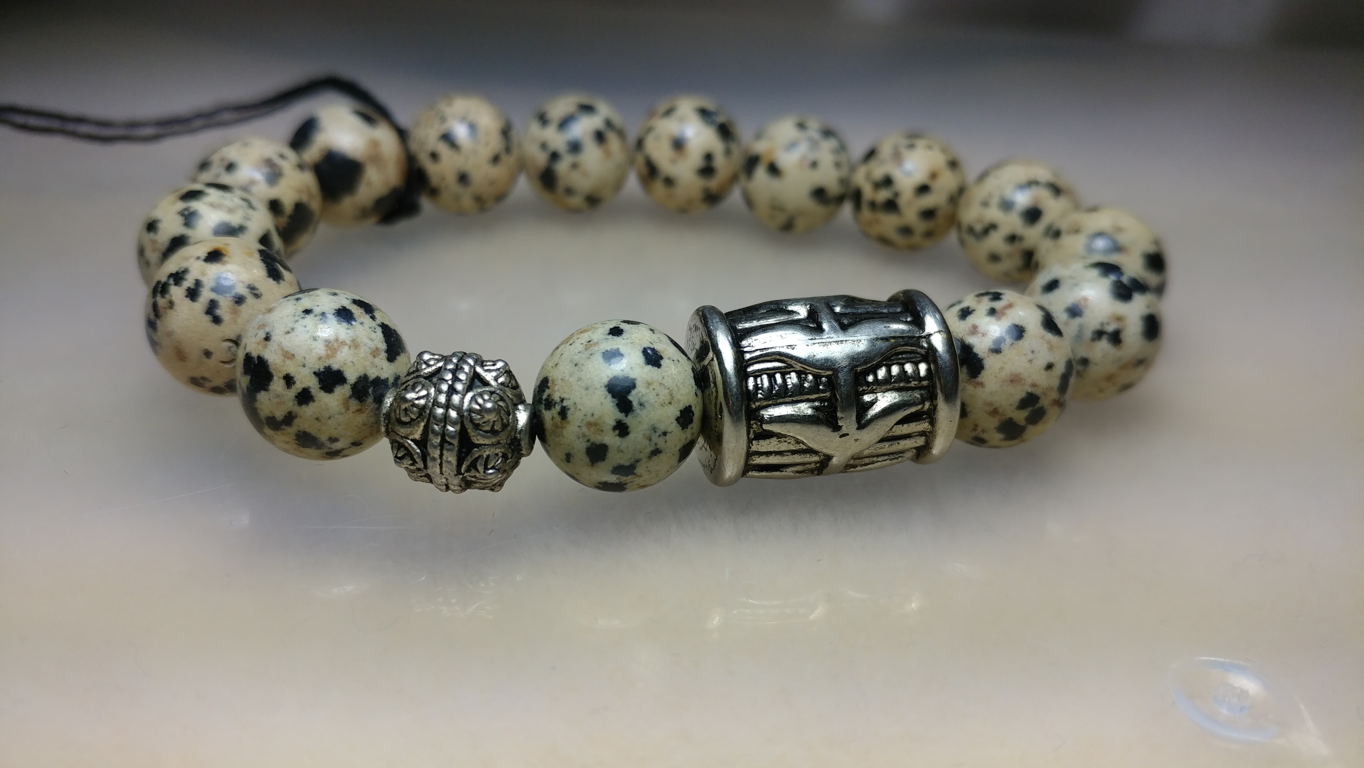 Men's 12mm Gemstone-Jasper Bead, Pair with silver toned acrylic beads on a clear stretchy string.