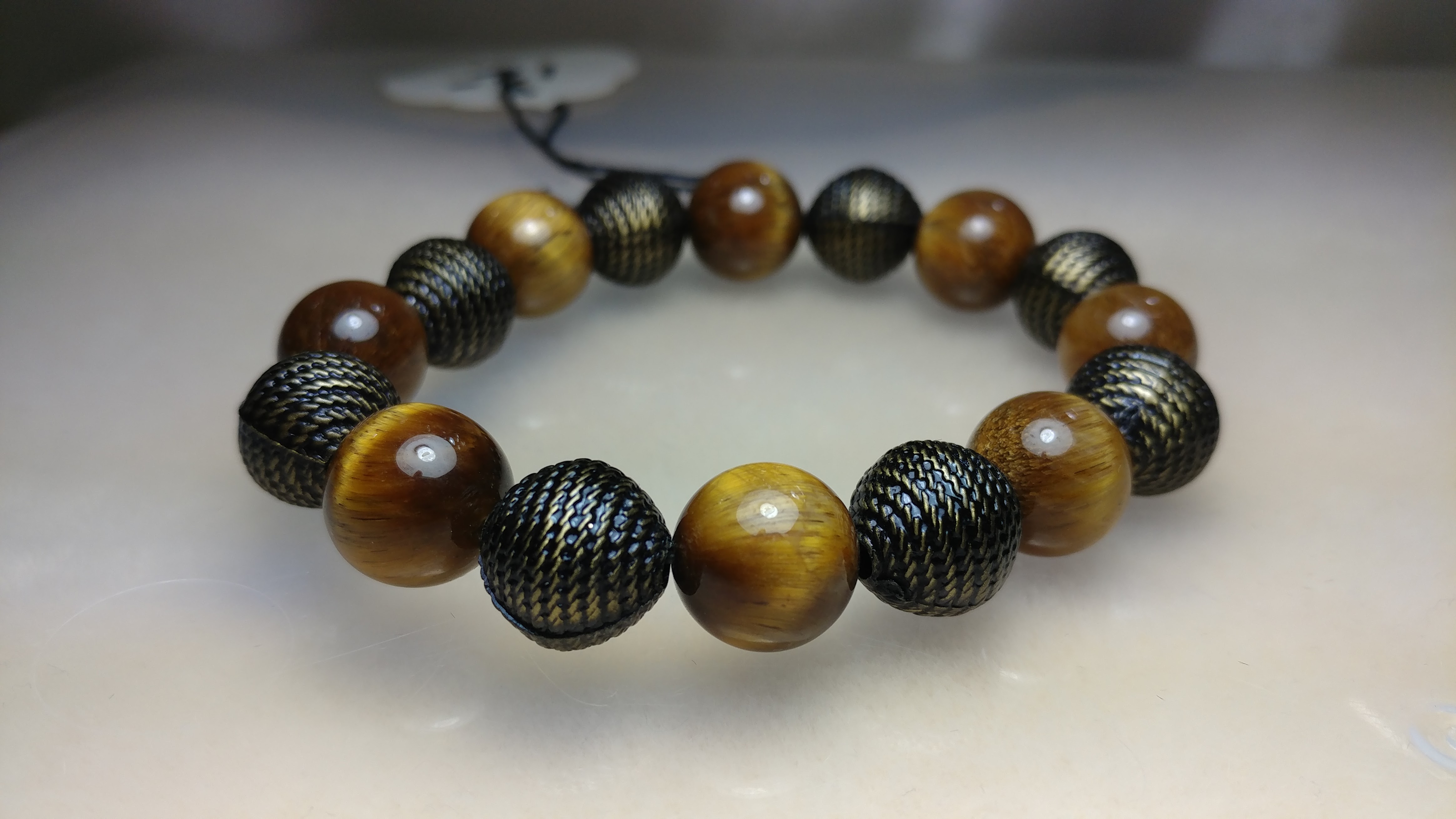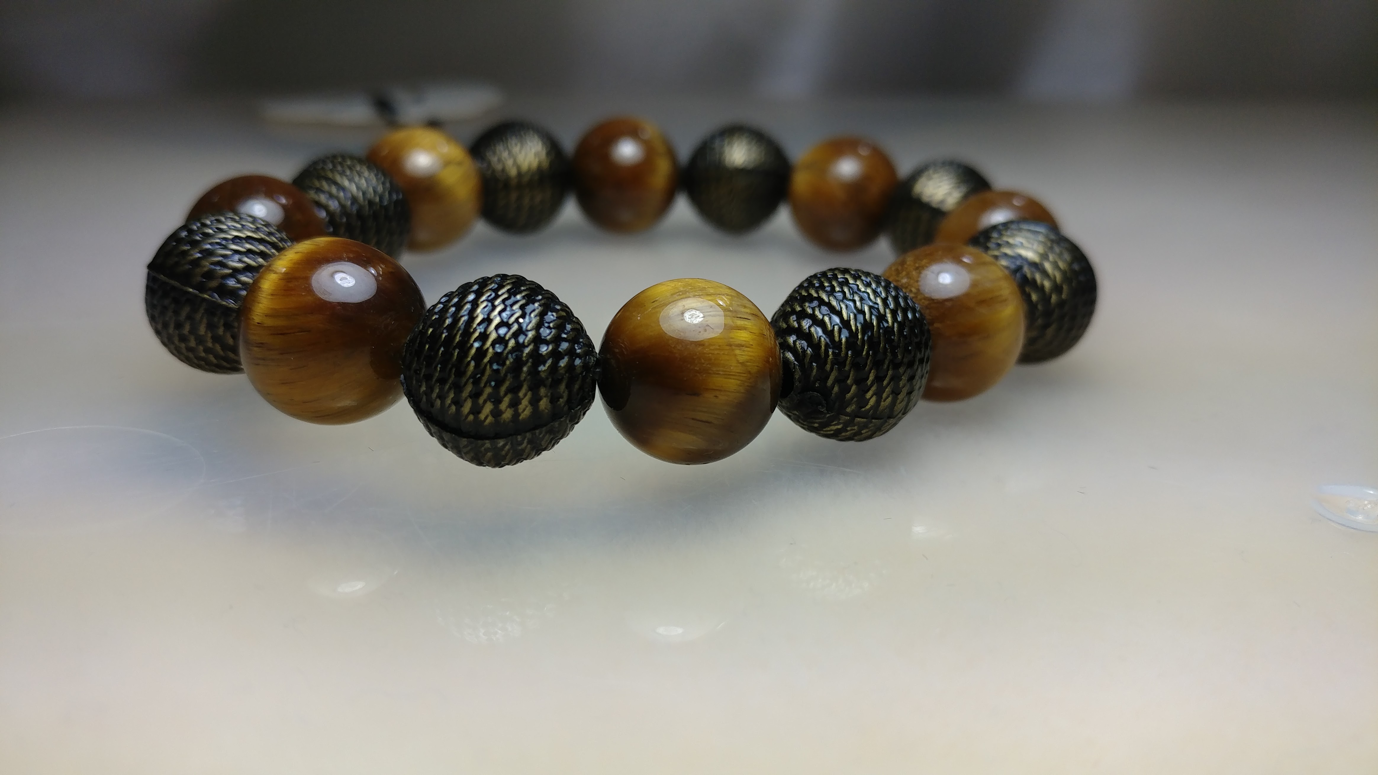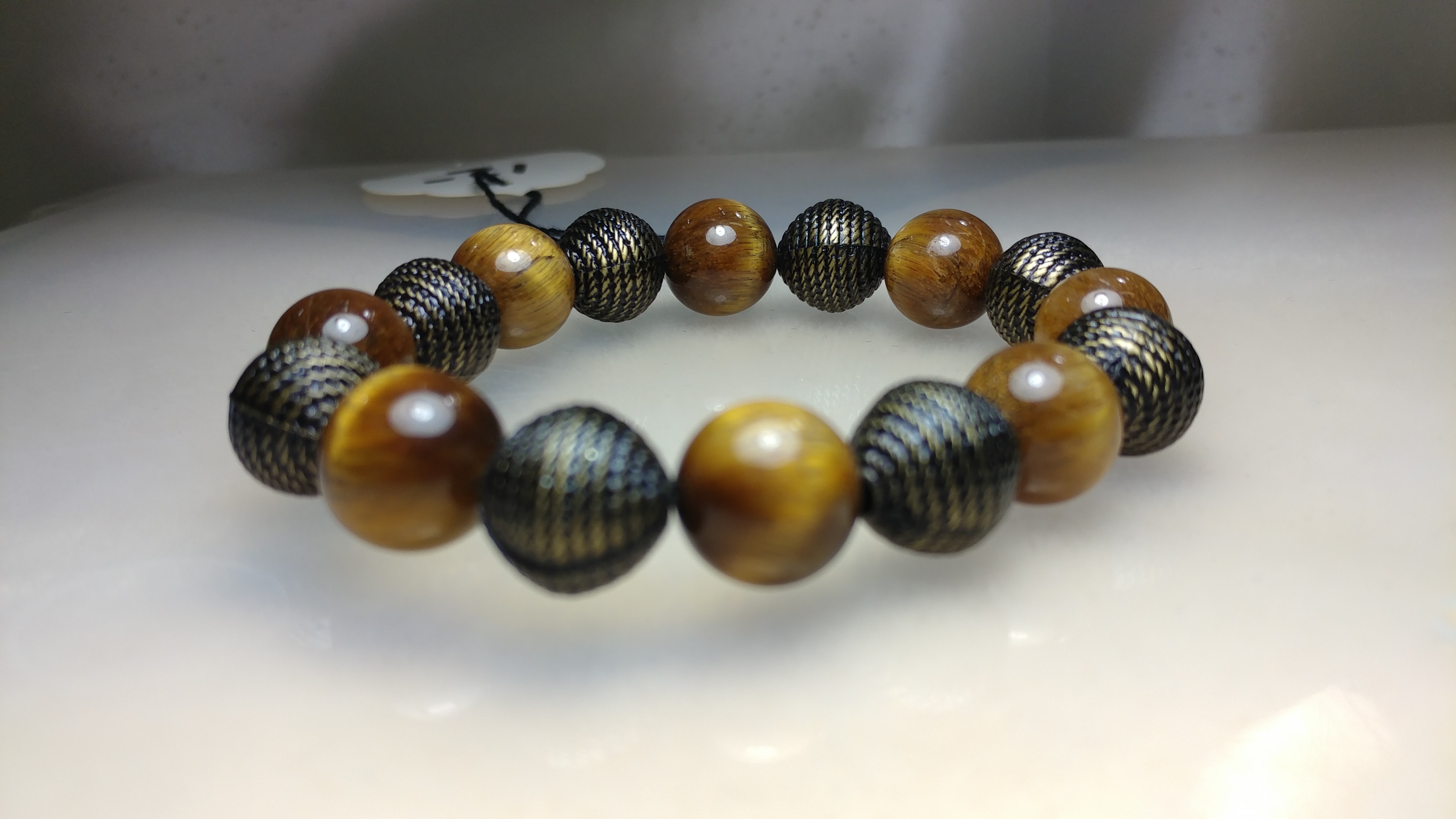 Made with 12 mm Tiger Eye bead spaced with acrylic black and gold painted bead on a strong, stretchy cord.
