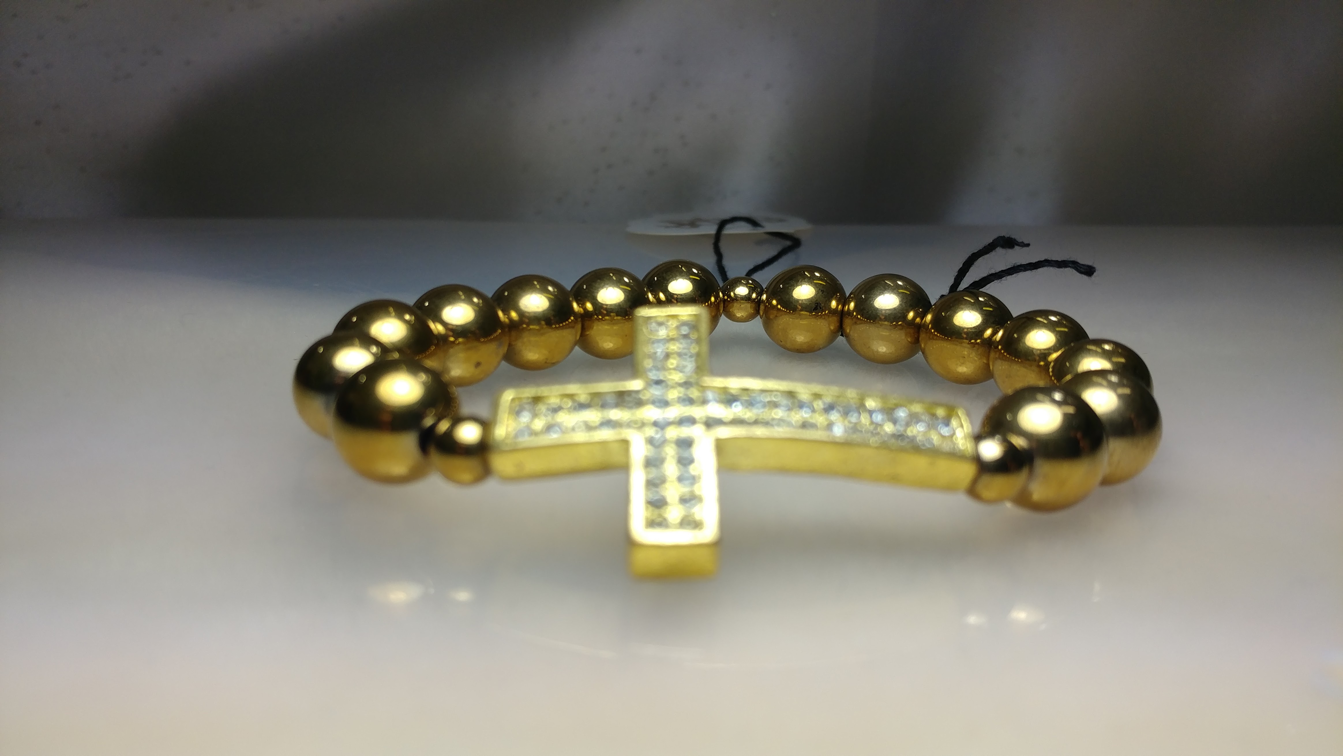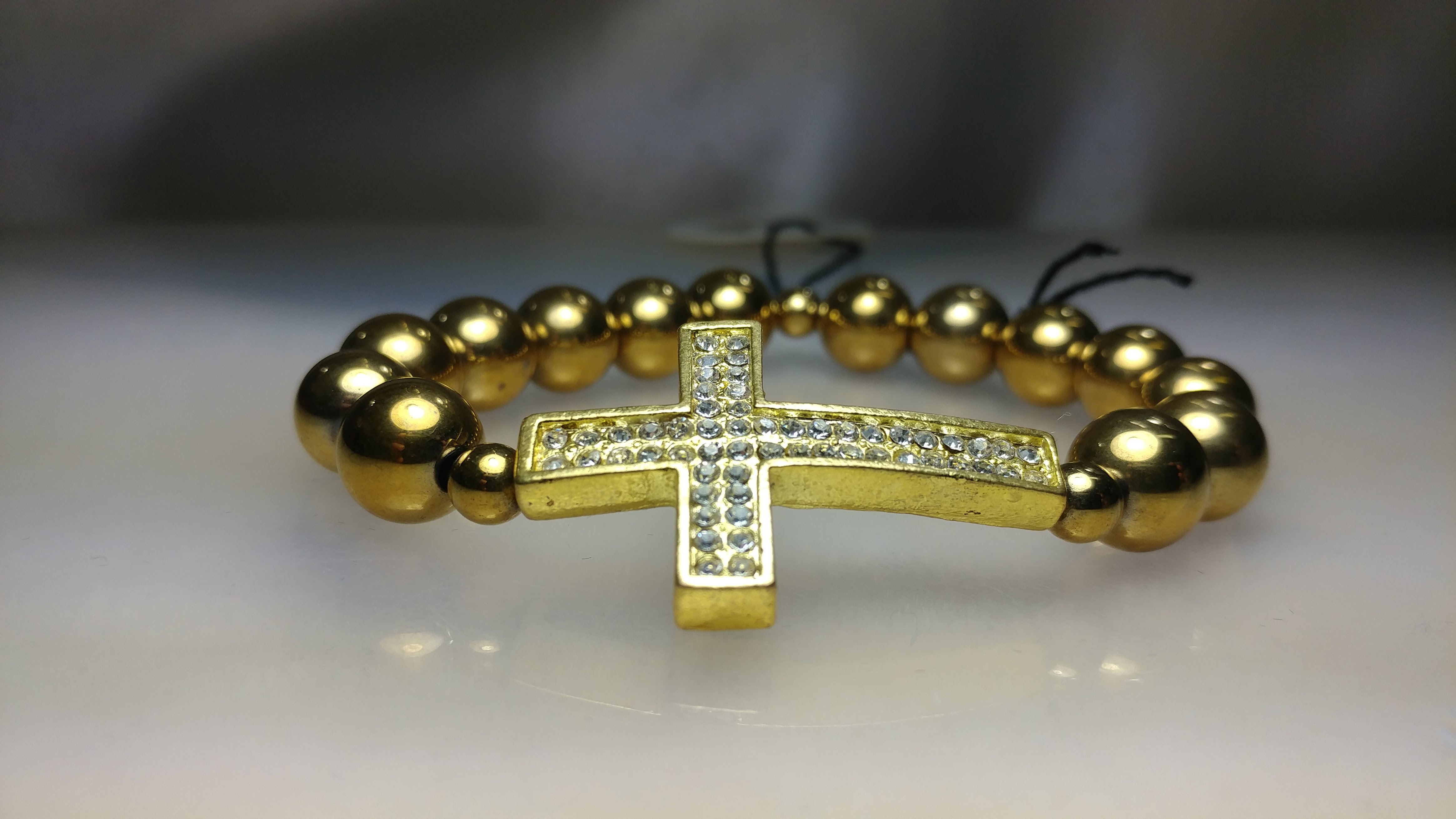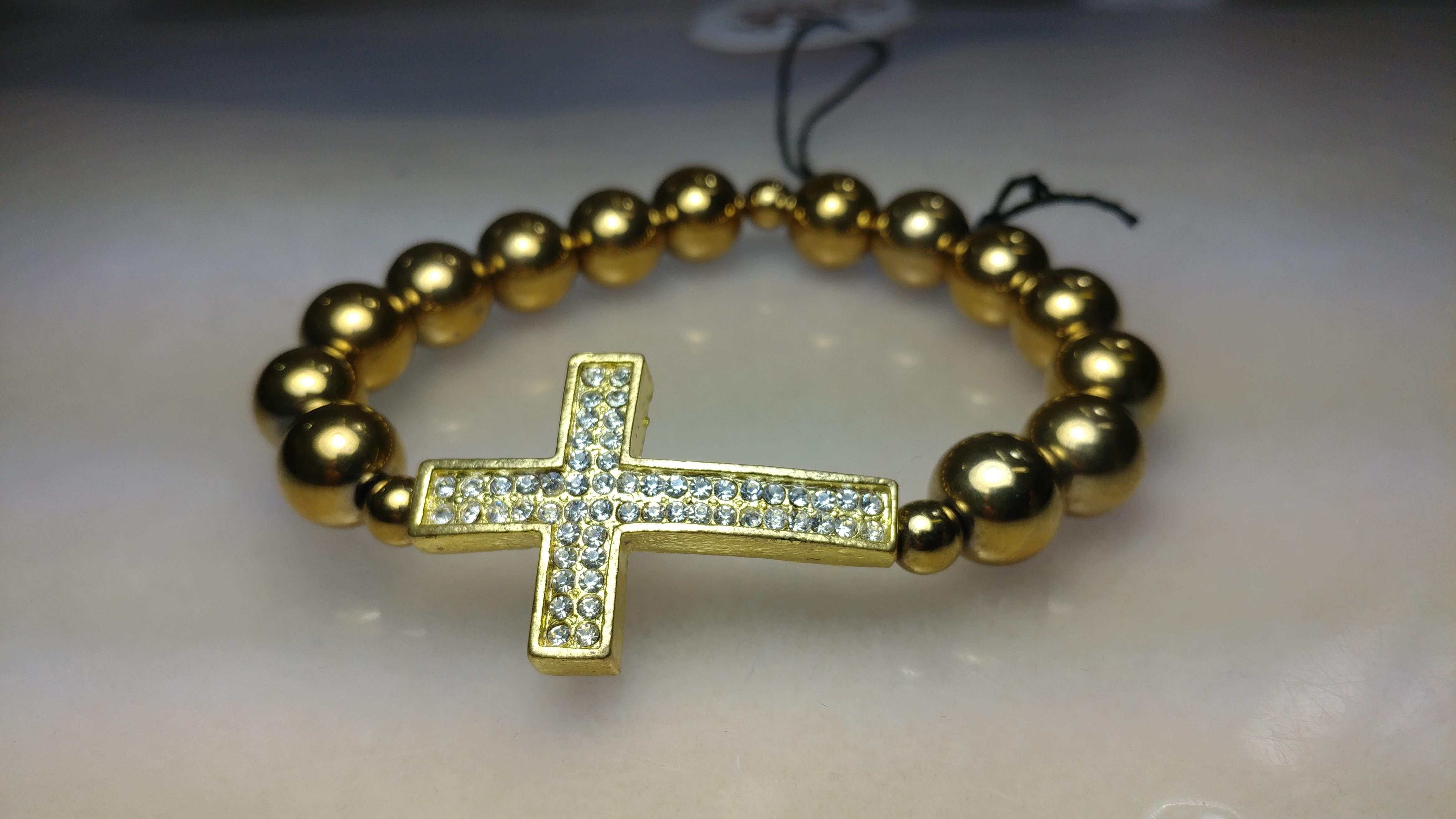Made with Gold Tone Hematite beads and gold tone rhinestone cross on a strong, stretchy string.