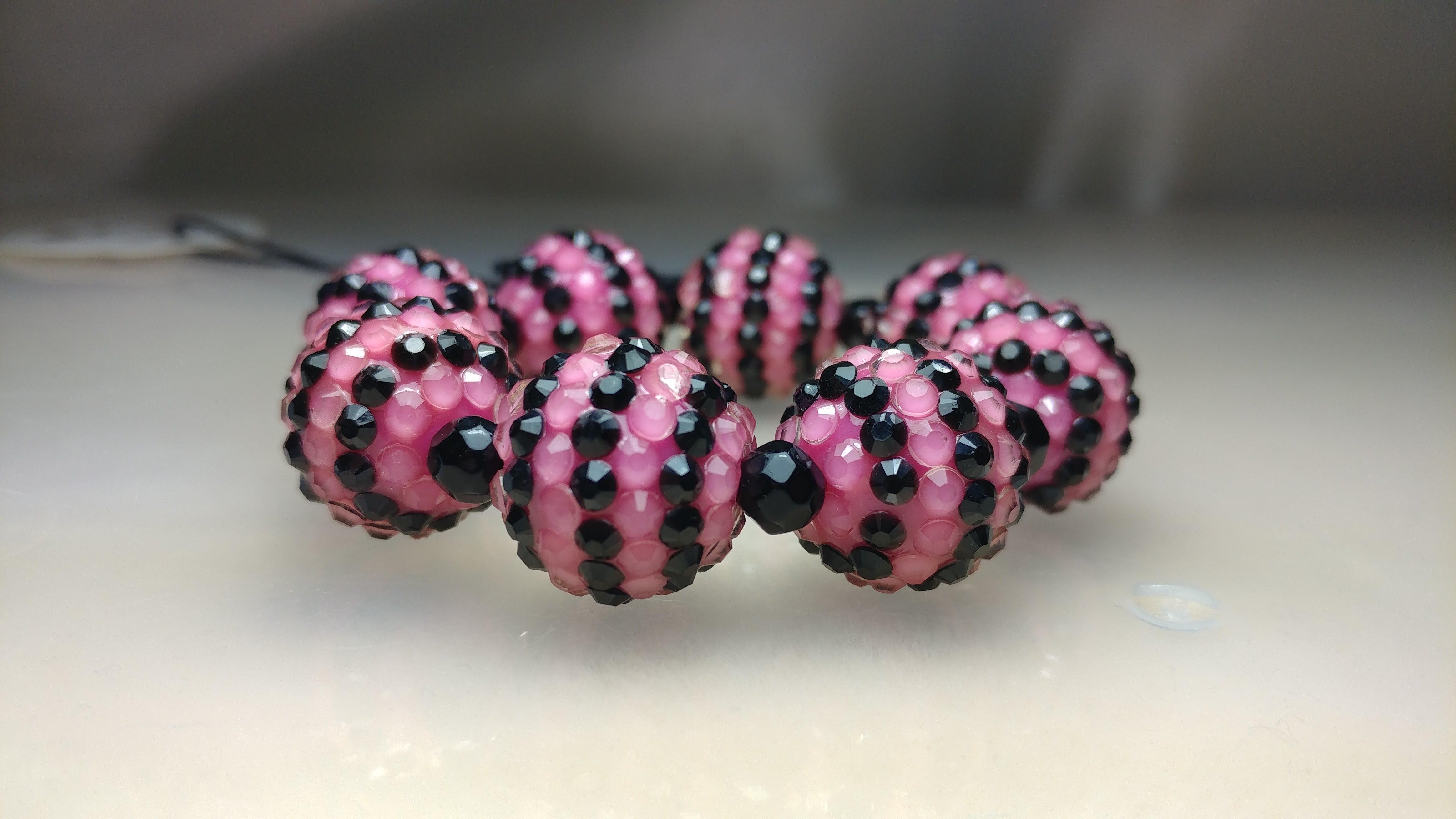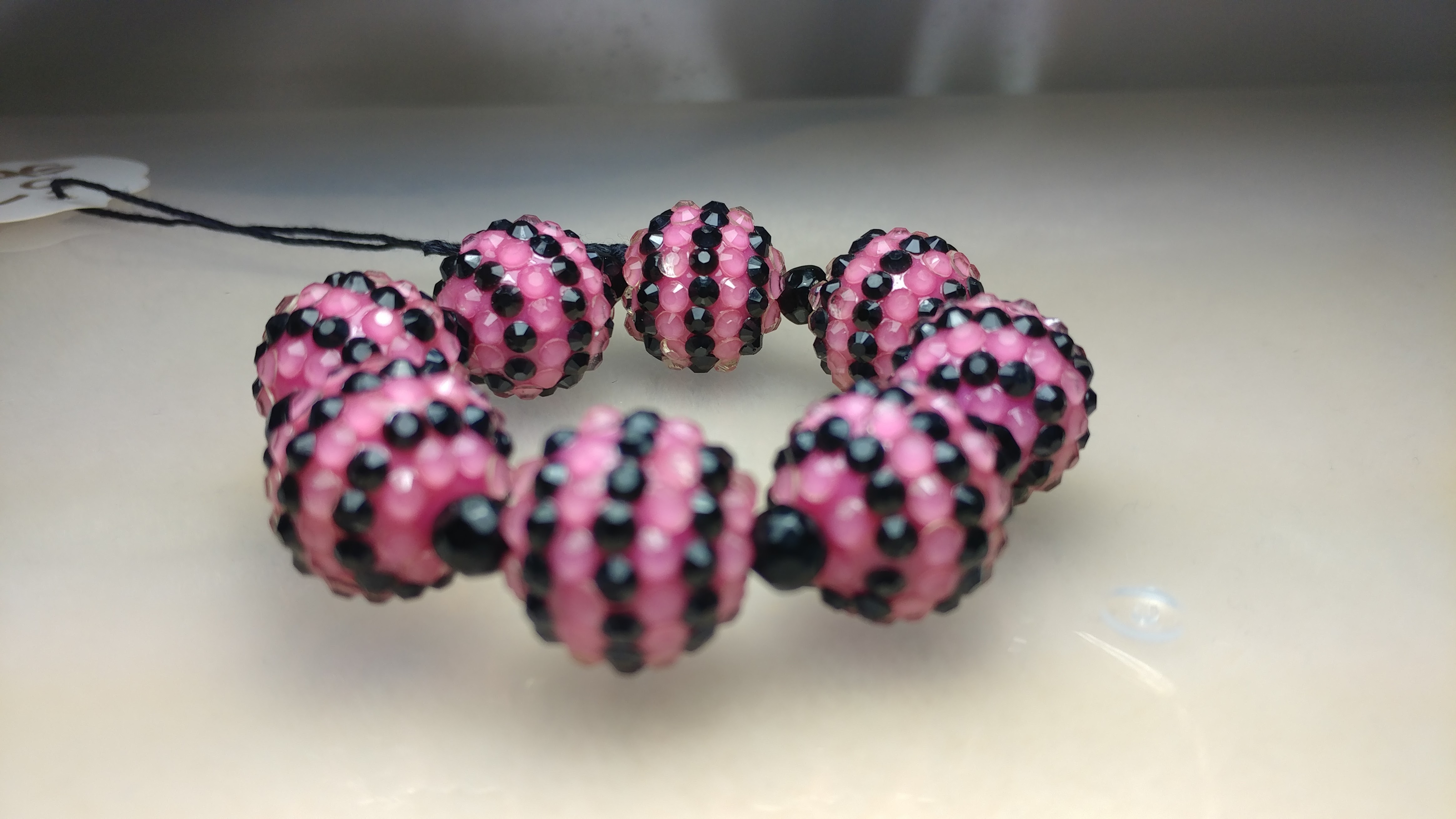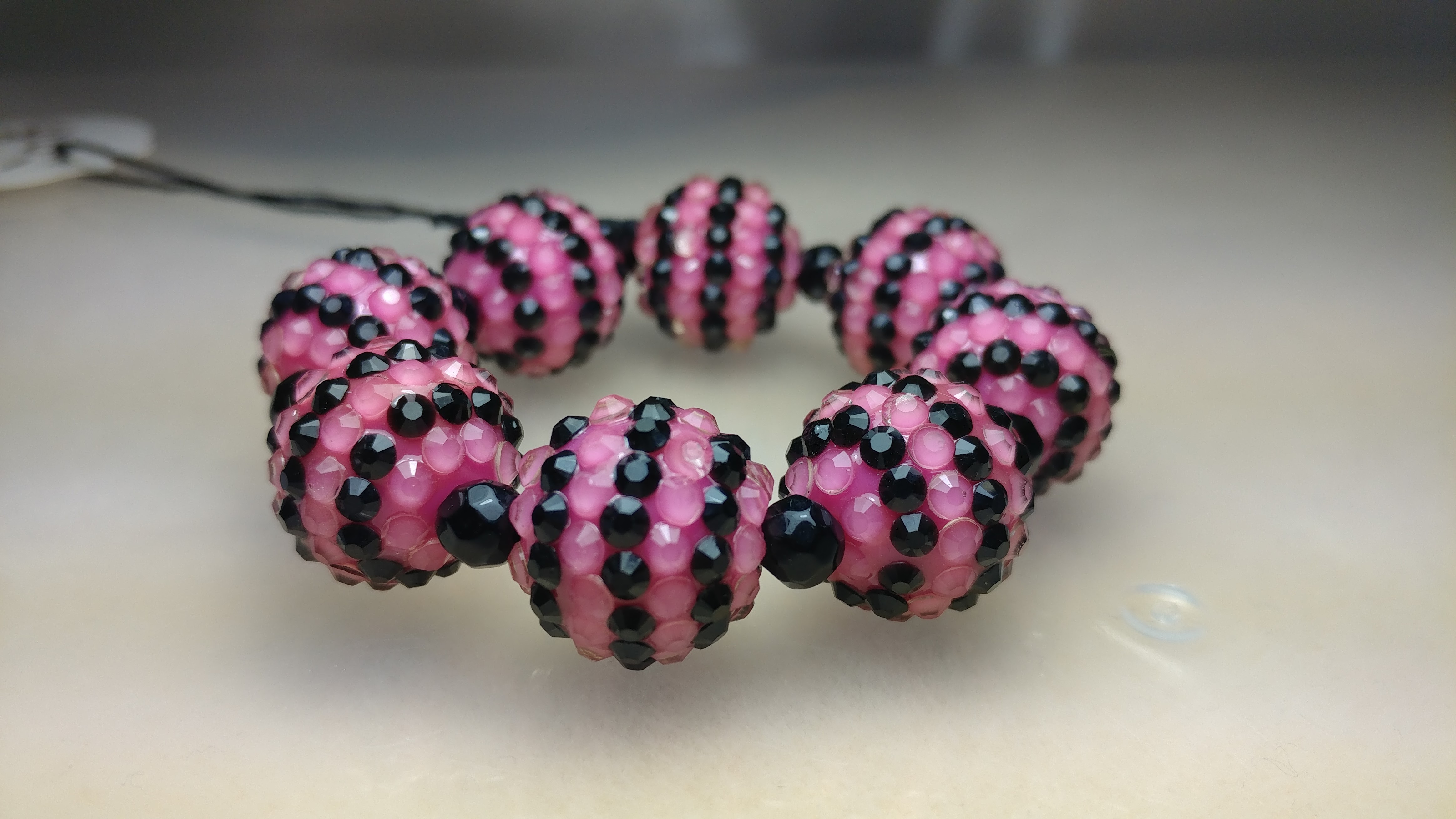 Made with hot pink and black acrylic disco ball beads and glass black crystal beads on a stretchy string.