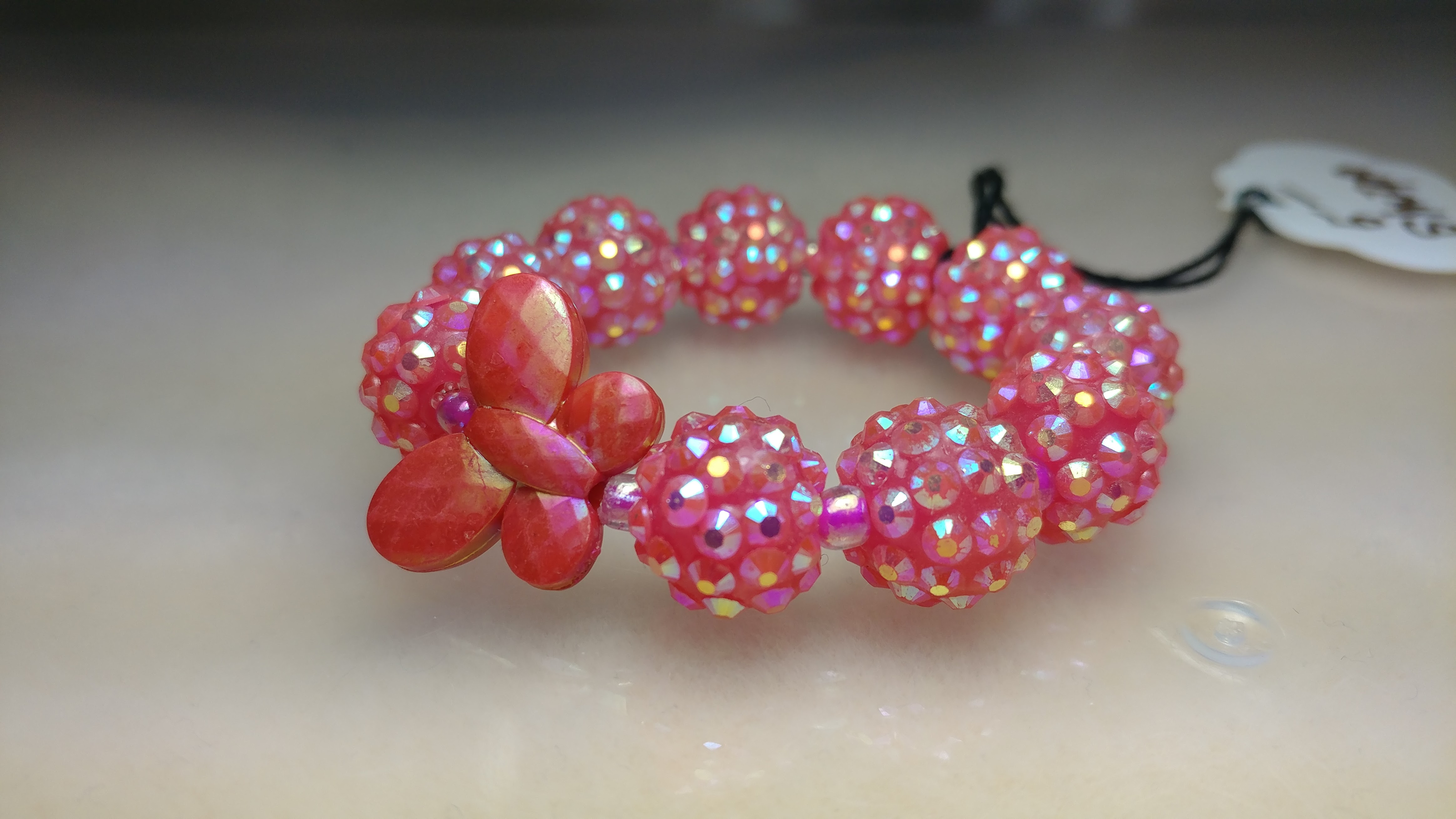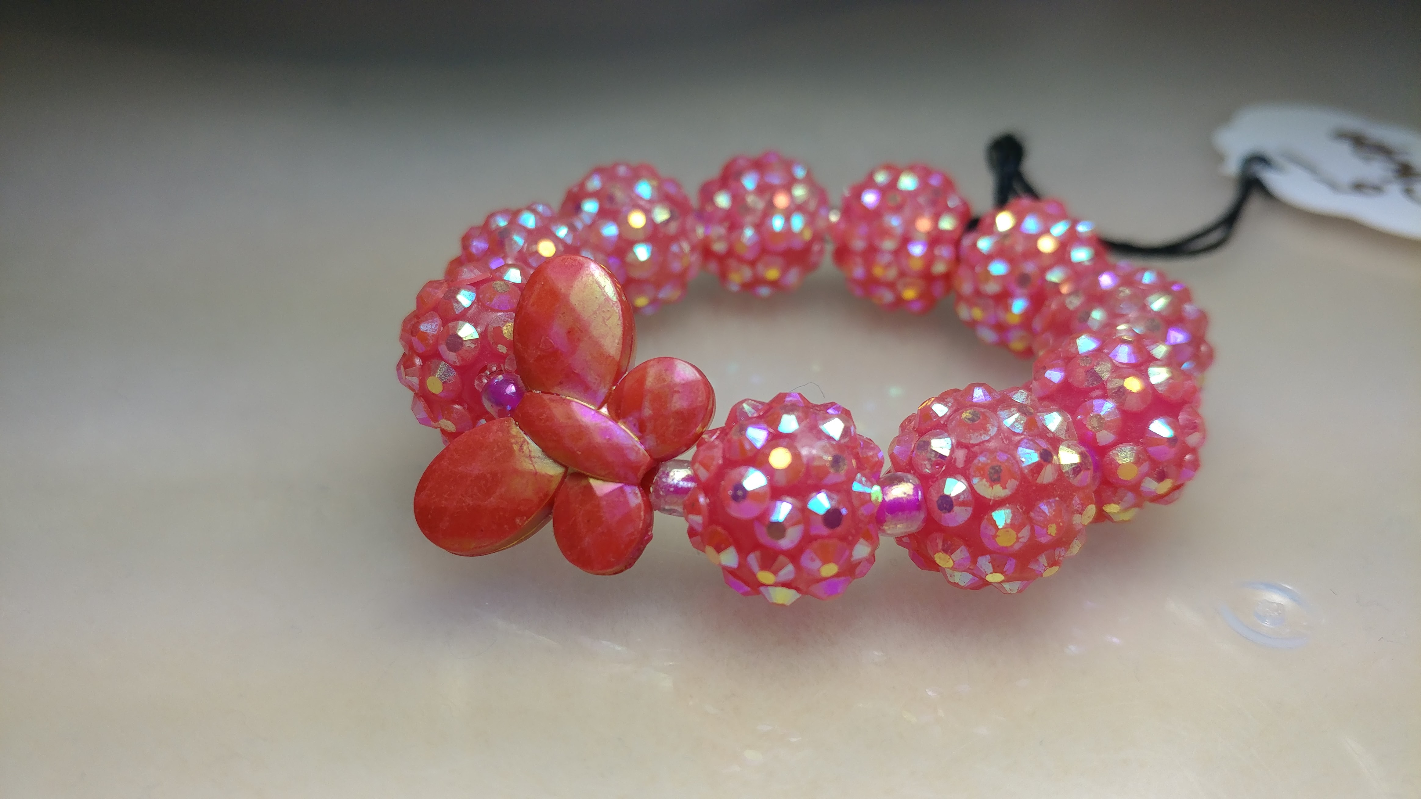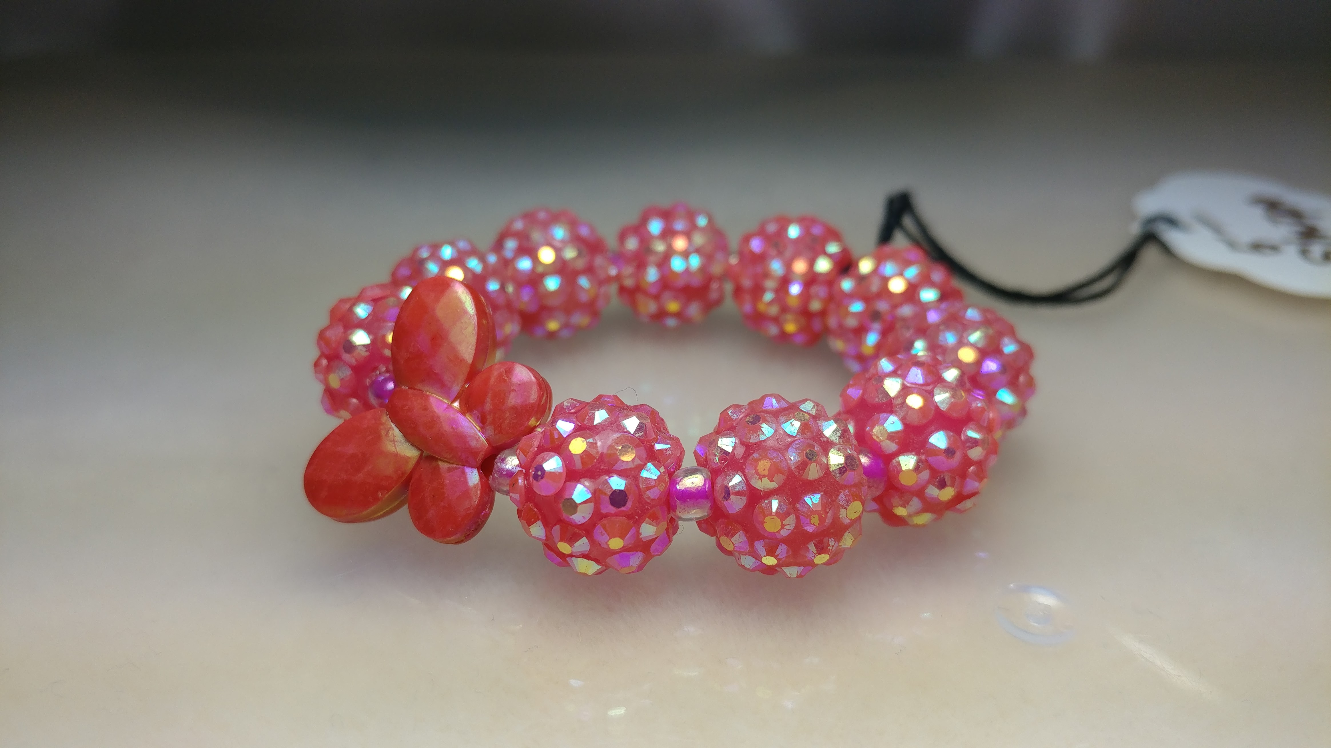 Made with pink acrylic disco ball beads, accented with a cute acrylic butterfly spacer bead, on a stretchy string.