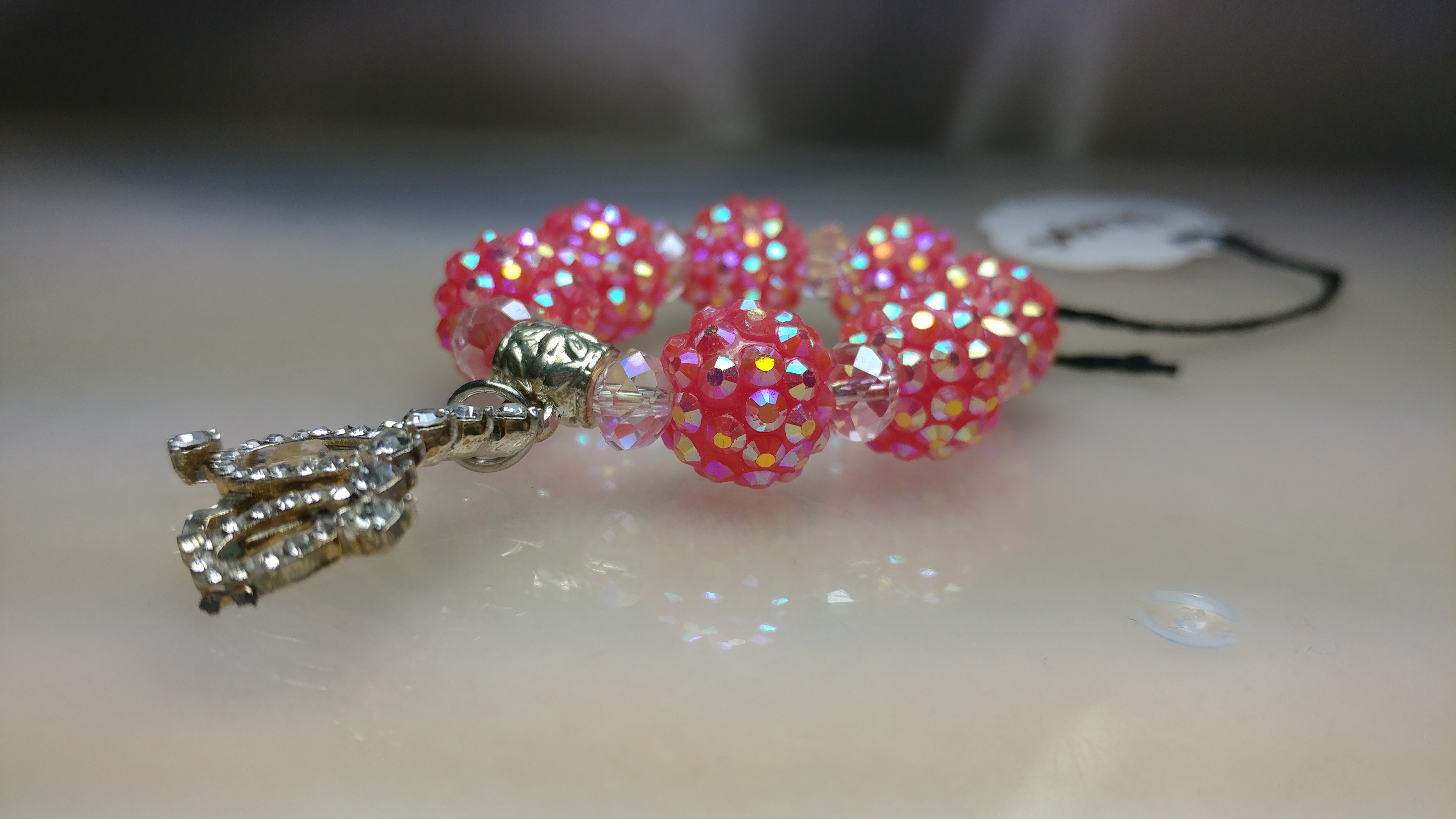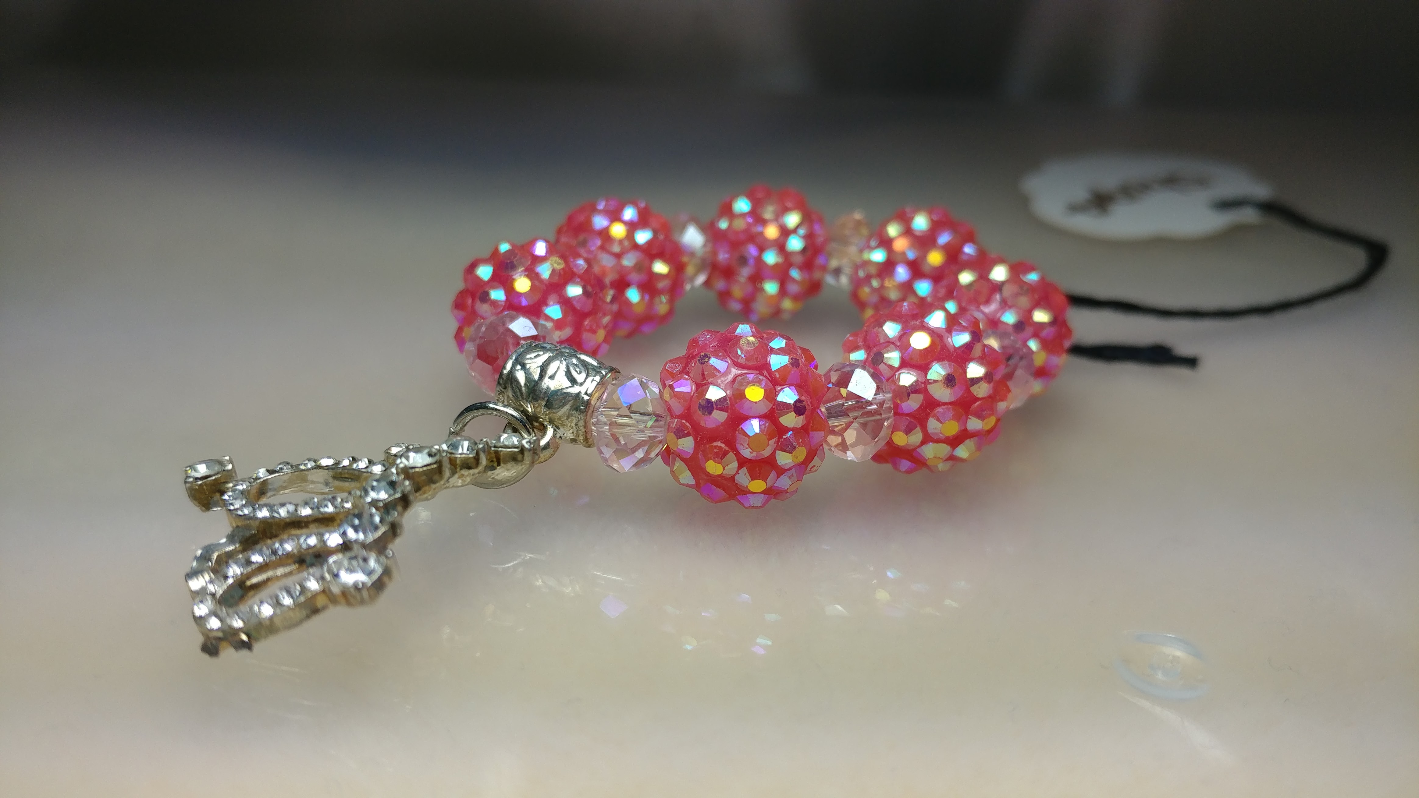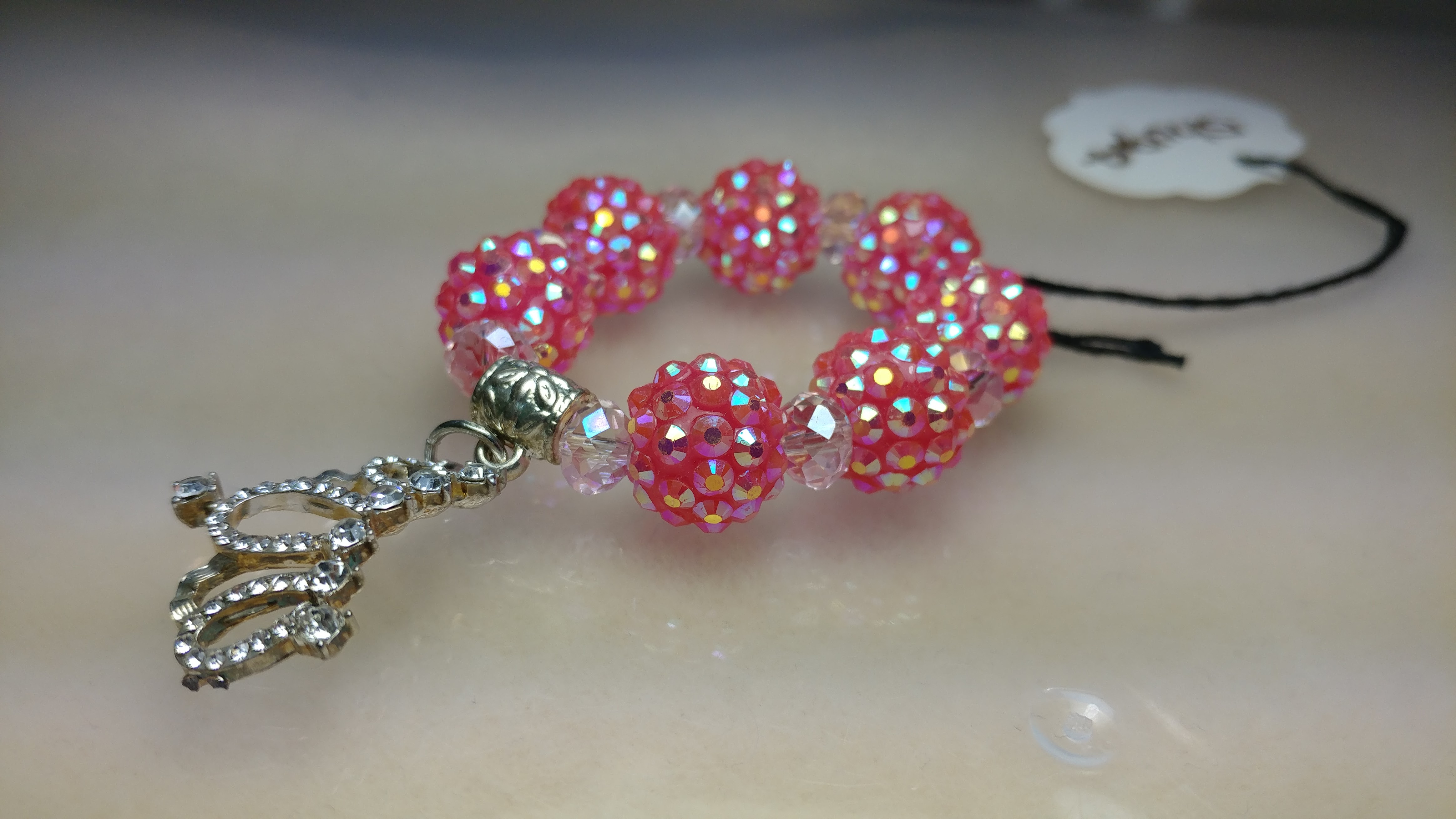Made with lovely pink acrylic disco ball beads, accented with a cute silvertone rhinestone crown with acrylic pale pink beads, on a stretchy string.