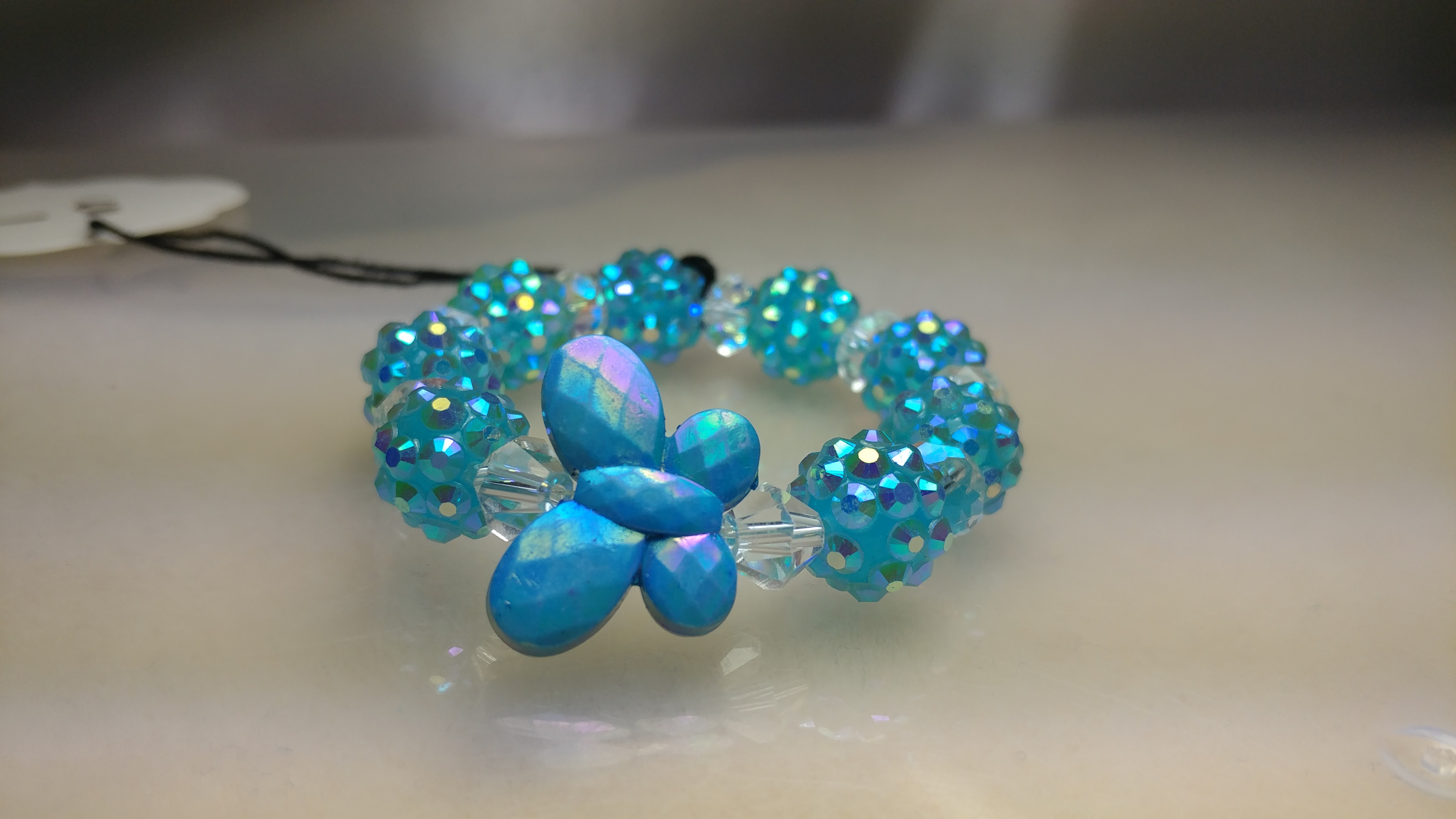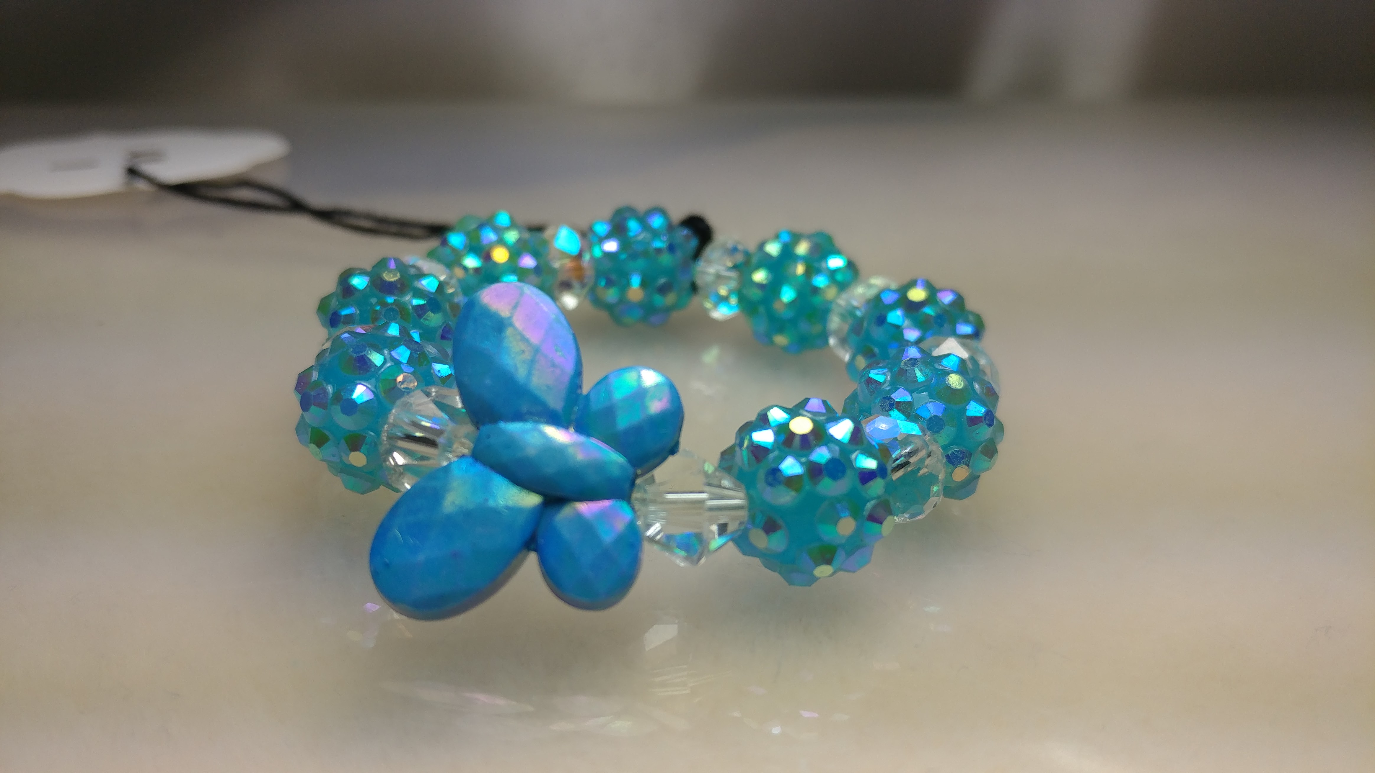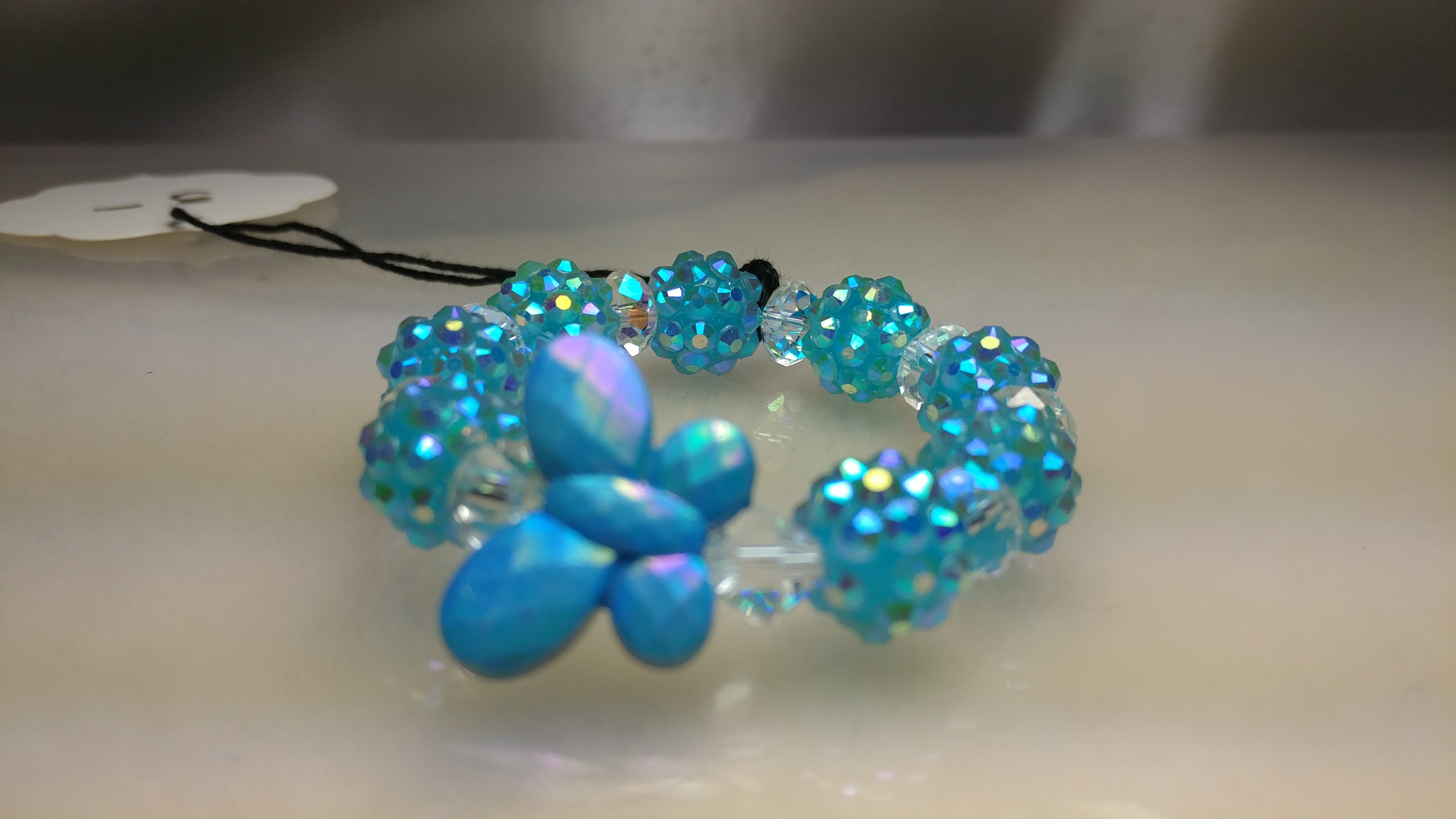 Made with light blue acrylic disco ball beads, and clear AB colored crystal glass beads on a stretchy string.