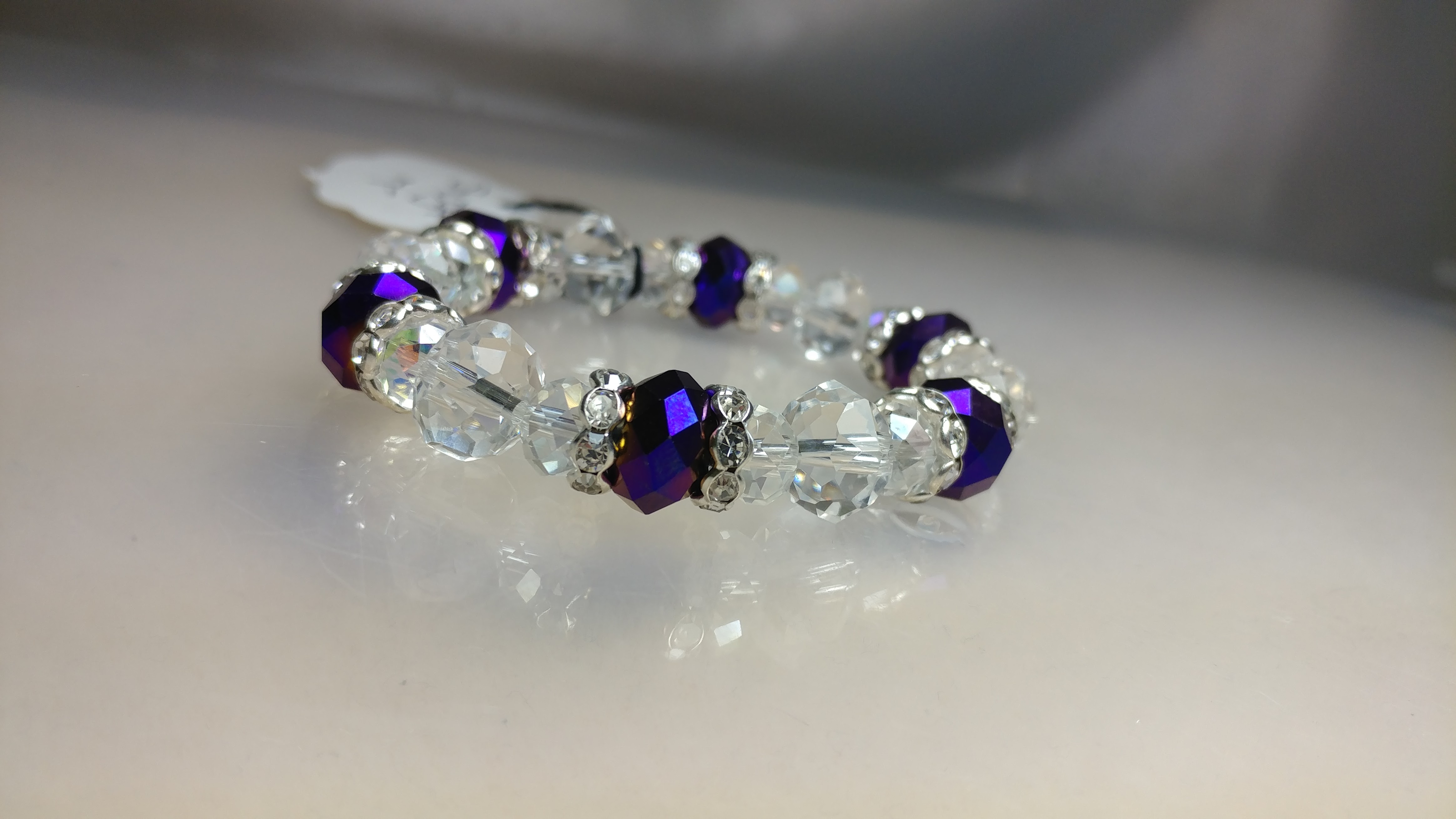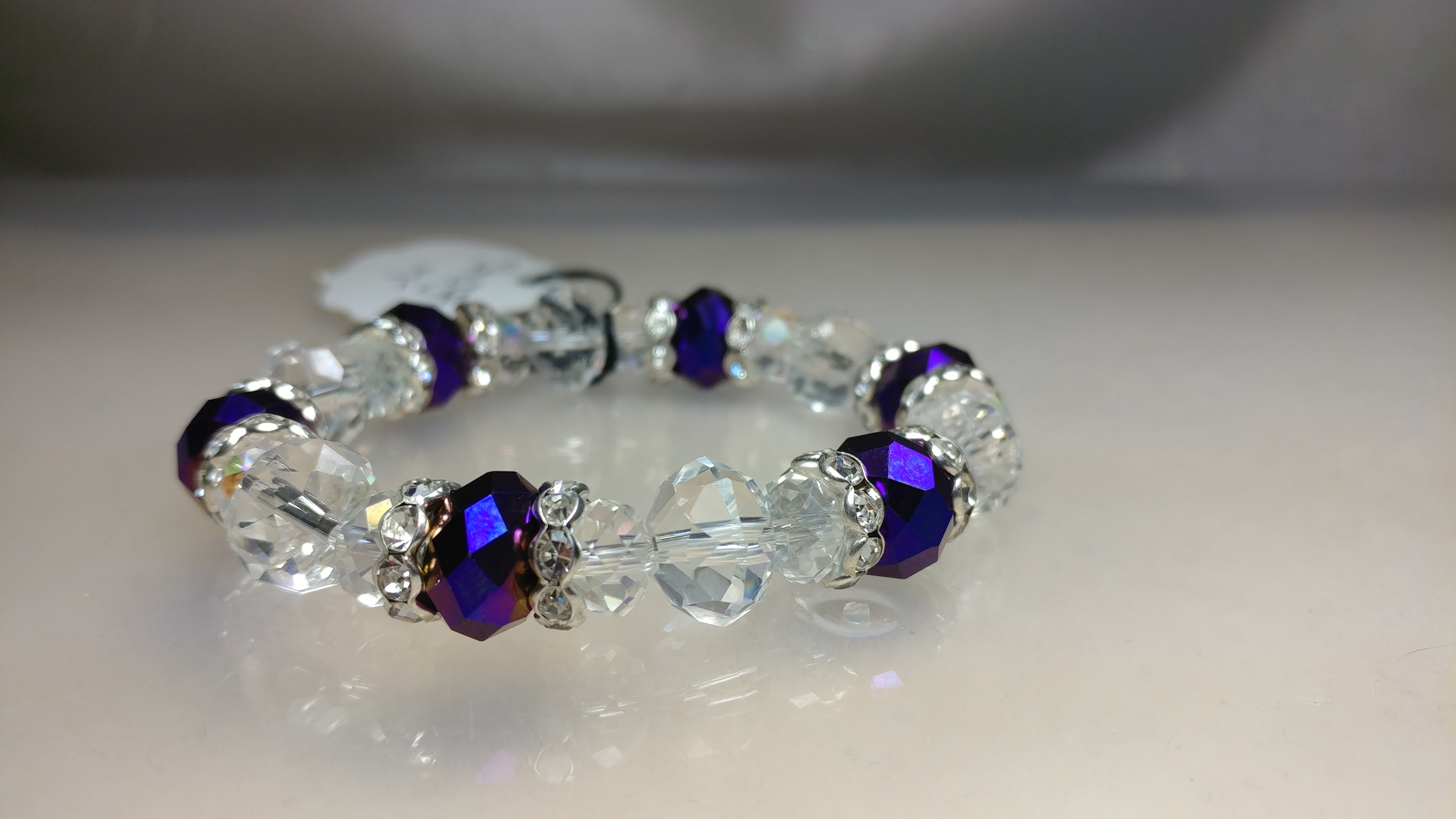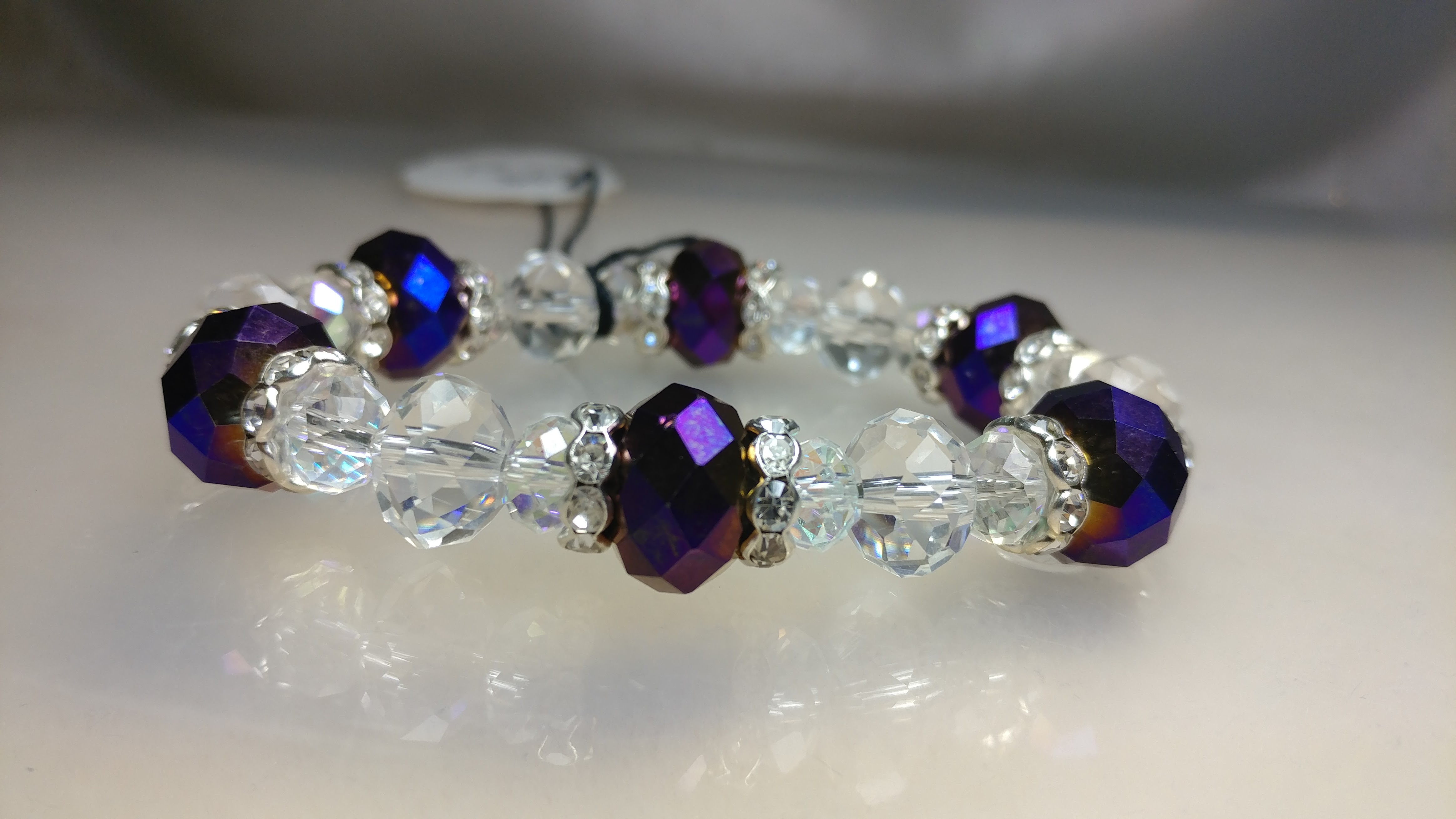 Made with purple and clear glass beads accented with silvertone rhinestone clear crystal spacer beads on a clear stretchy cord.