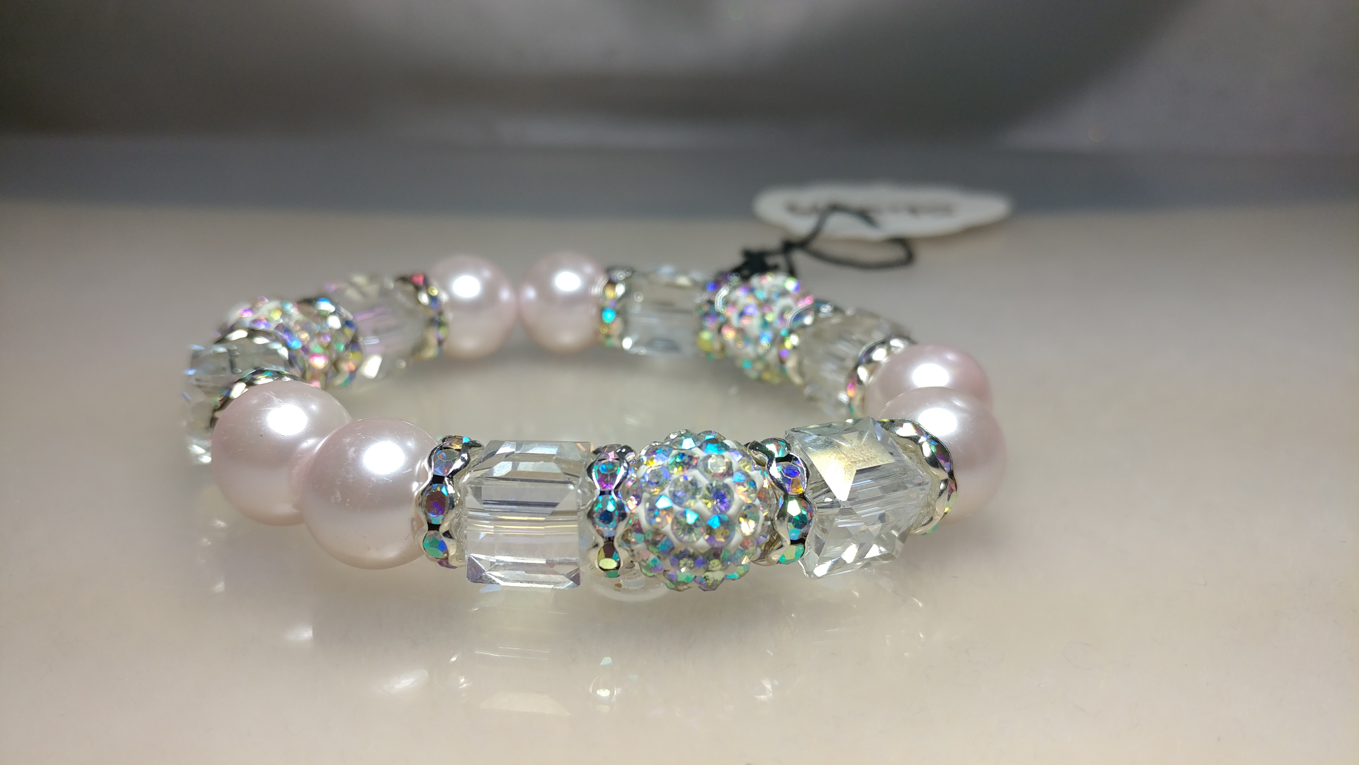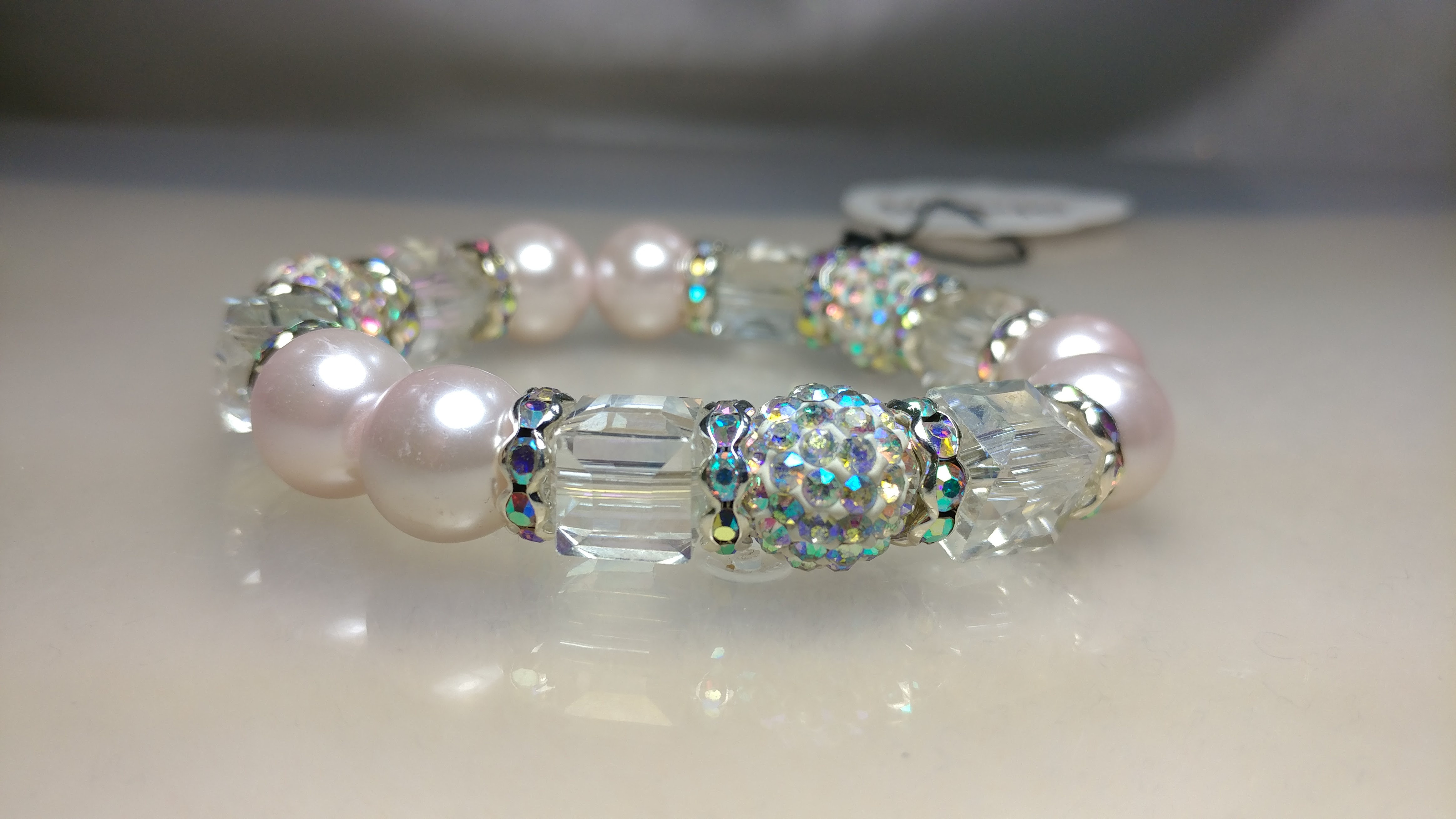 Made with AB colored glass bead accented with white AB colored rhinestone crystal pave bead and AB colored rhinestone spacers, and pale pink painted pearl glass beads on a clear stretchy cord.