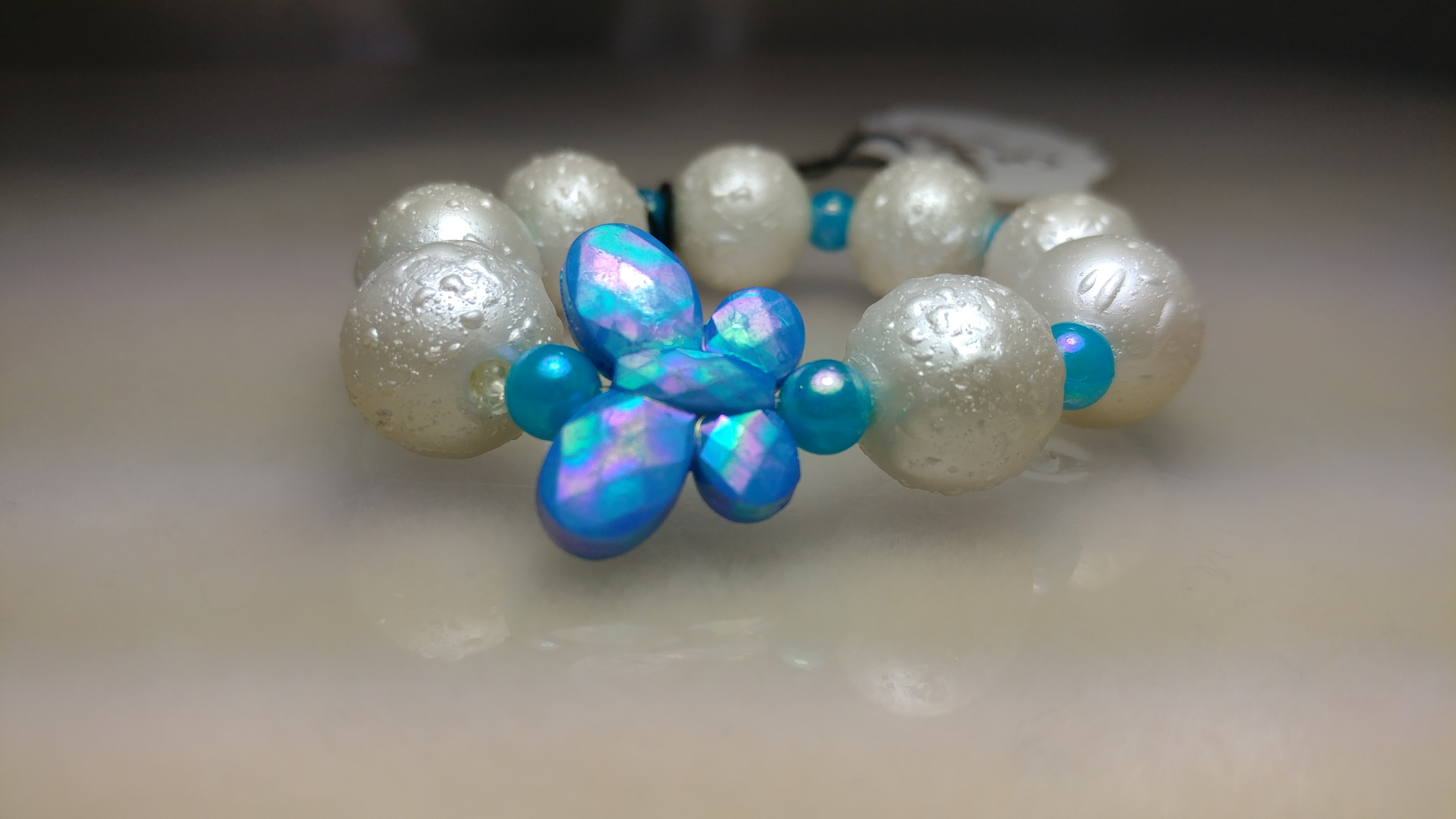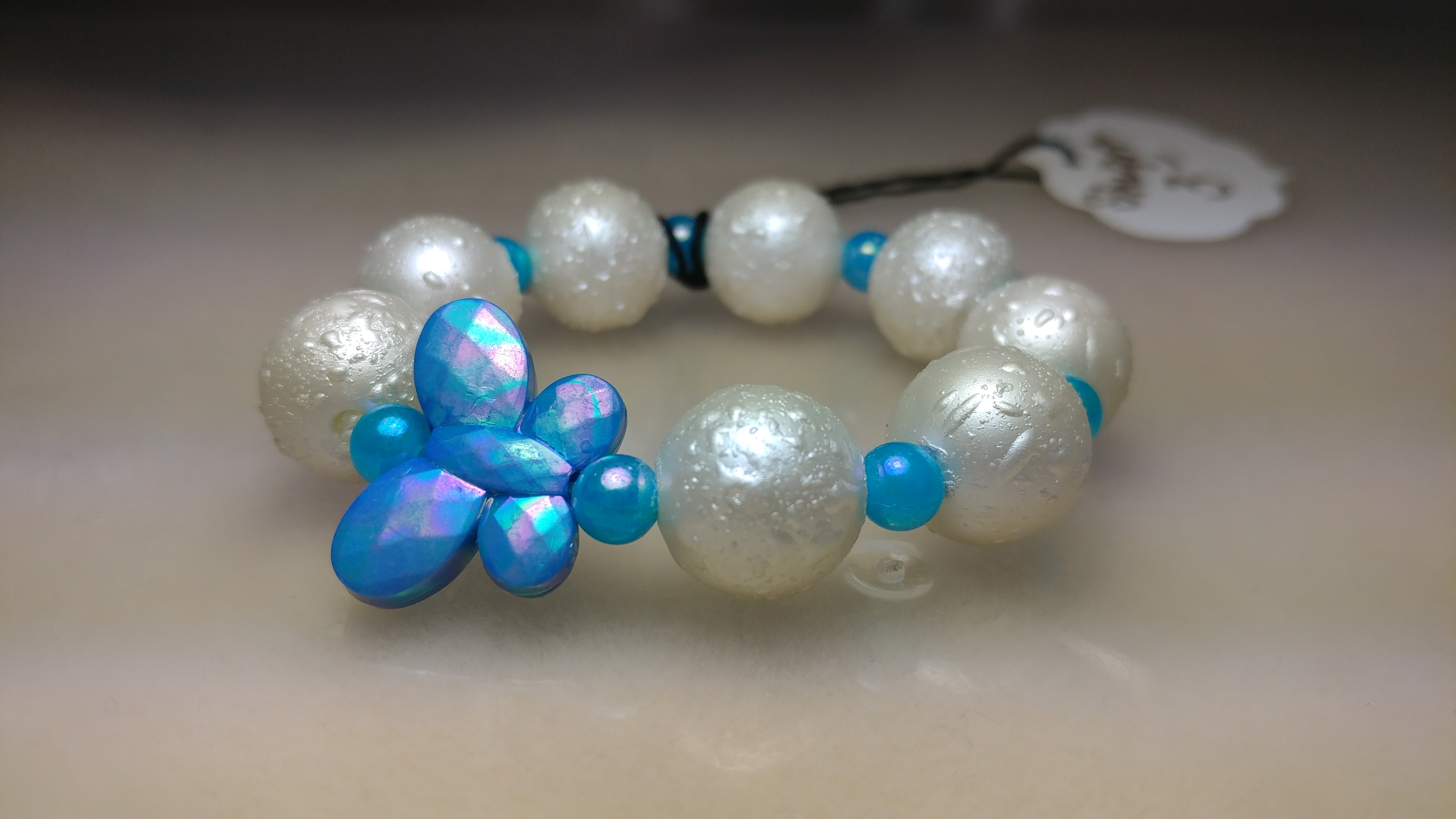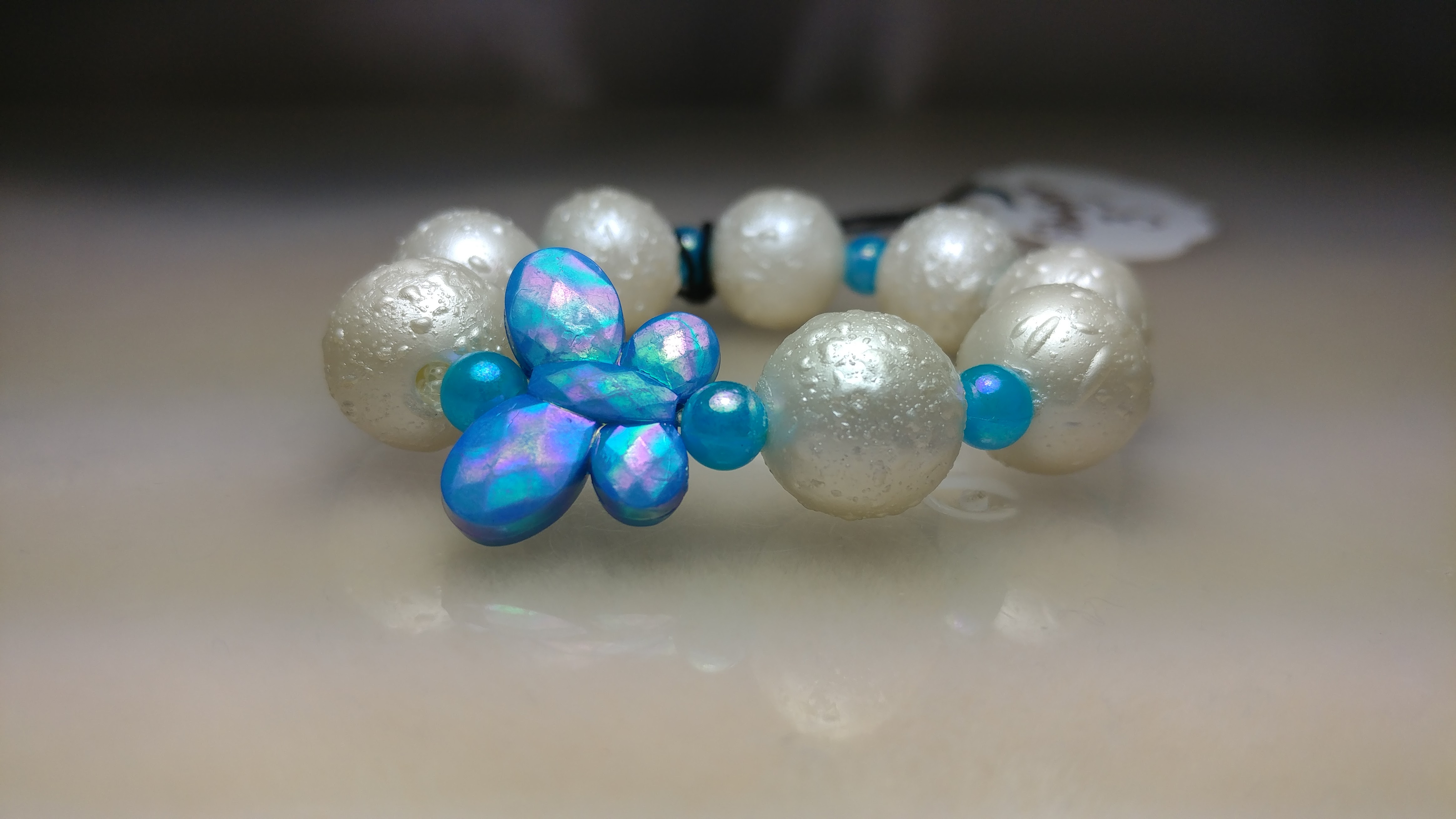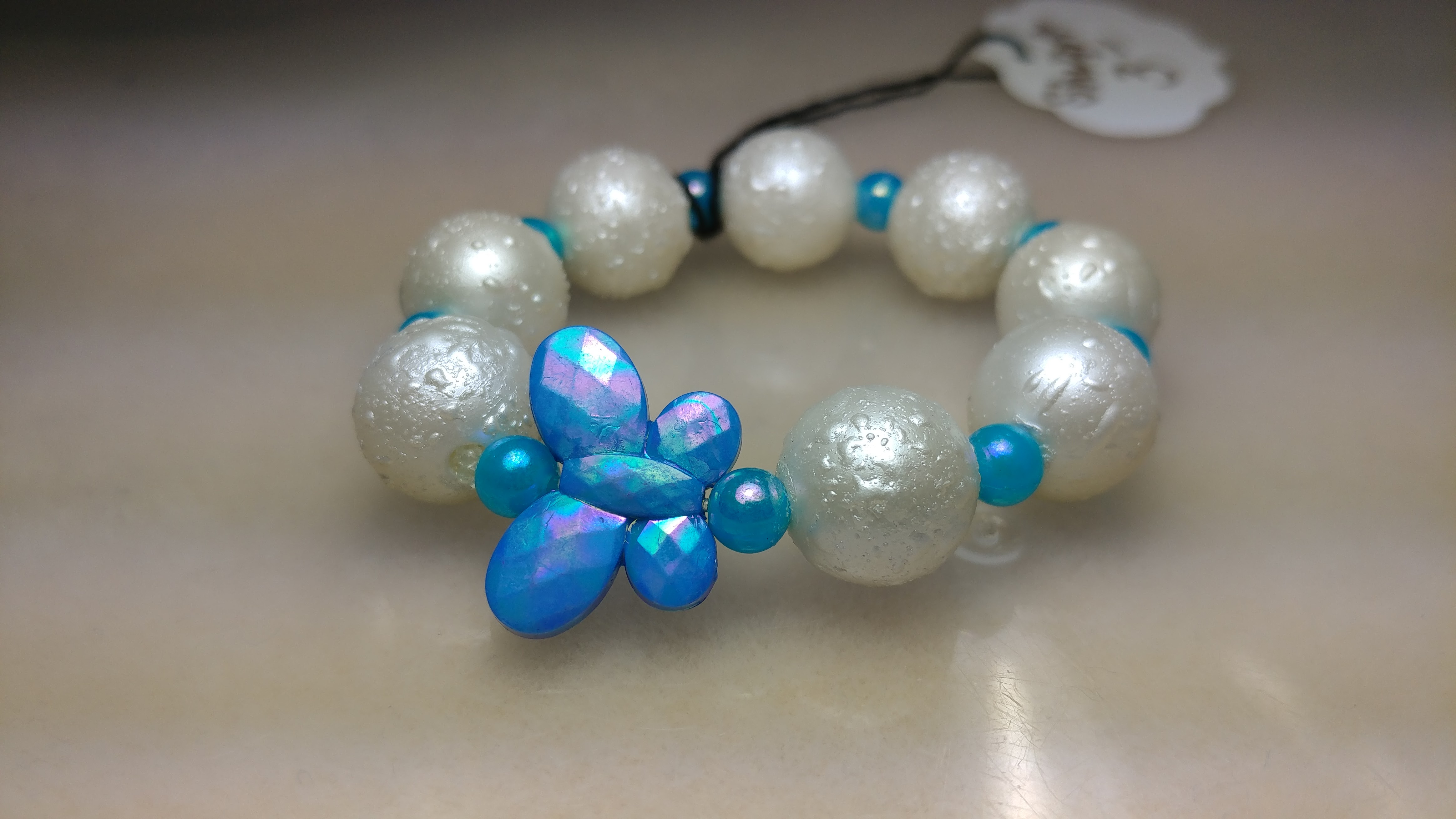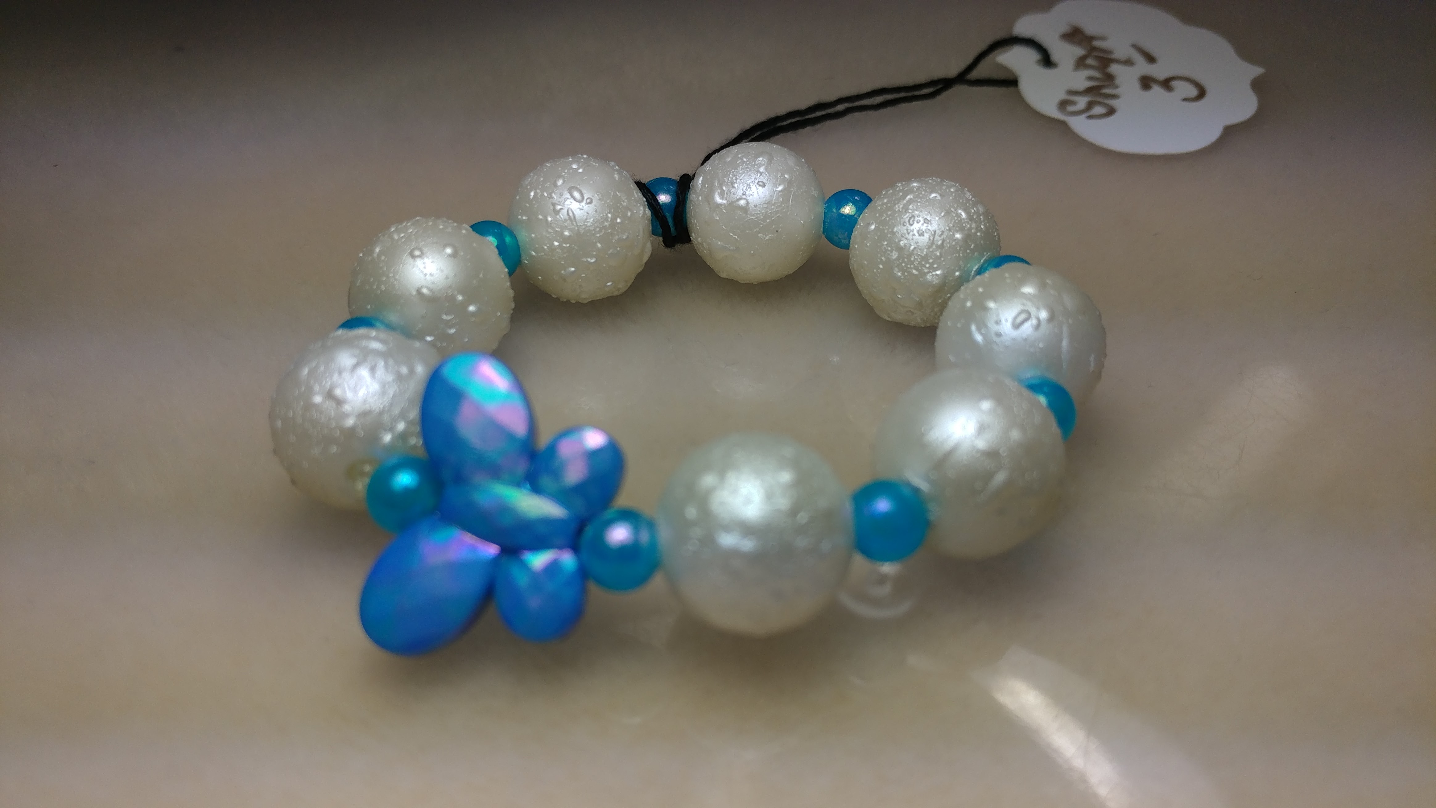 Made with white acrylic painted beads, and small acrylic blue beads, accented with a blue butterfly on a clear stretchy string.