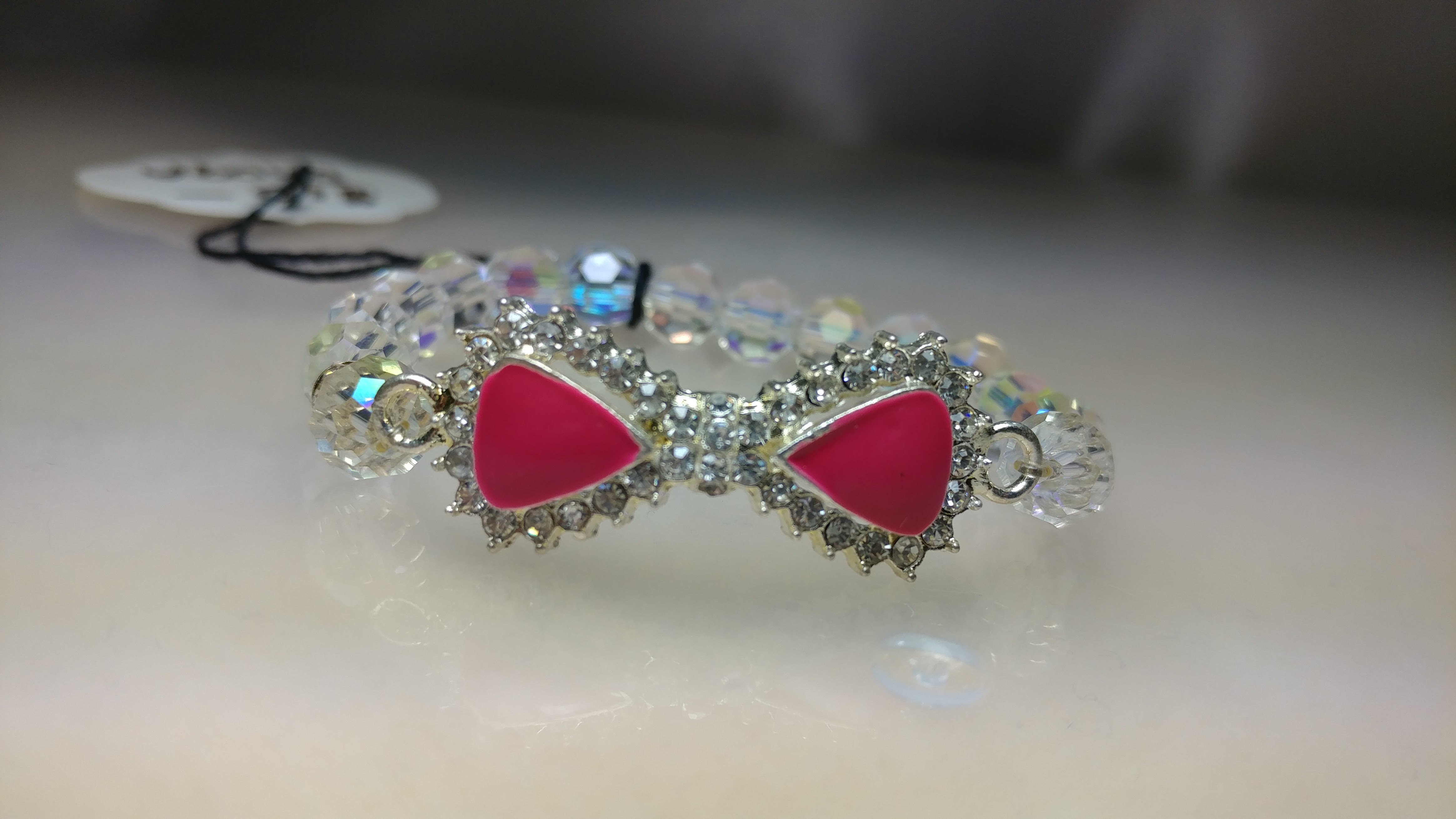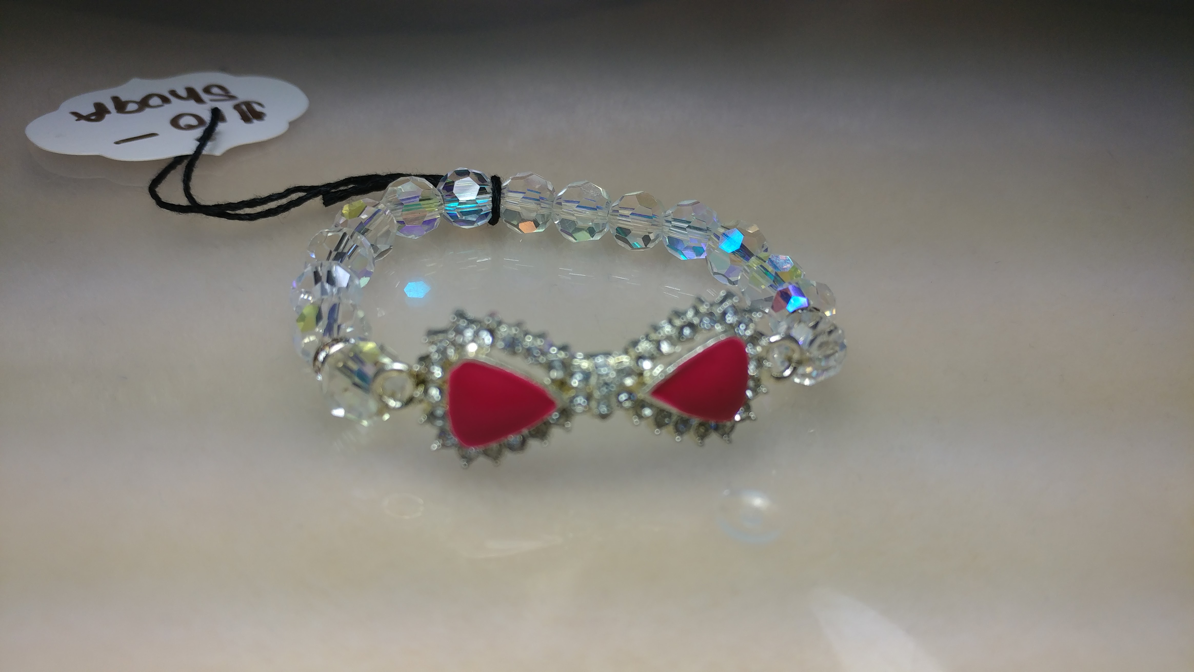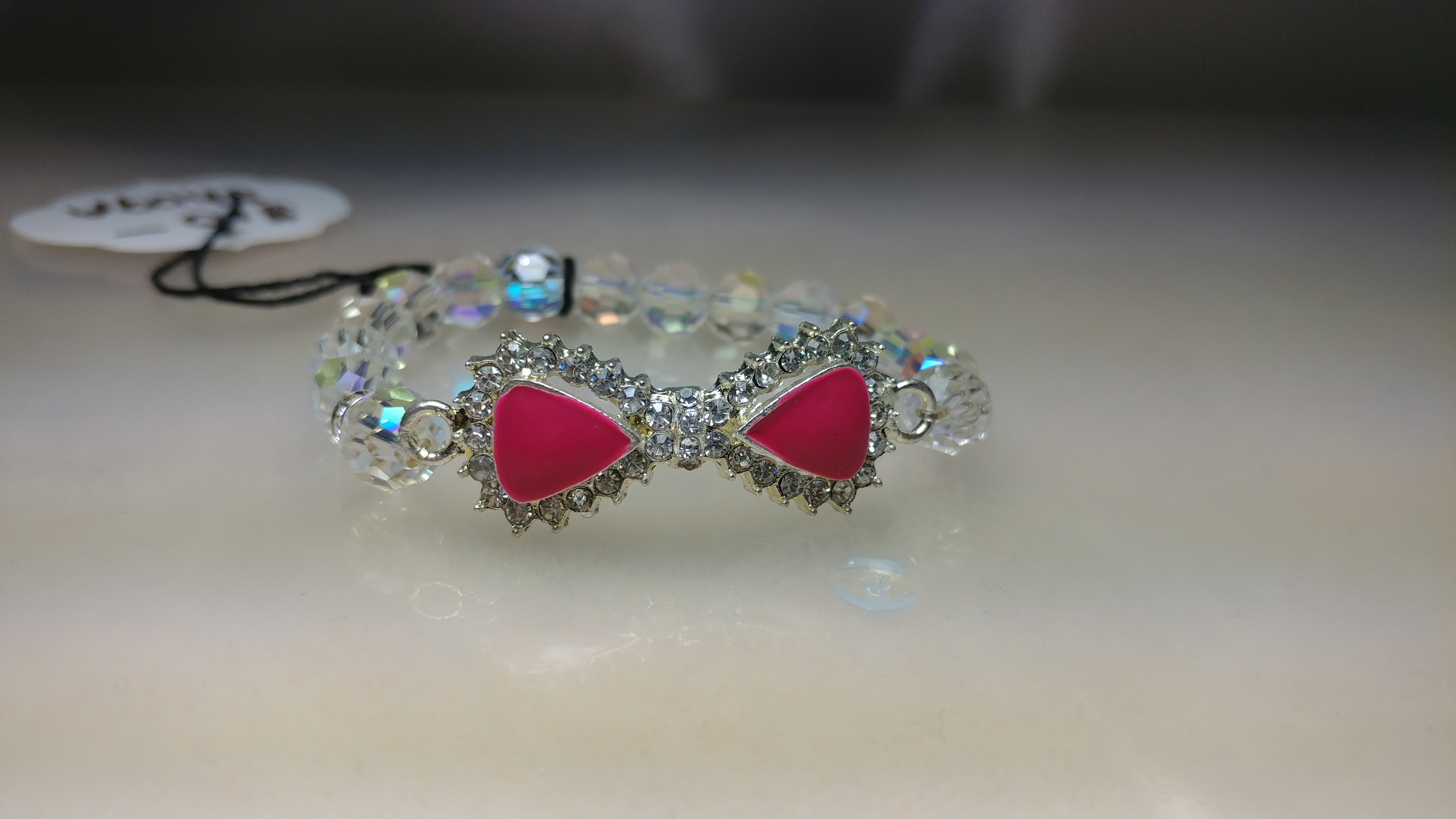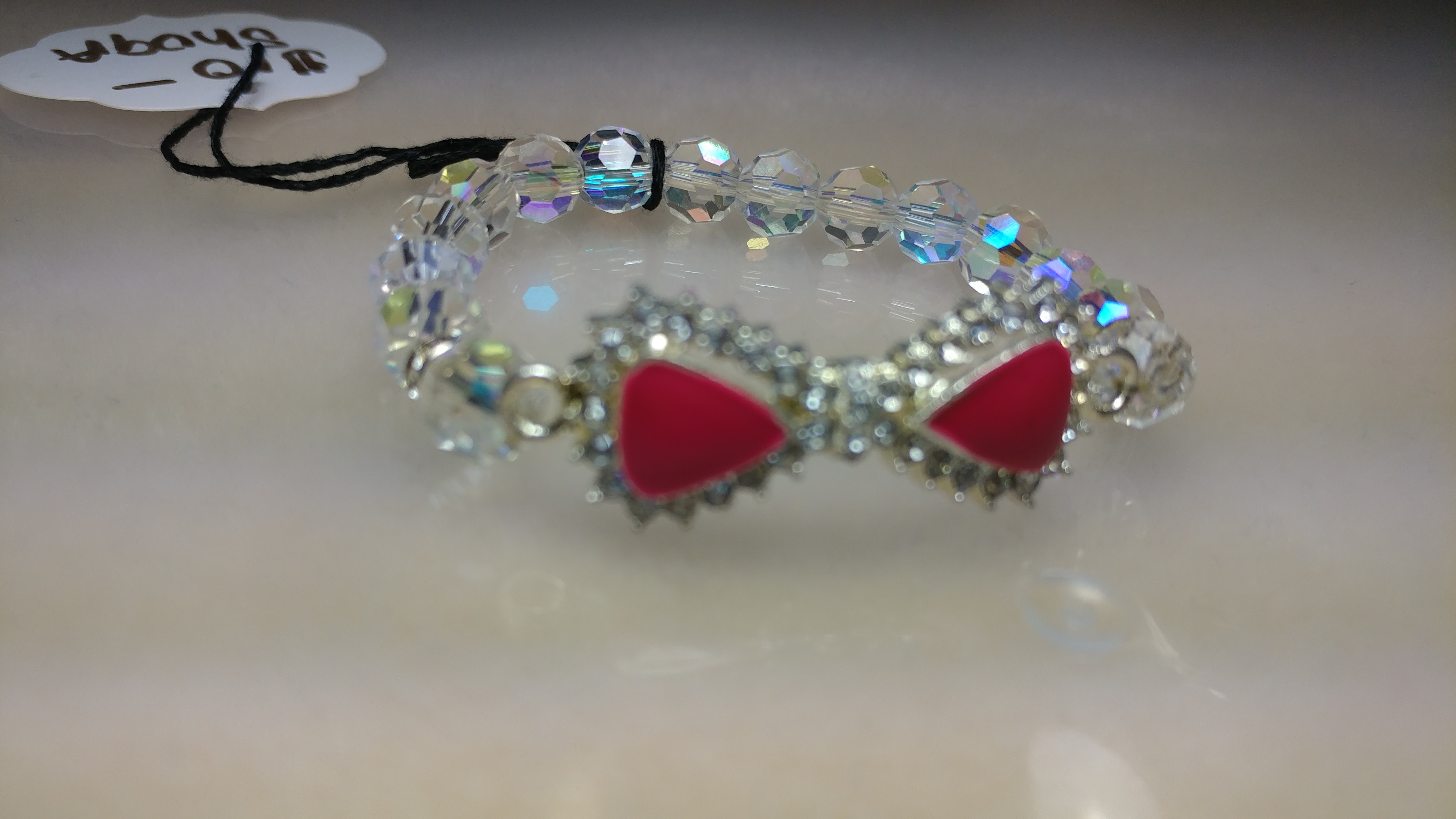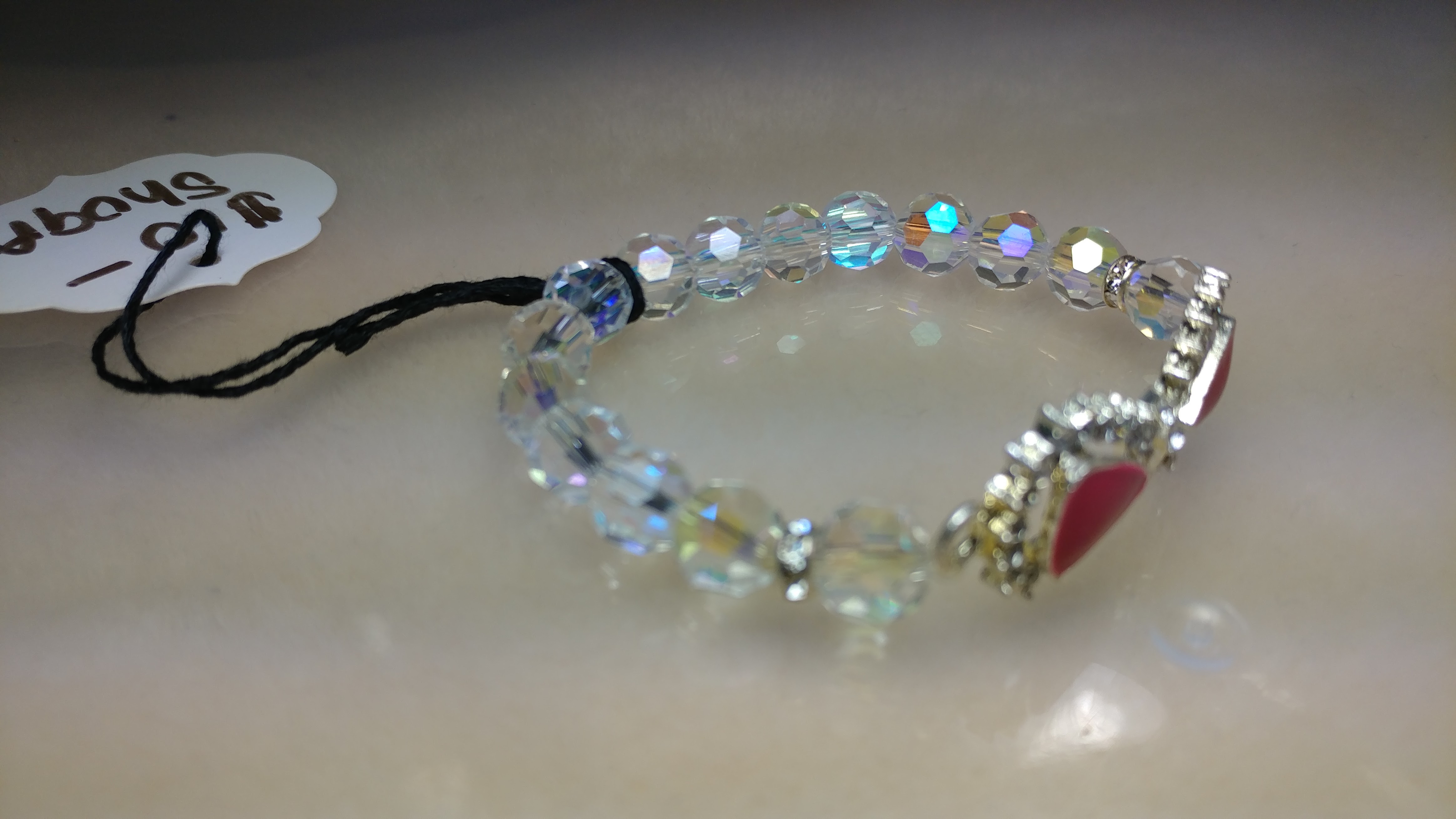 Made with a small rhinestone silvertone with hot pink spacer connector and clear AB glass beads, as well as silver rhinestone spacers on a clear stretchy cord.