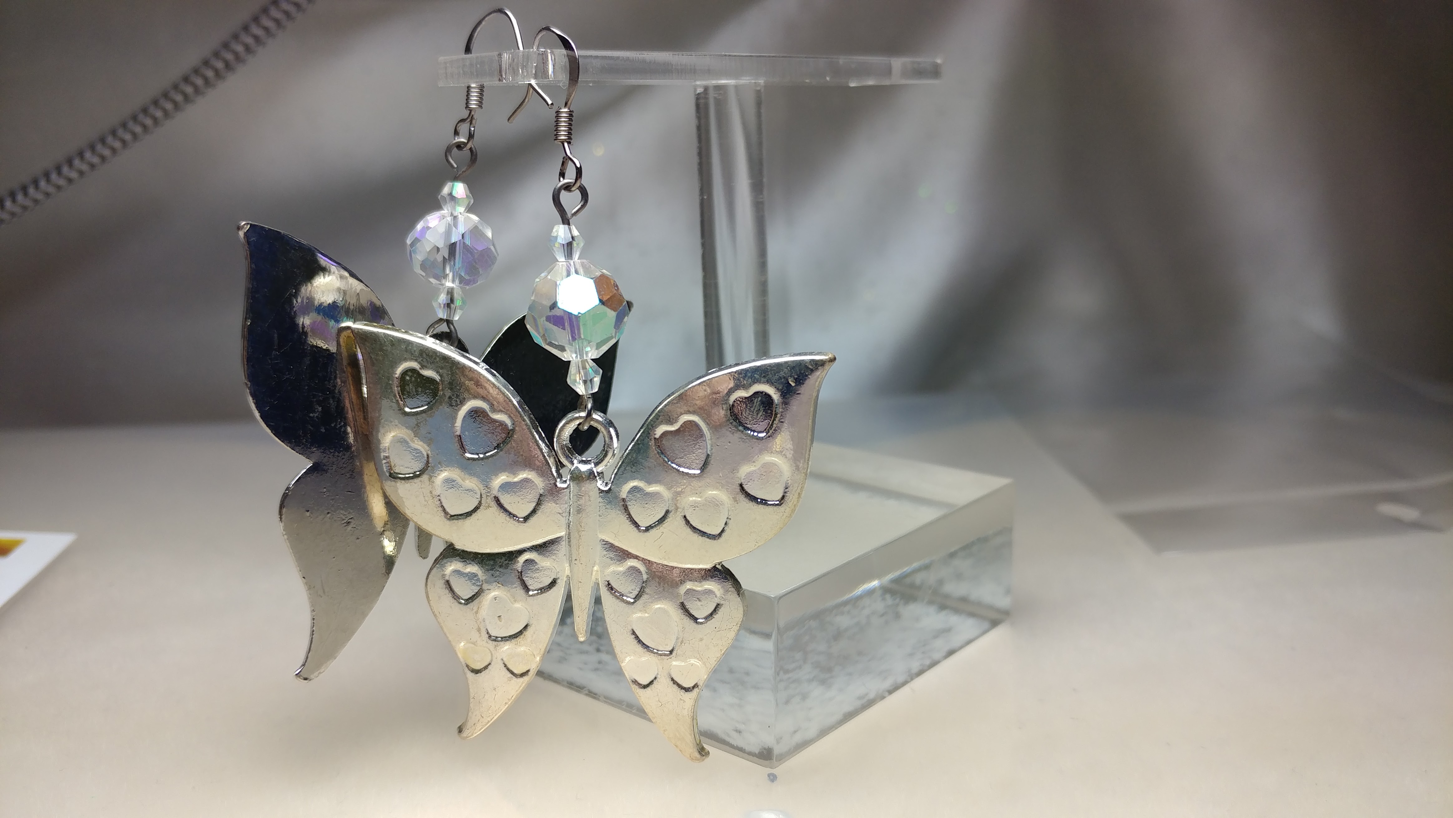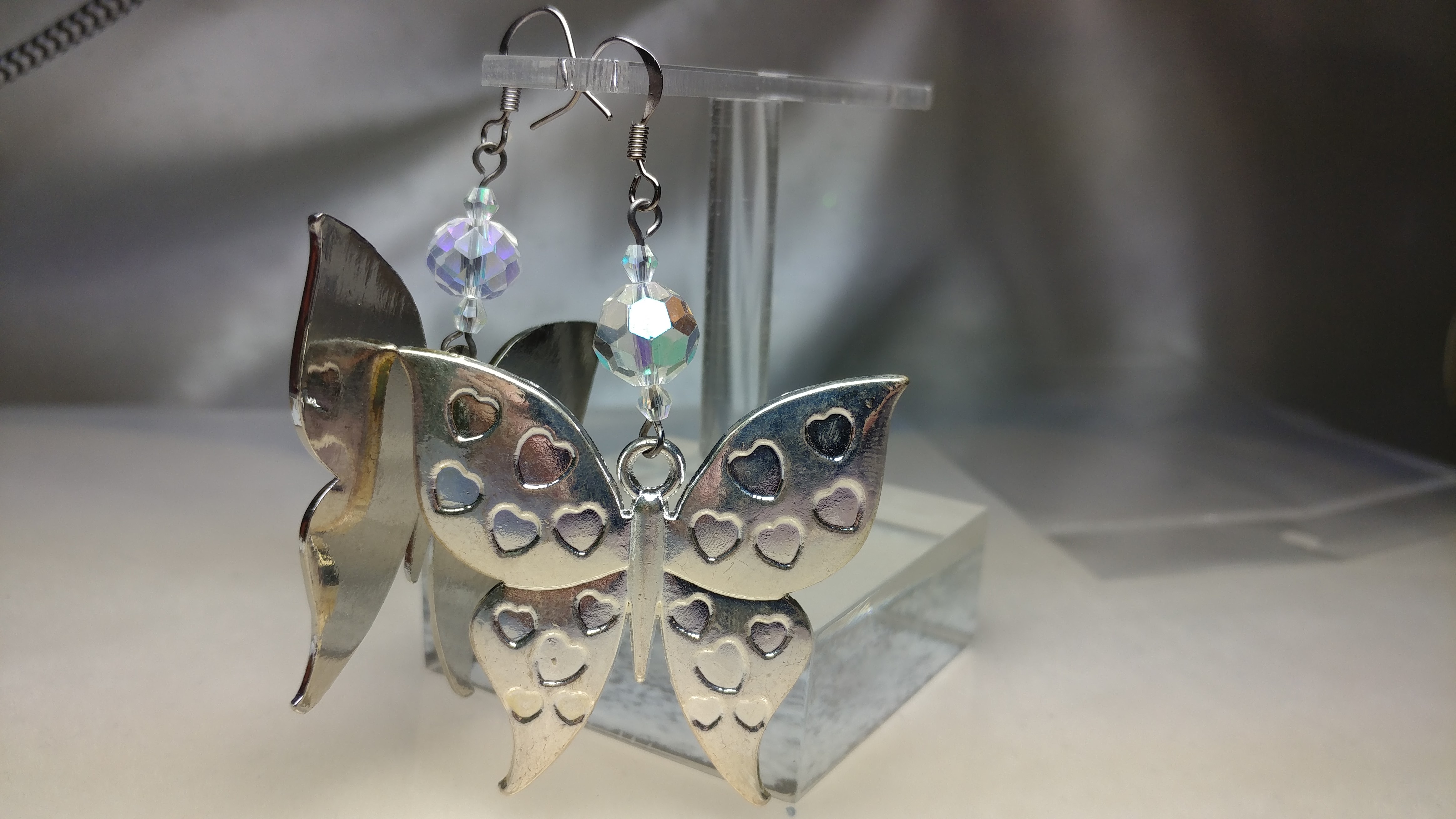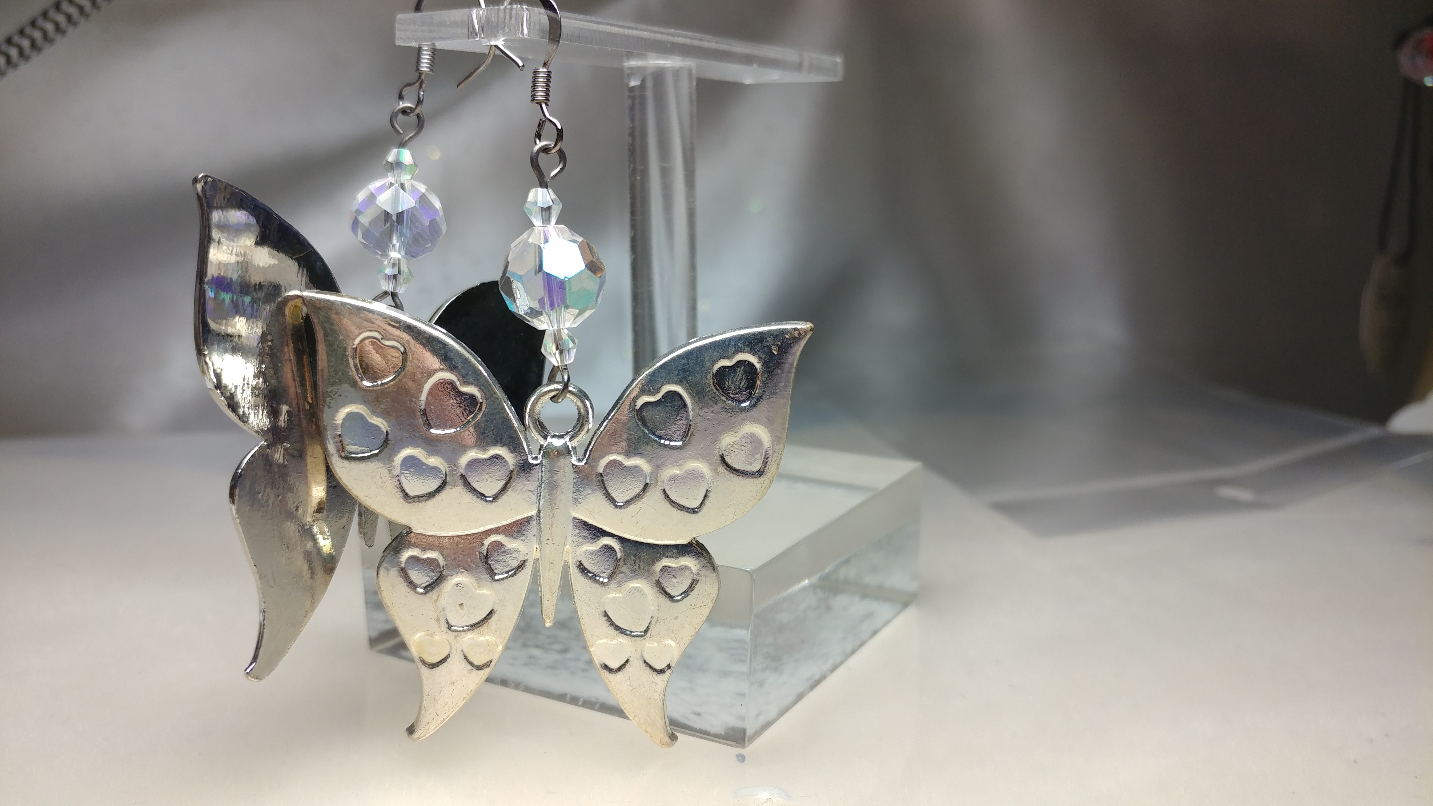 Handmade with a Silvertone butterflies, with glass AB clear colored beads and Stainless Steel Earring Hooks