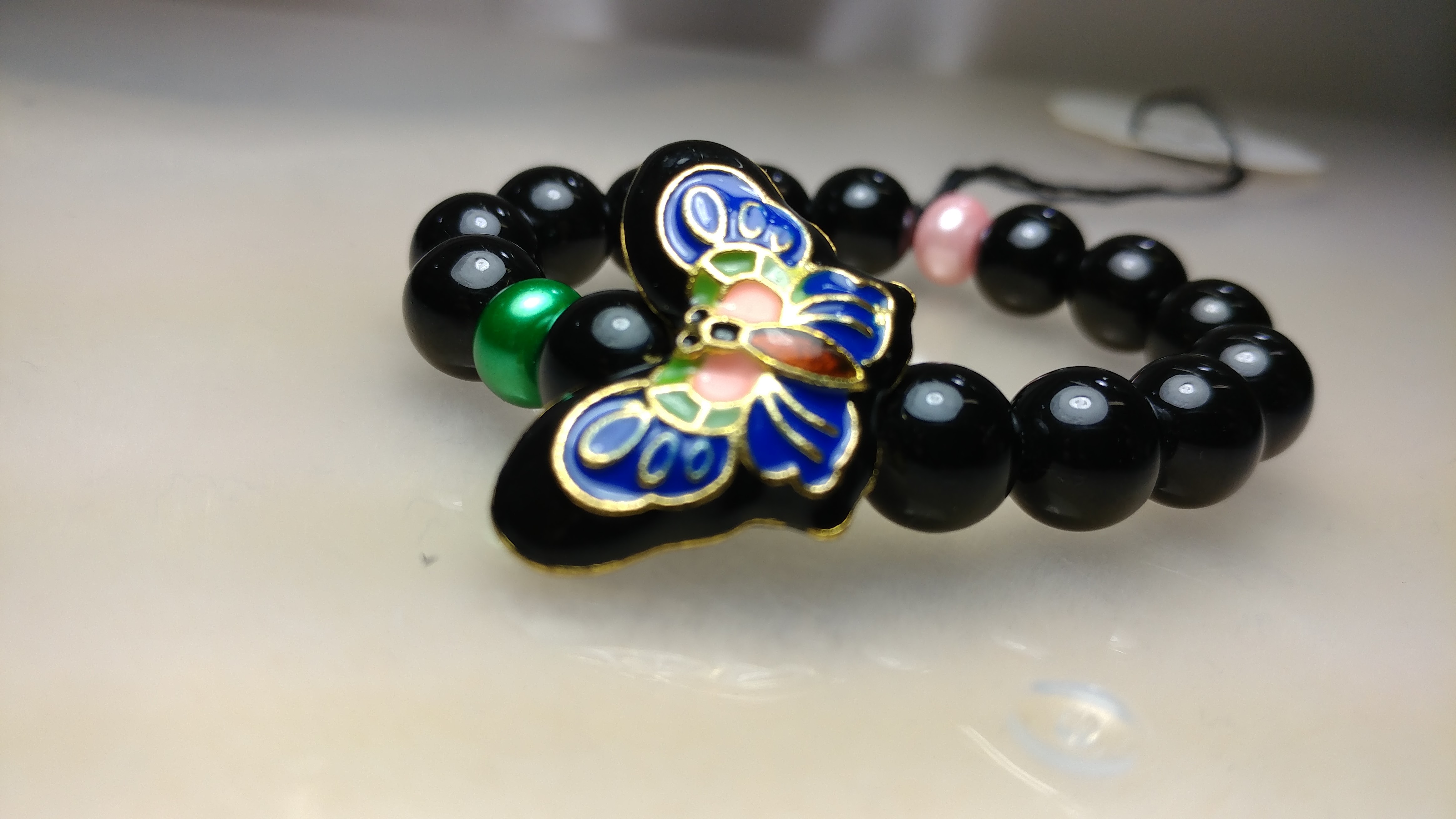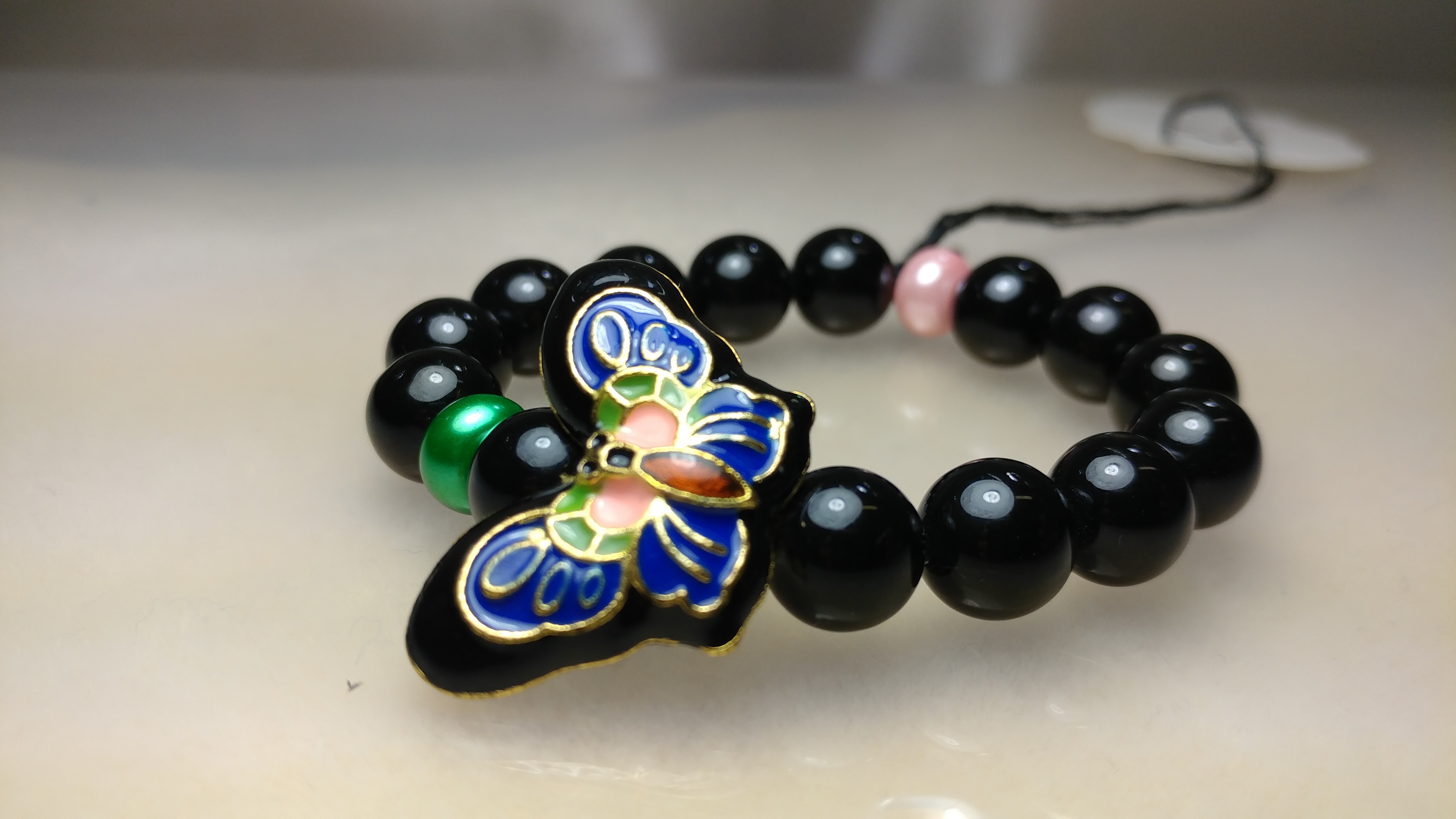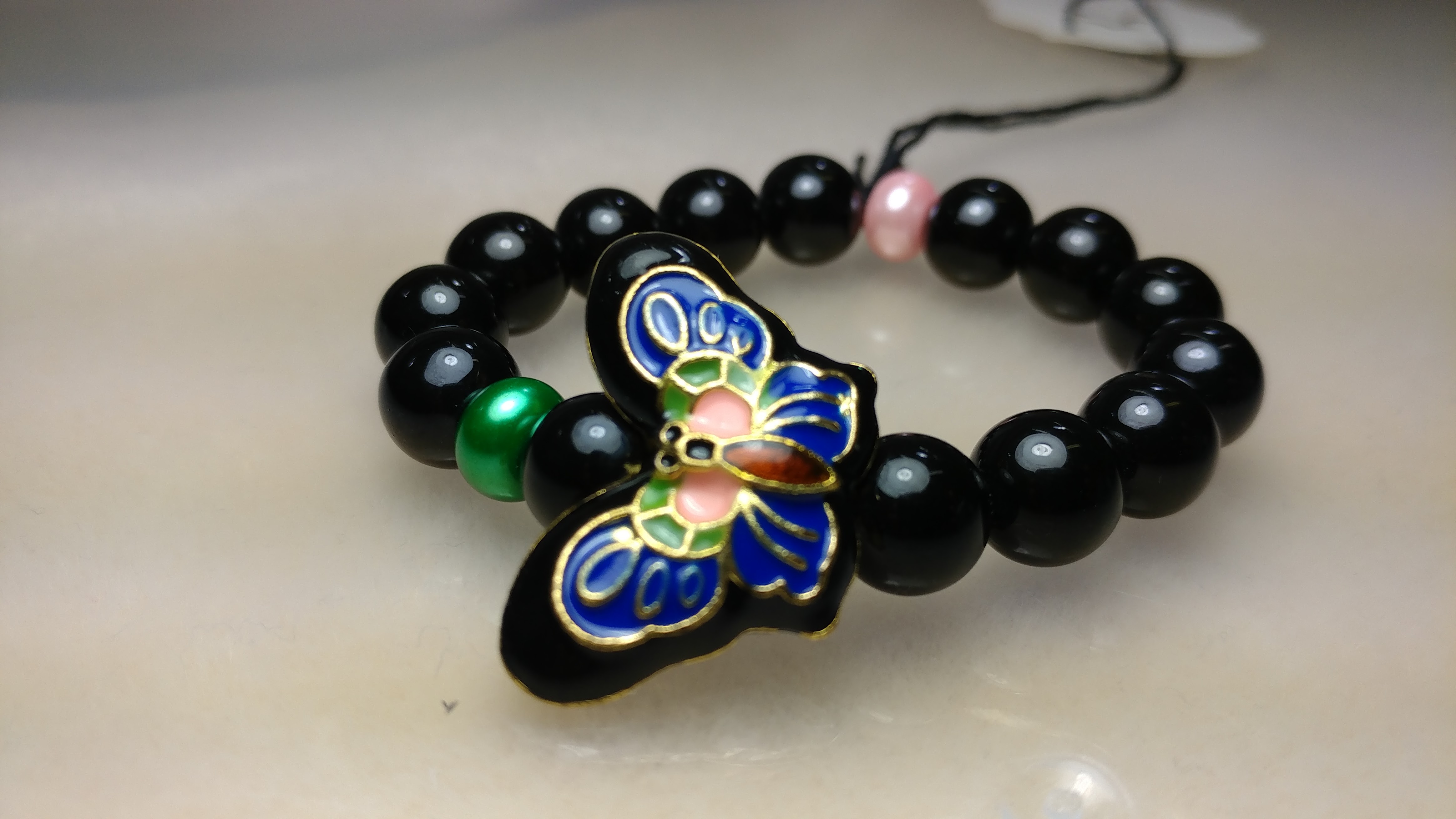 Made with 8mm black onyx beads, pair with a butterfly charm and glass painted accent beads on a clear elastic cord.