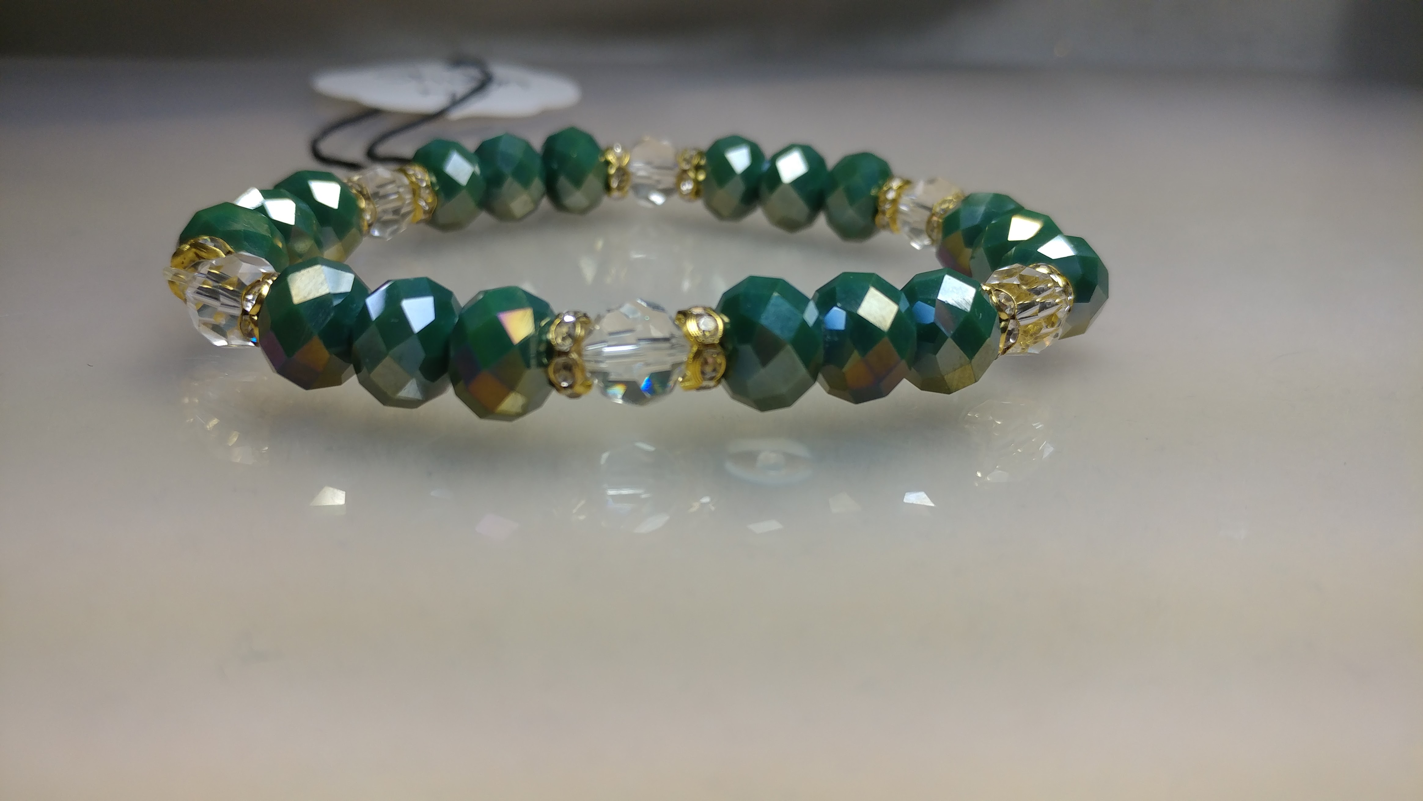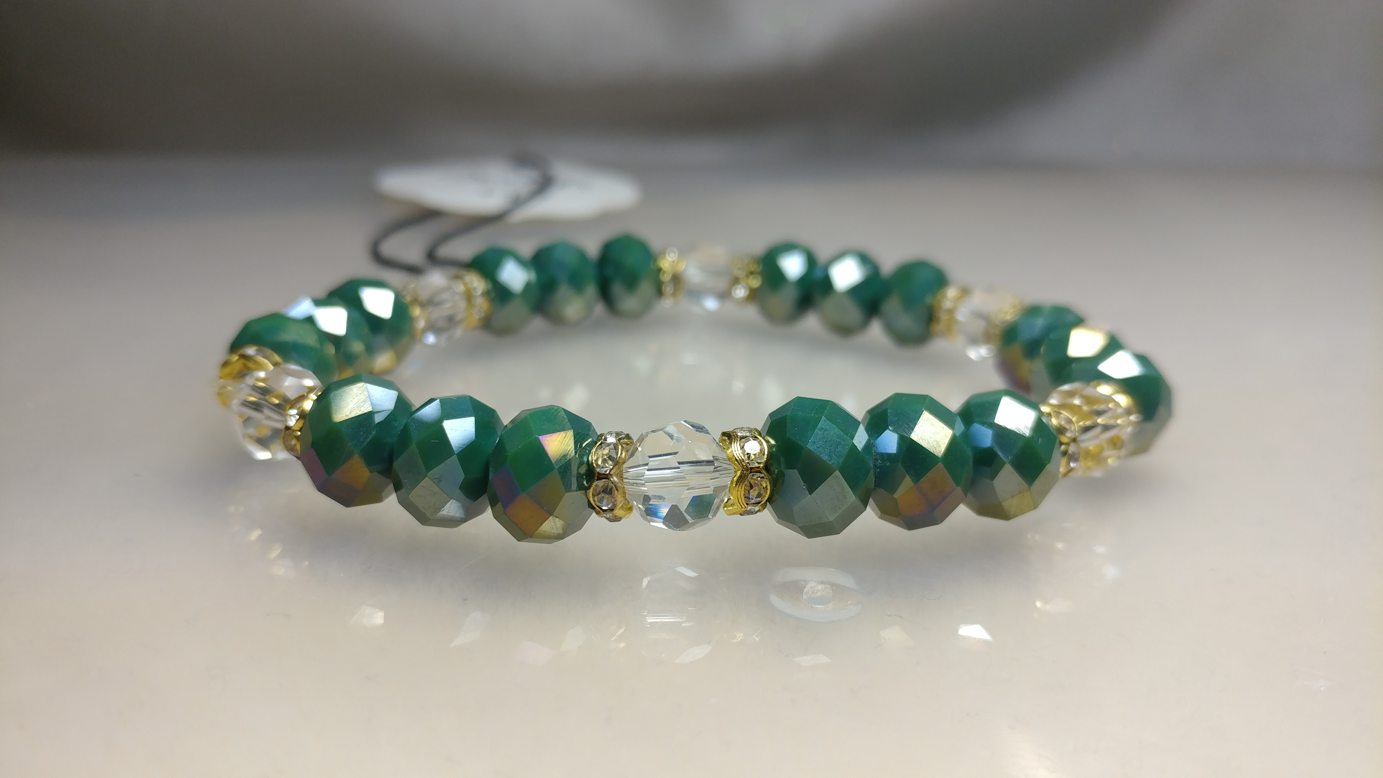 Handmade with green AB beads glass beads, accented with clear glass bead and rhinestone gold tone spacer on a clear elastic stretch cord.