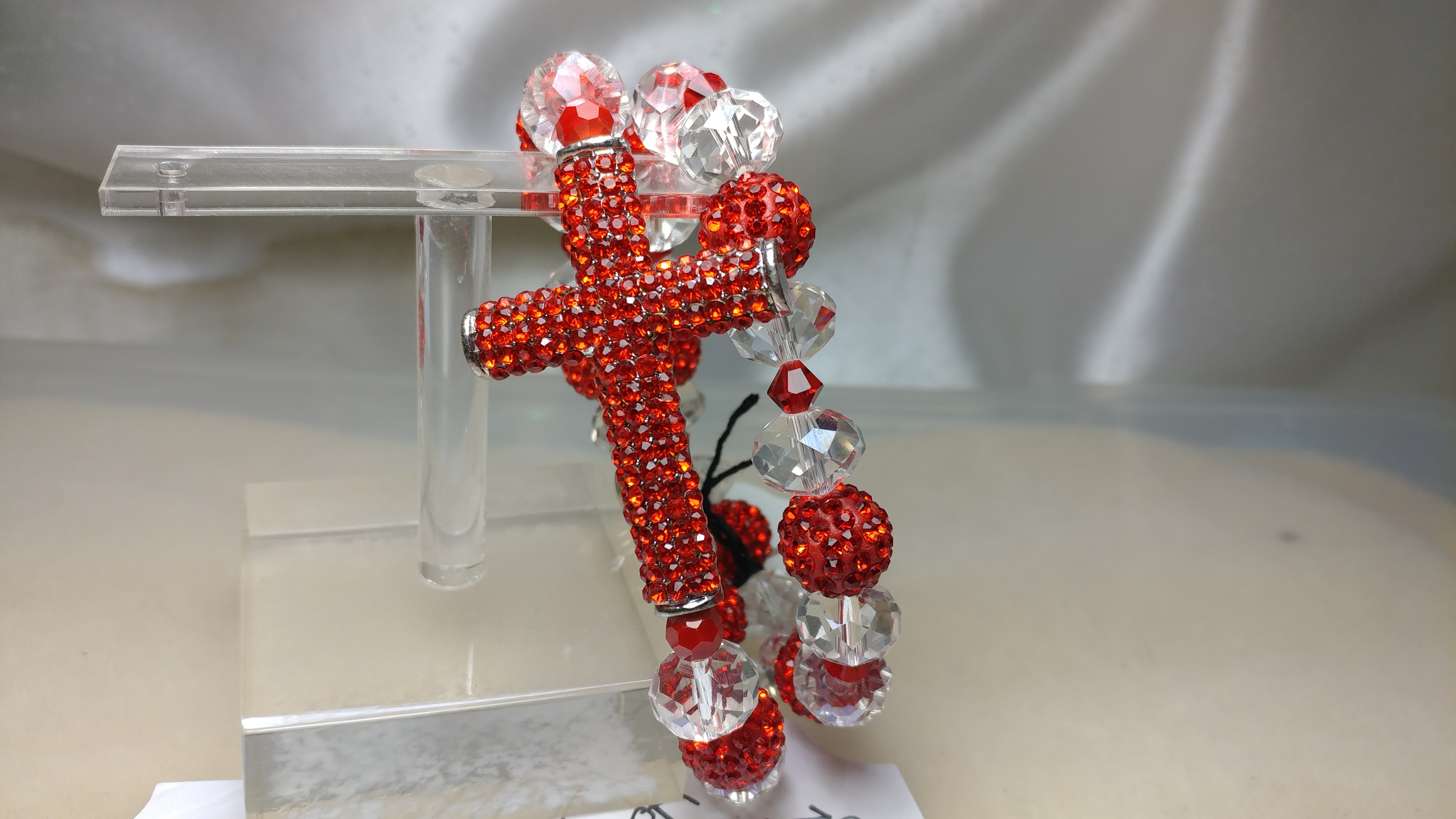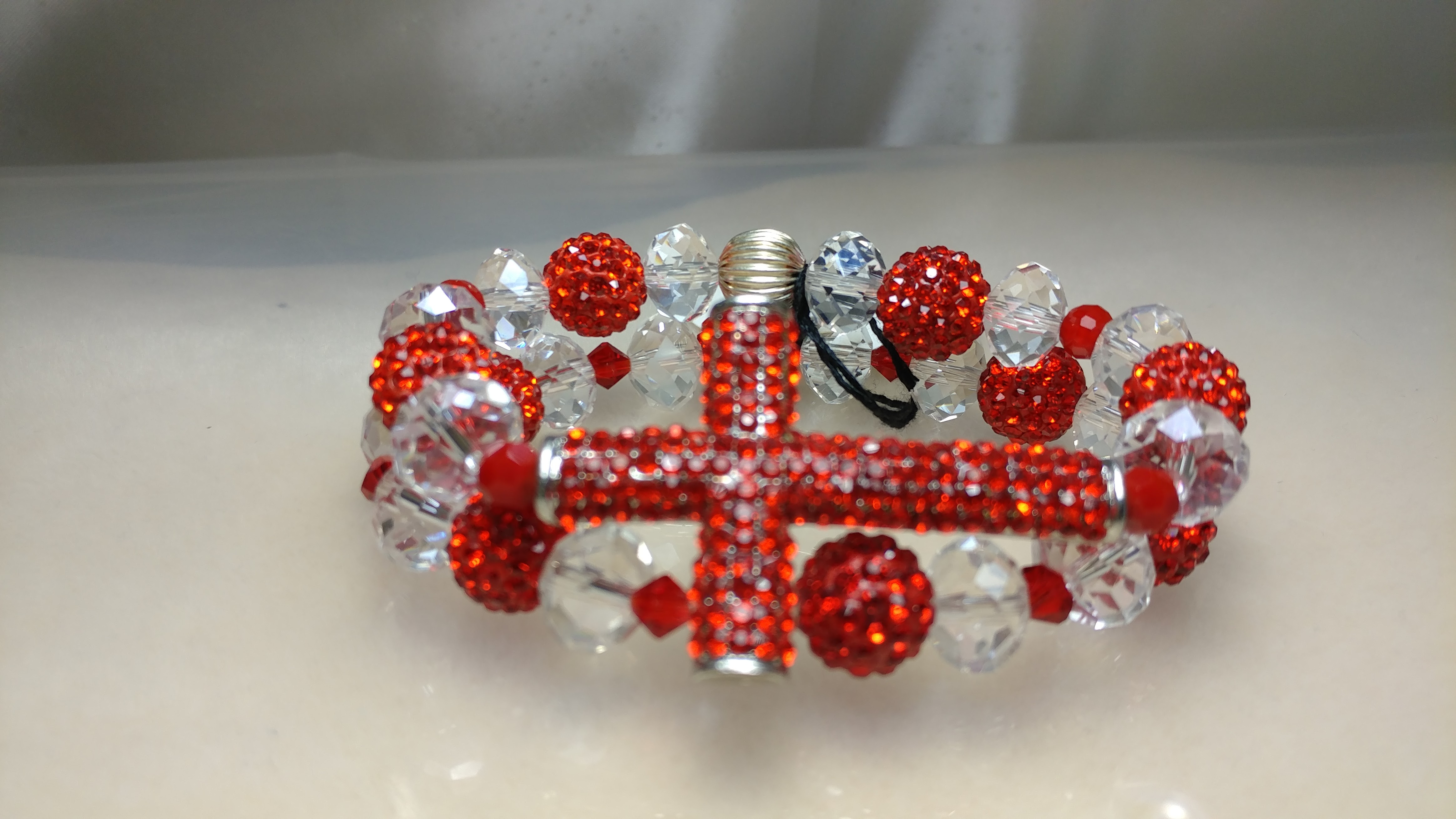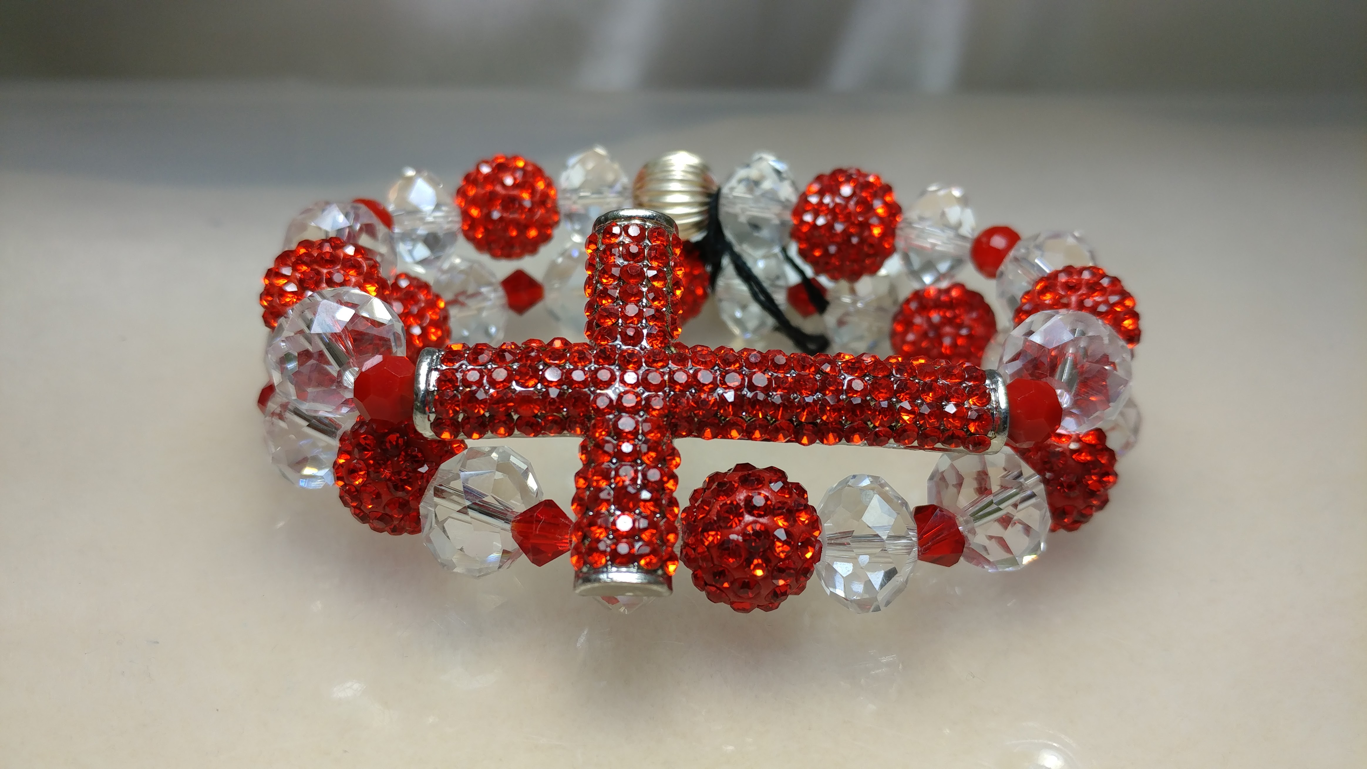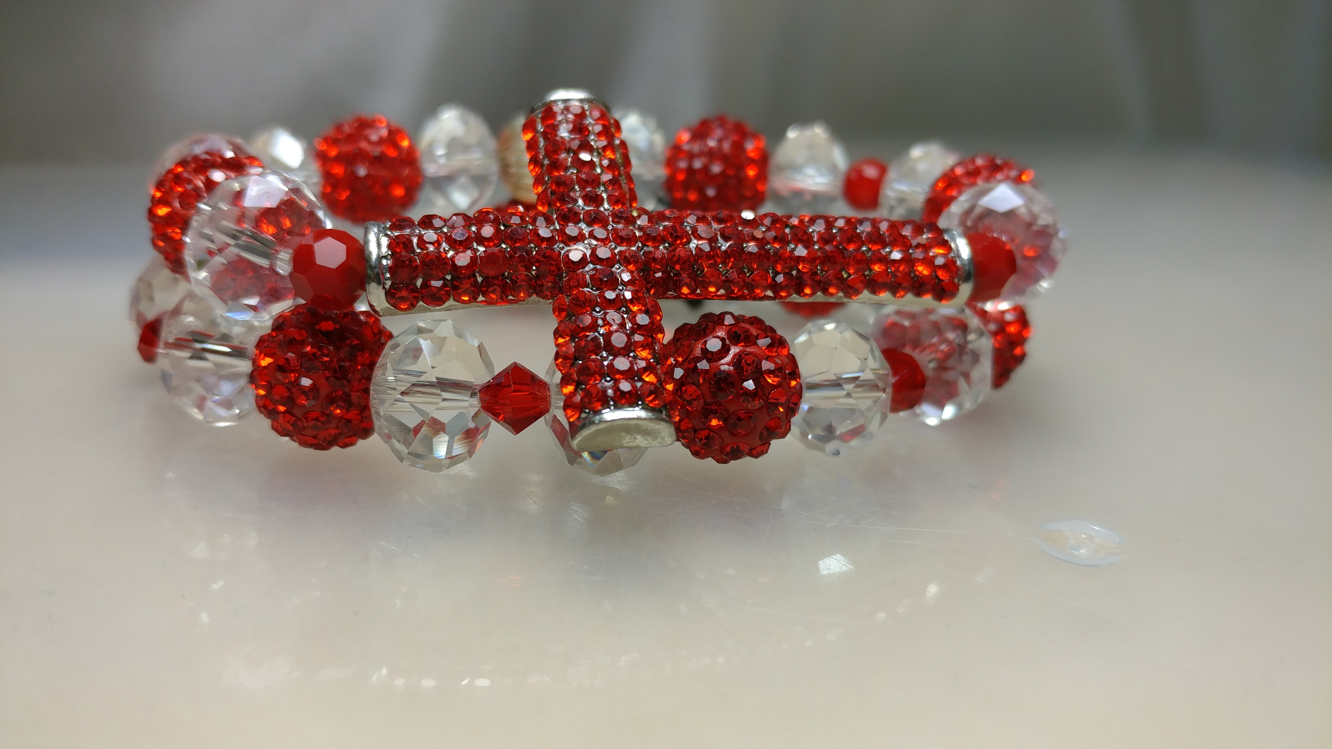 Handmade with silvertone and red rhinestone cross and crystal pave beads, crystal clear and red glass beads, on a stretchy clear cord.