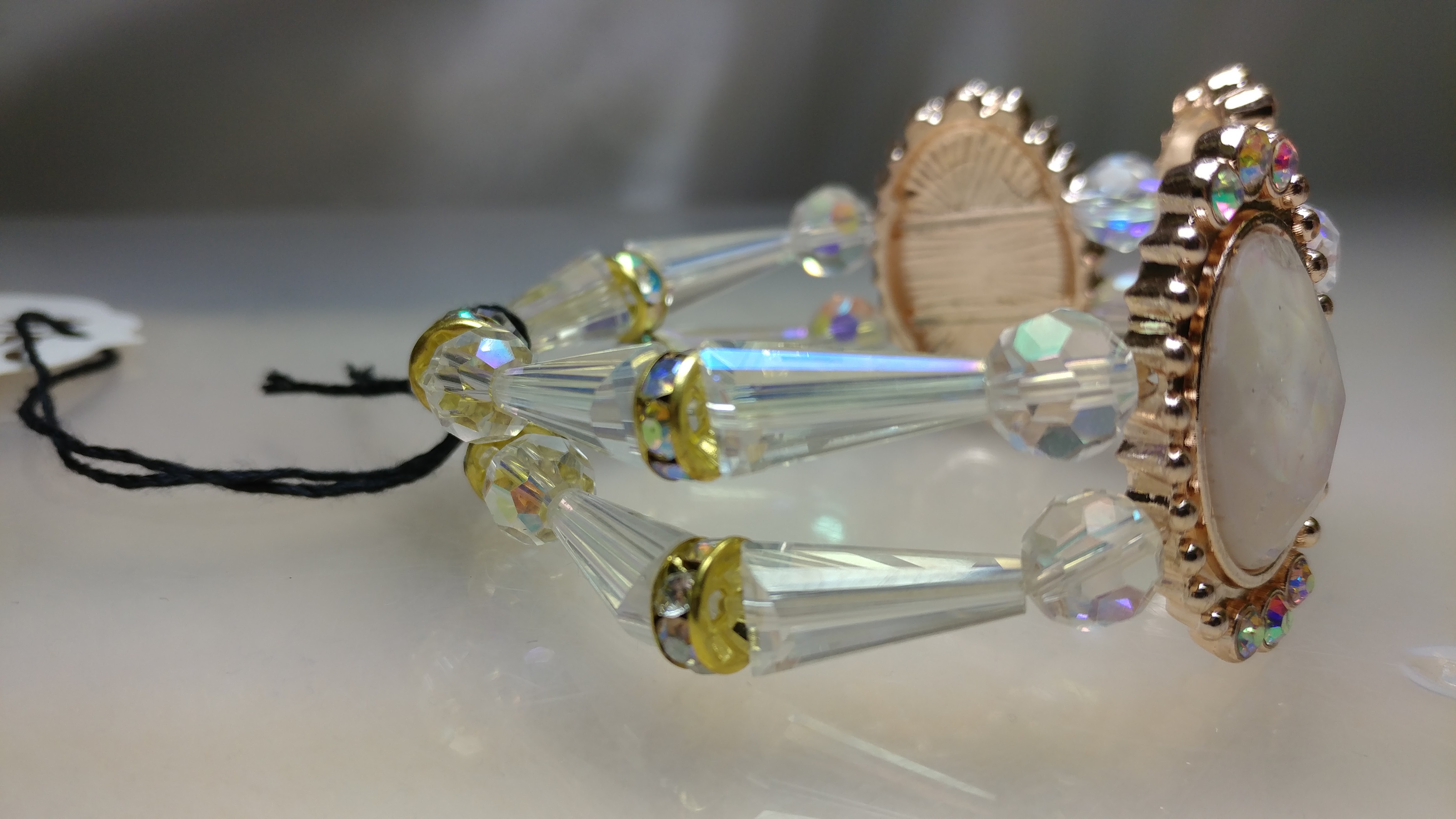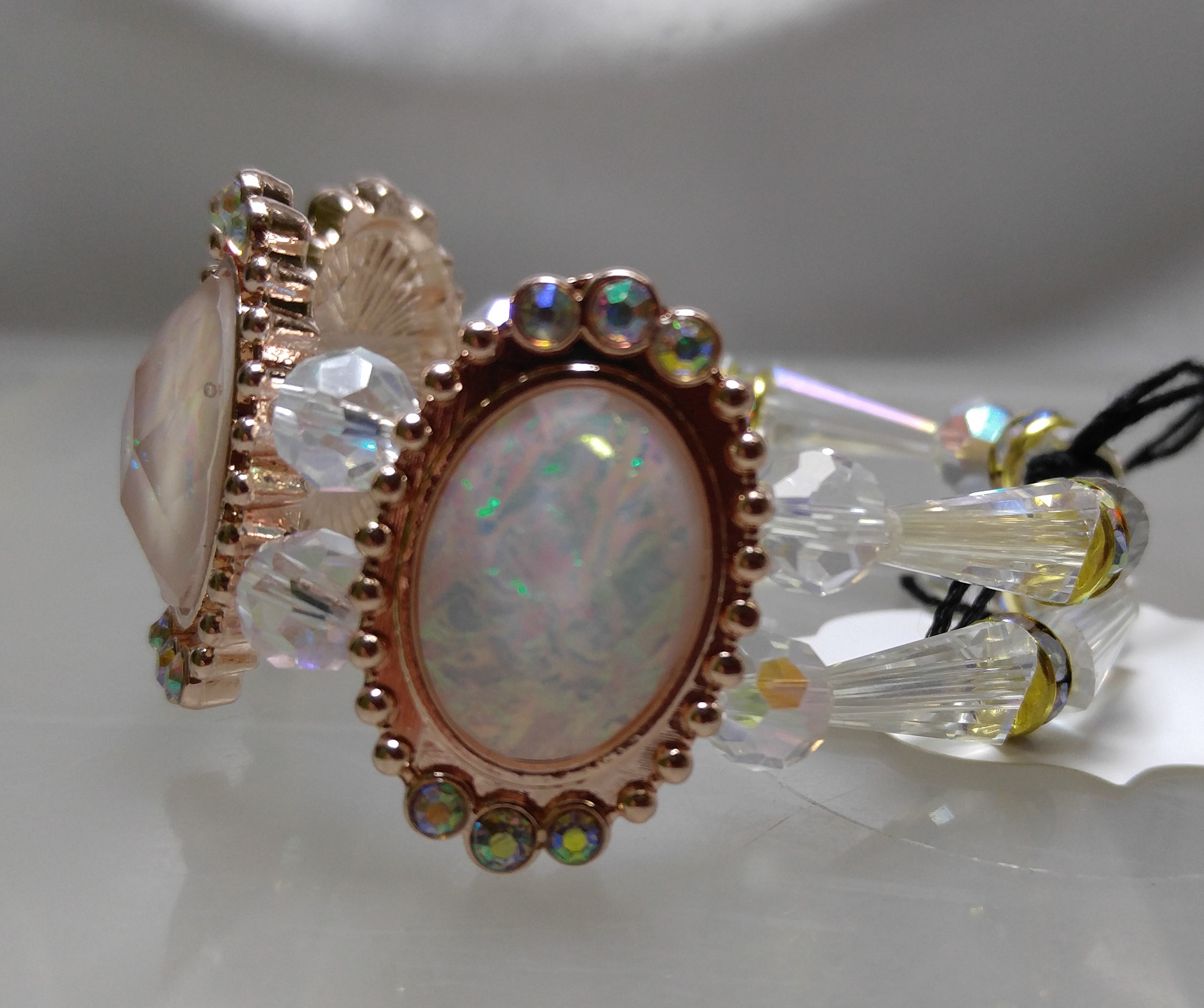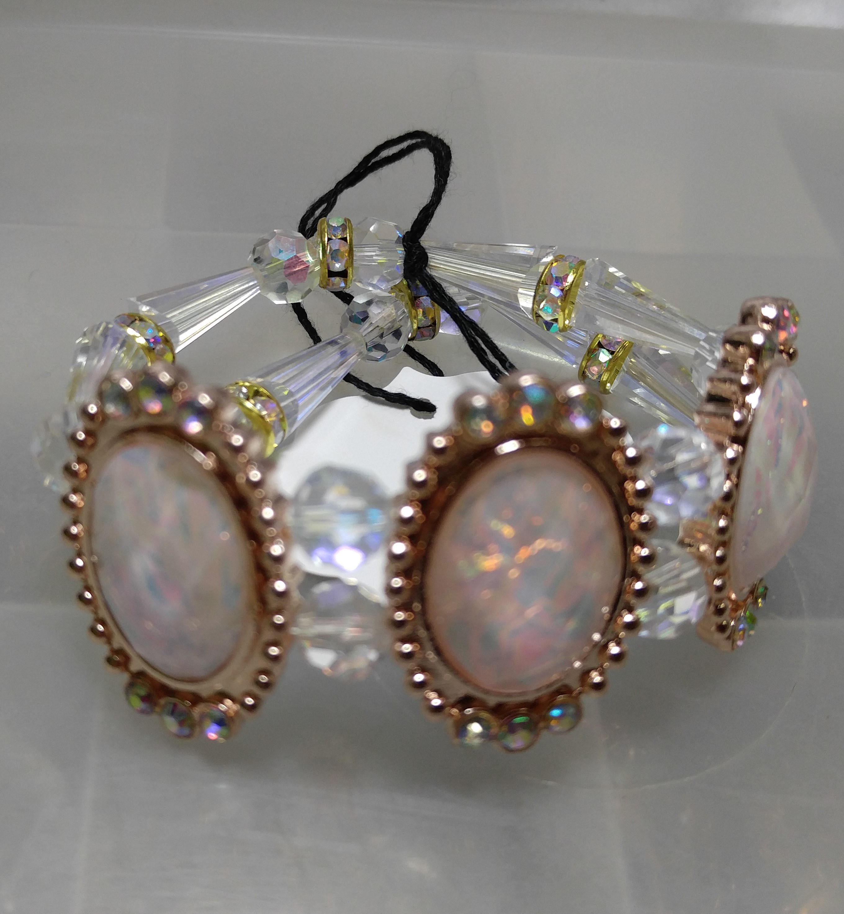 Handmade with a beautiful pink and goldtone slider beads, surrounded with clear AB glass crystal bead and gold tone AB rhinestone spacer bead on a clear stretchy cord.