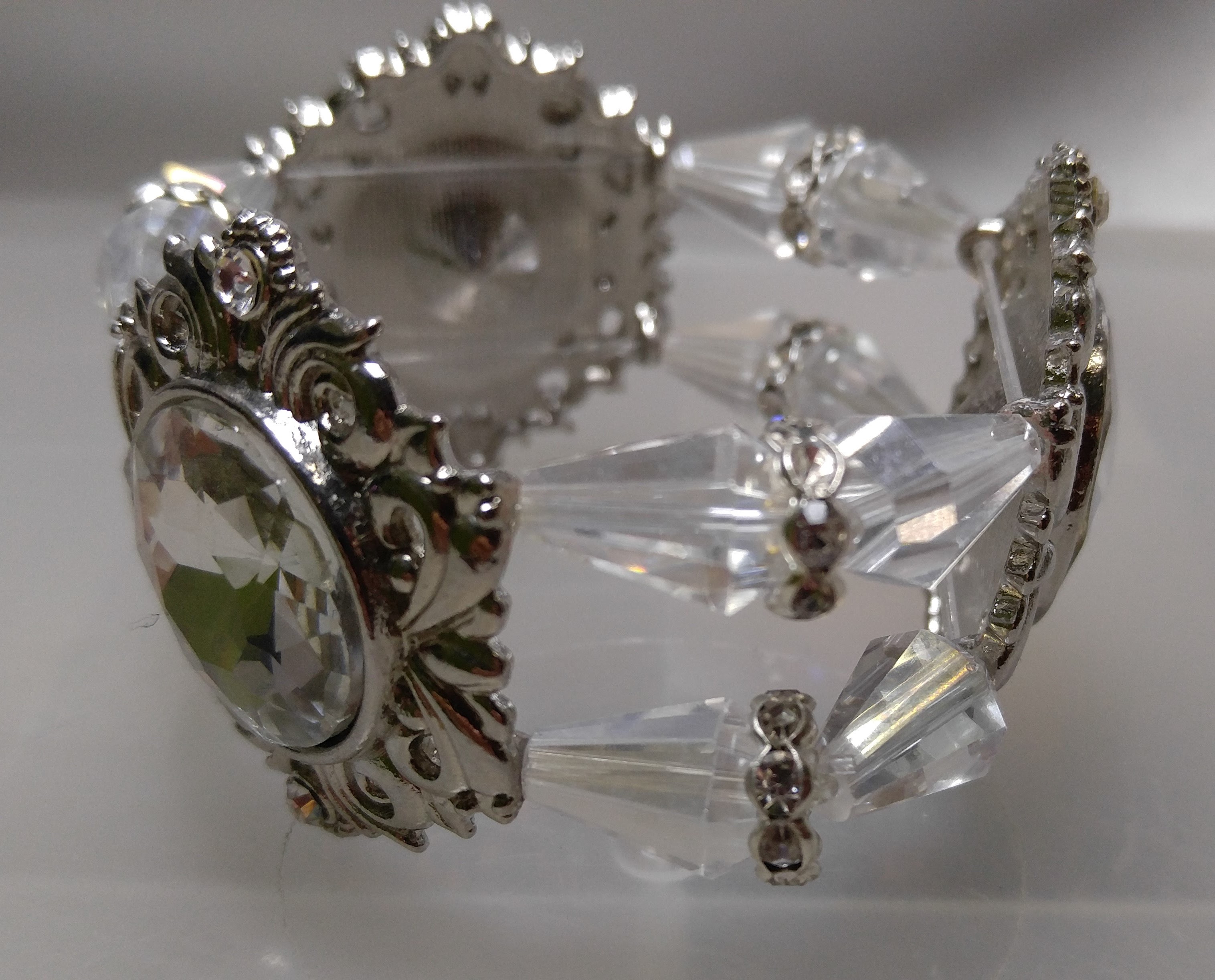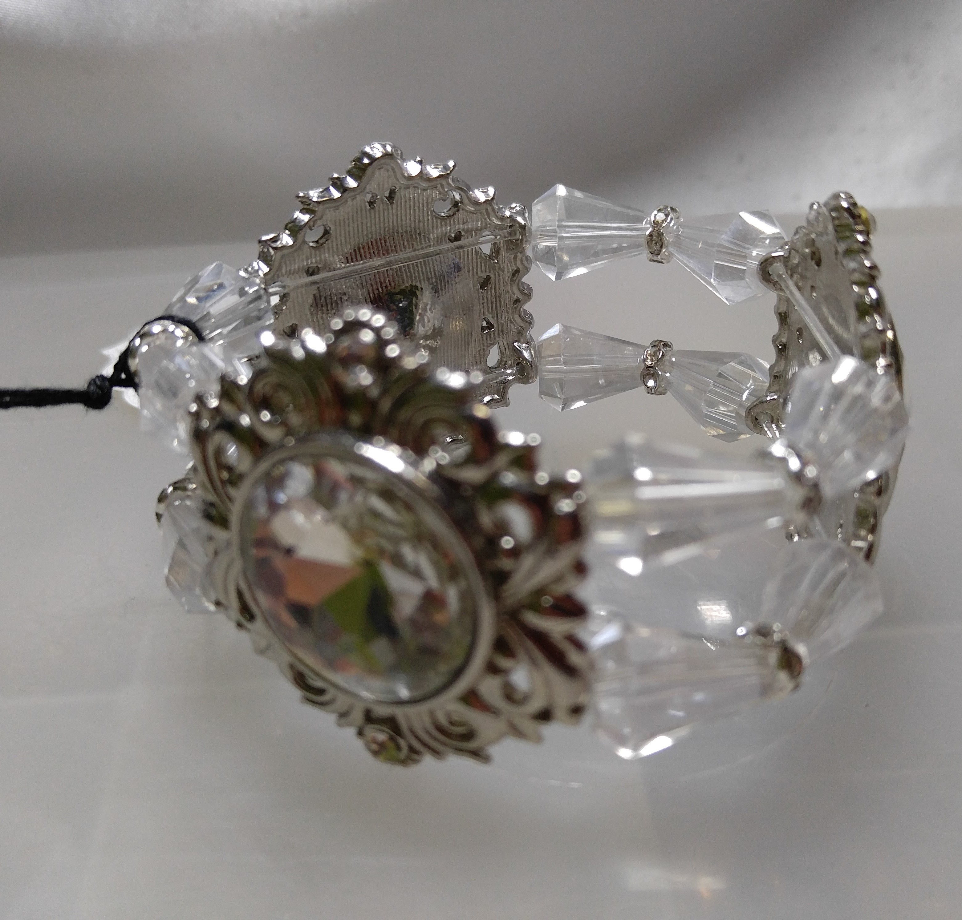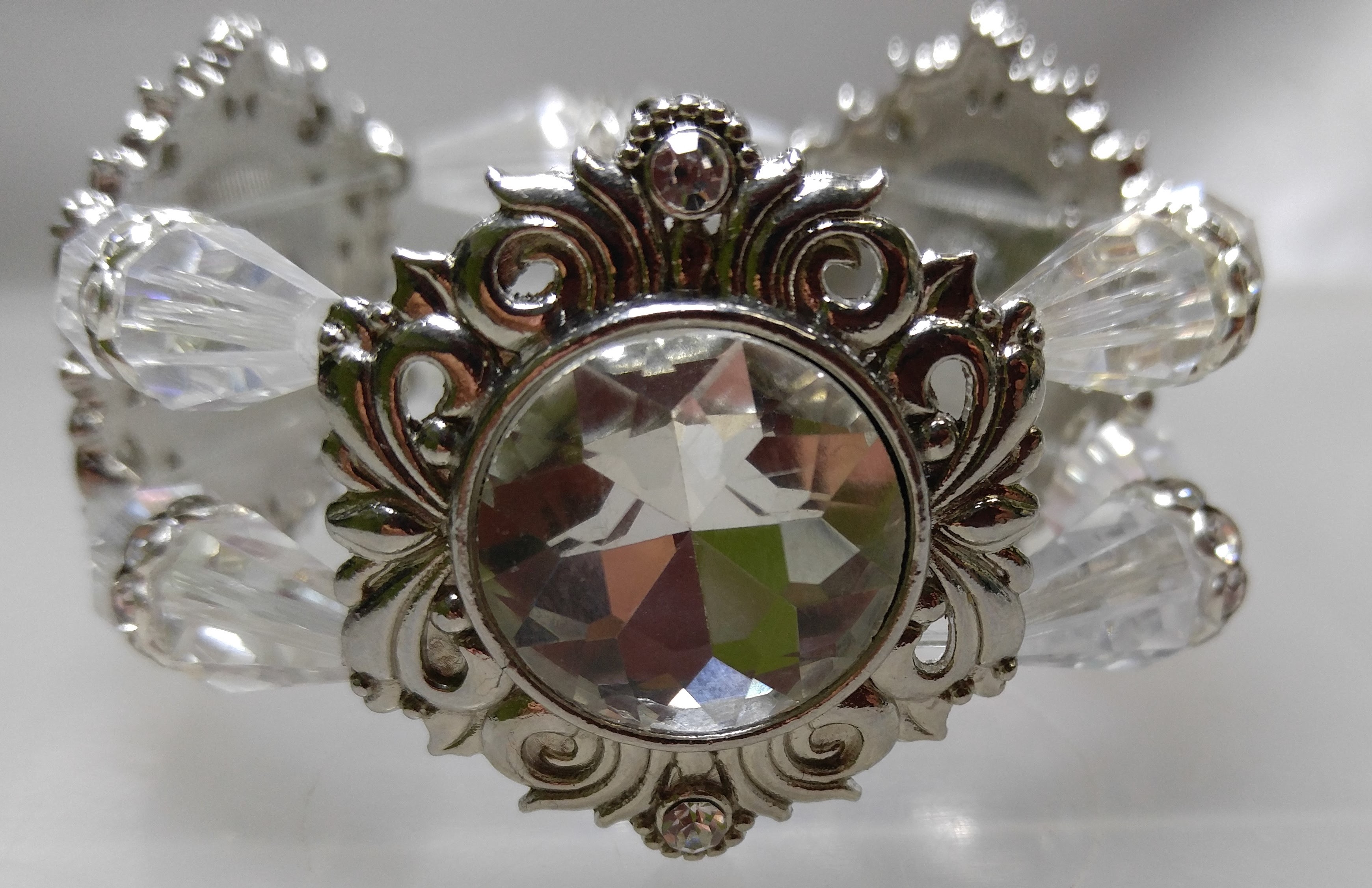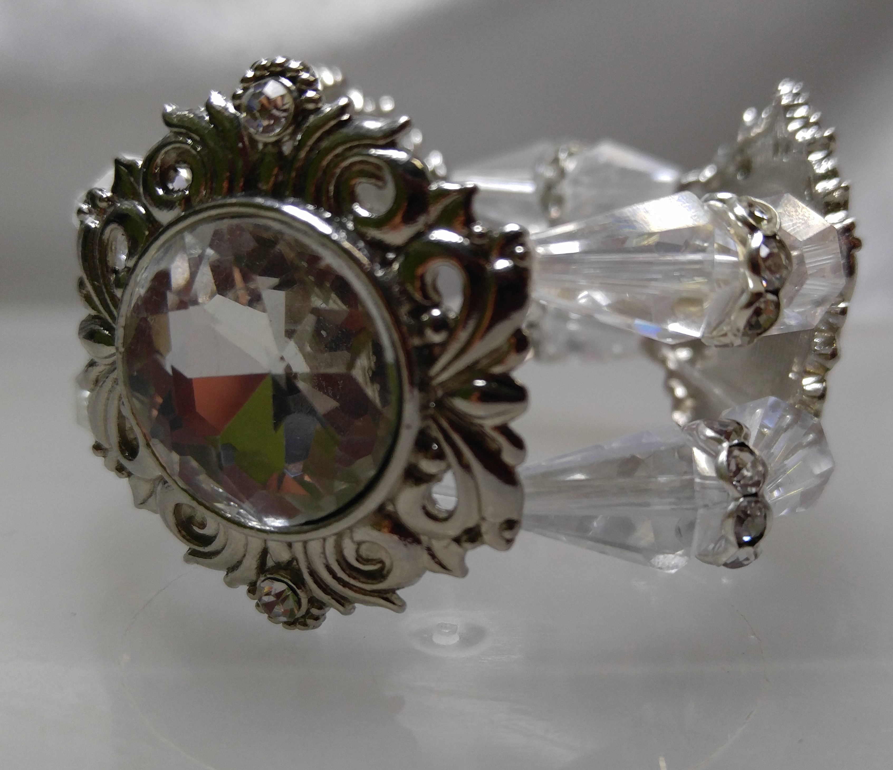 Handmade with a beautiful Large Metallic Sliders beads, surrounded with clear glass crystal bead and silver tone clear rhinestone spacer bead on a clear stretchy cord.