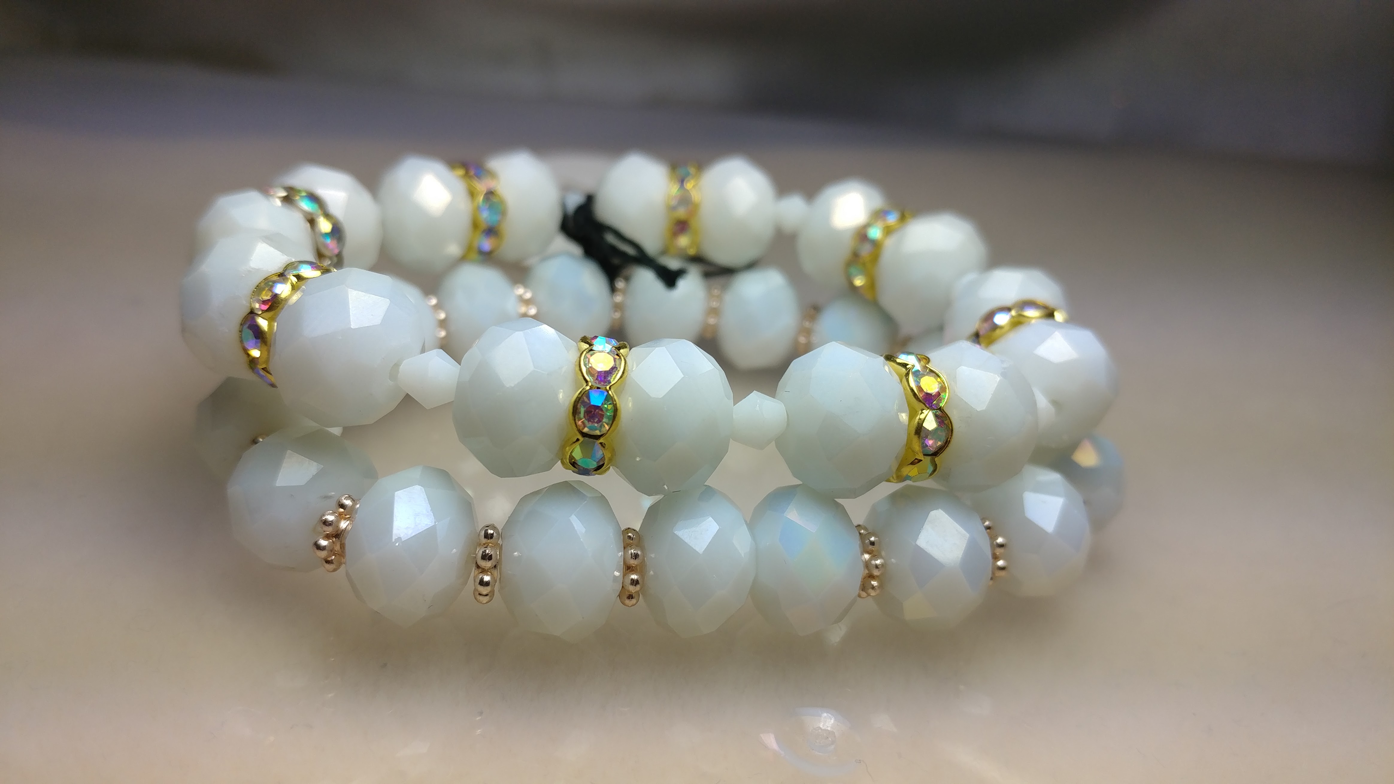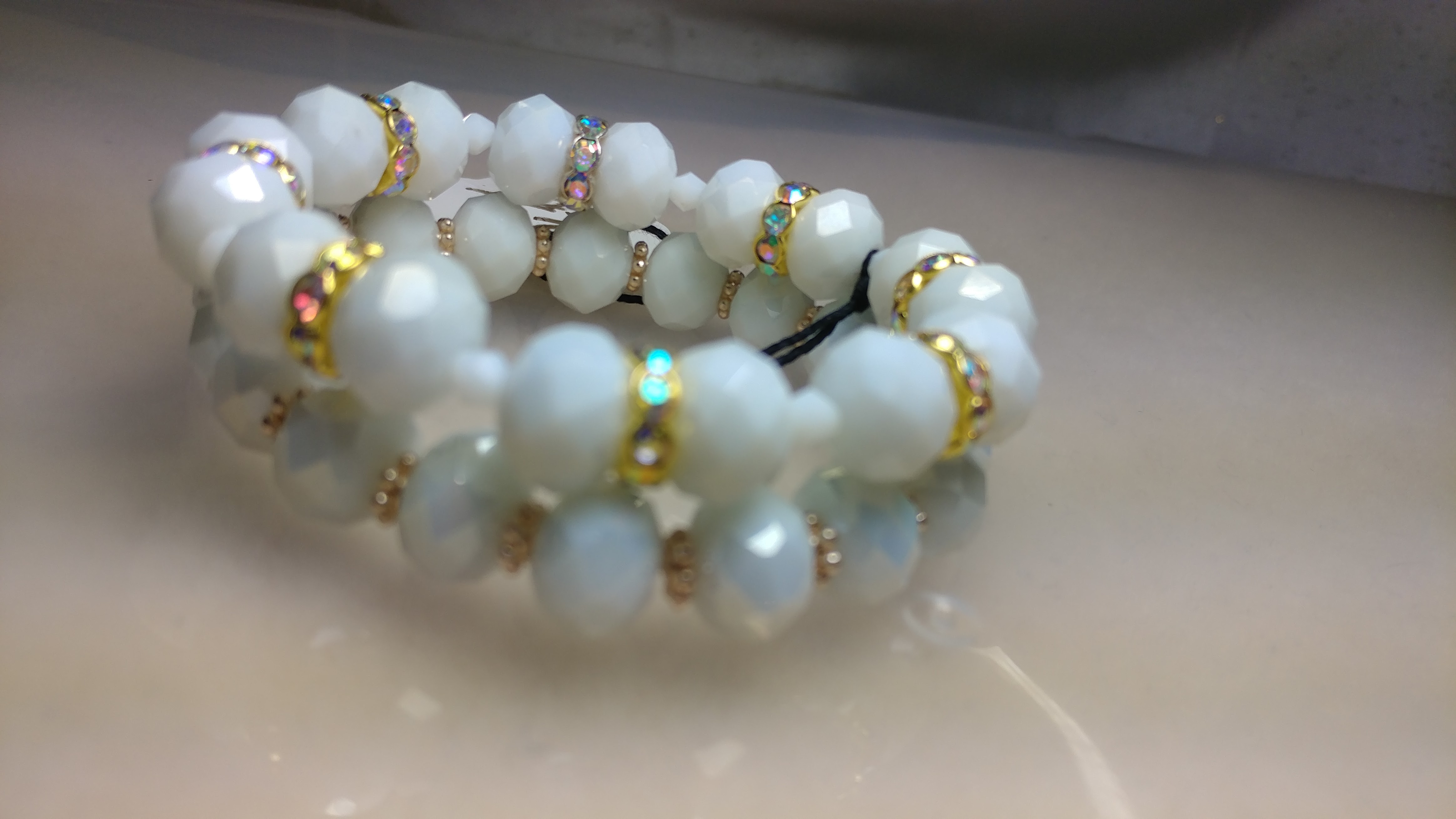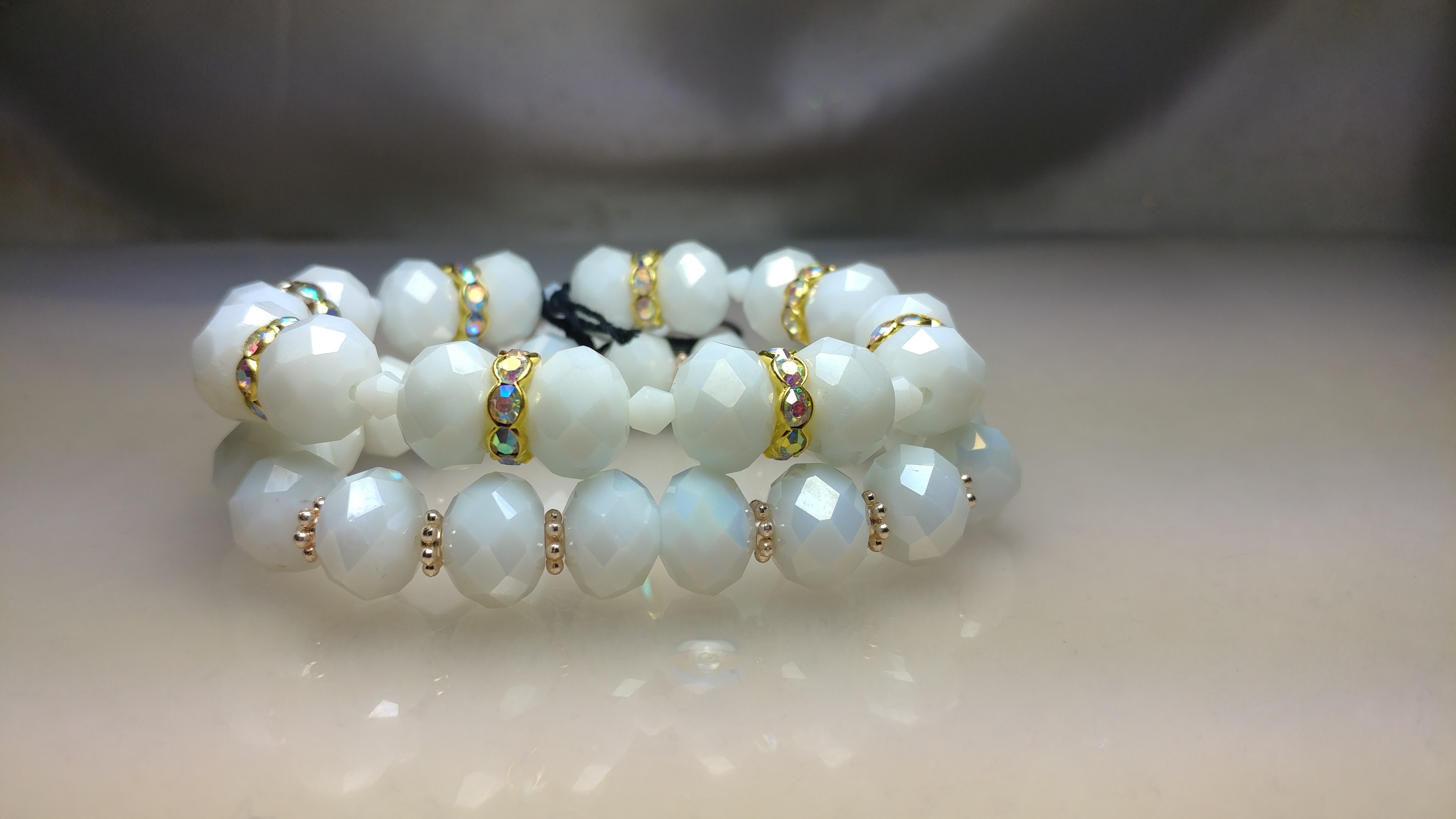 Handmade with white crystal glass beads, accented with gold AB colored rhinestone spacers and gold spacers on a clear stretchy cord.
