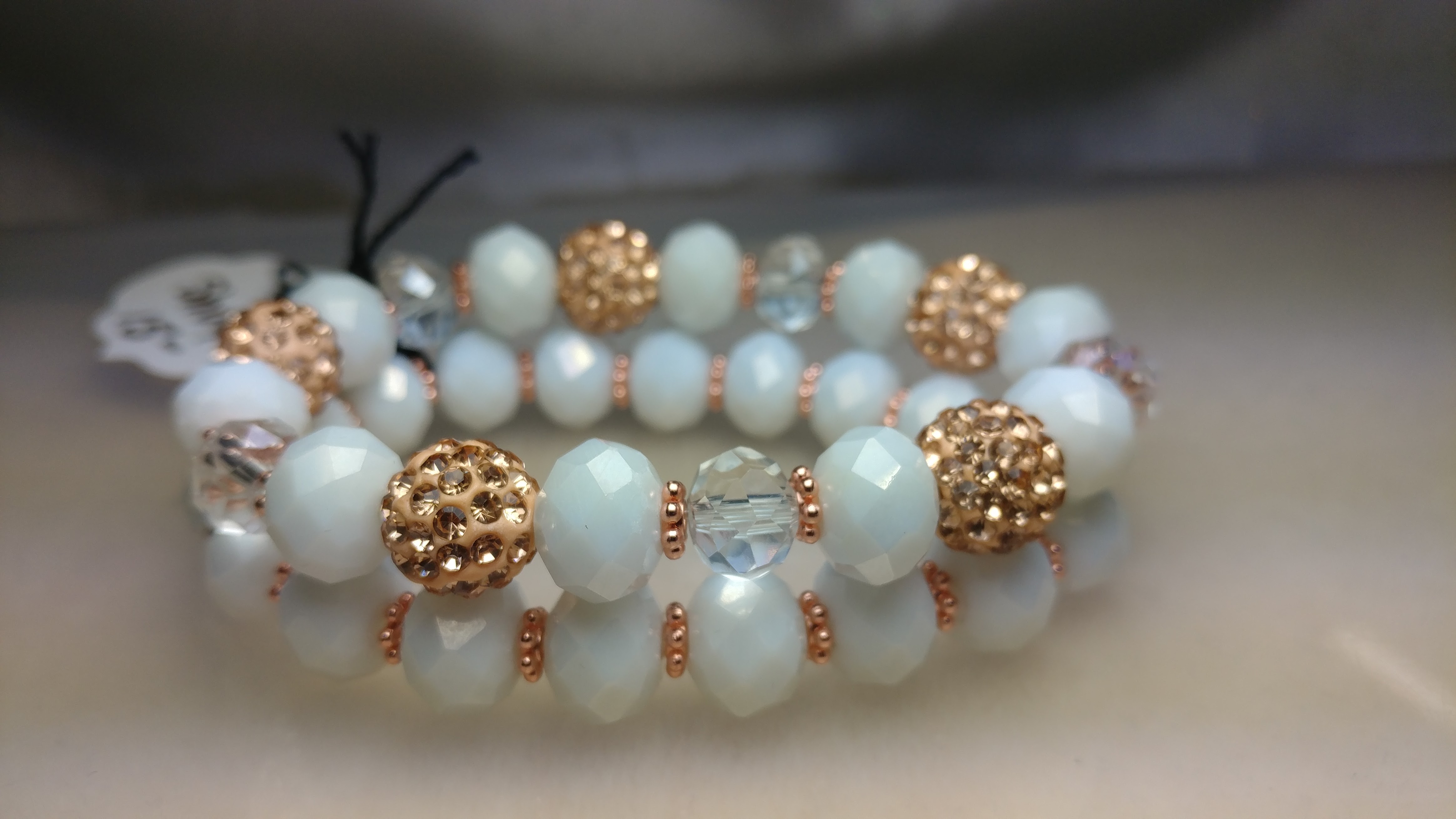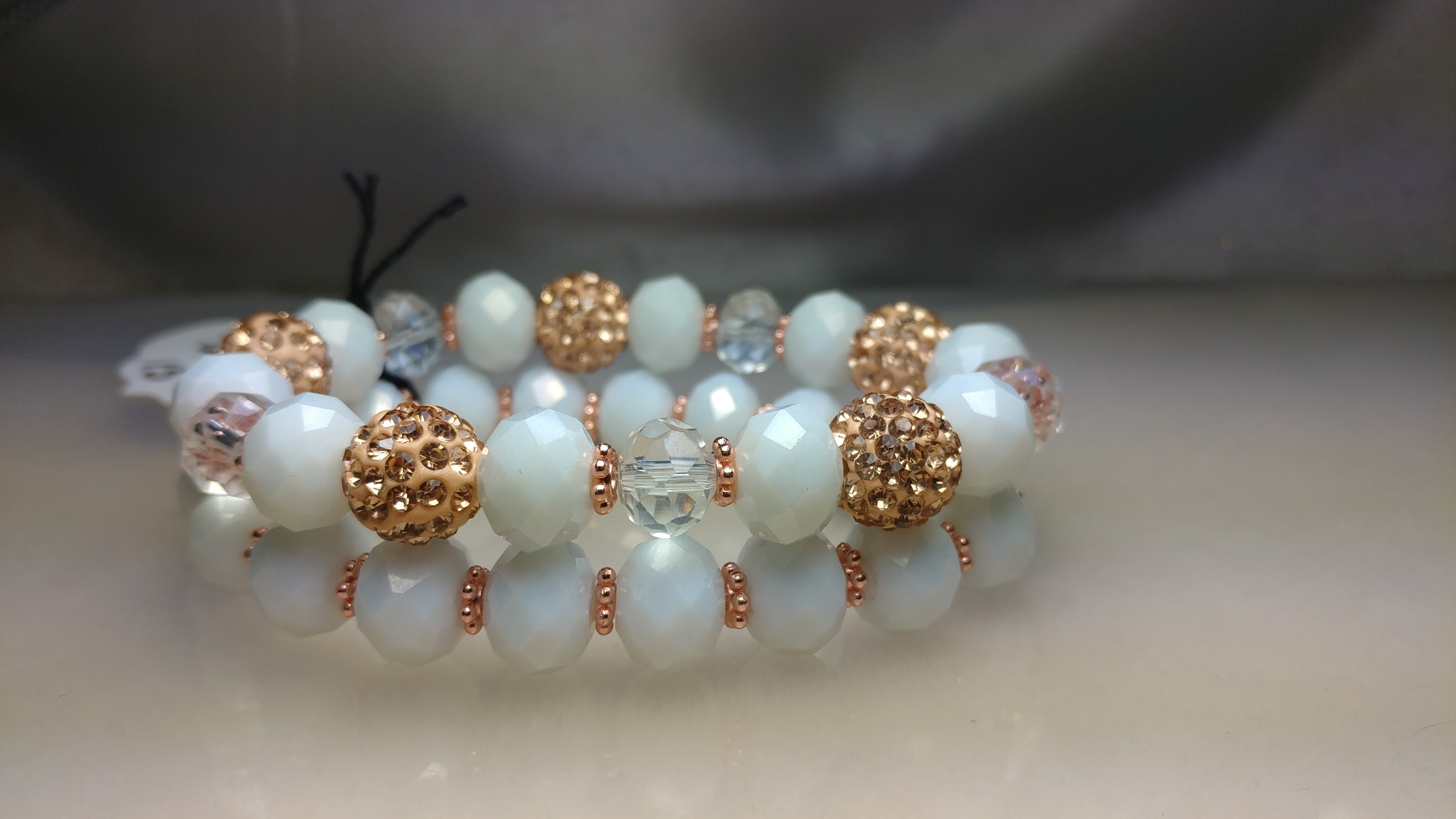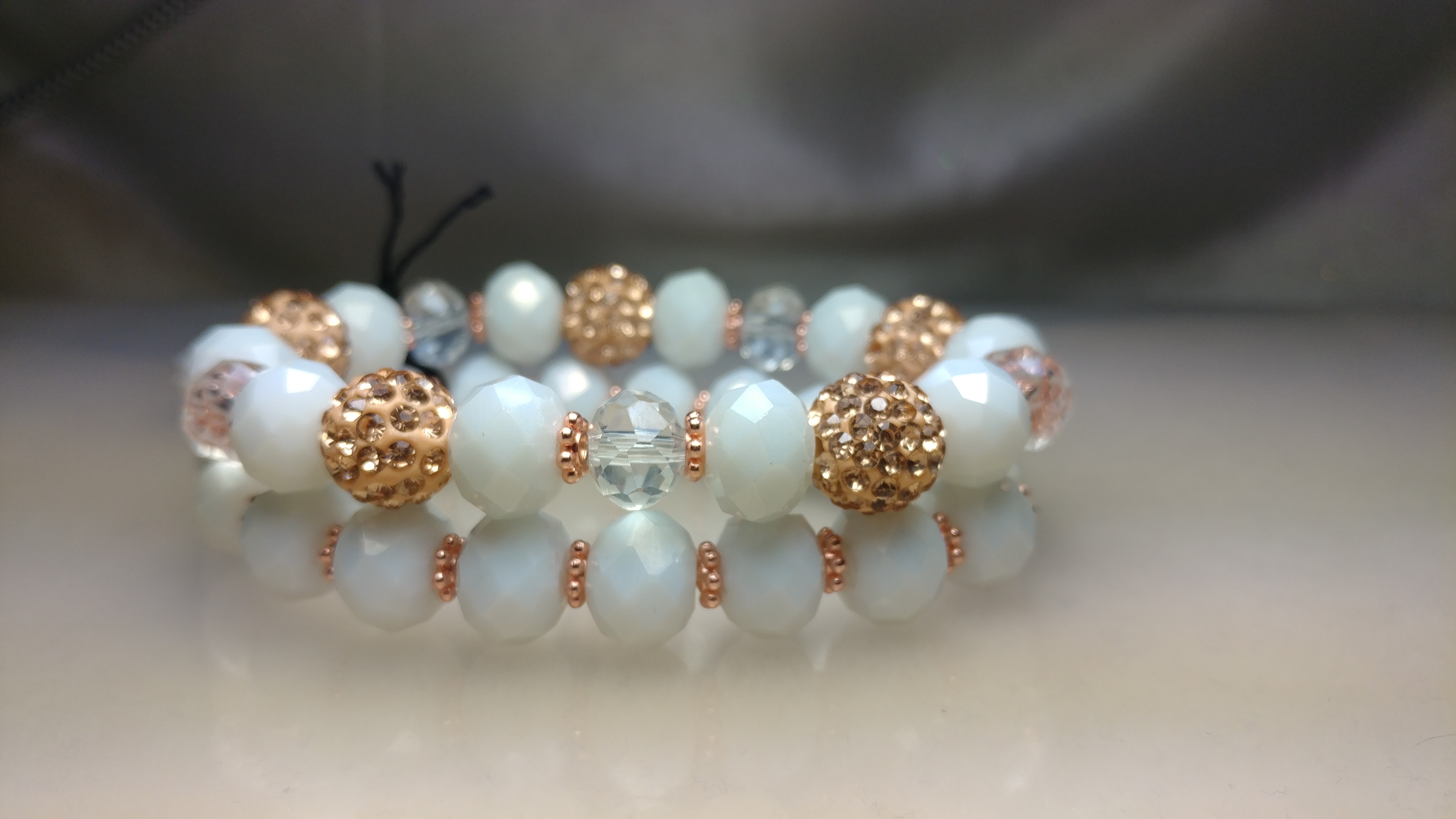 Handmade with white and clear crystal glass beads, accented with champagne colored rhinestone pave beads and rose gold spacer beads on a clear stretchy cord.