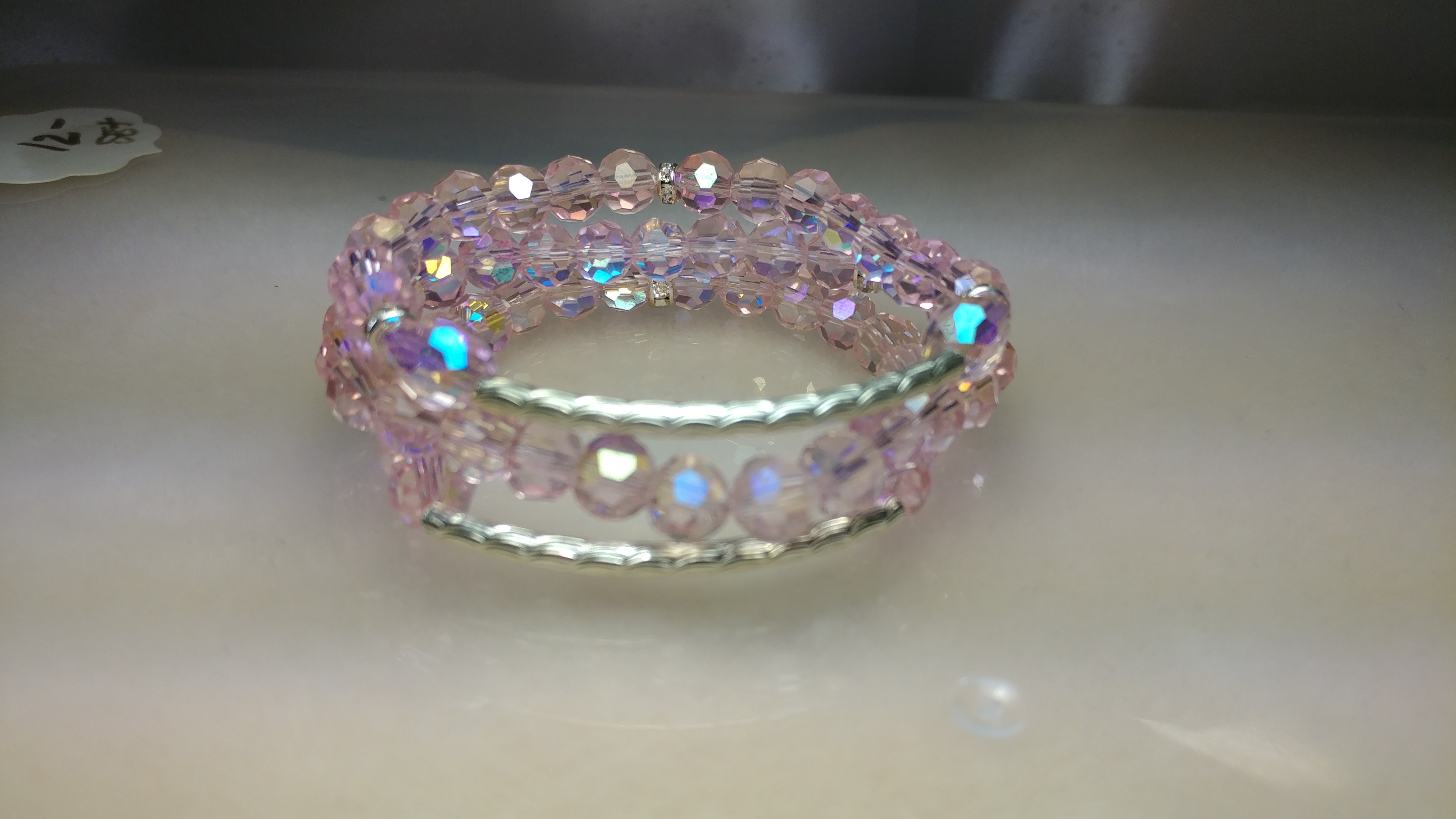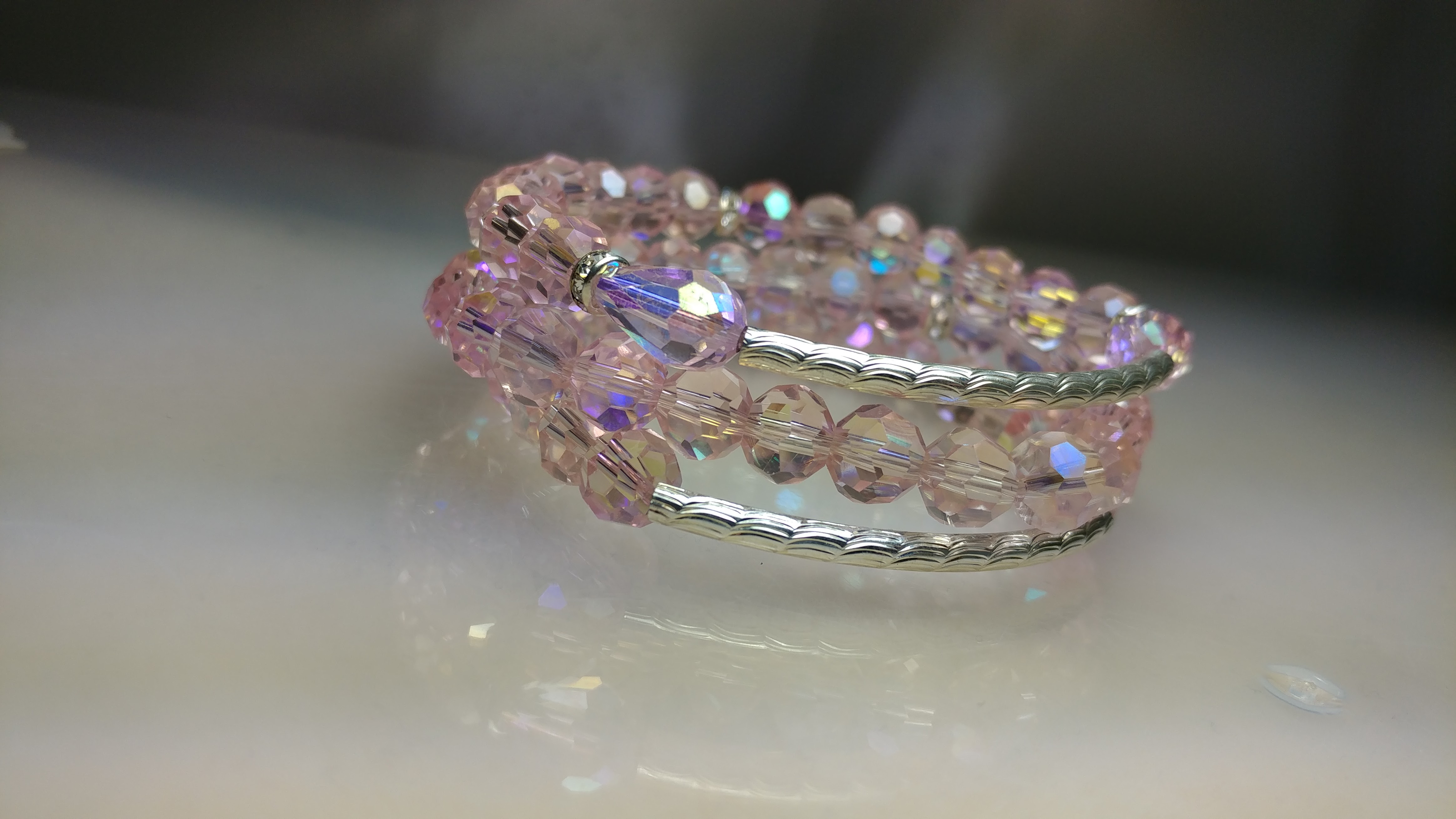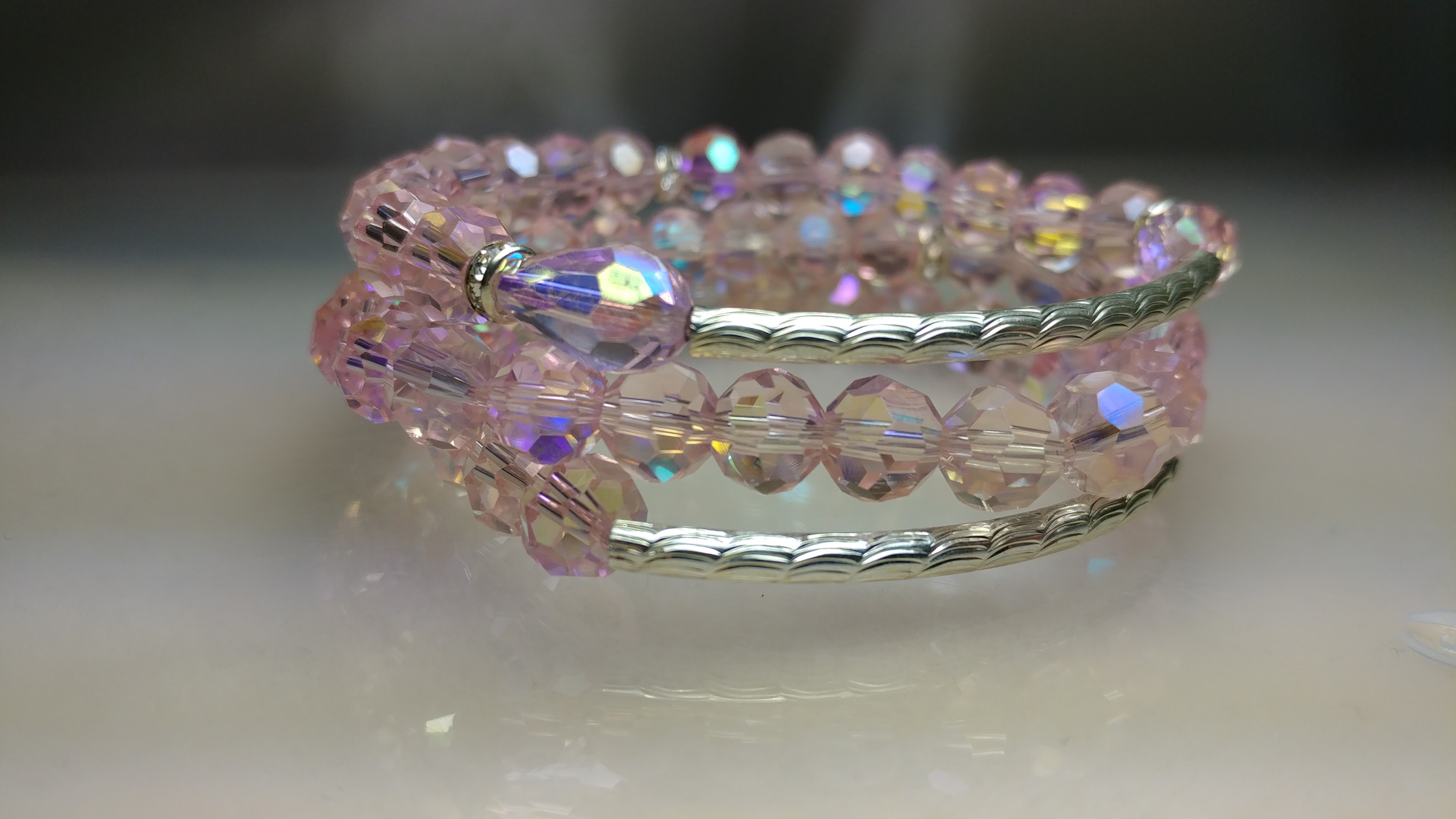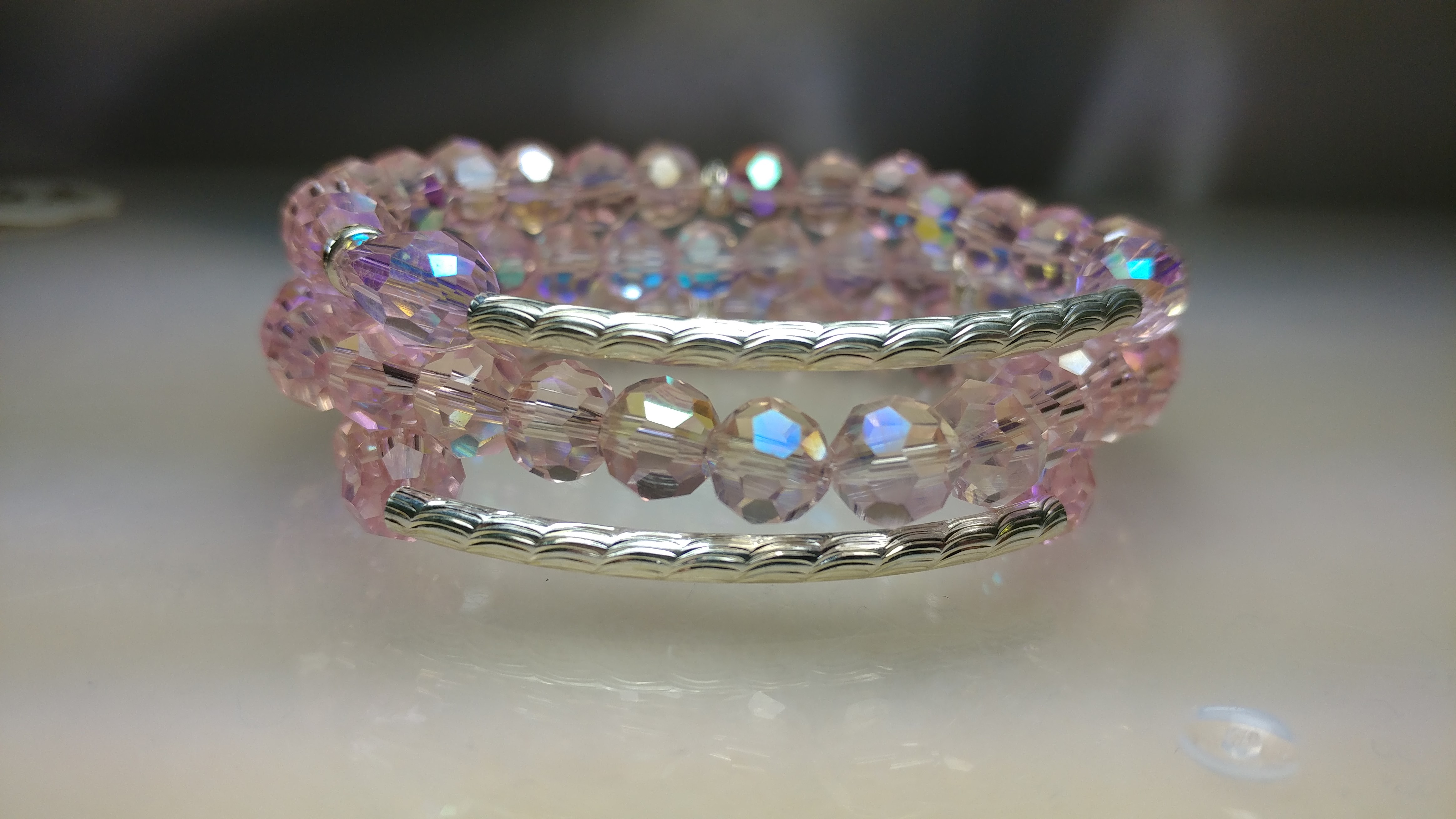 Handmade with a silver-tone connector bar, paired with white rhinestone beads and milky colored pink crystal glass beads, accented with silver clear rhinestone spacer bead on a clear stretchy cord.