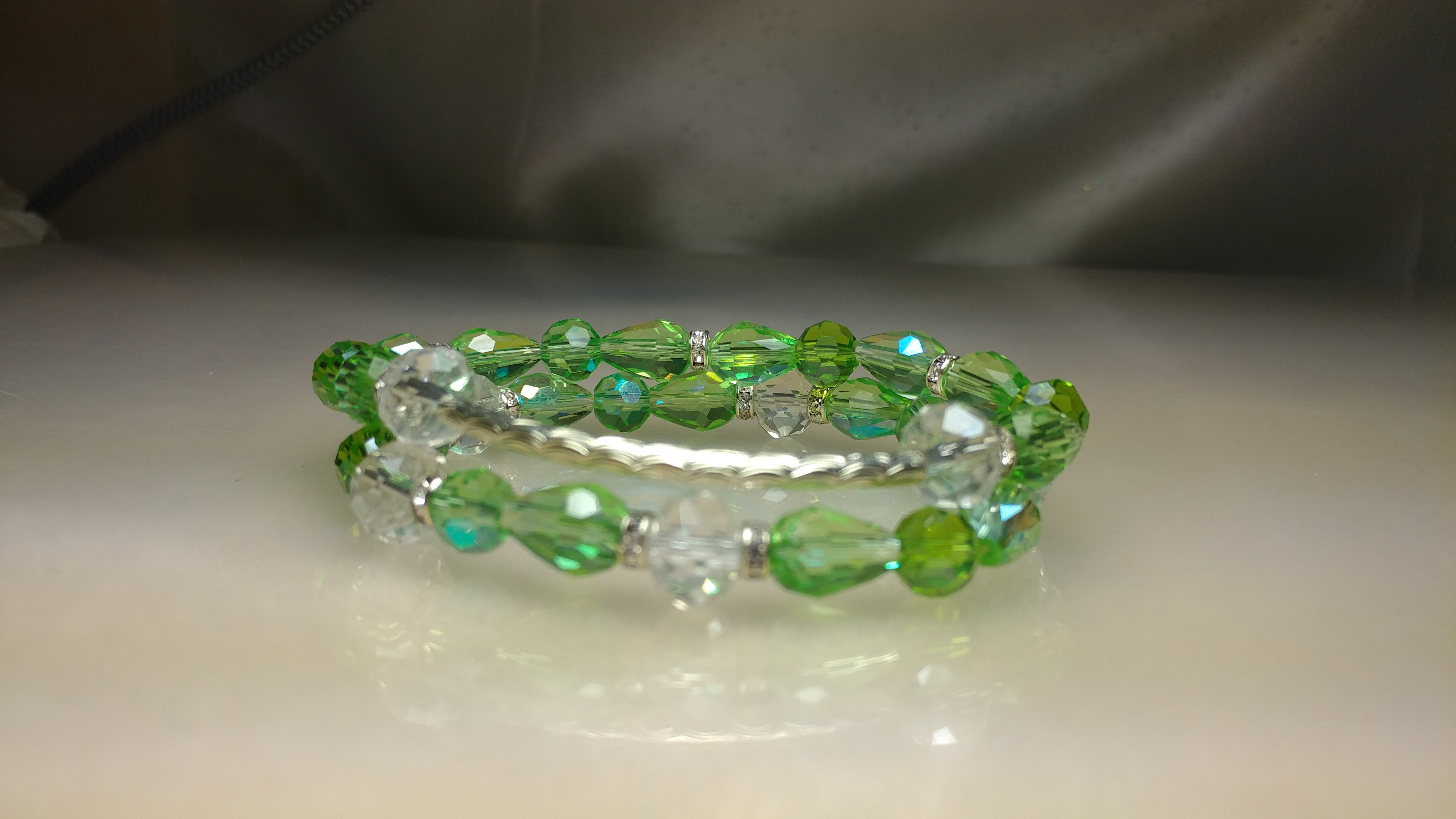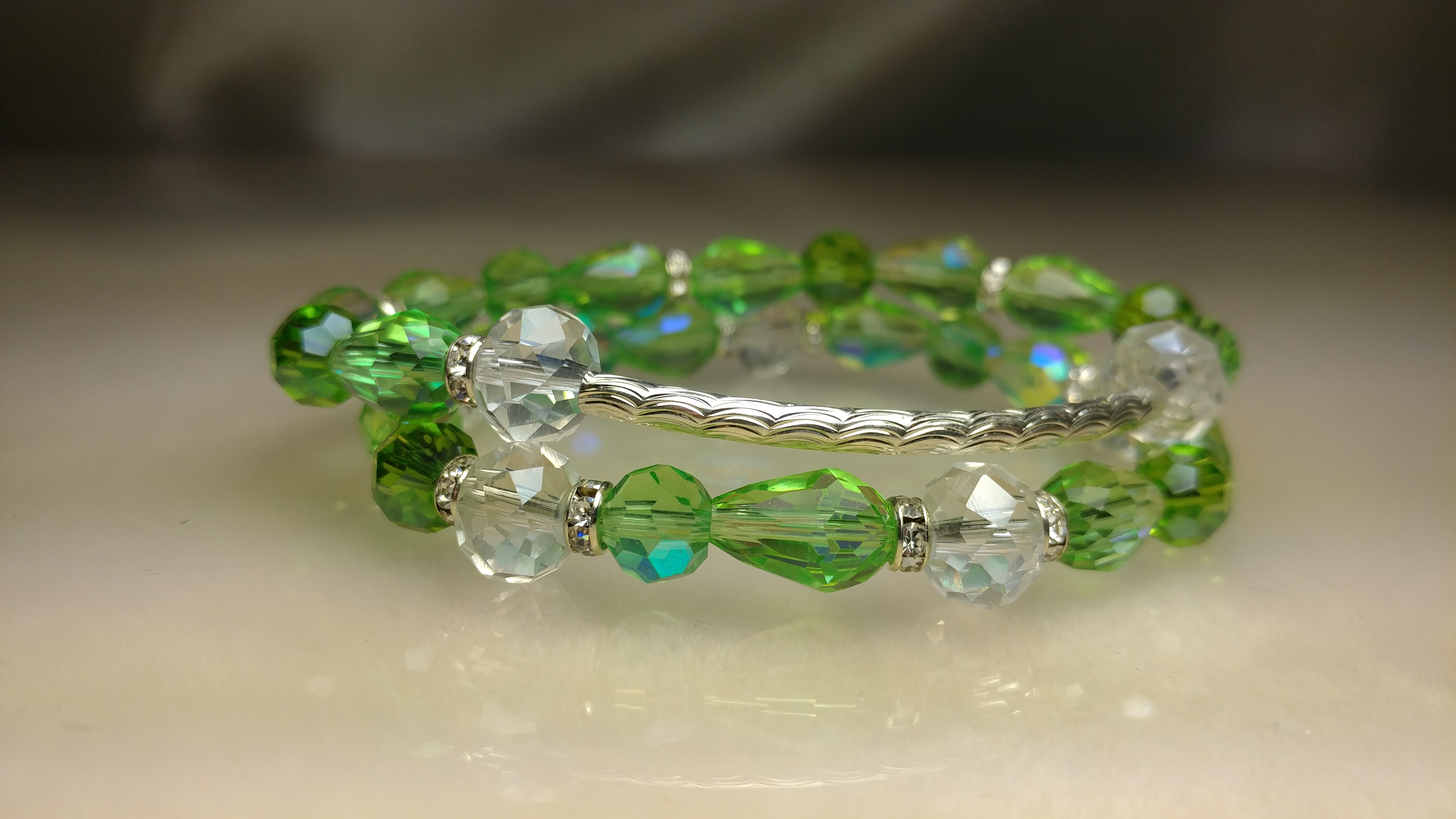 Made with a silver connector bar and green and clear glass beads, with silver clear rhinestone pave beads on a stretchy string.