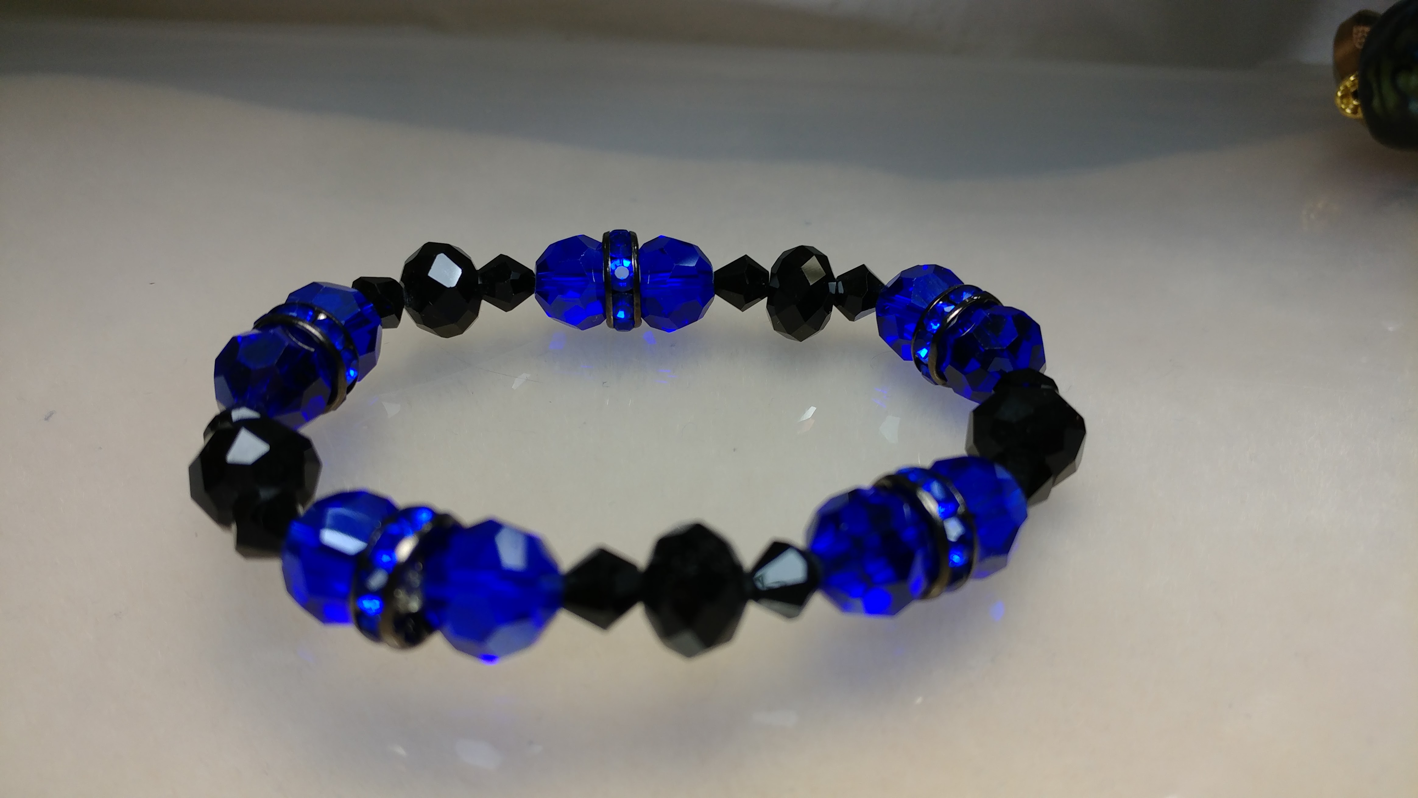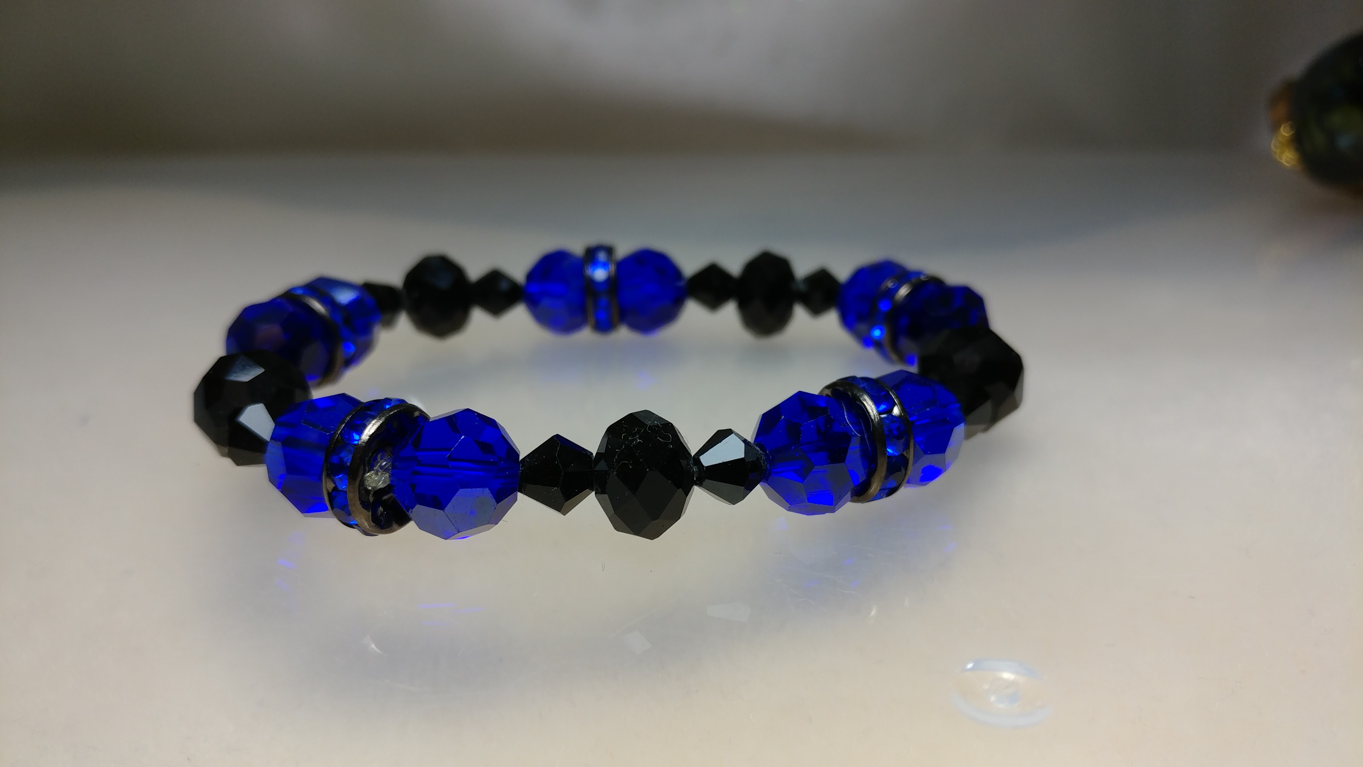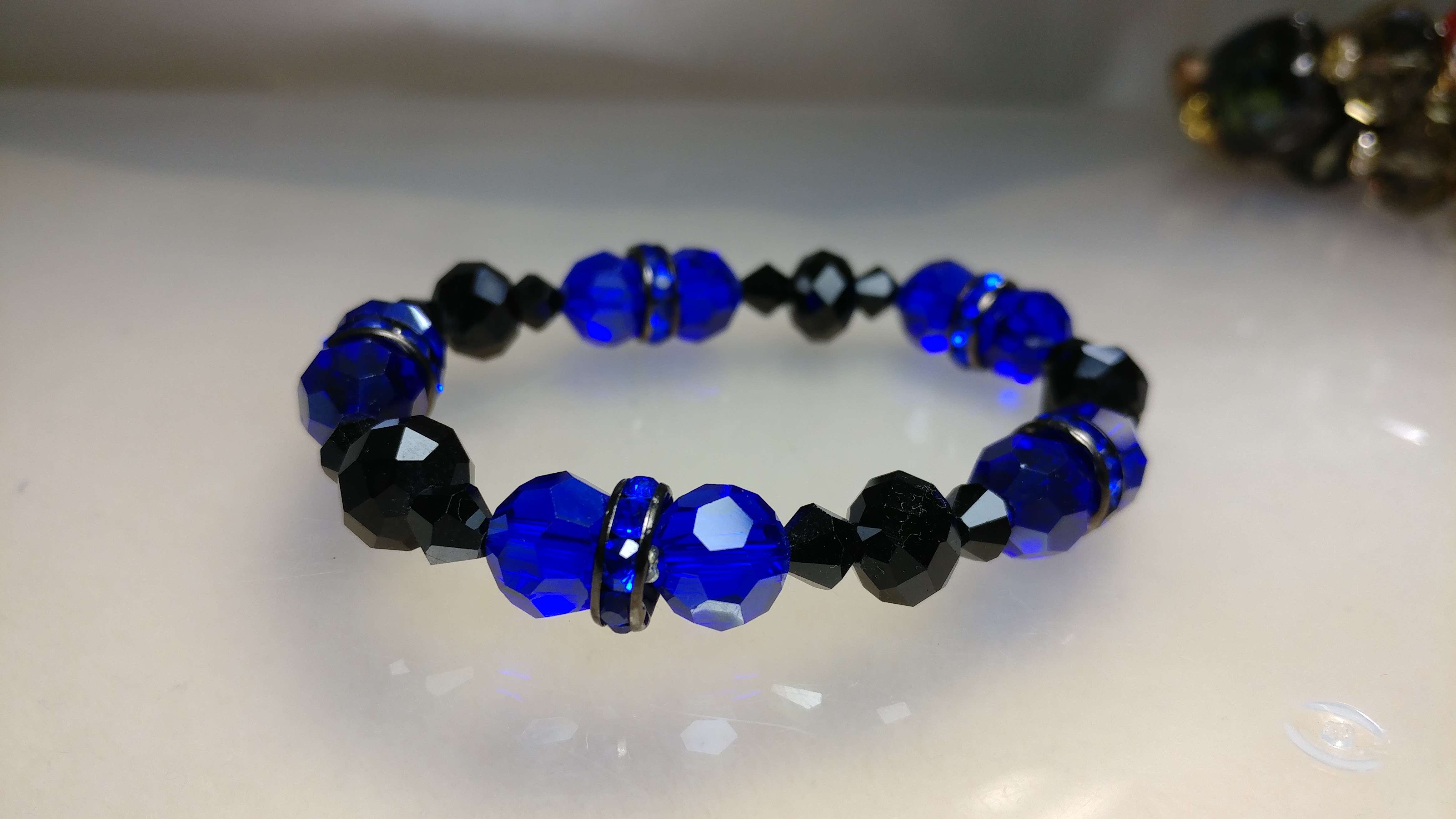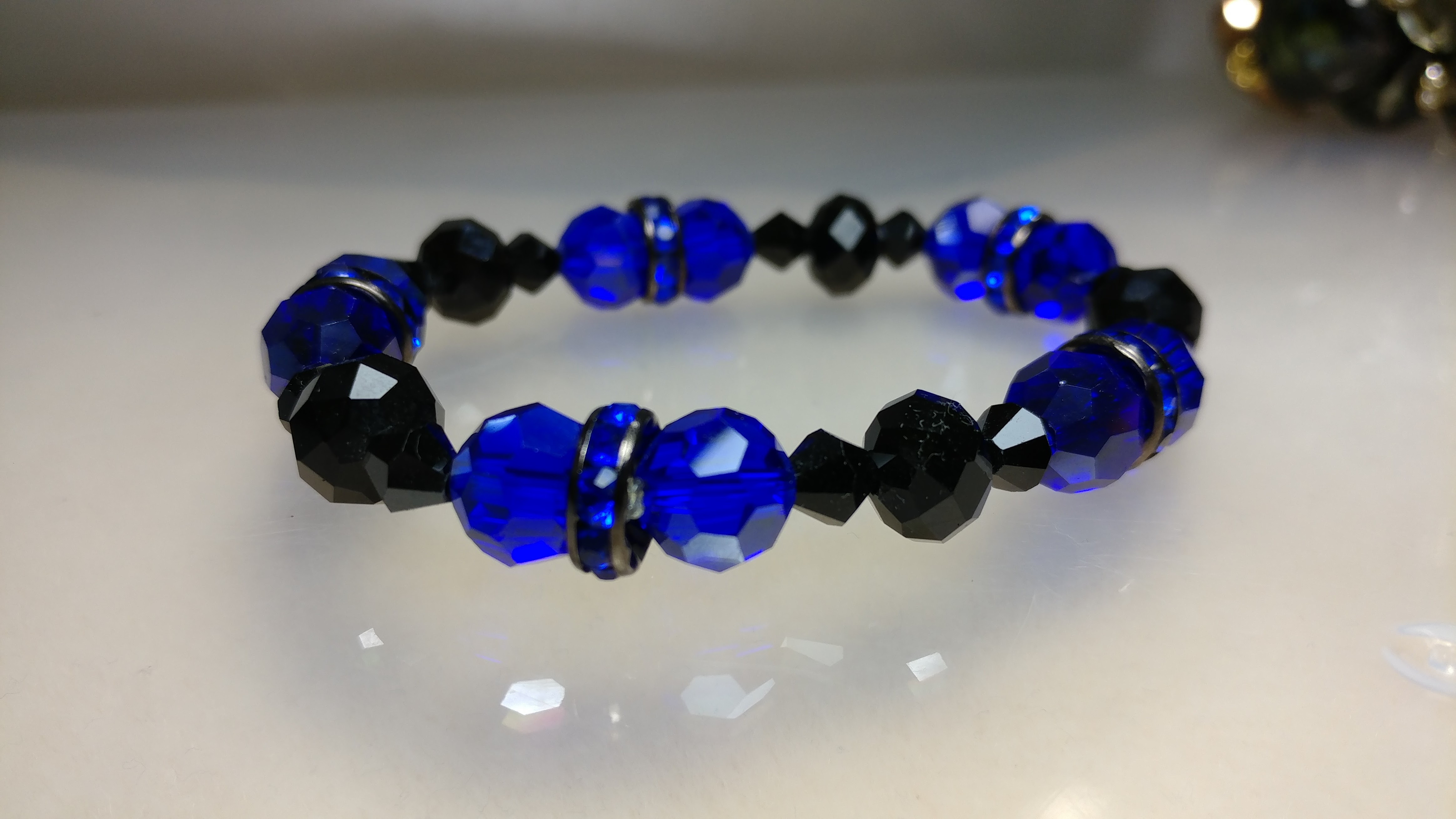 Handmade with black and blue glass crystal beads, accented with bluerhinestone spacers on a clear stretchy cord.