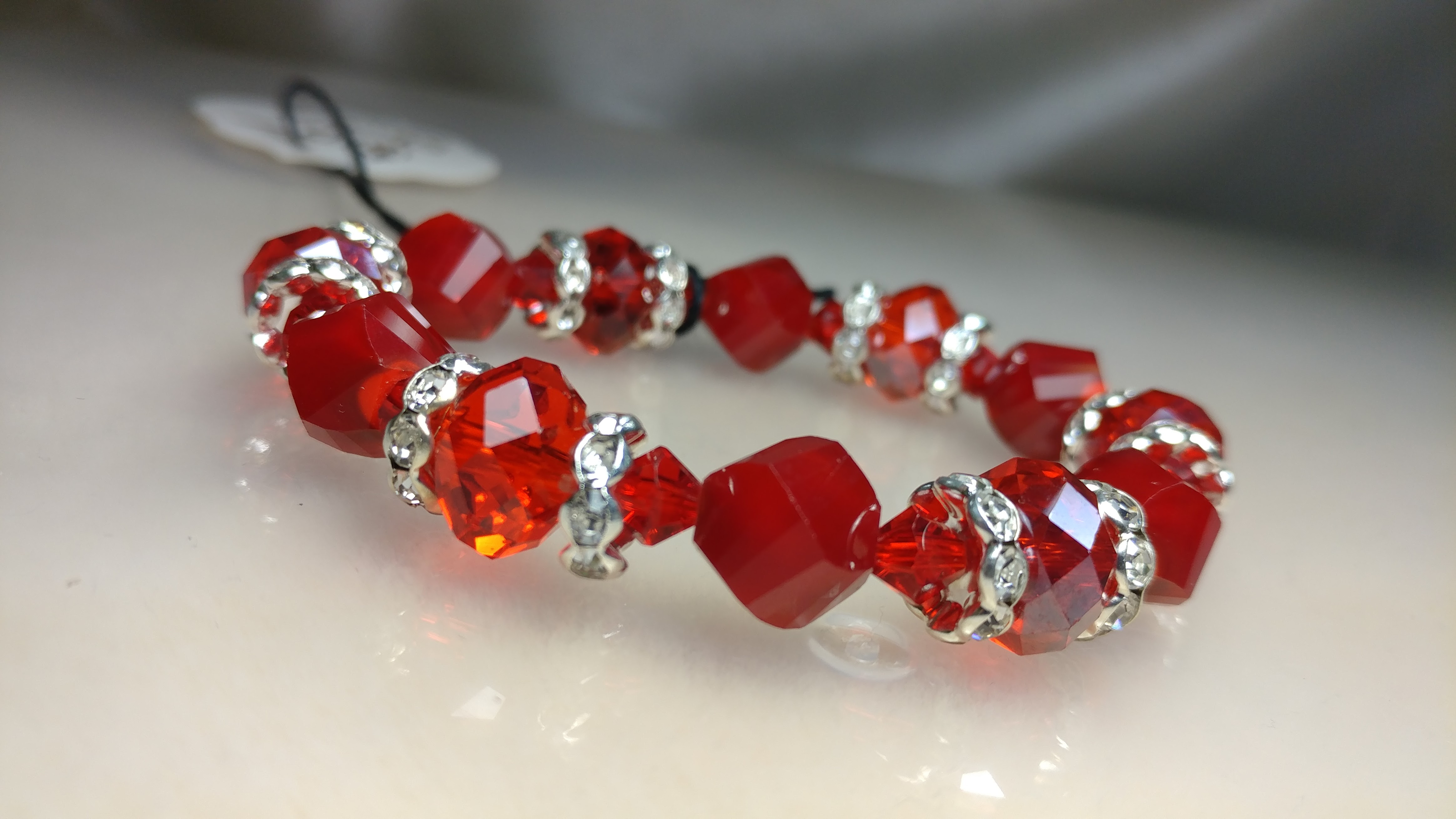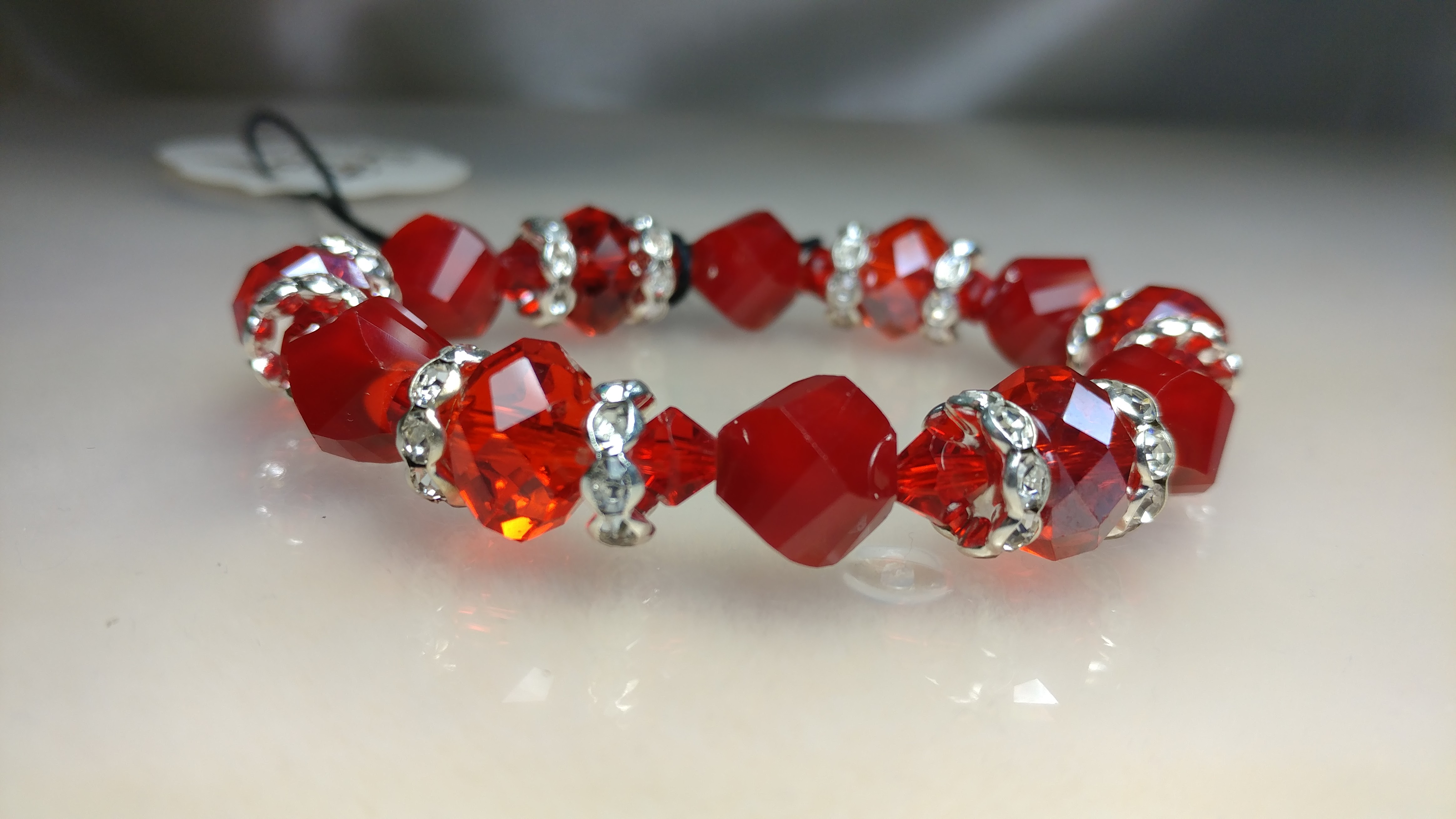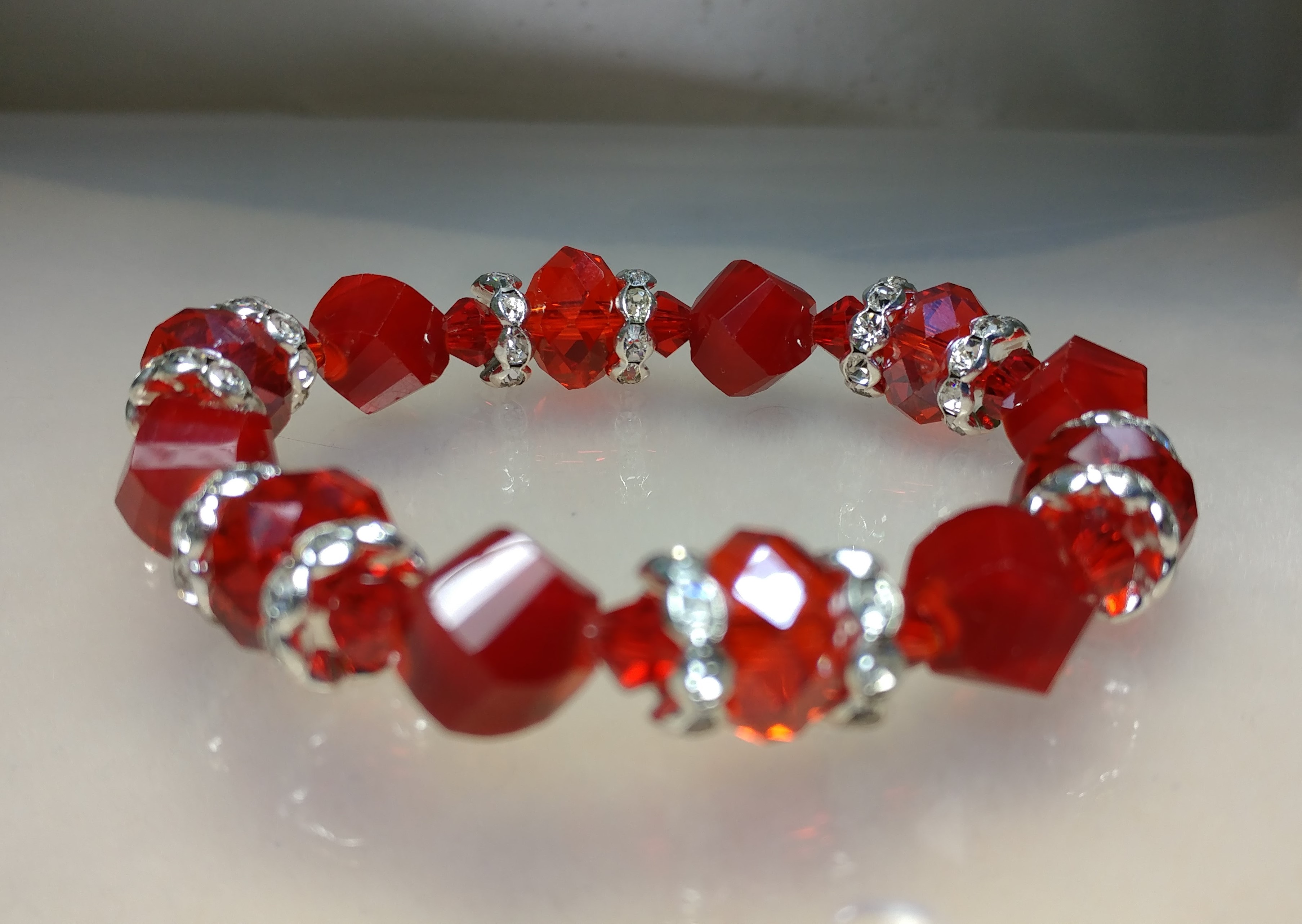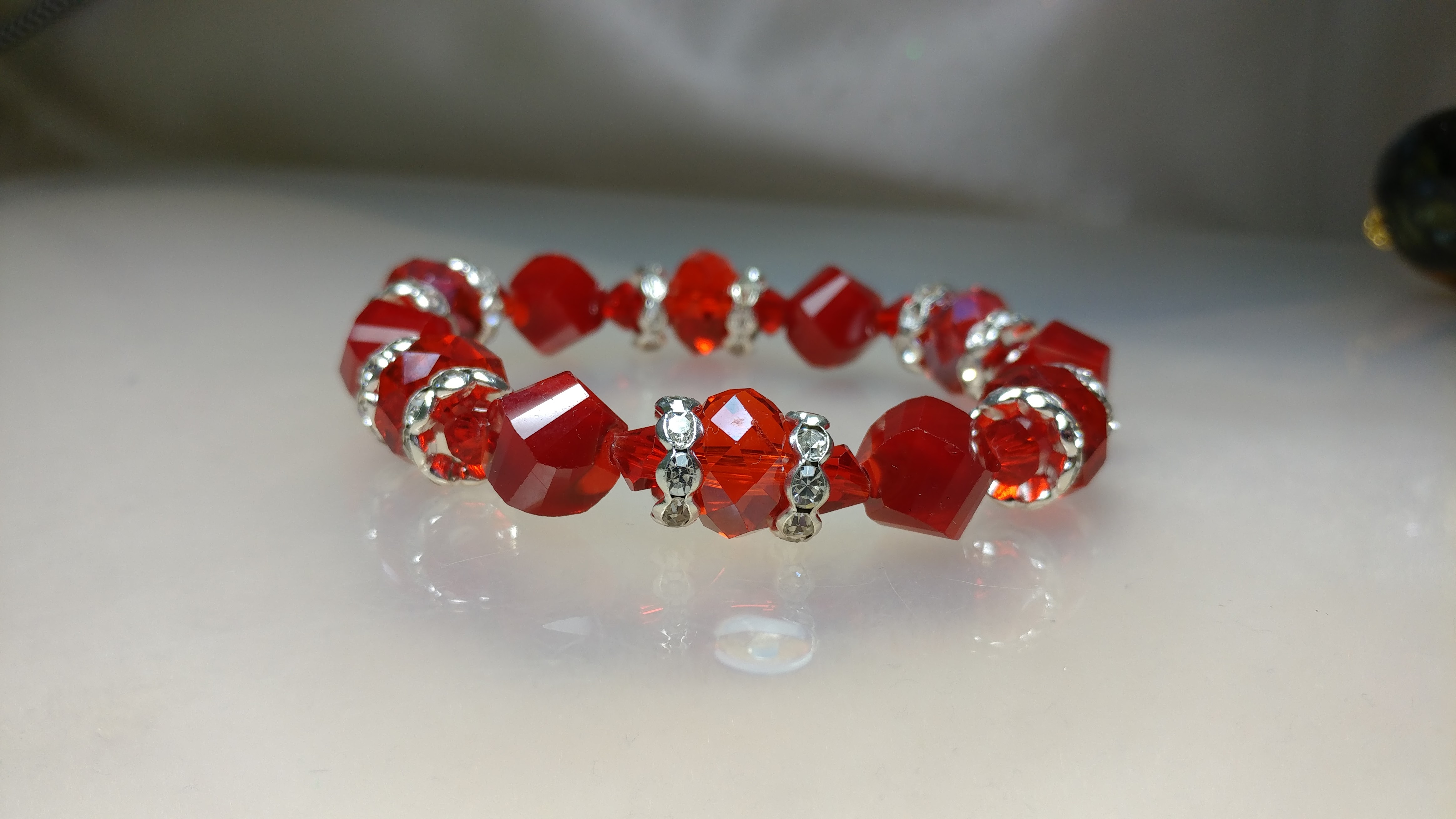 Handmade with red glass crystal beads, accented with silver rhinestones spacers on a clear stretchy cord.