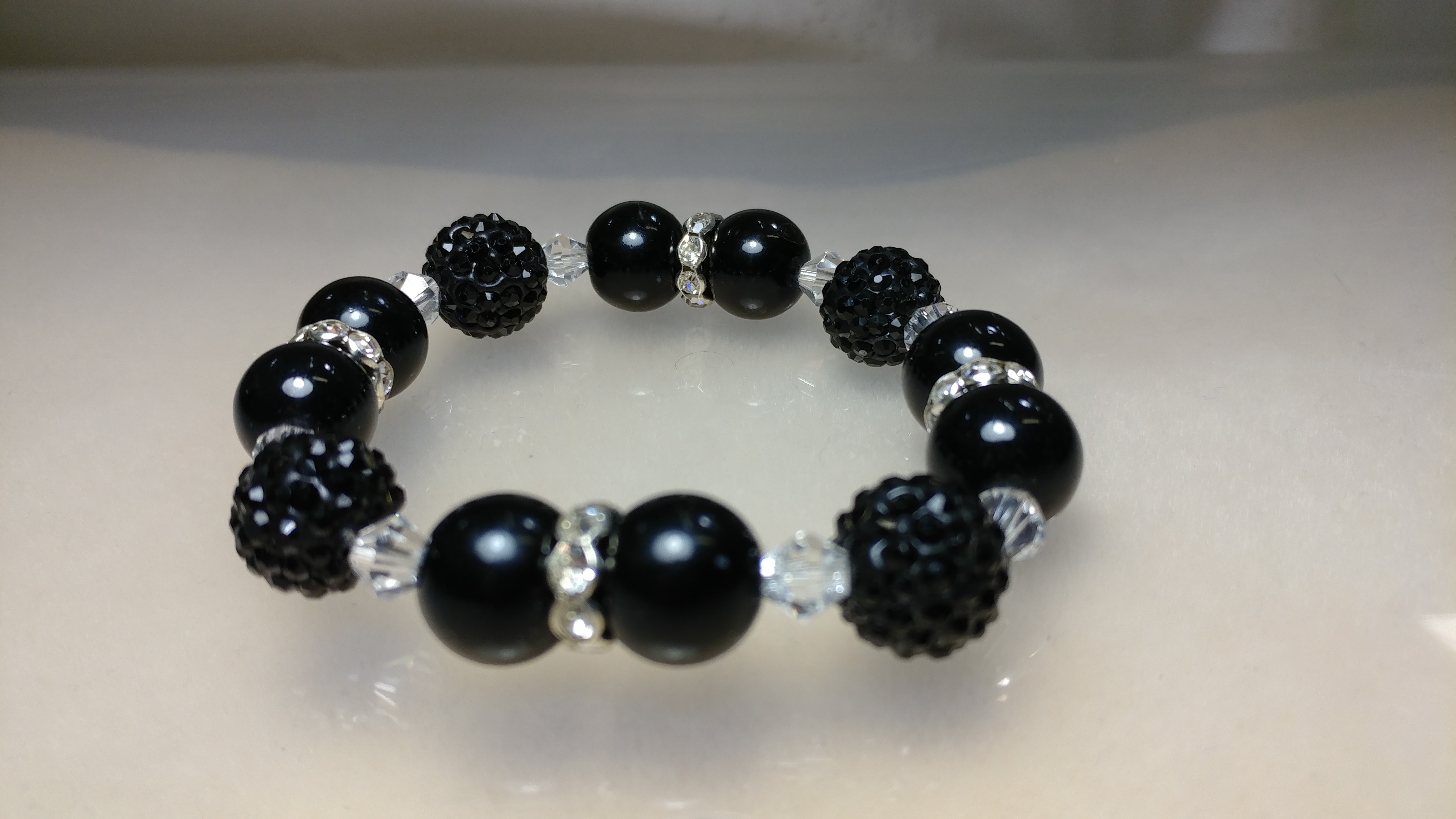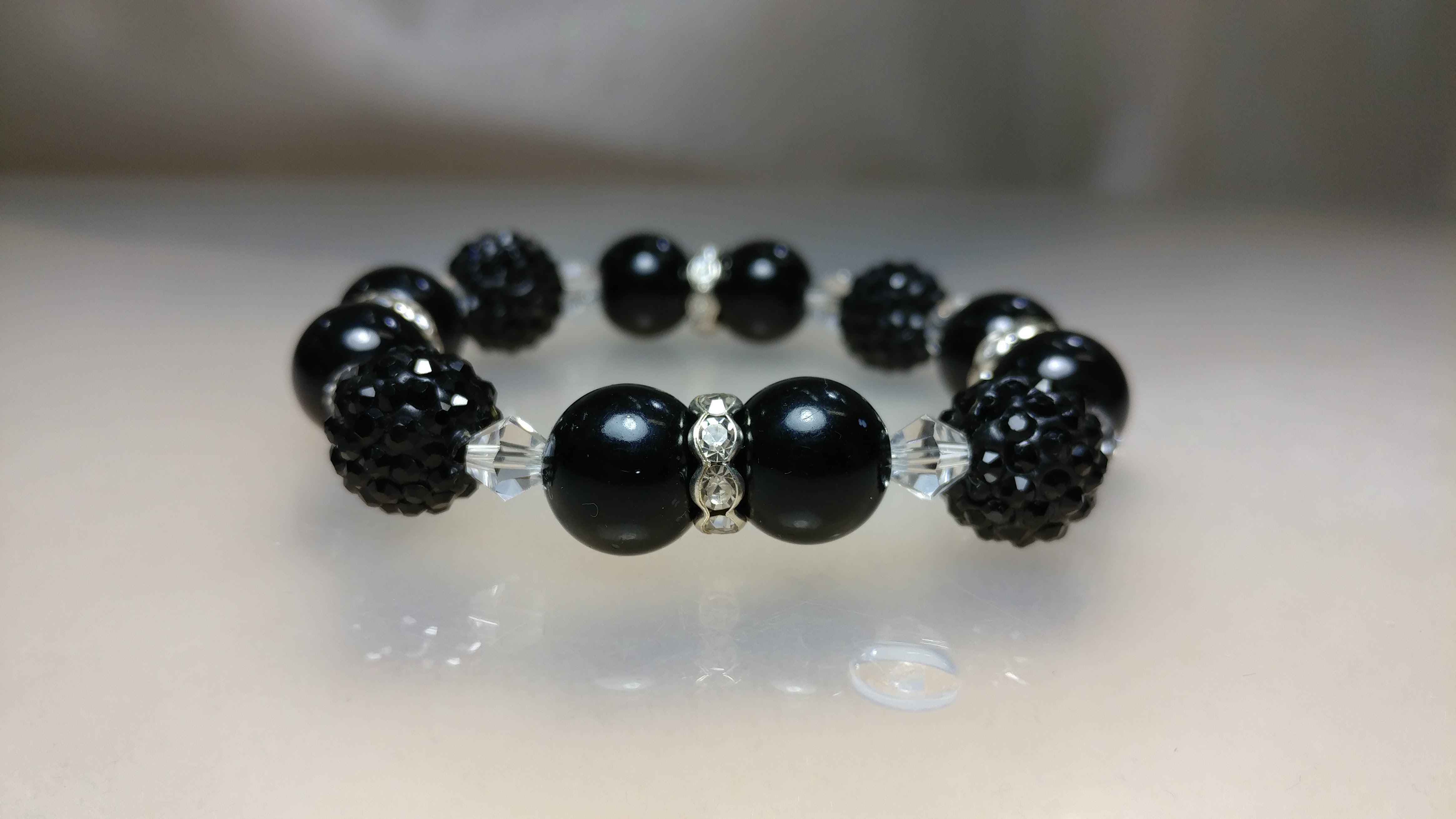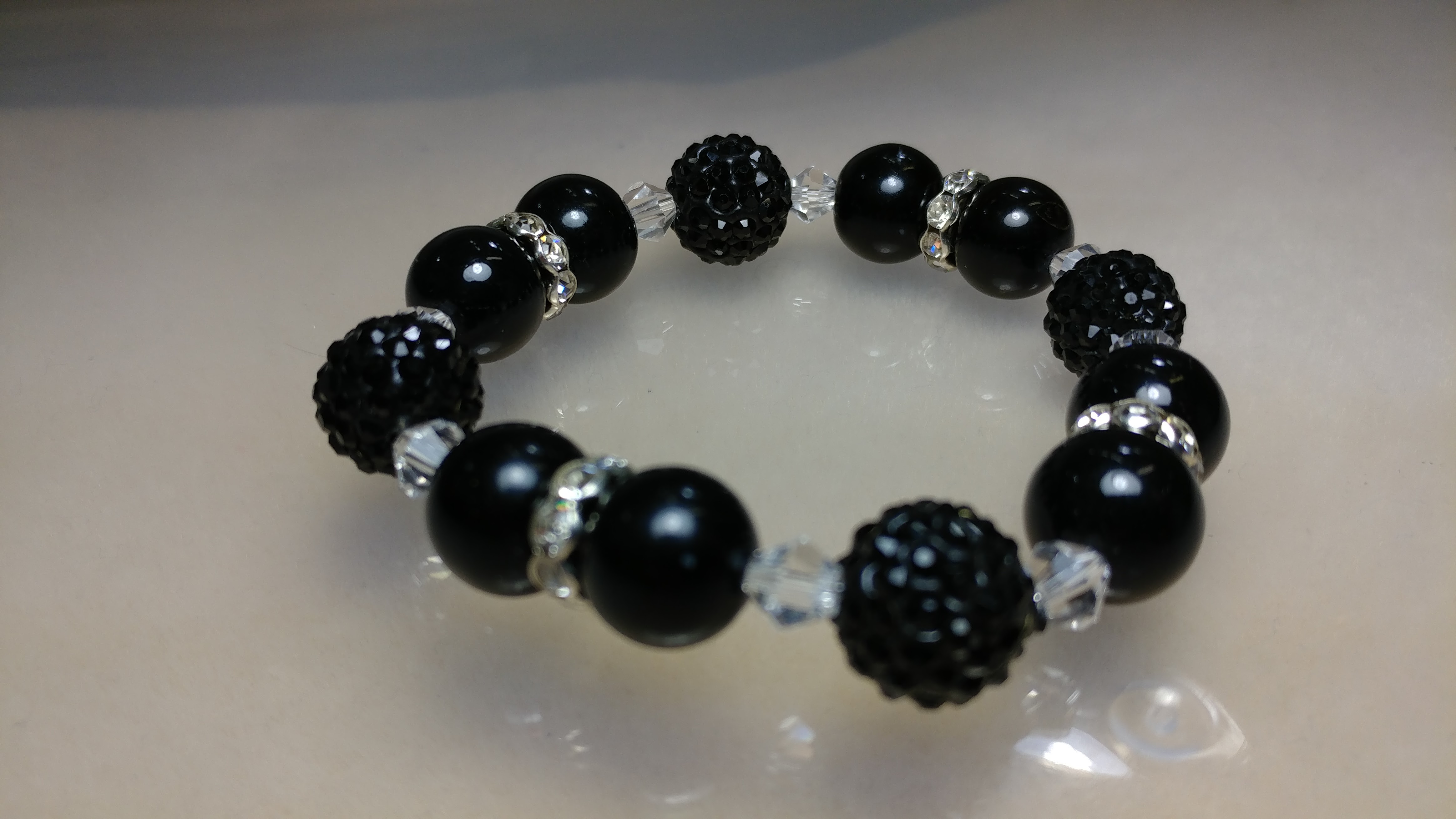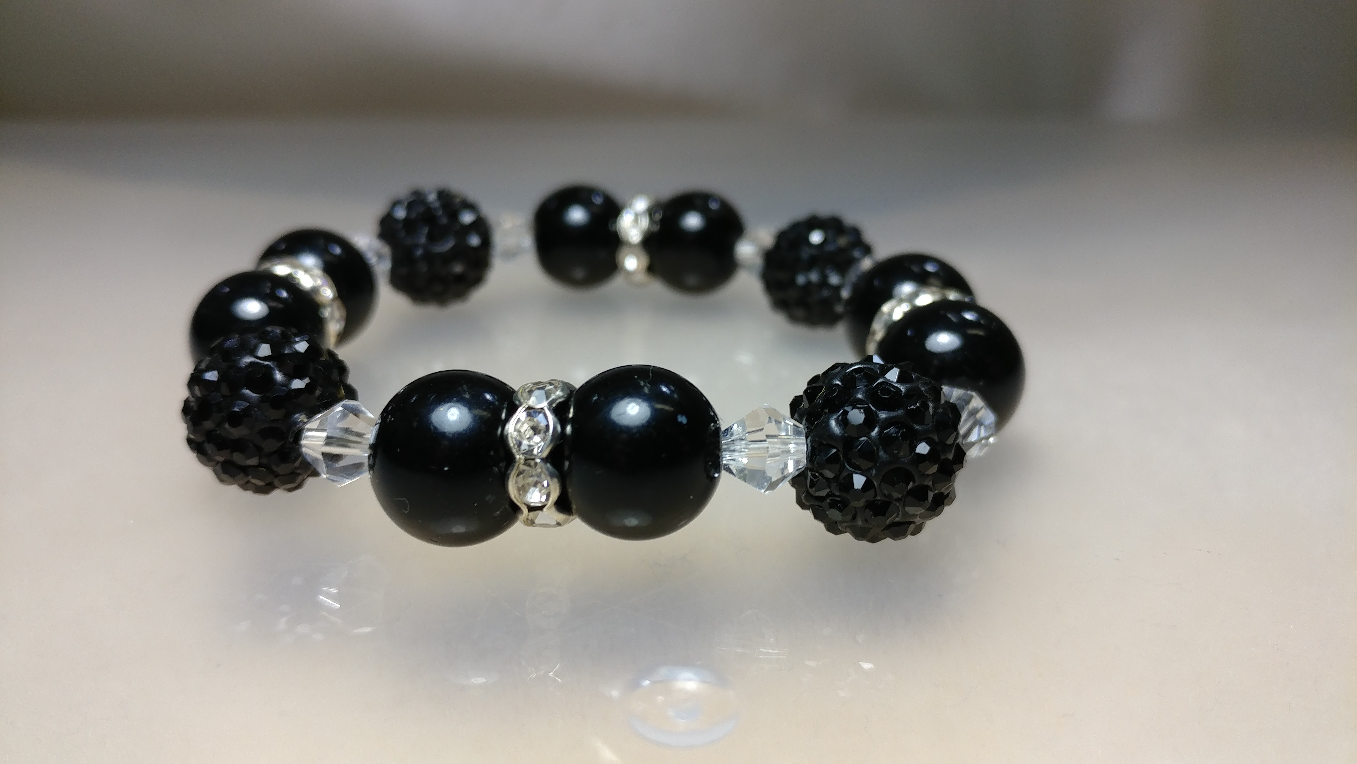 Handmade with black painted glass pearl bead and clear crystal glass beads, spaced with silver rhinestone spacers on a clear stretchy cord.