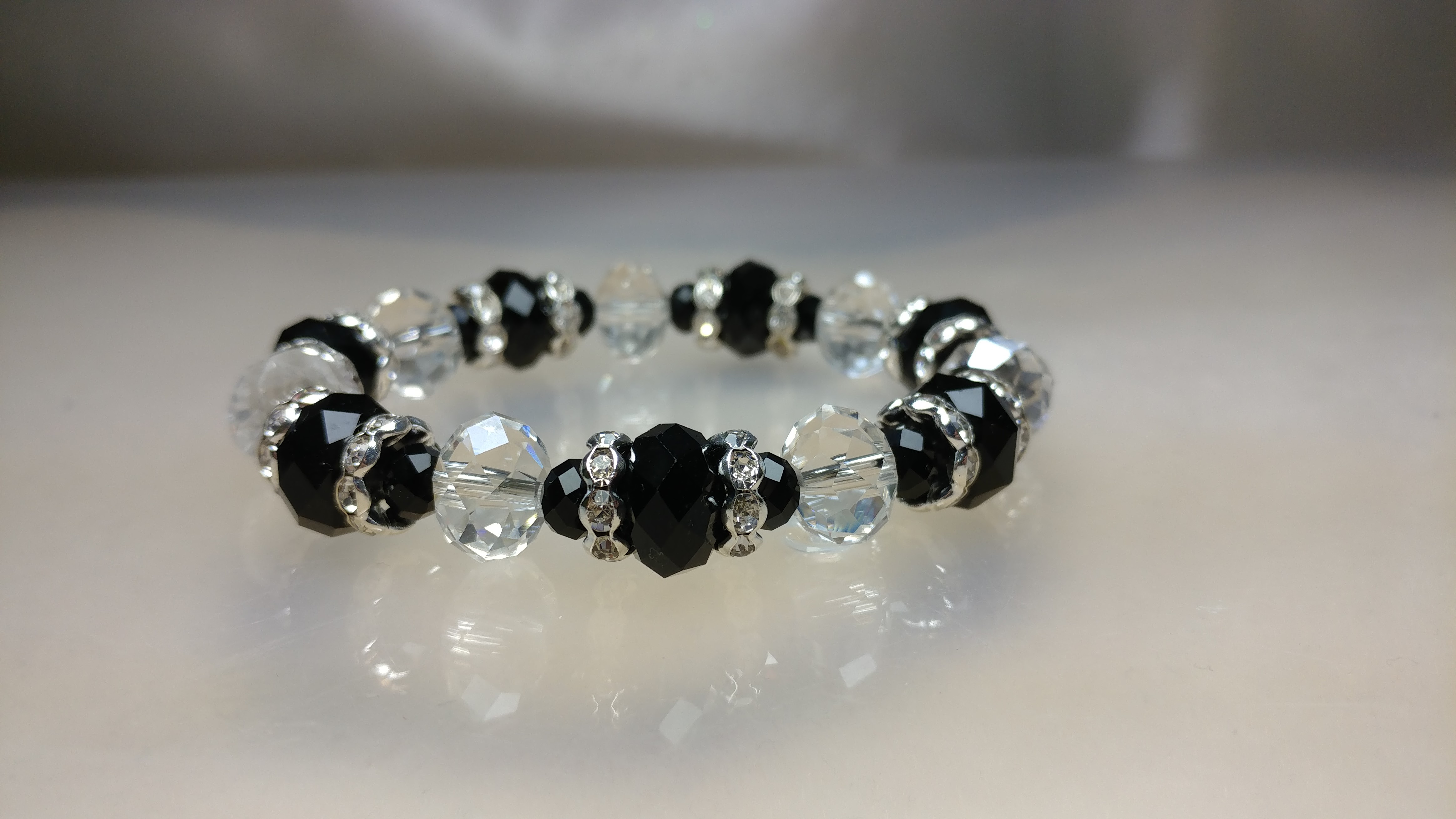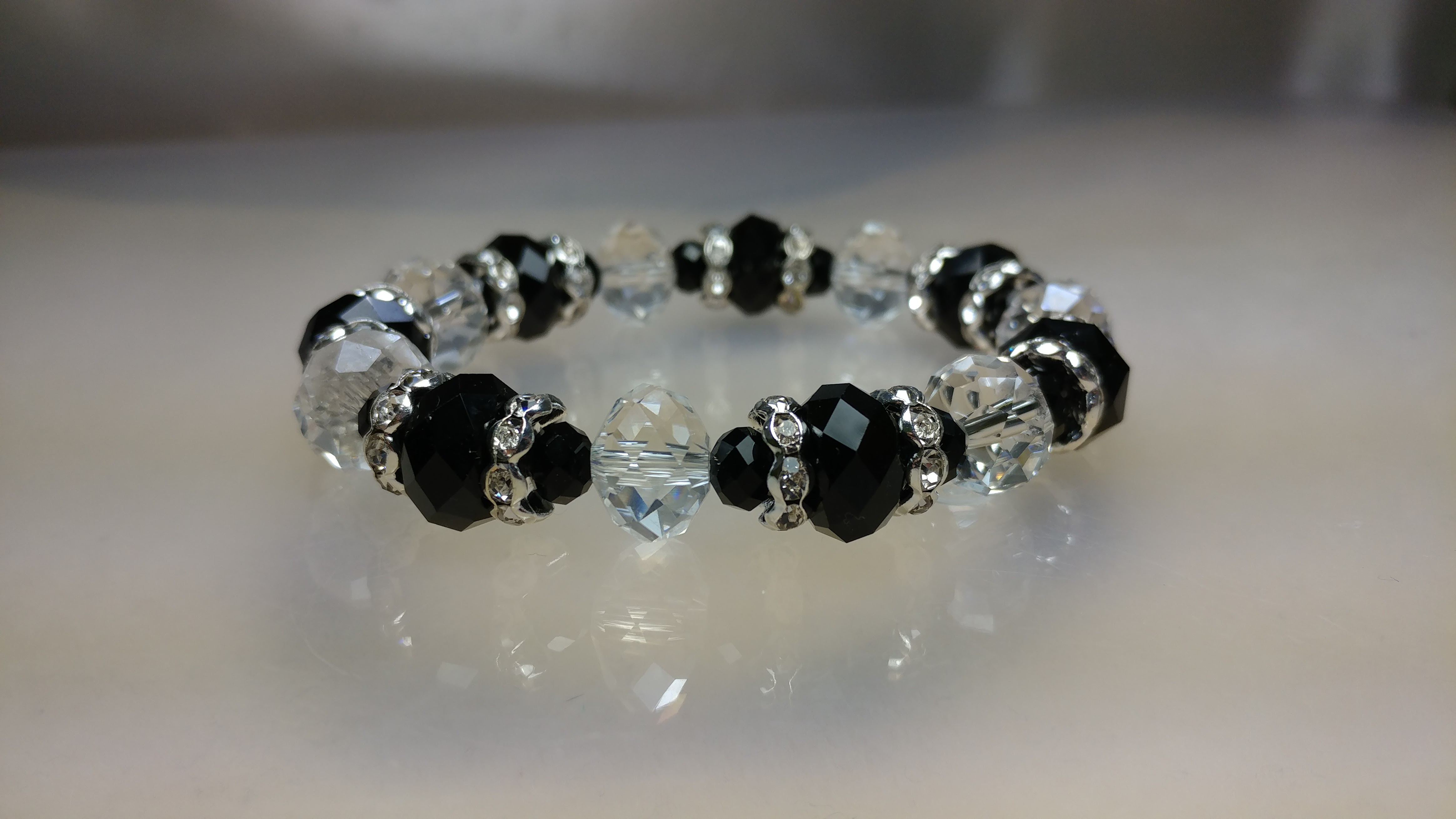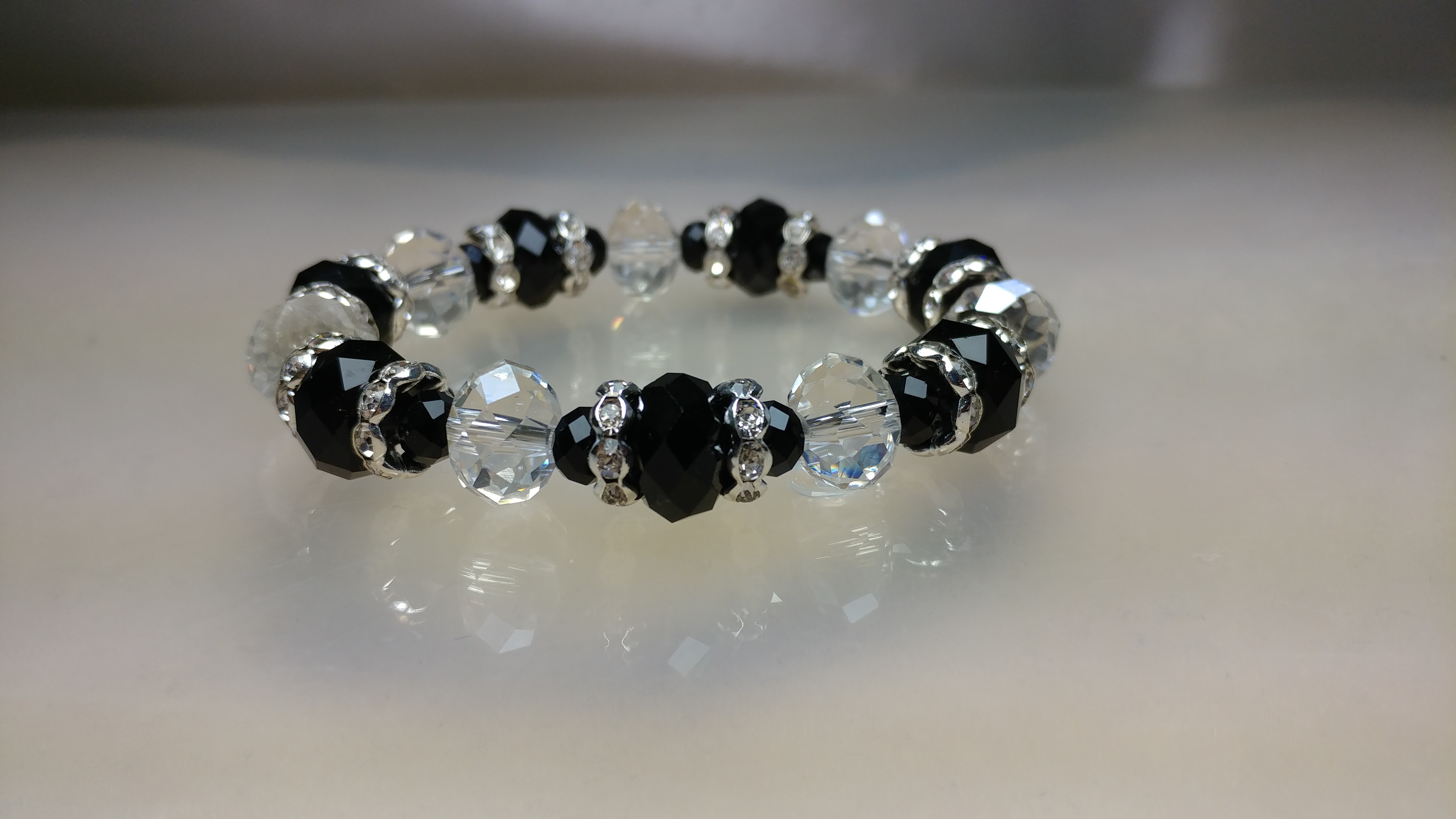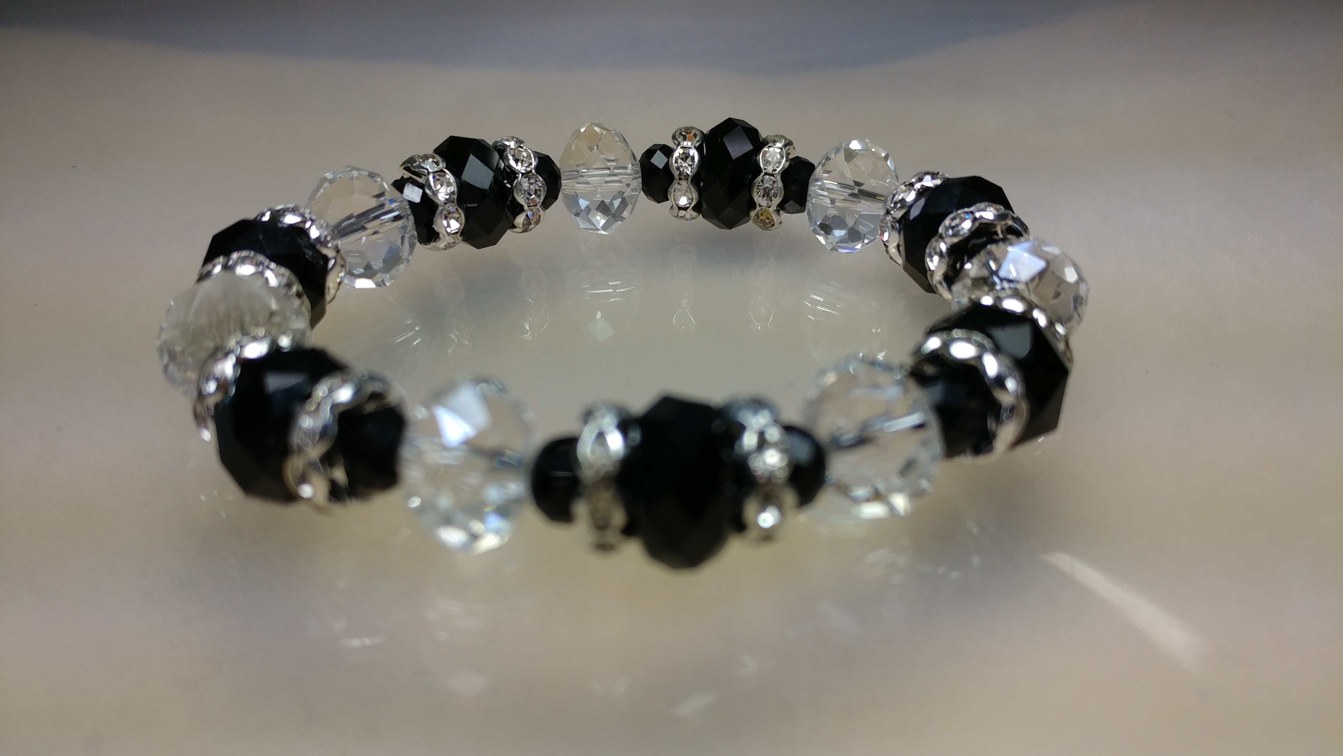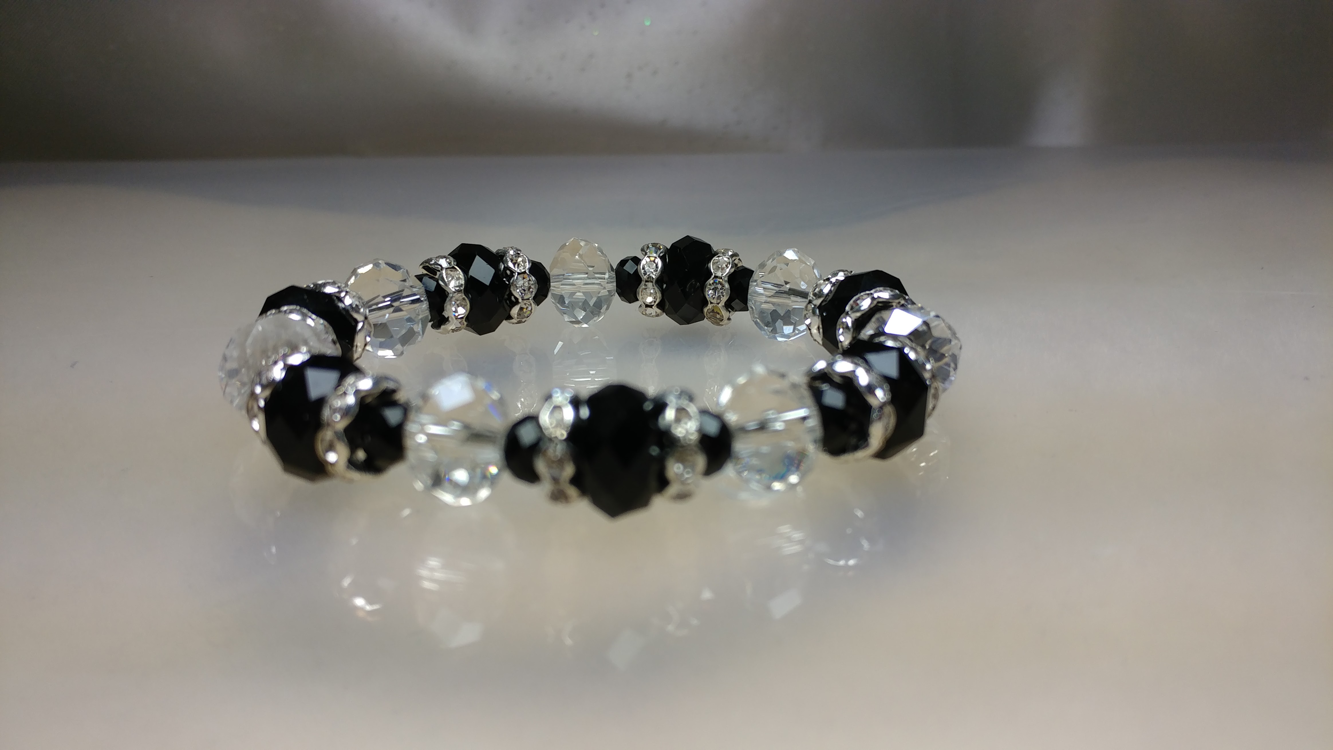 Handmade with black and clear crystal glass beads, spaced with silver rhinestone spacers on a clear stretchy cord.