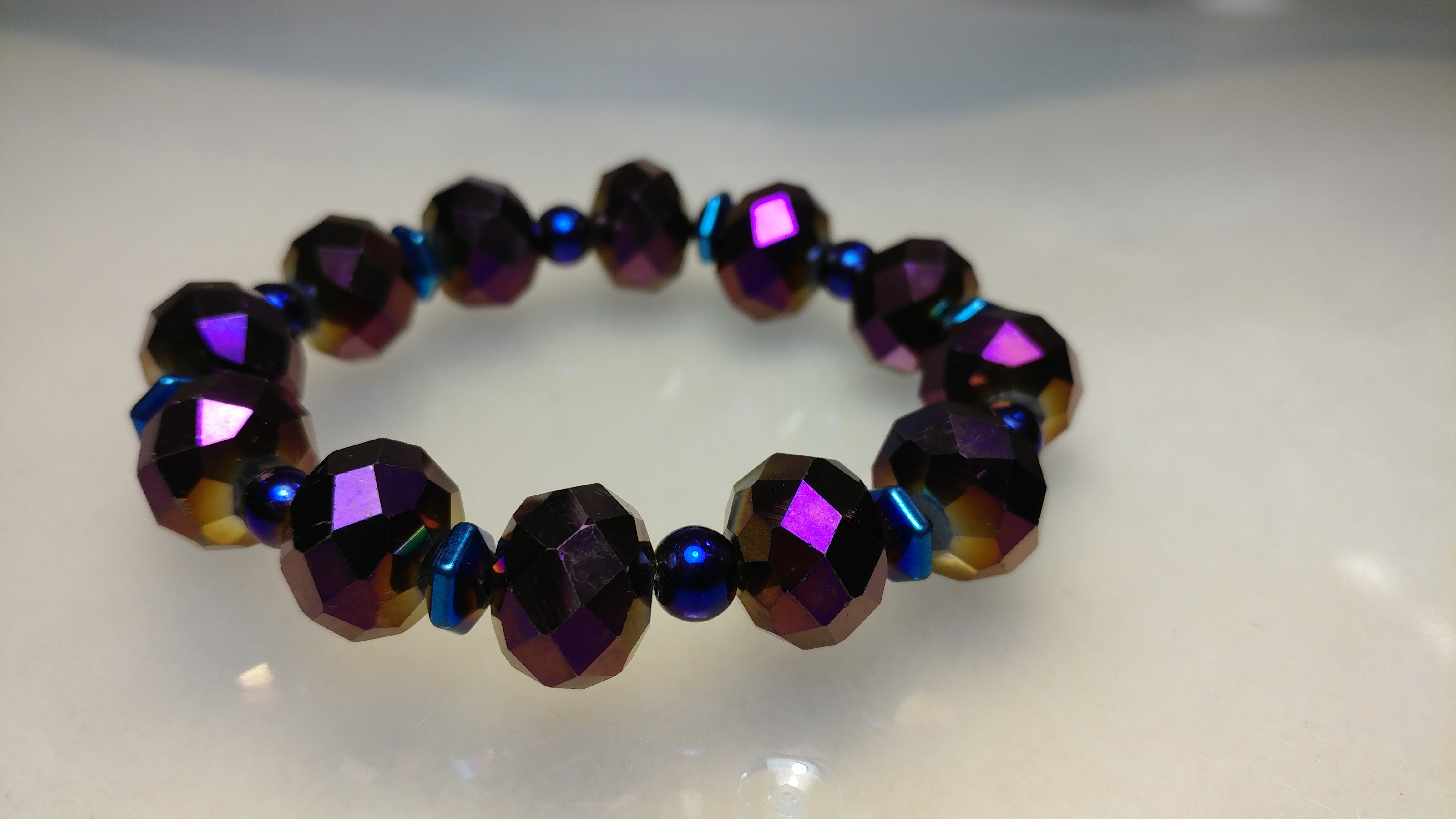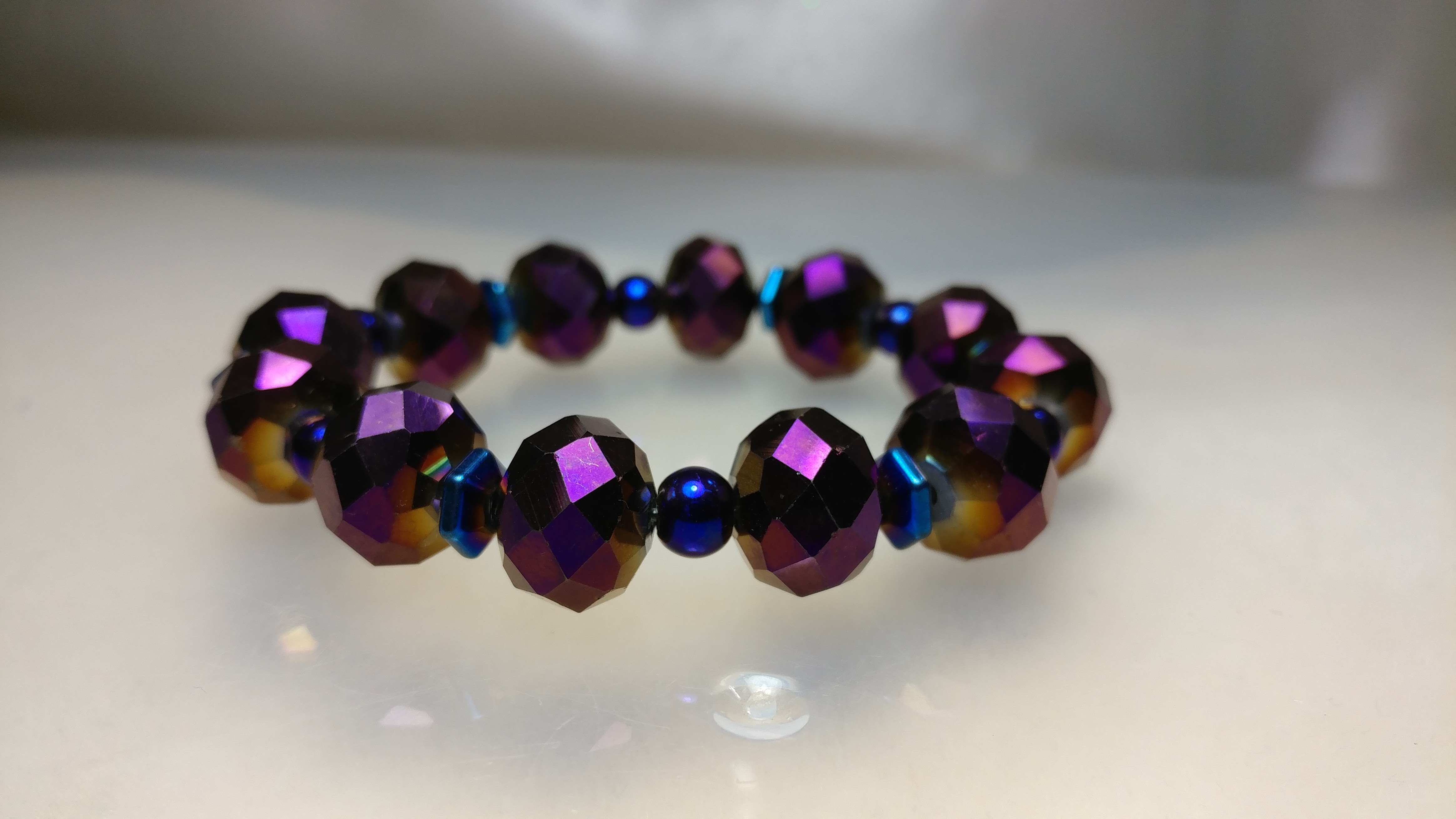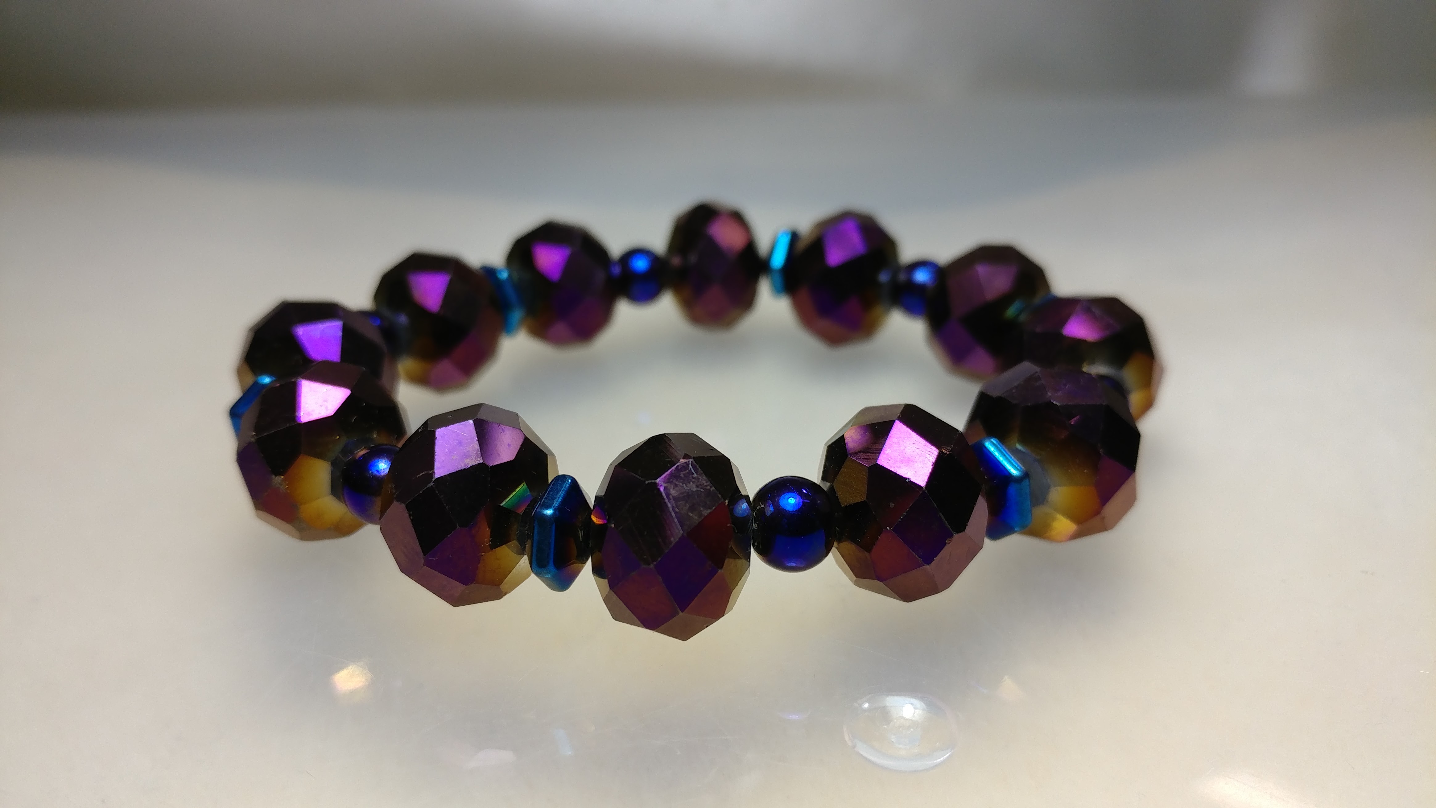 Handmade with purple glass beads on a clear stretchy cord.