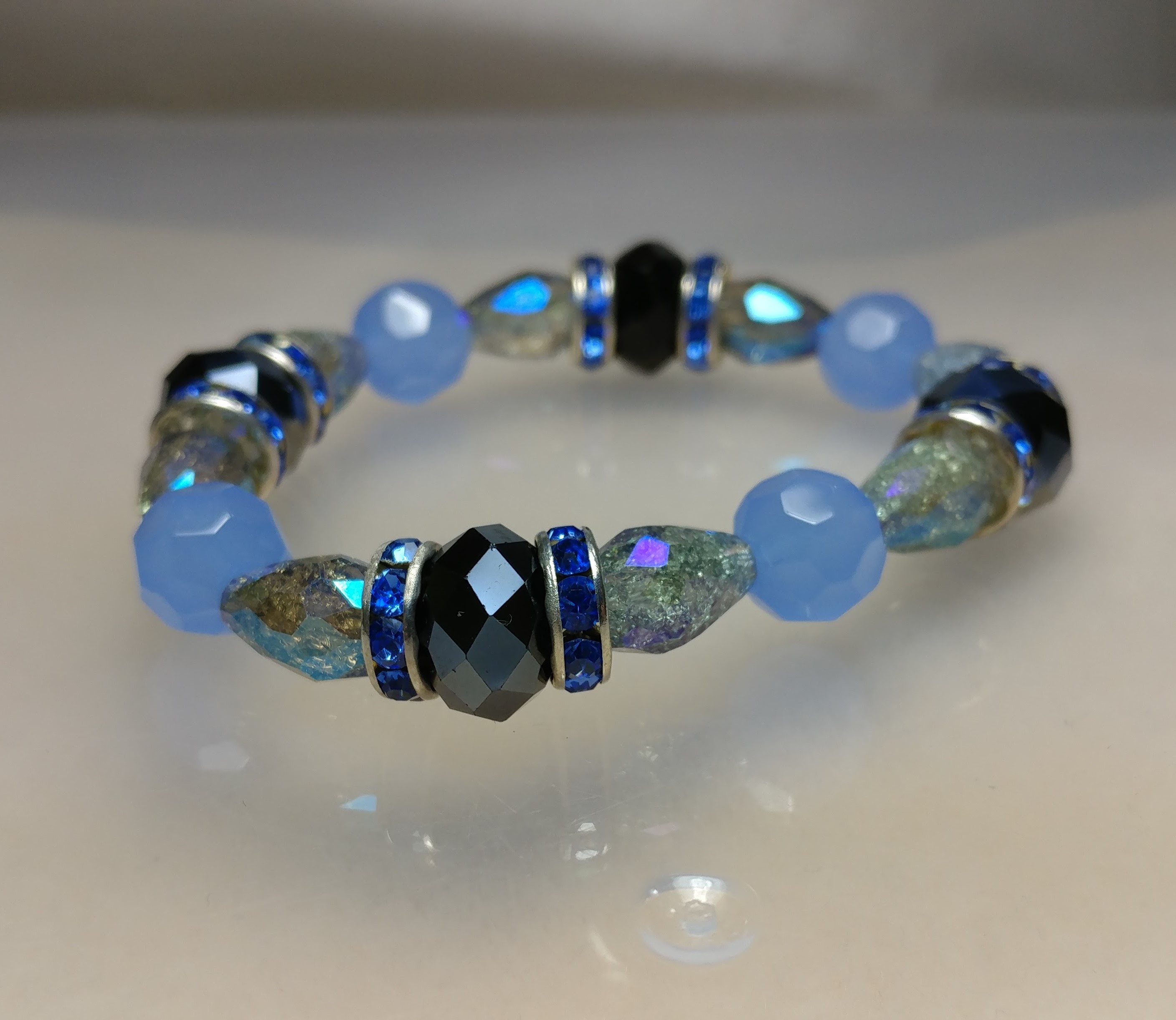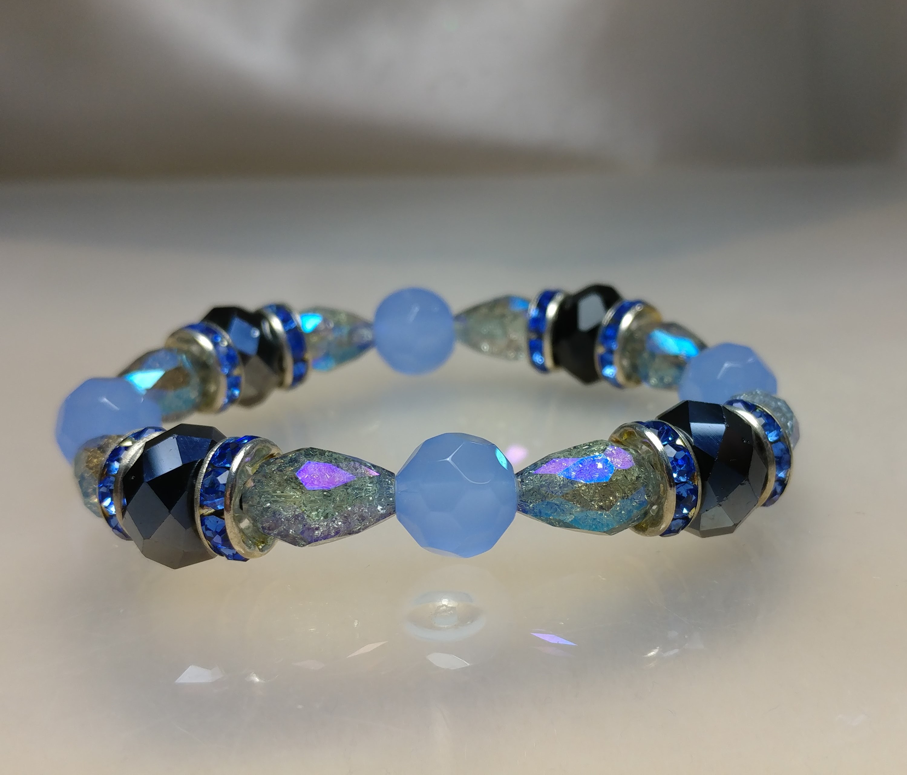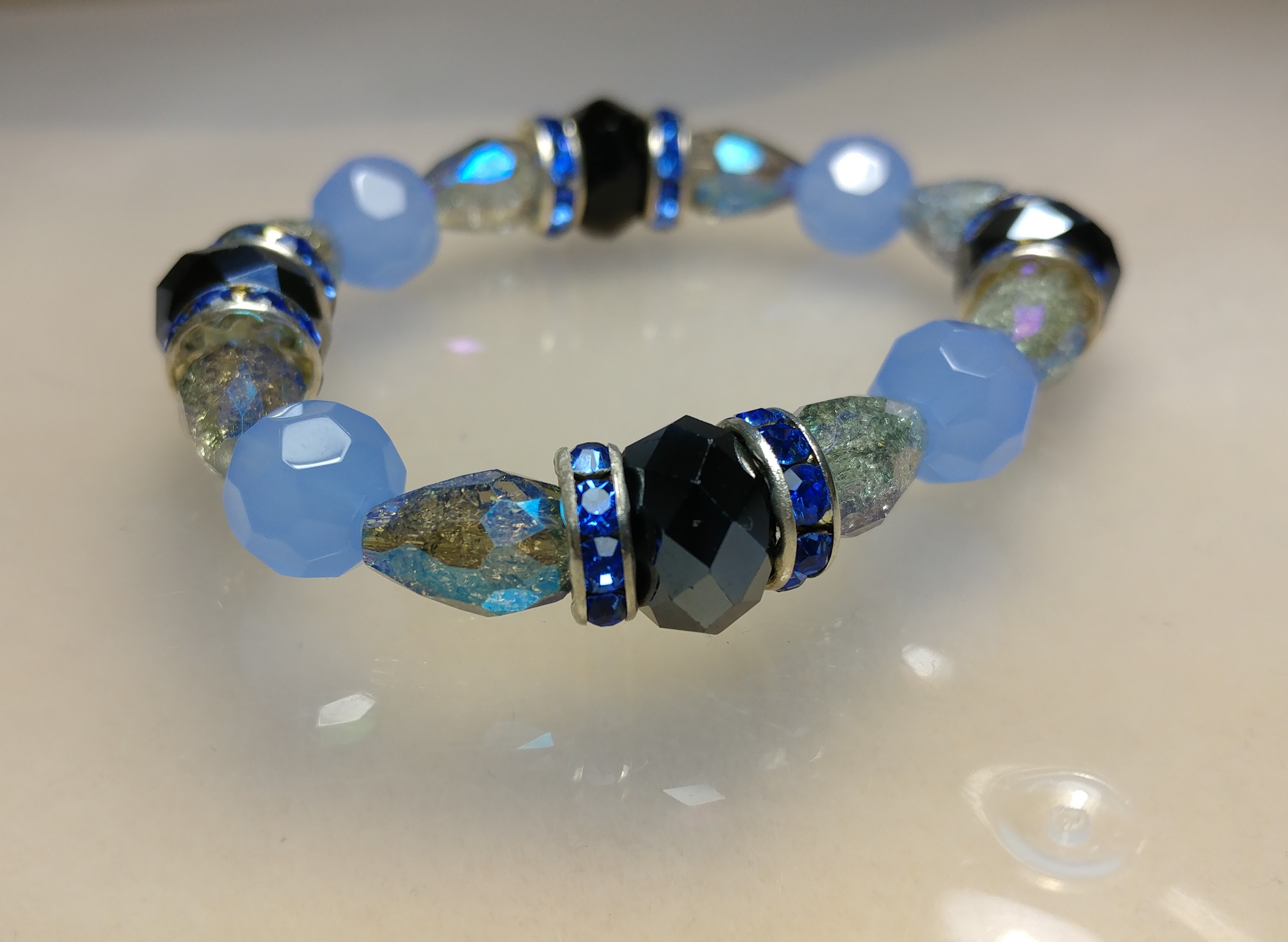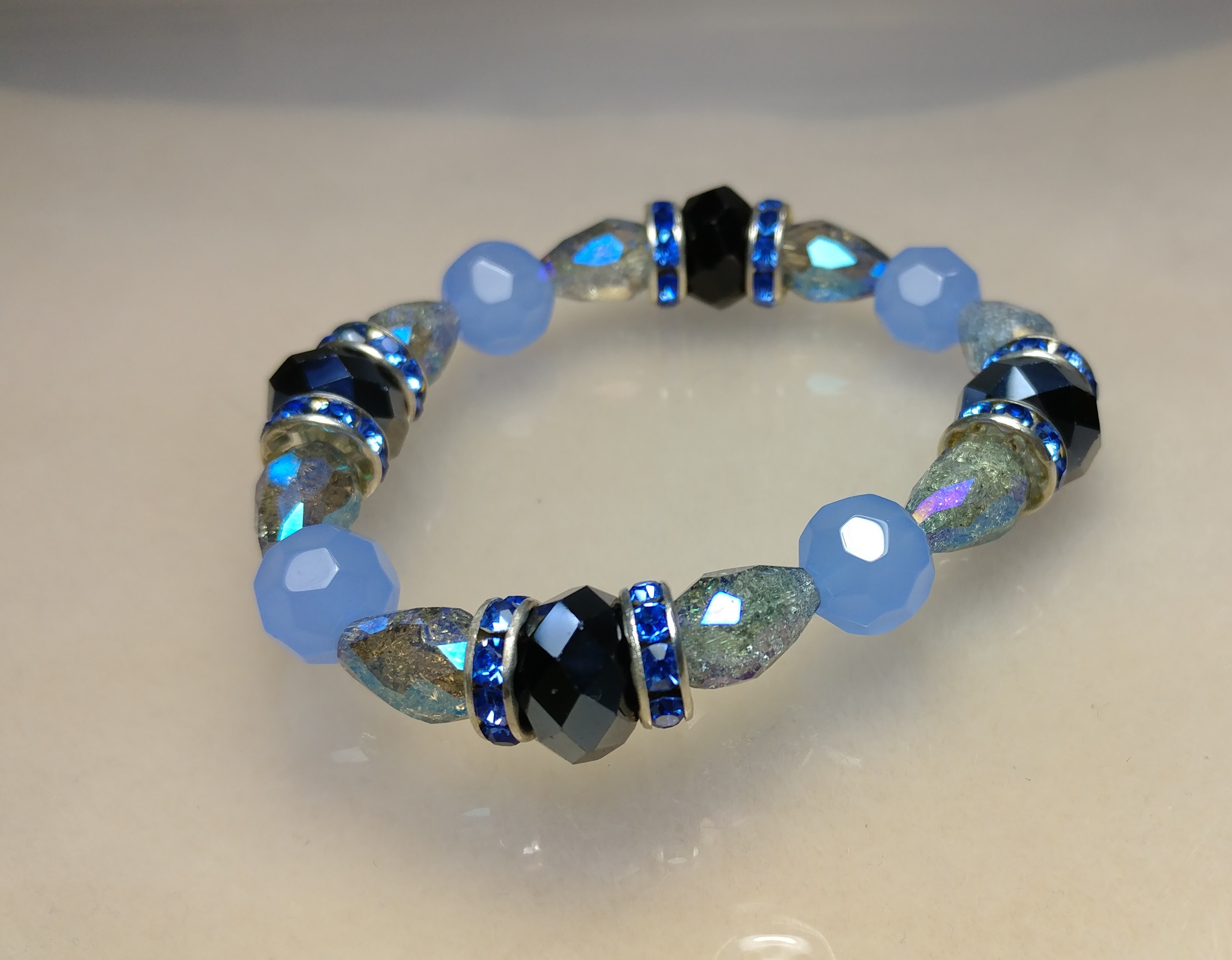Handmade with blue glass bead spaced with blue silver rhinestone spacers on a clear stretchy cord.