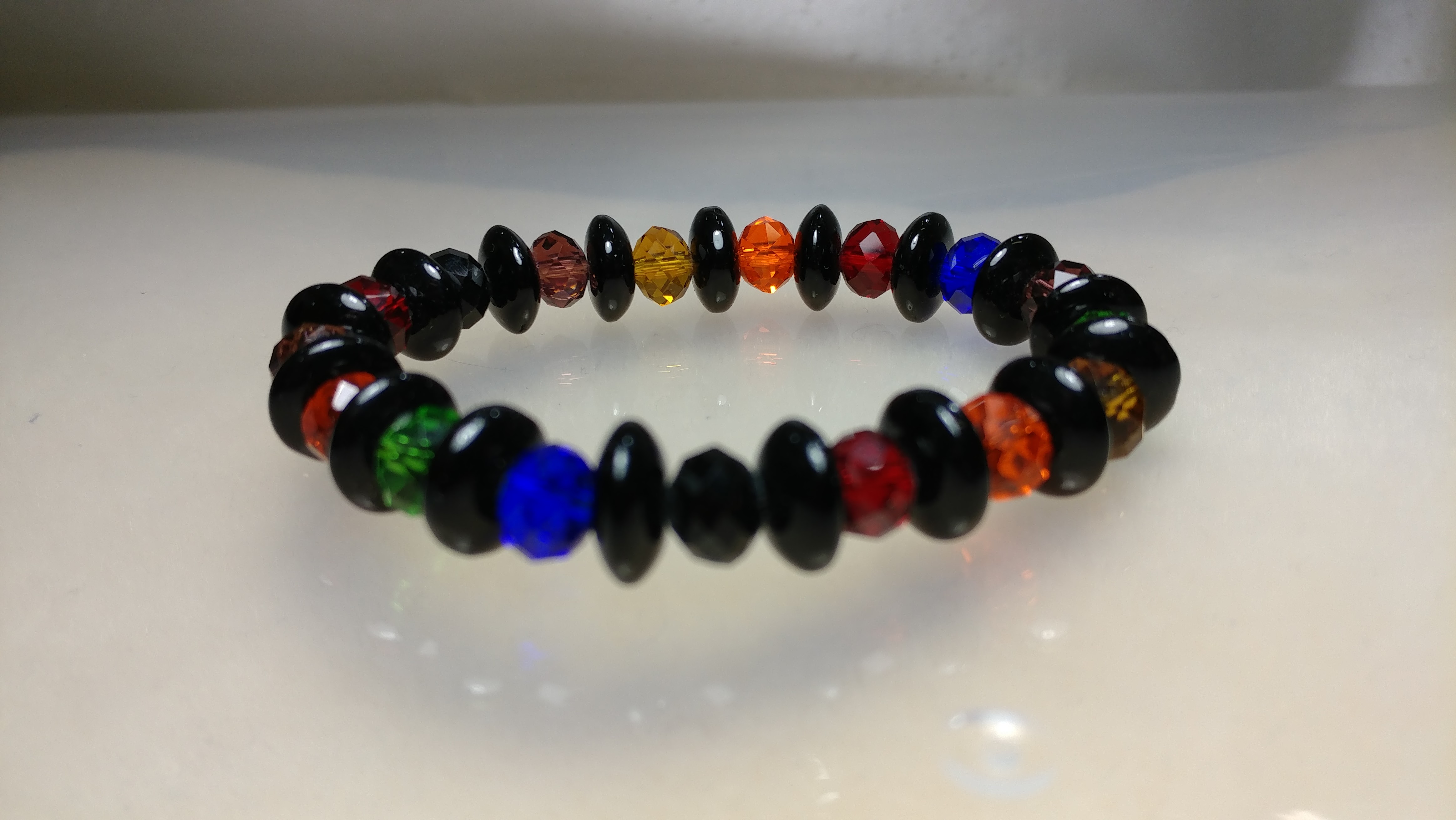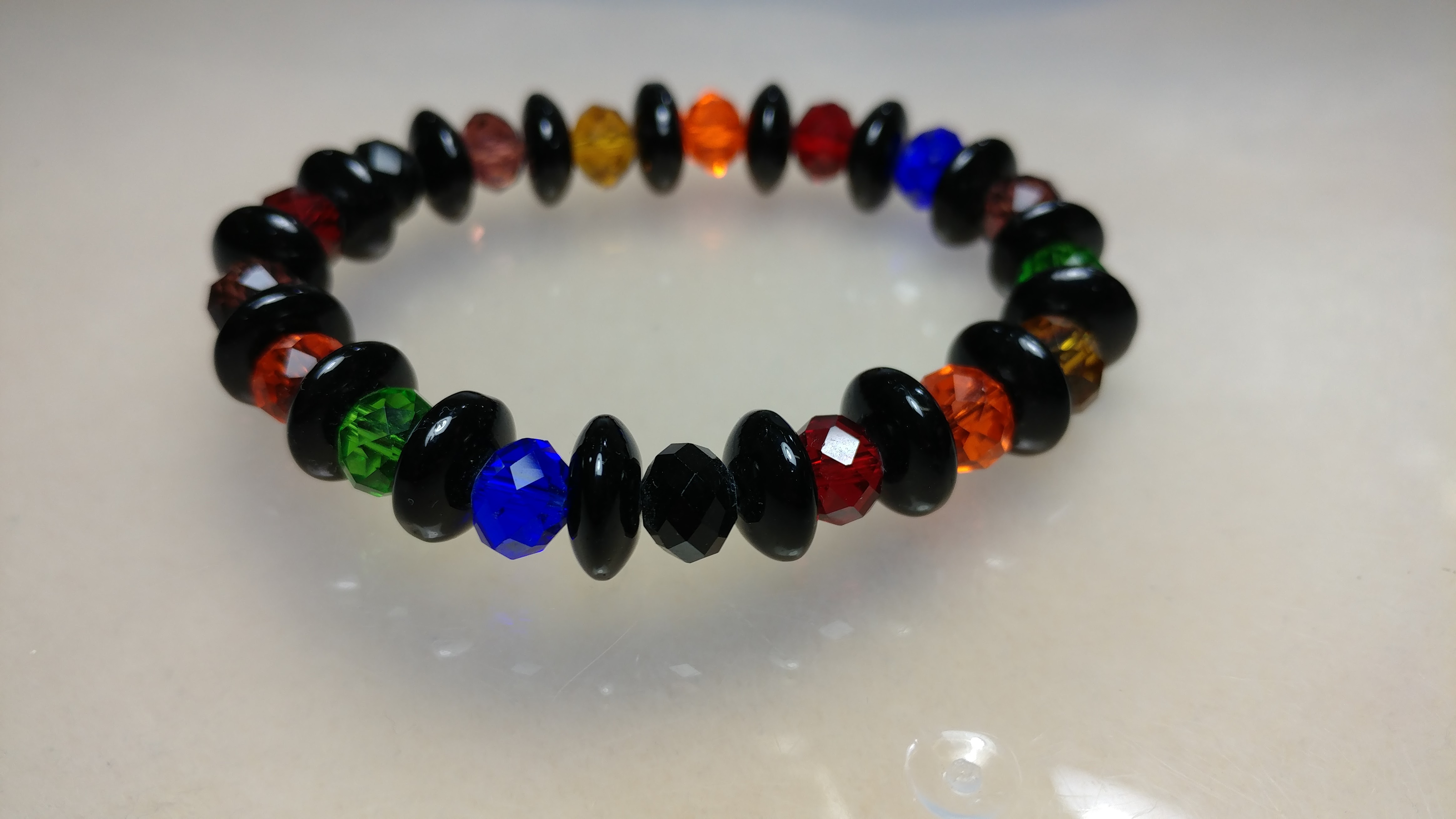 Handmade with black glass painted beads accented with a rainbow of colors glass beads on a clear stretchy cord.