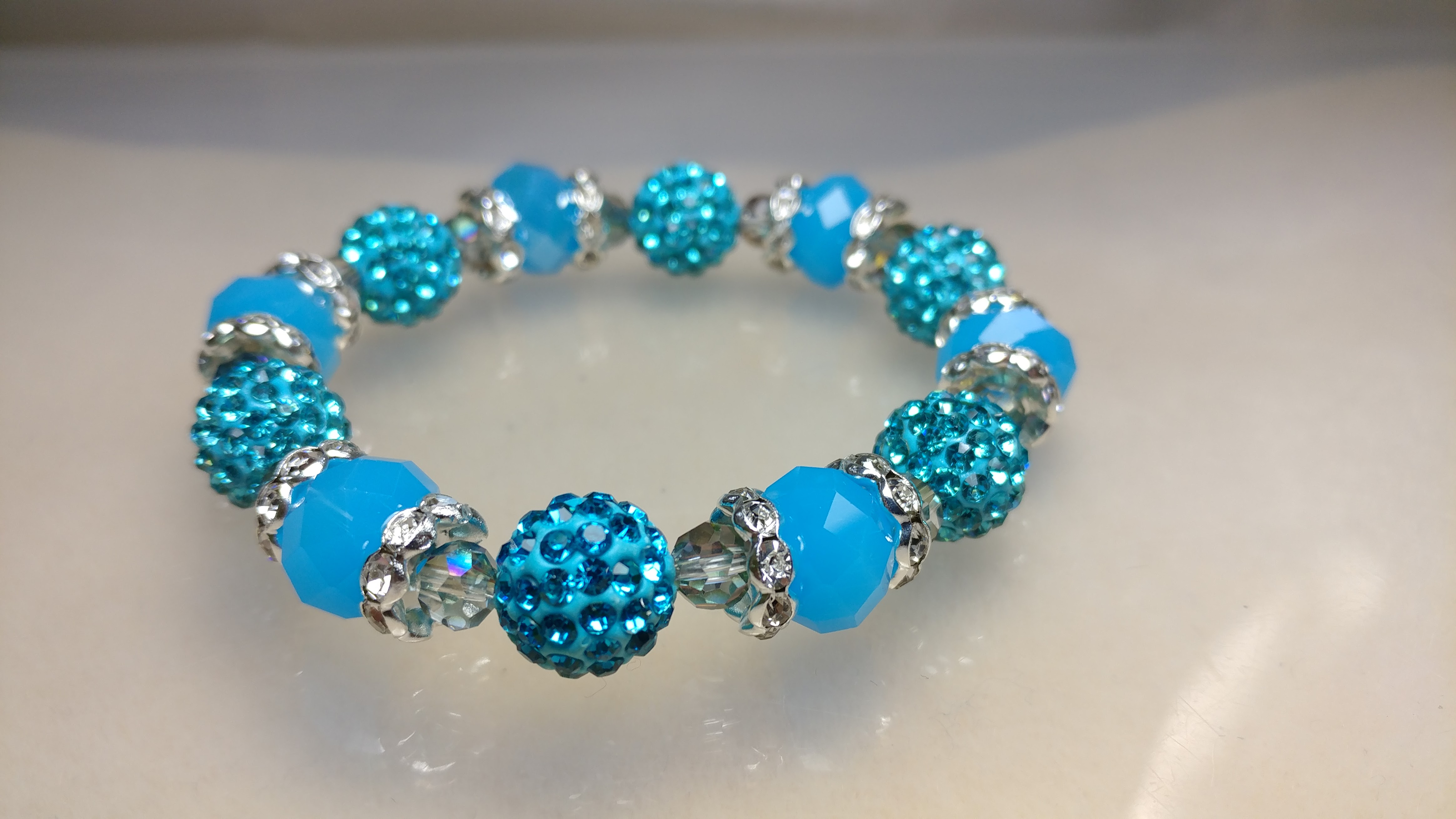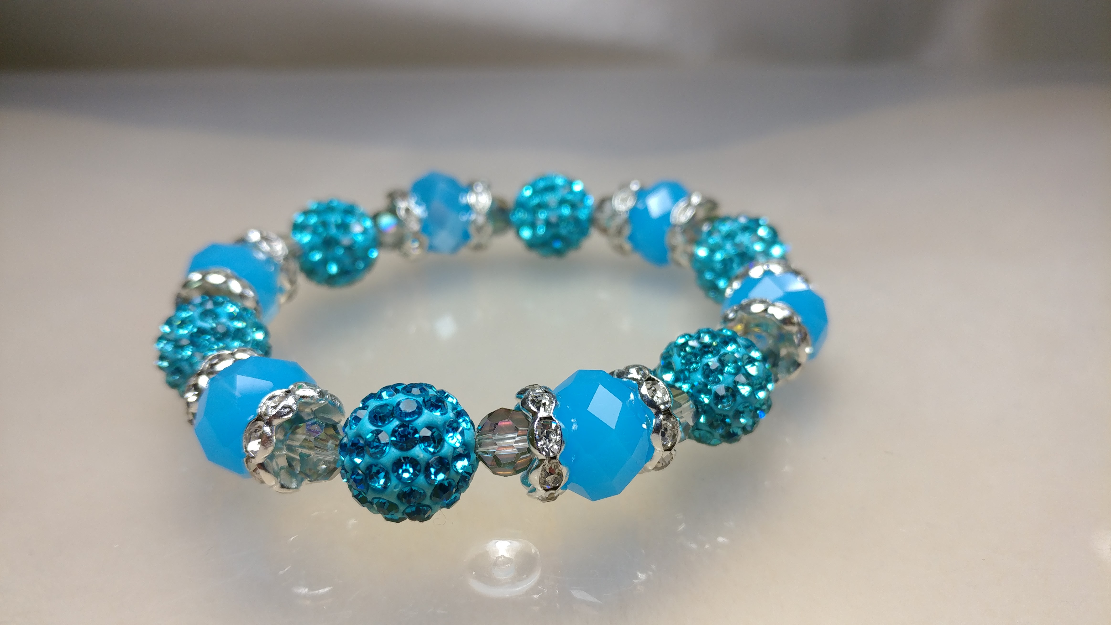 Handmade with a beautiful turquoise blue pave beads and crystal glass beads, spaced with silver rhinestone spacers, on a clear stretchy cord.