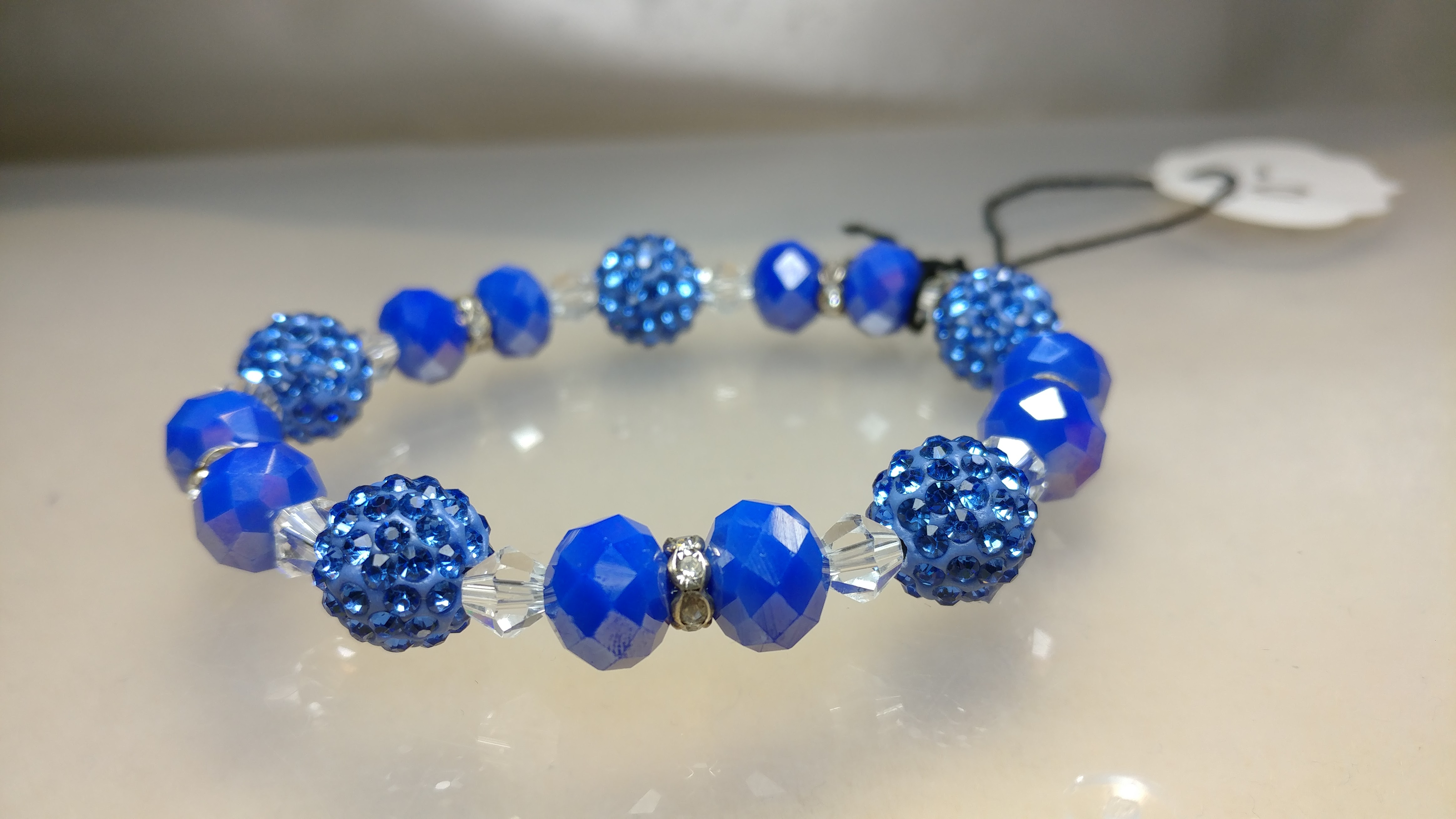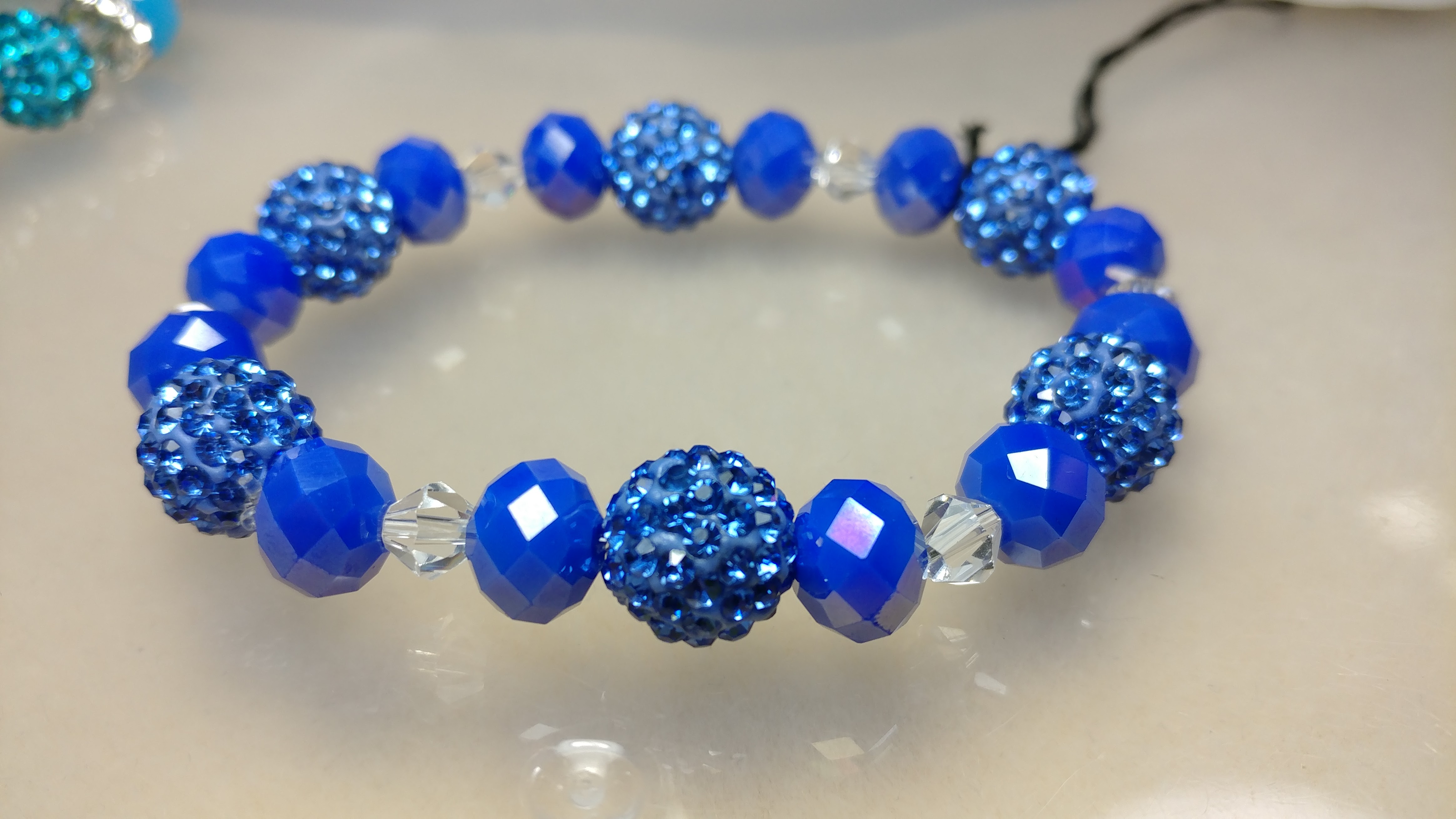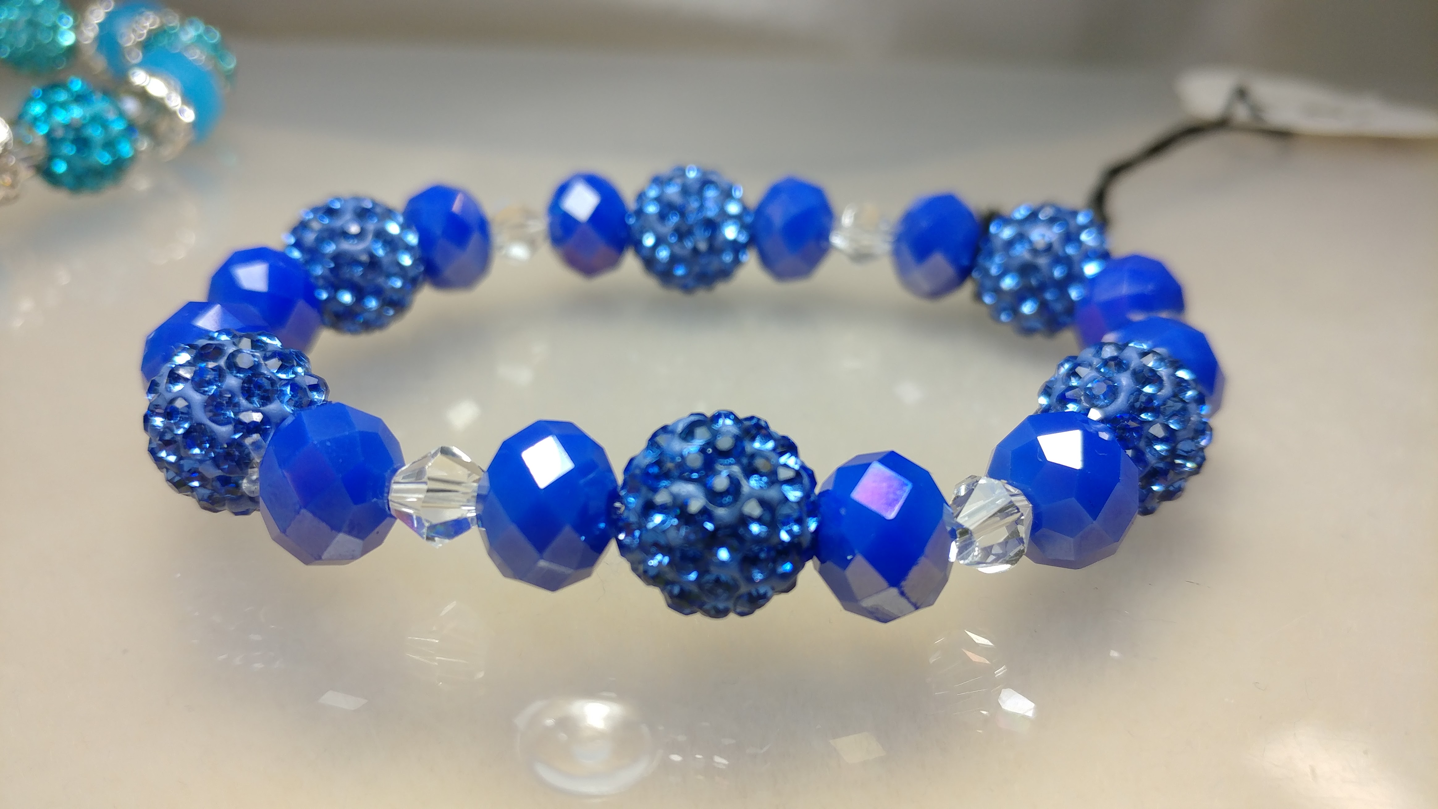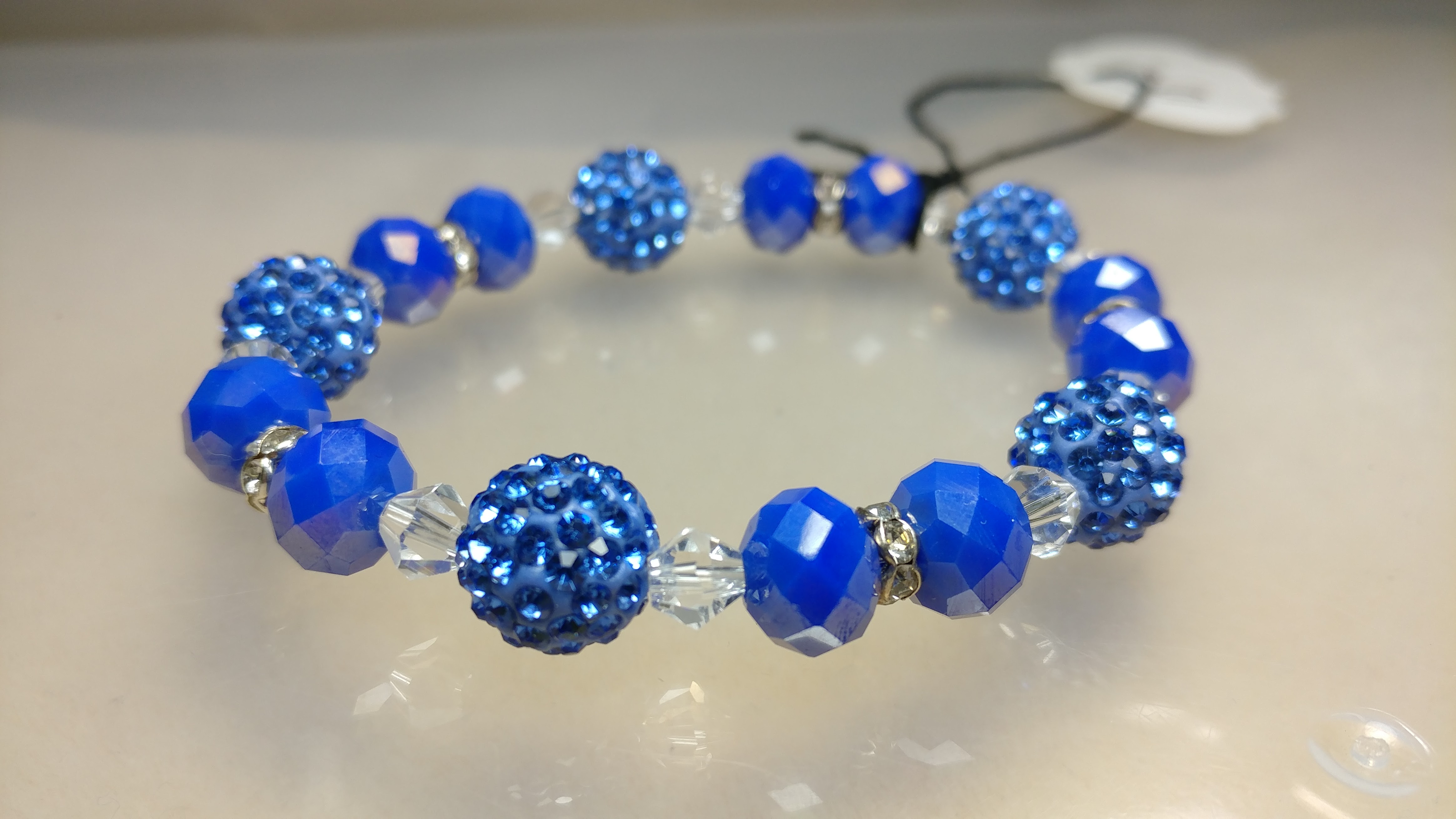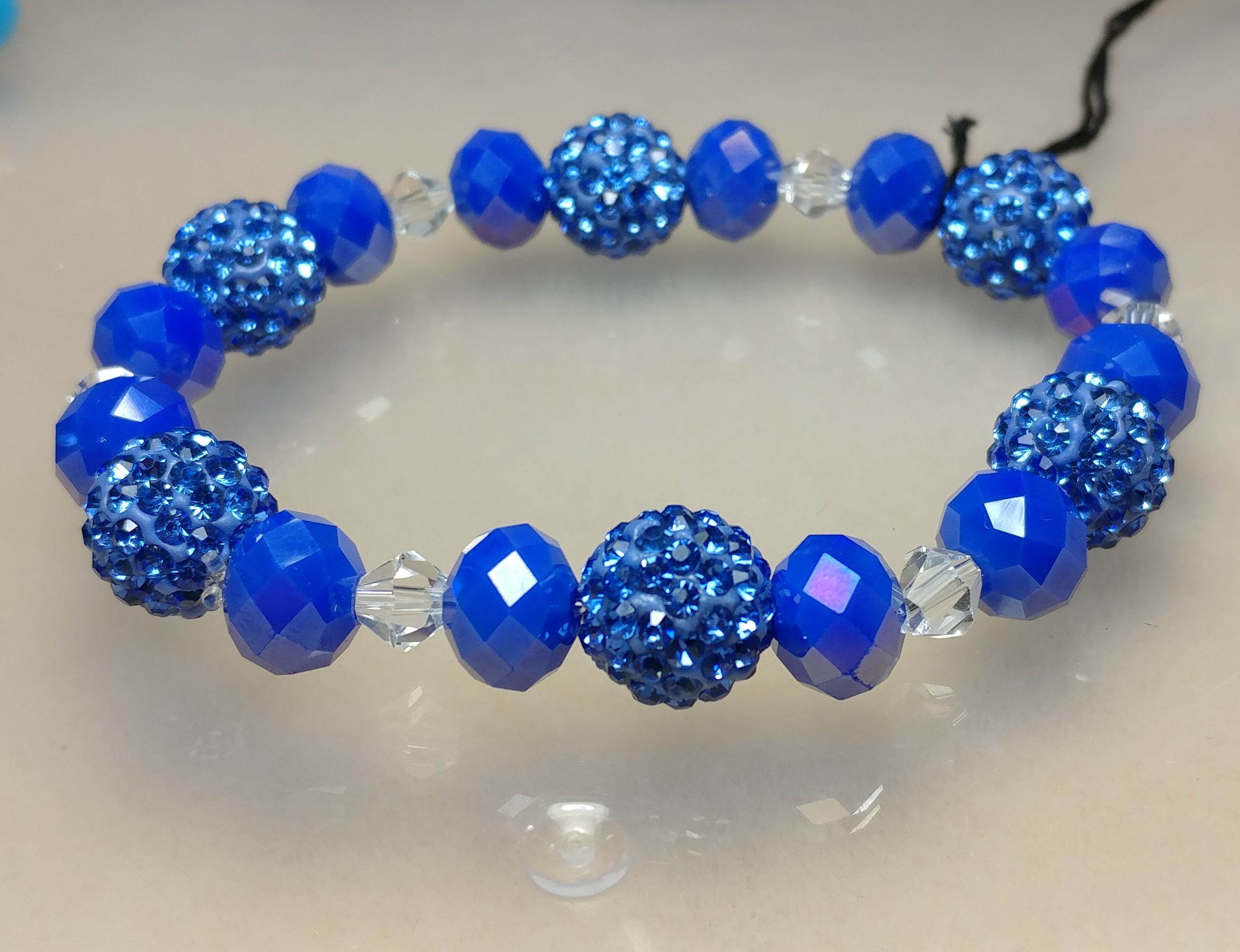 Handmade with a beautiful blue pave bead, and blue and clears crystal glass beads, on a clear stretchy cord.