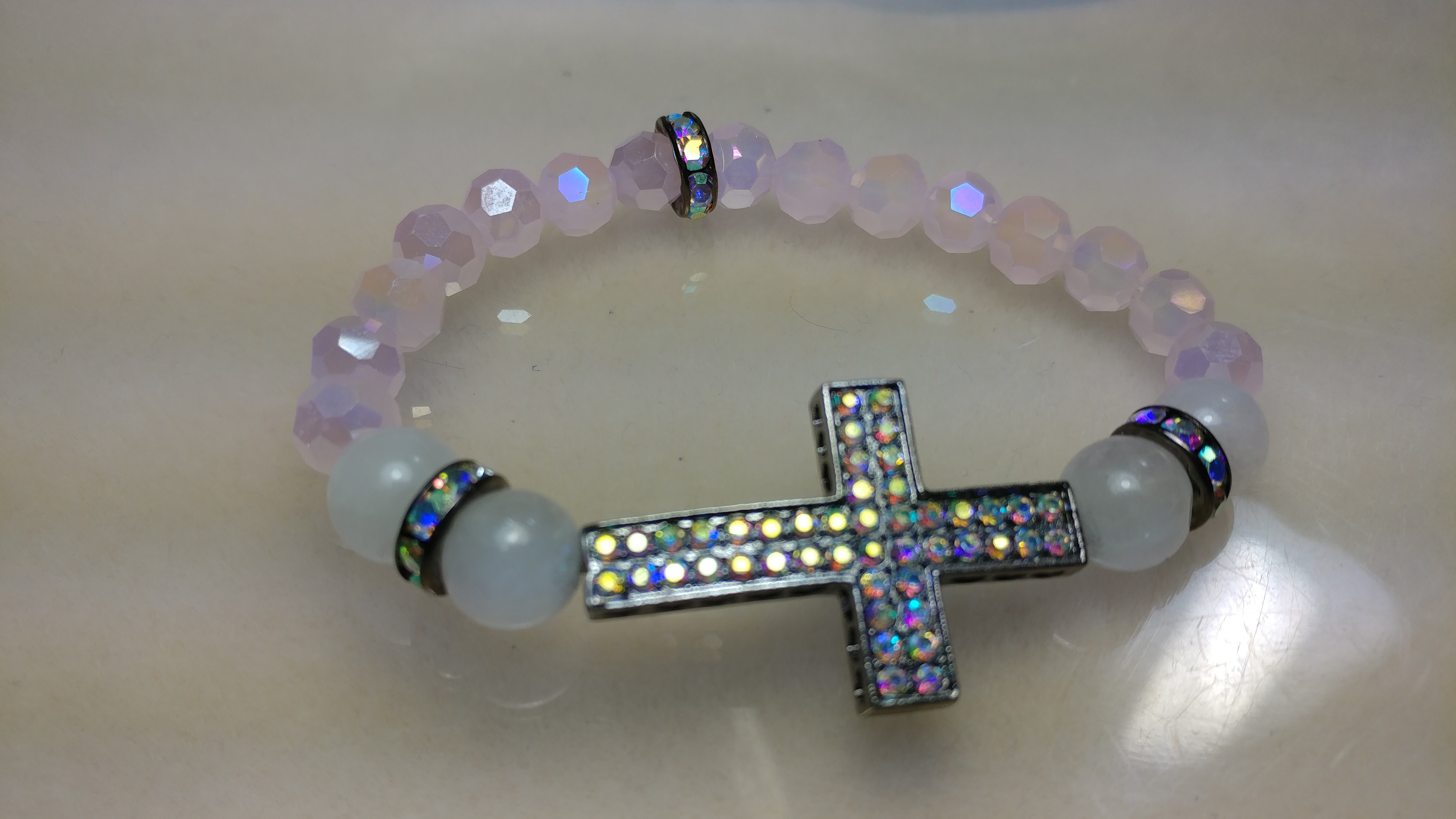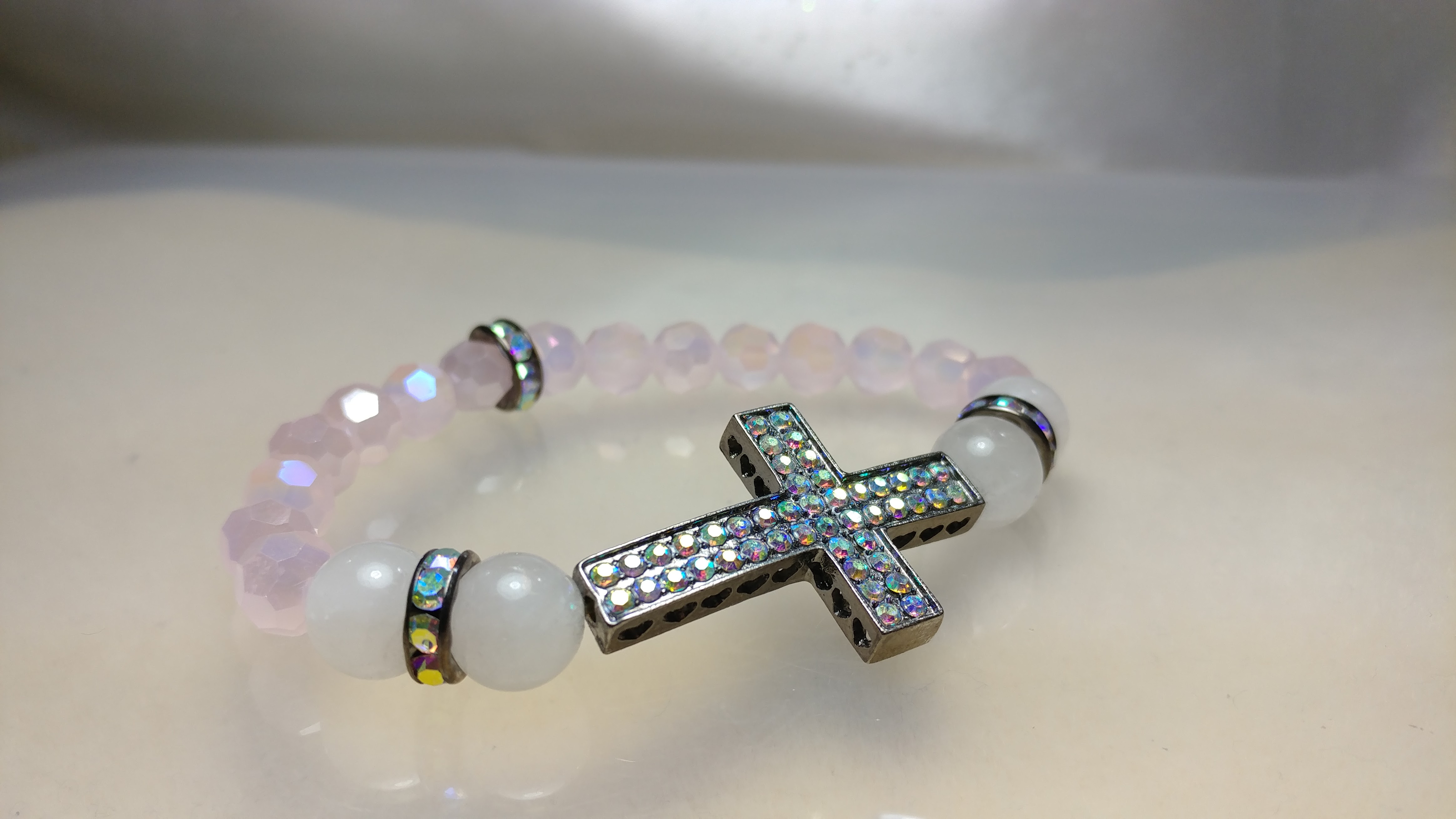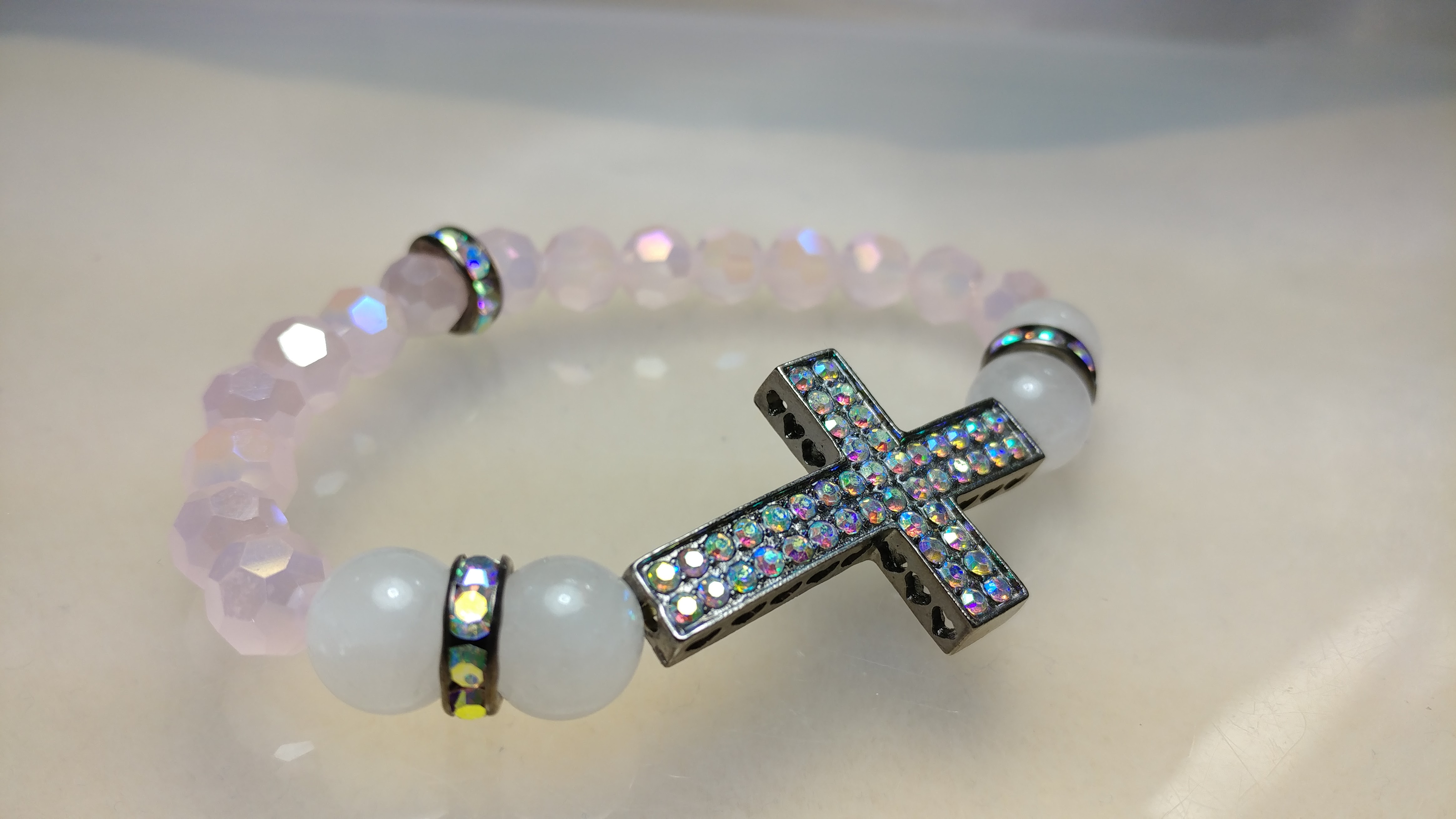 Handmade with a silver AB cross surrounded by pale pink glass crystal beads, on a clear stretchy cord.
