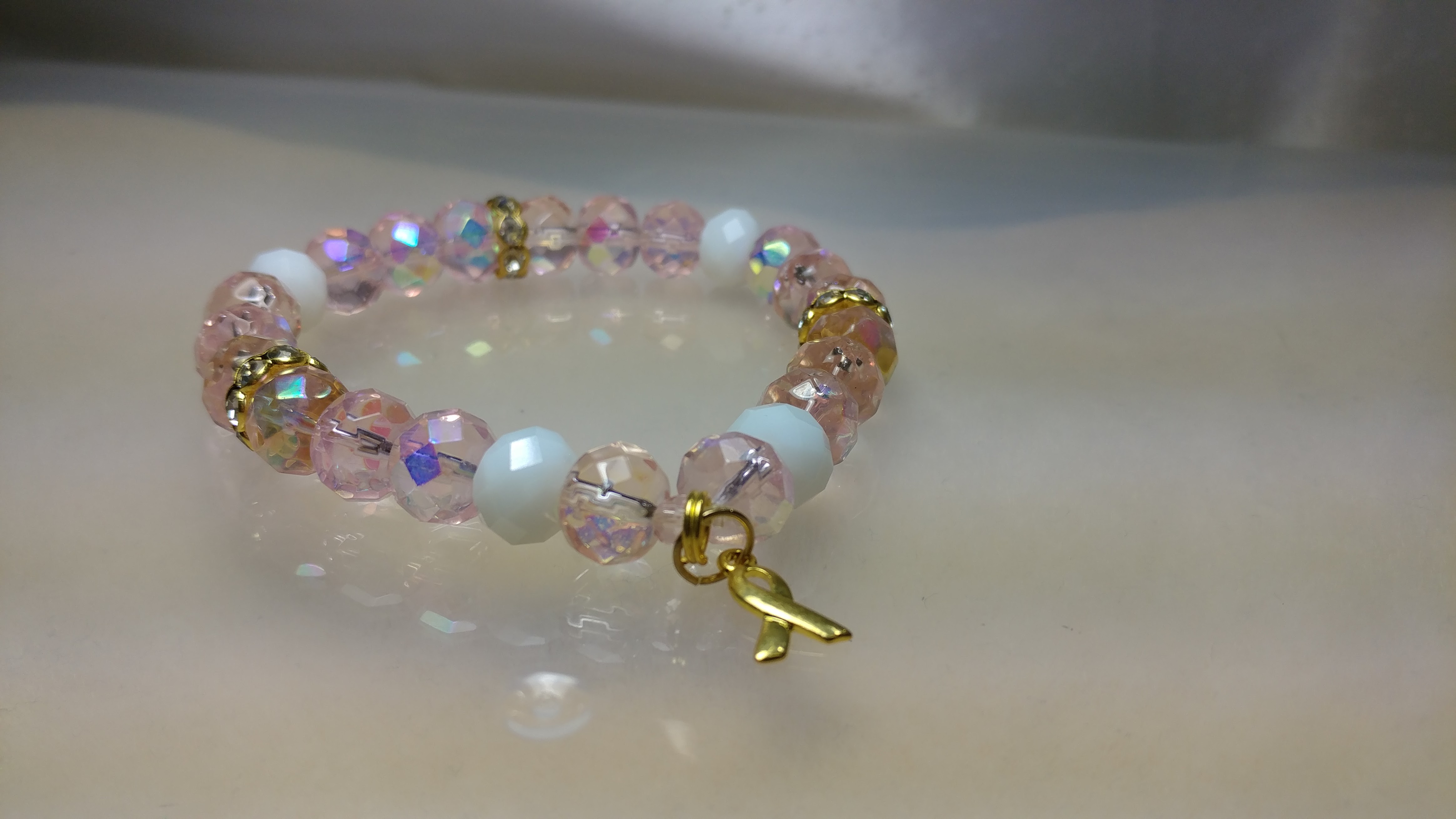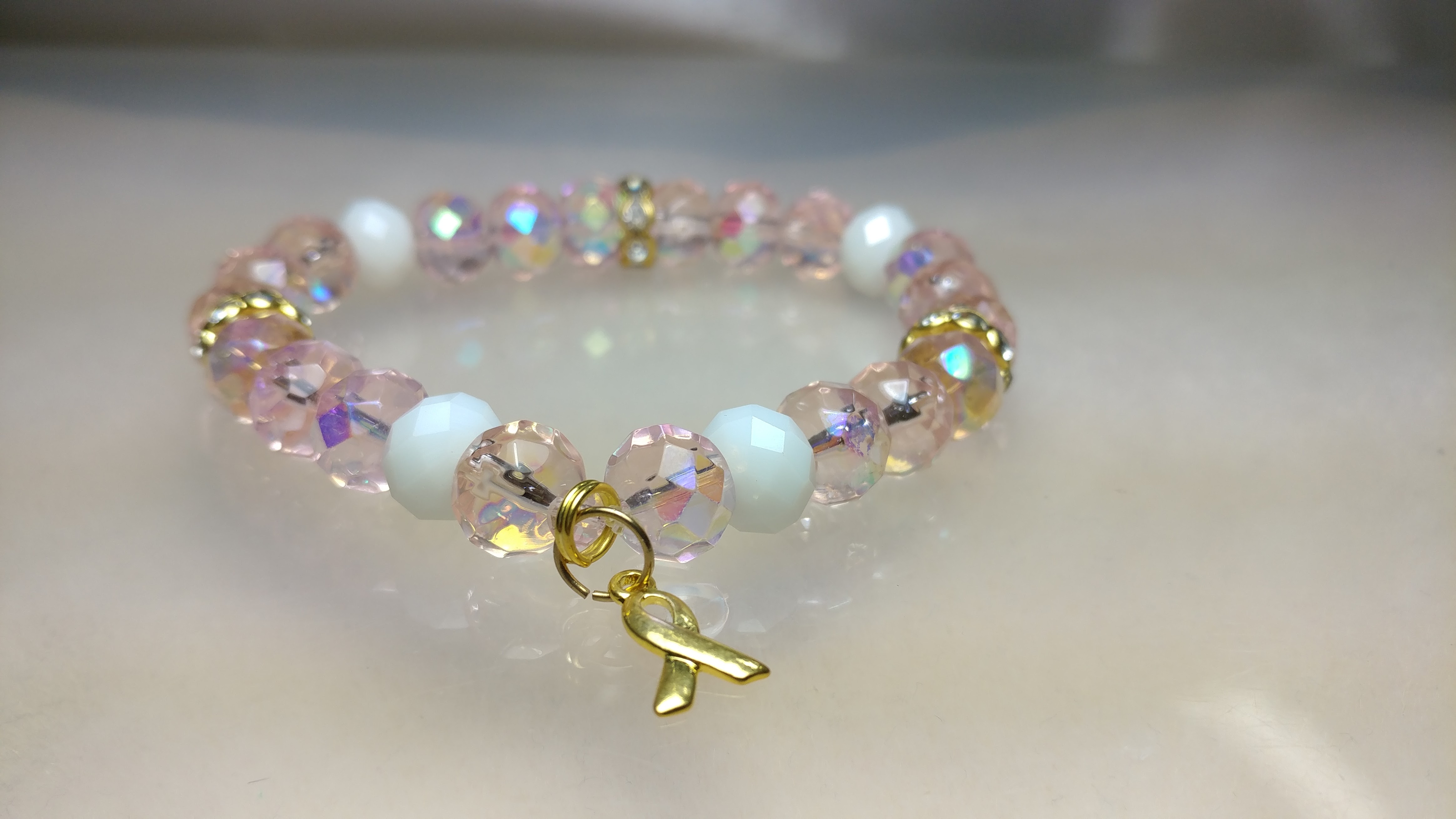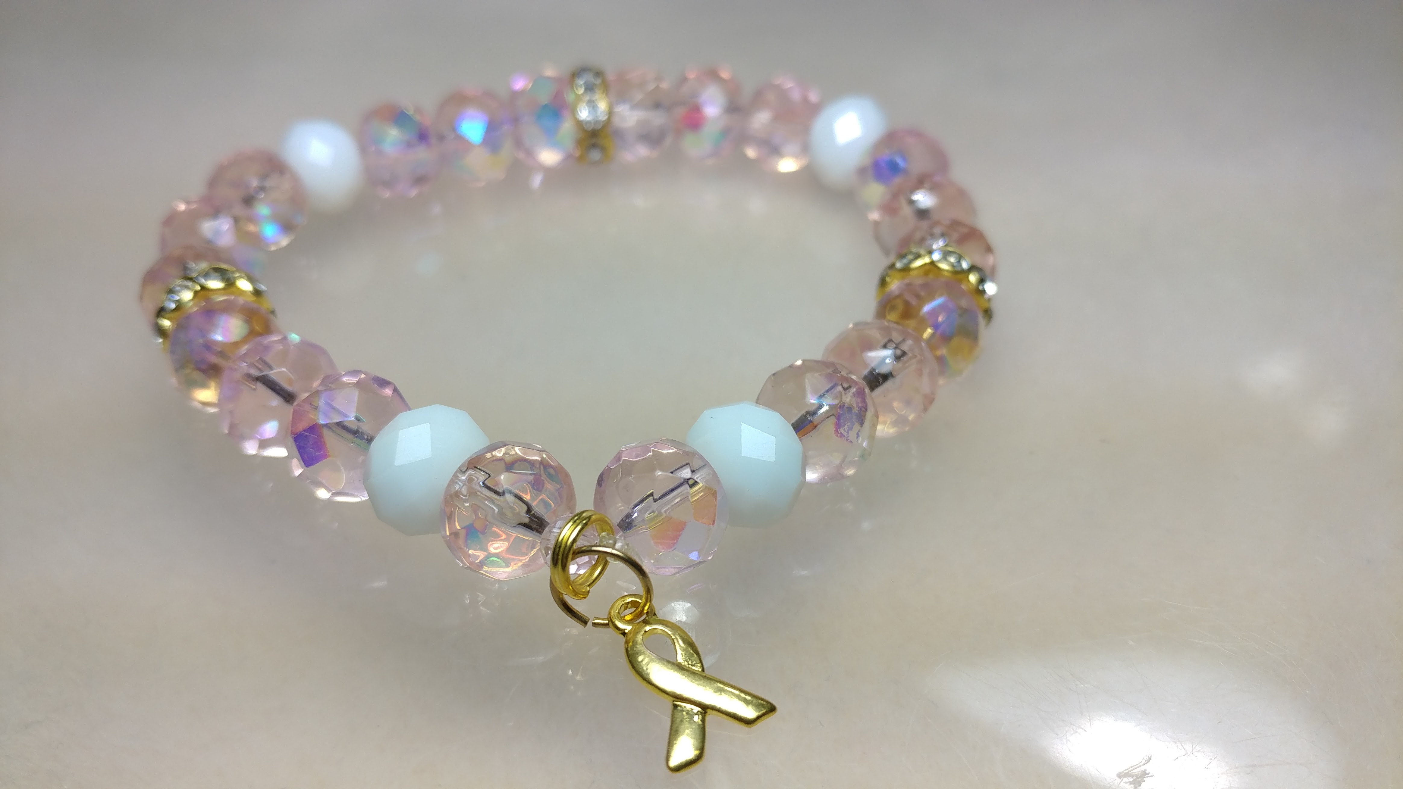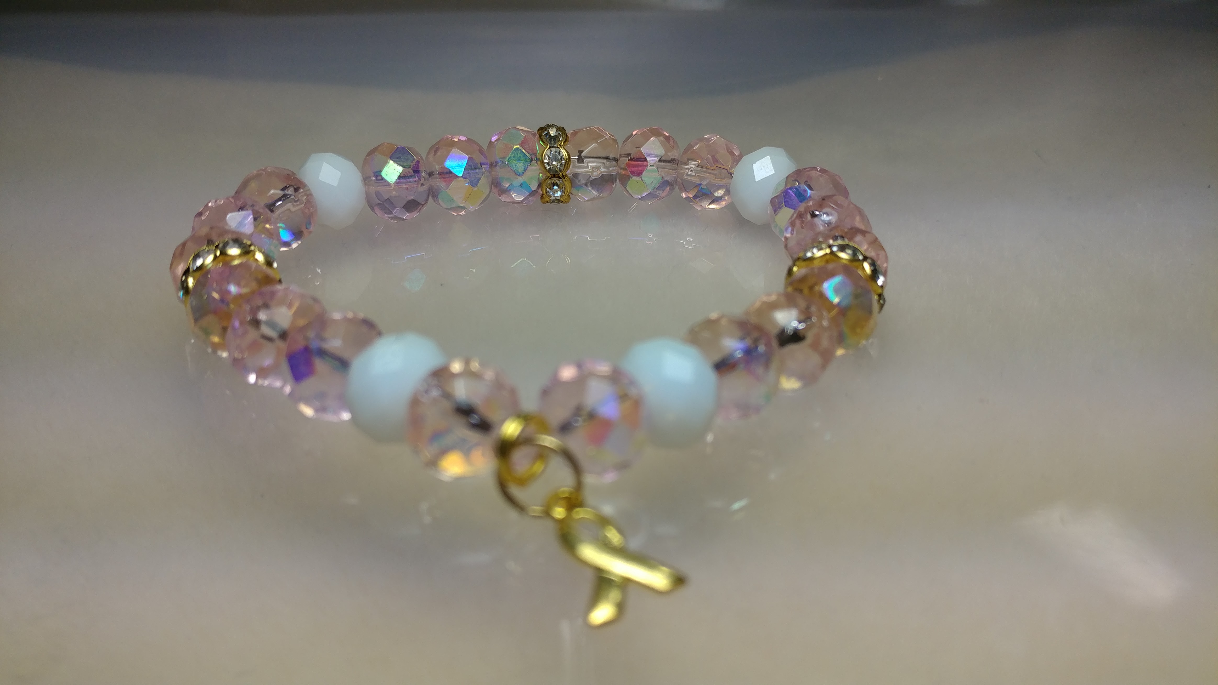 Handmade with Pink AB and white glass beads spaced with gold rhinestone spacers with a small gold ribbon charm, on a clear stretchy cord.