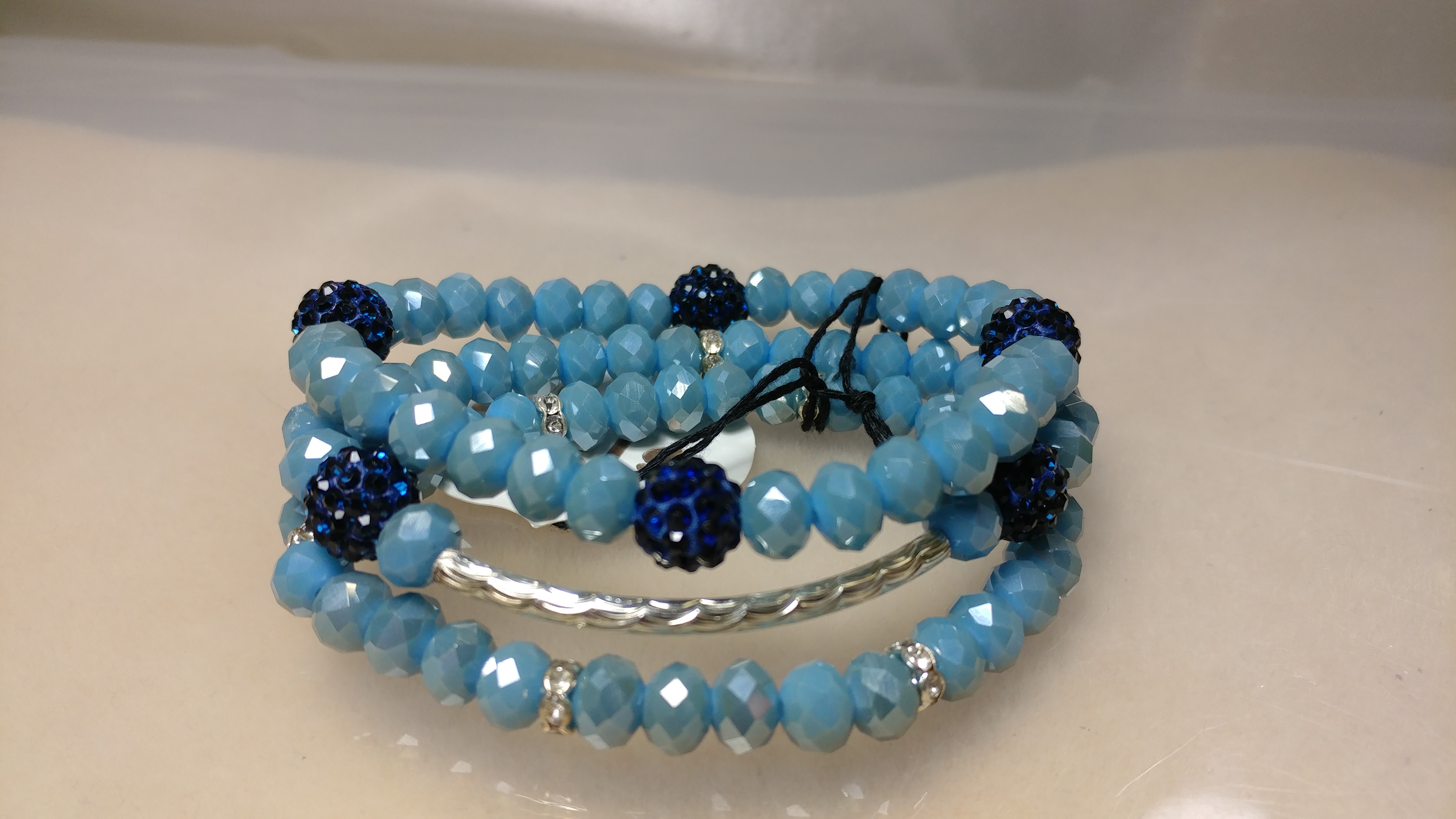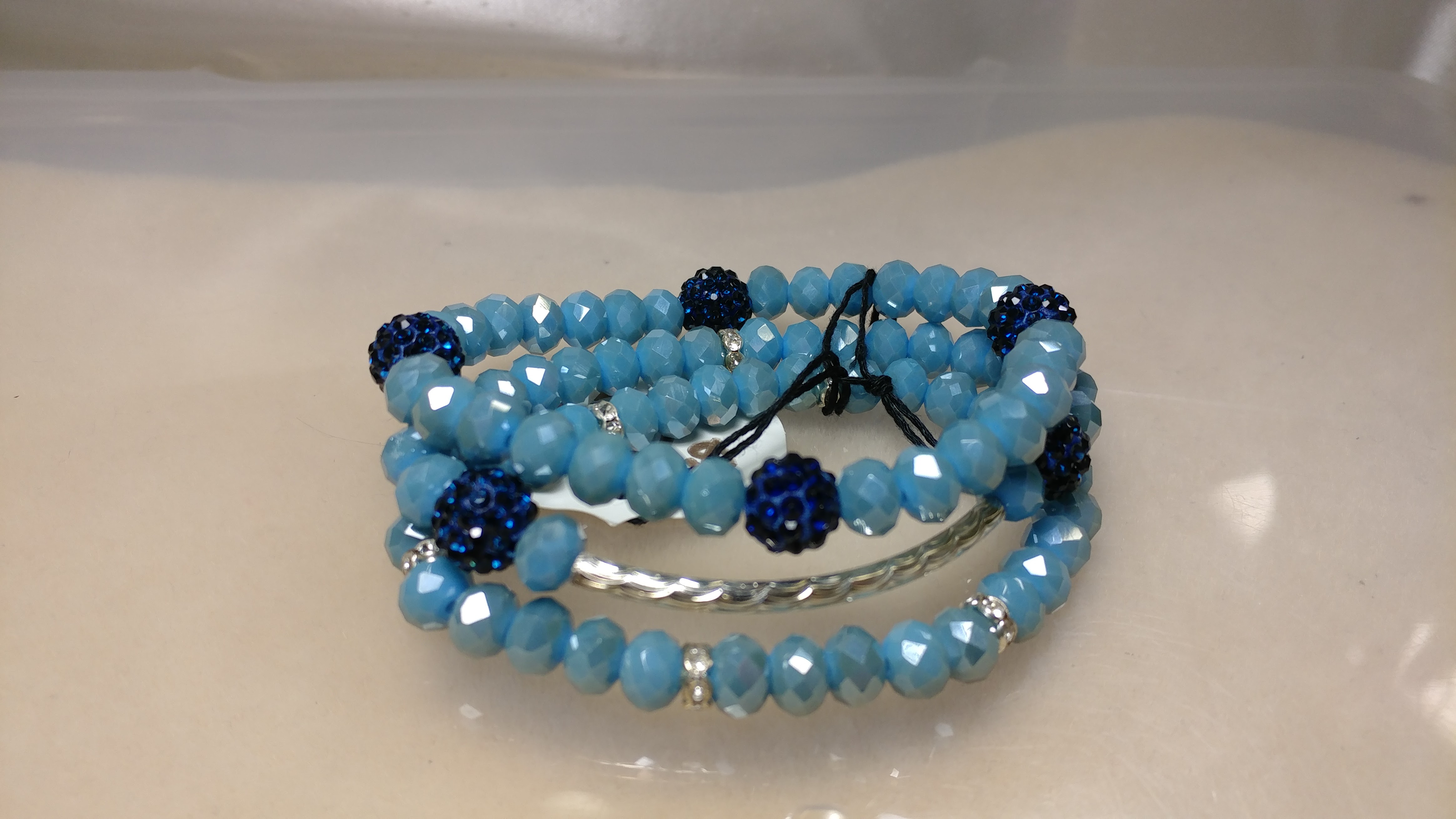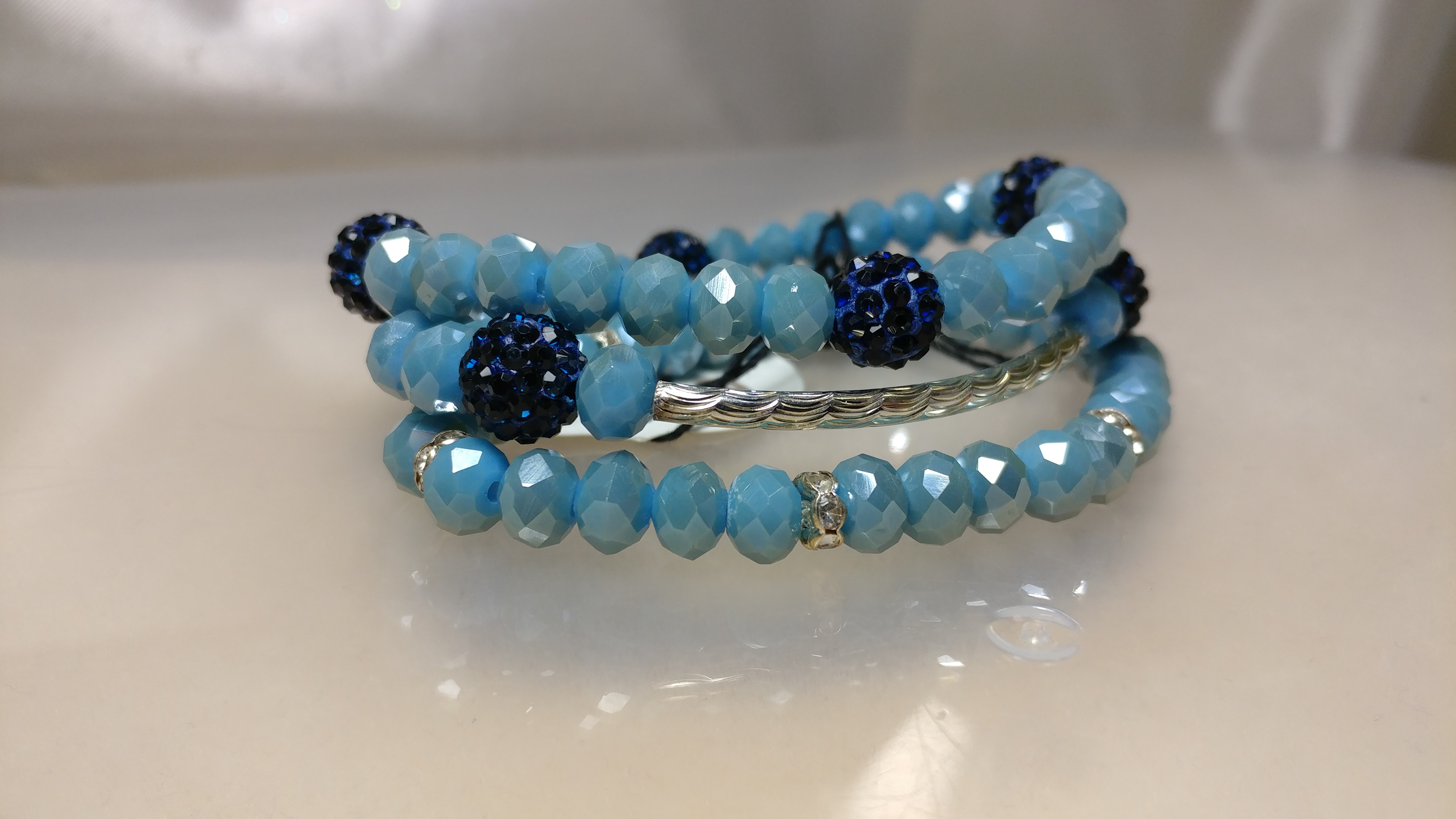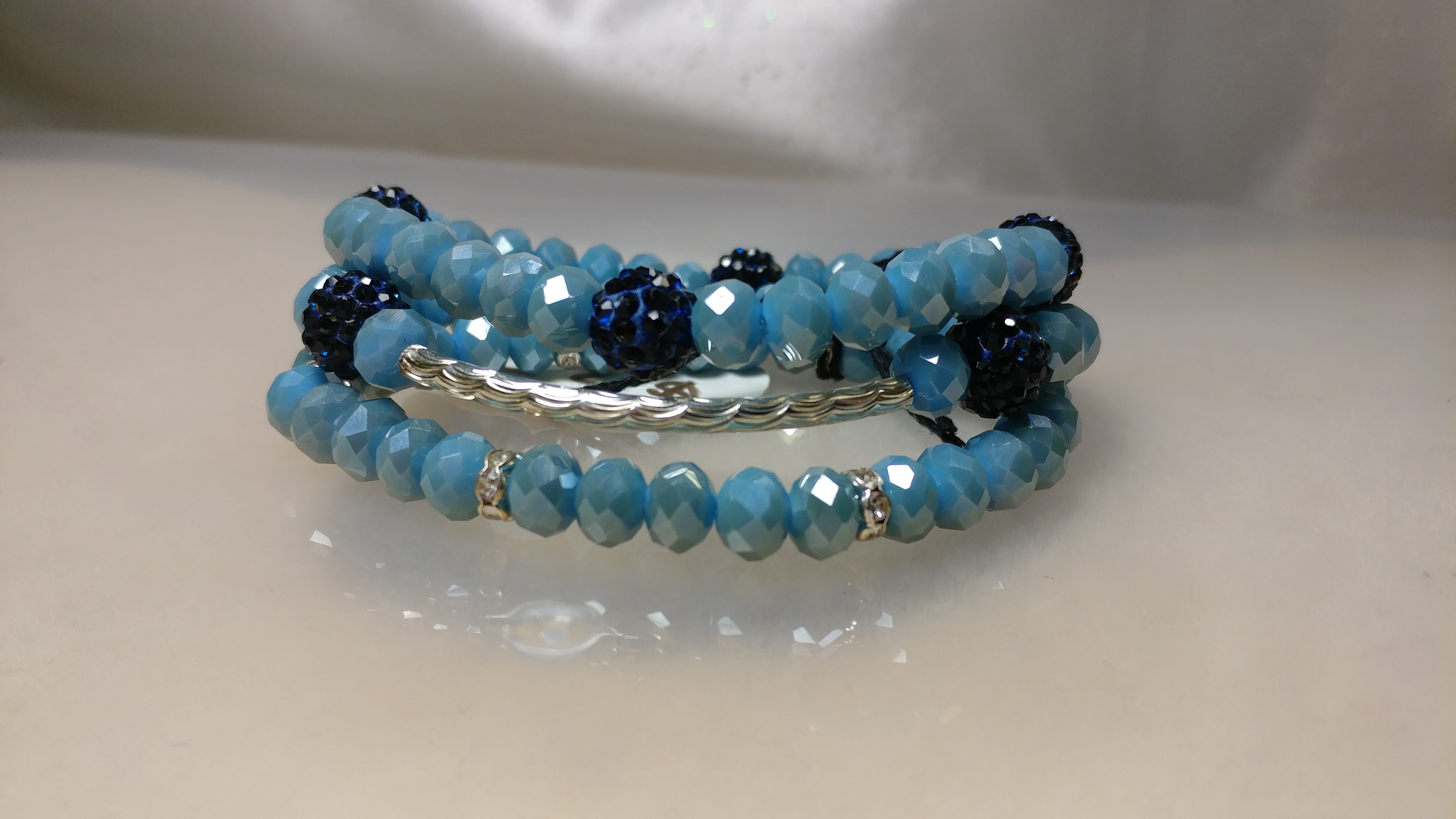 Handmade with a silver connector, surrounded by beautiful blue glass crystal bead, accented with dark blue rhinestone pave beads spaced with silver rhinestone spacers, on a clear stretchy cord.