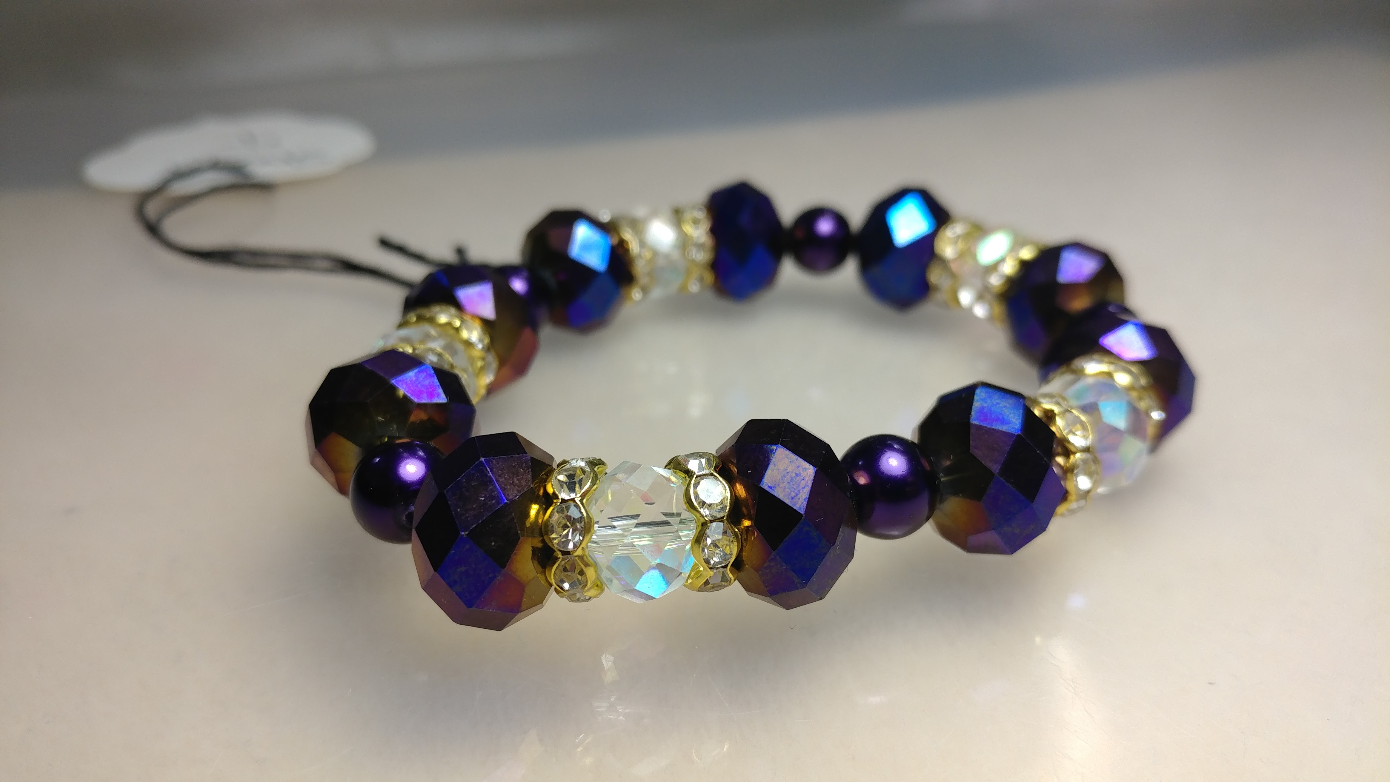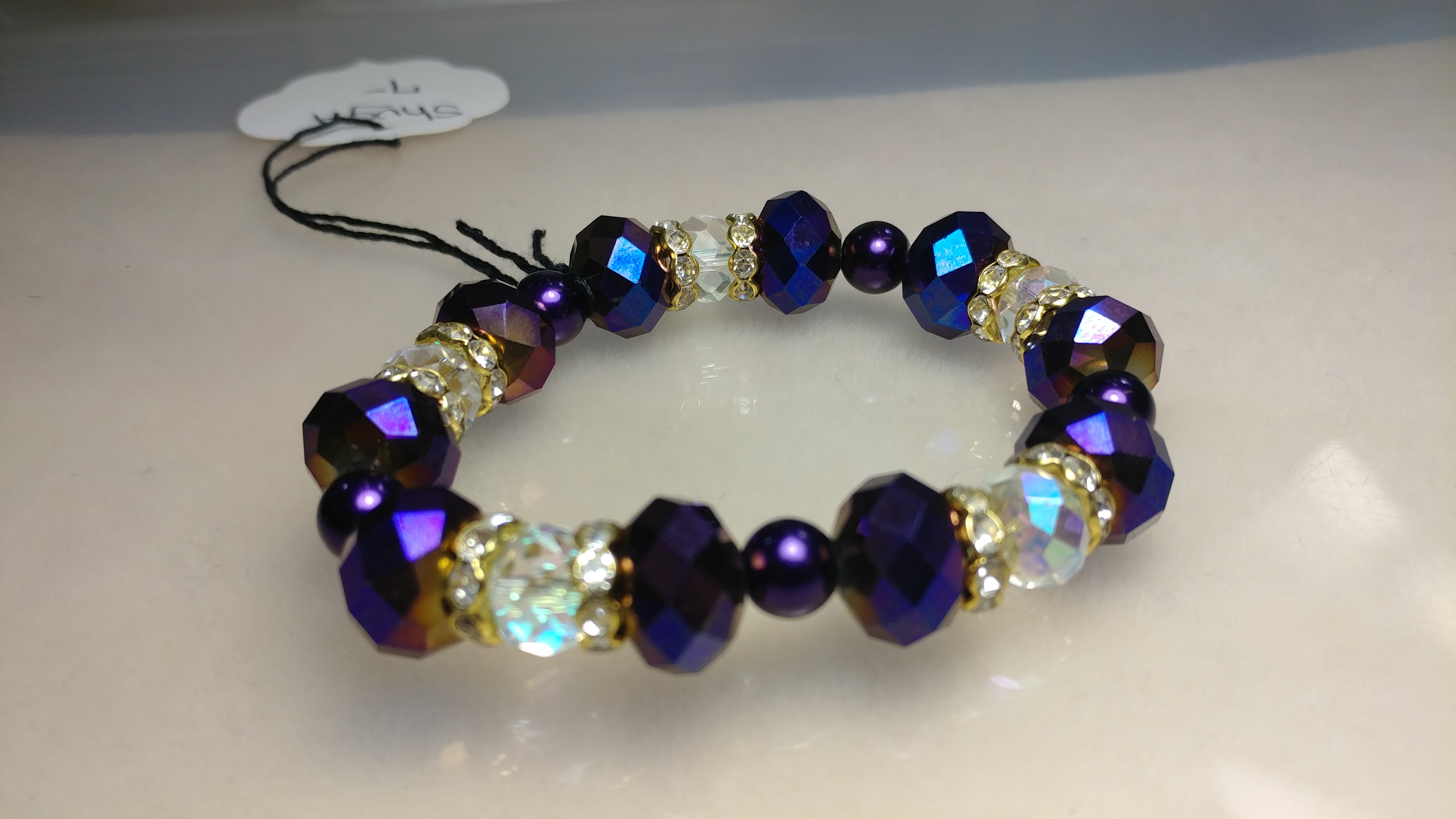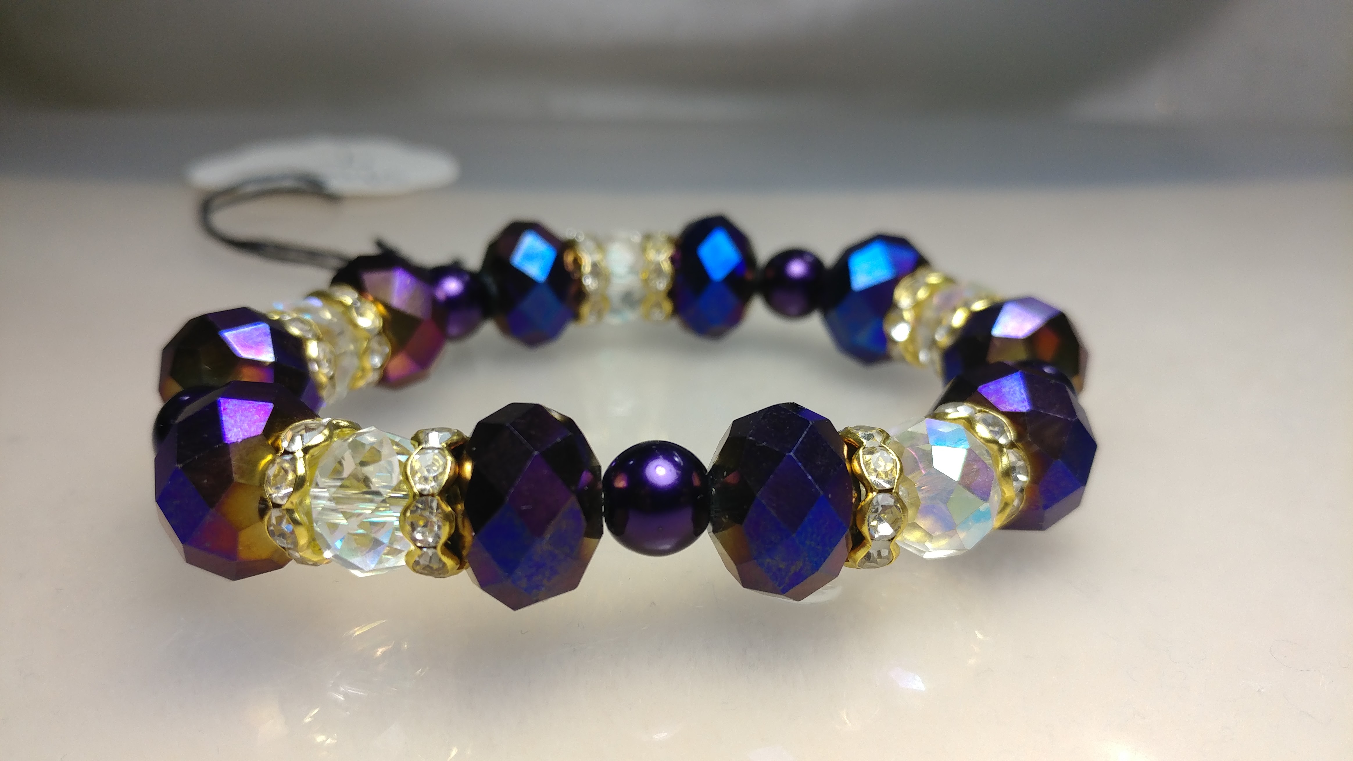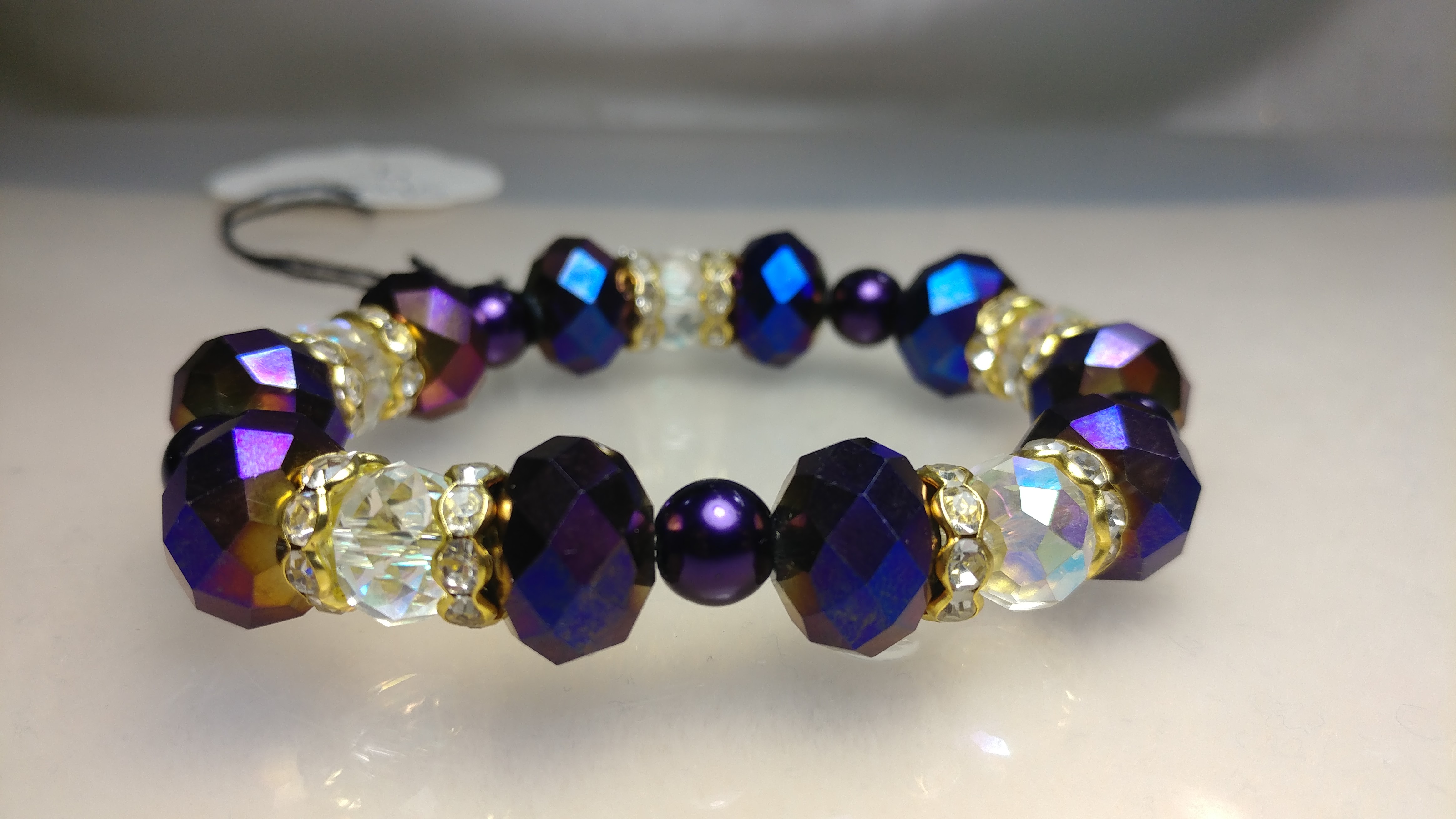 Handmade with purple and clear glass beads, painted purple pearl beads, spaced with gold rhinestone spacers on a clear stretchy cord.