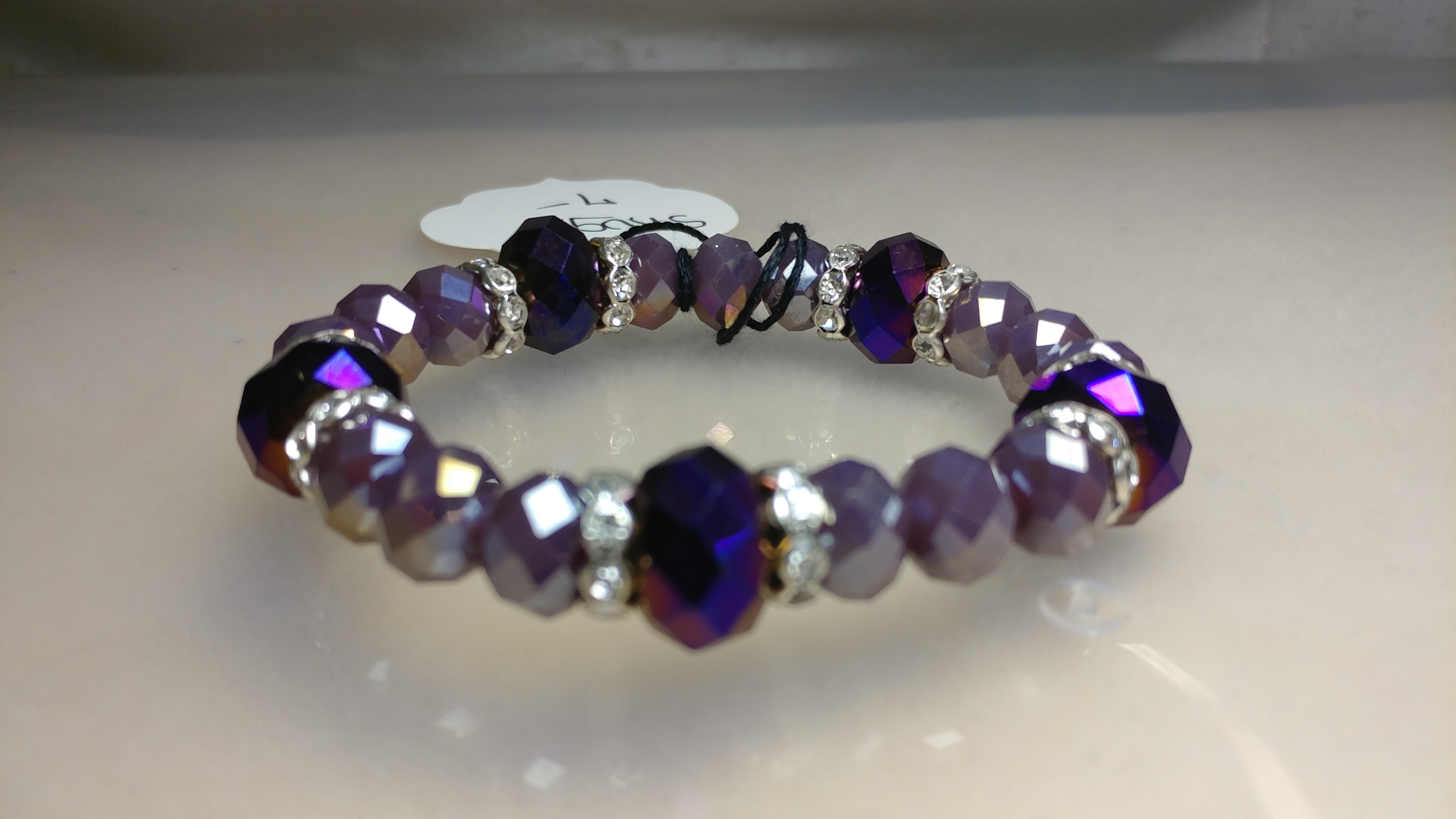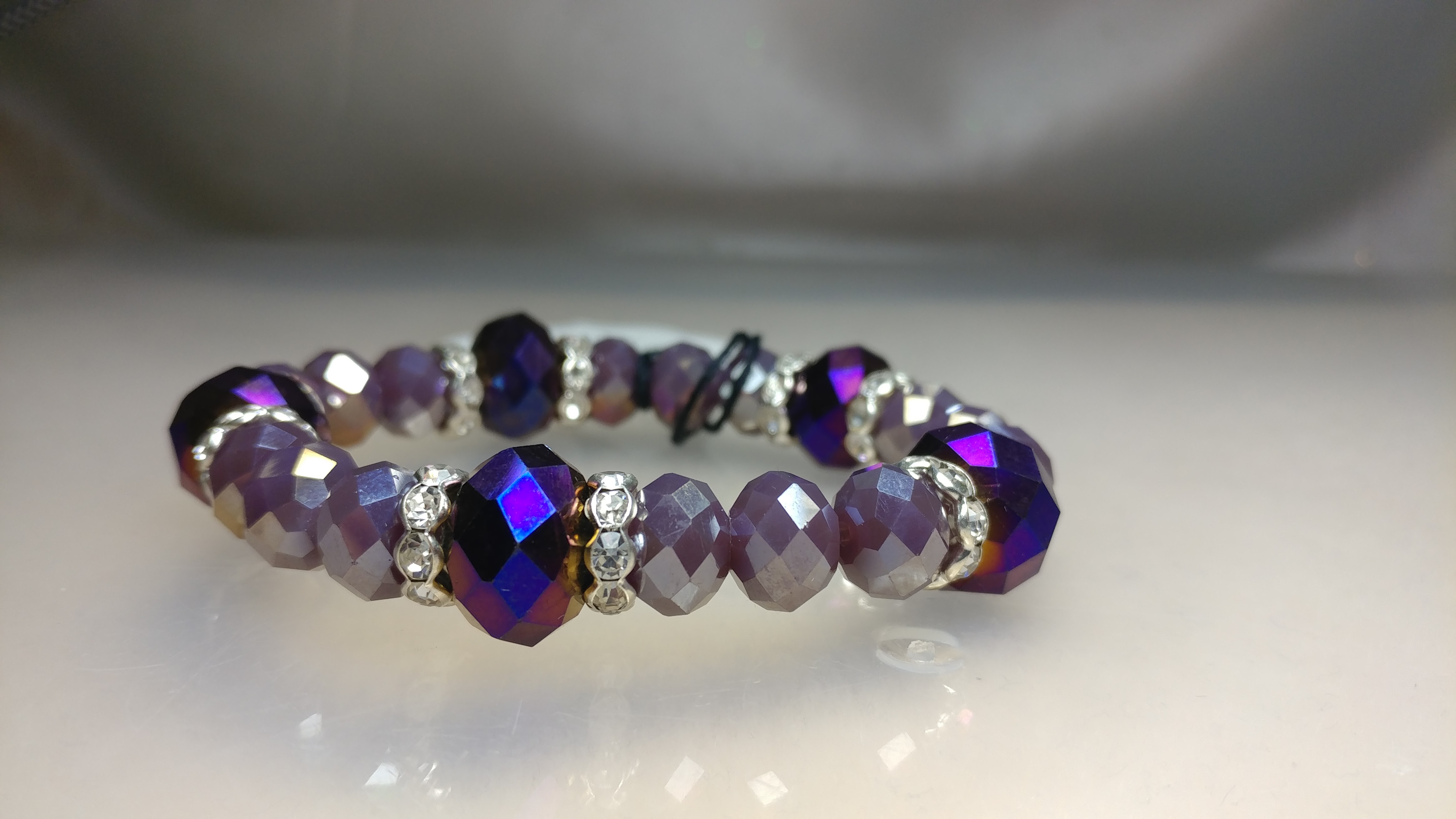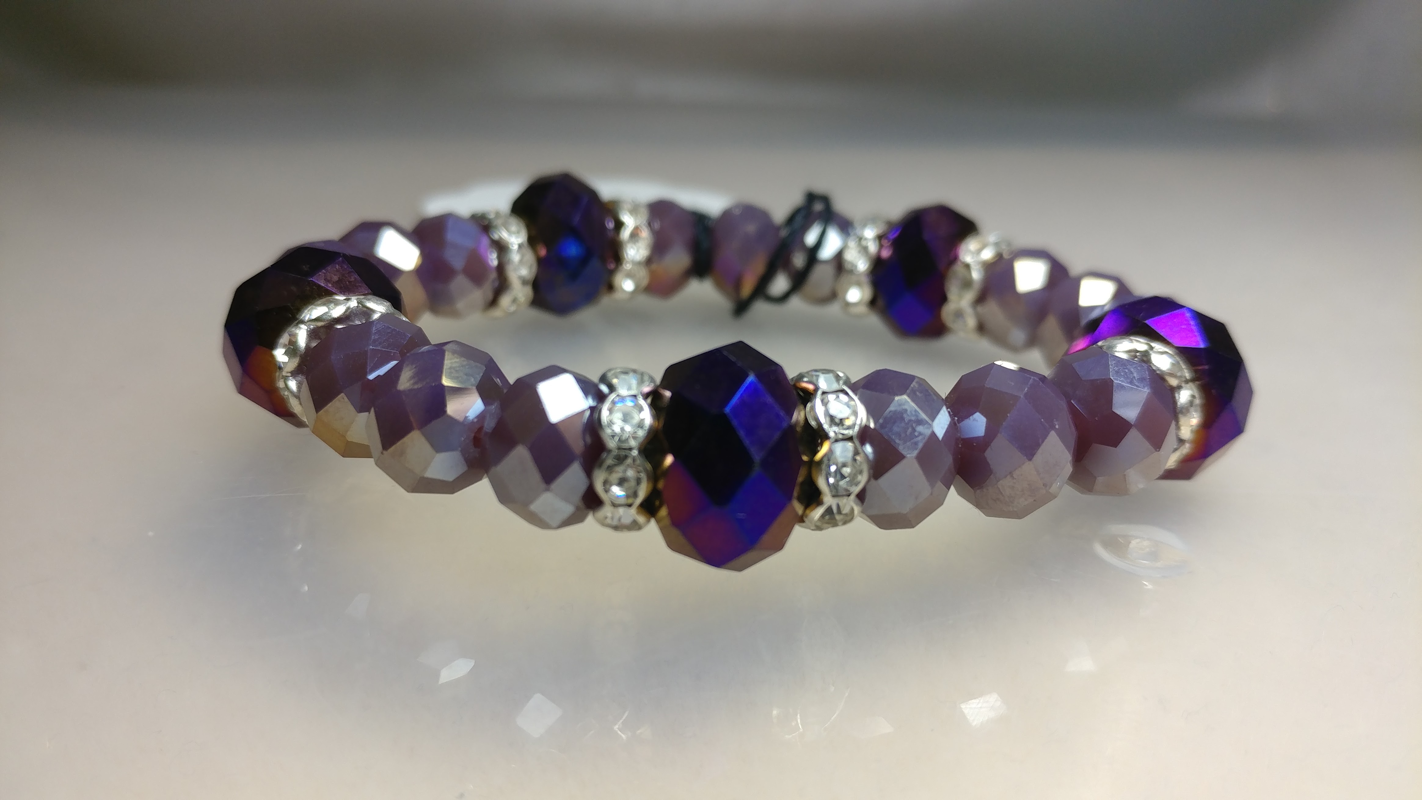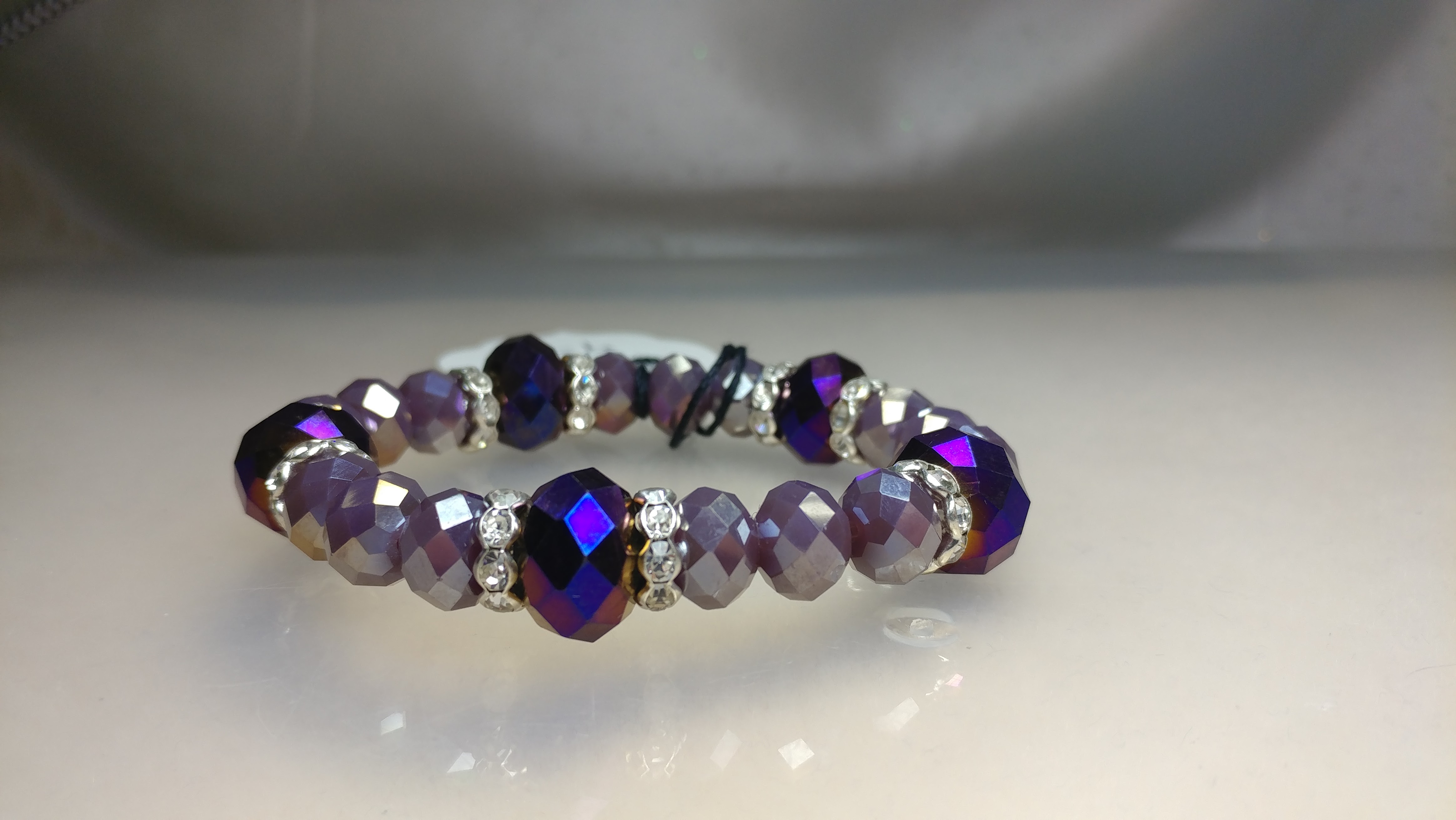 Handmade with purple glass beads, painted purple pearl beads, spaced with silver rhinestone spacers on a clear stretchy cord.