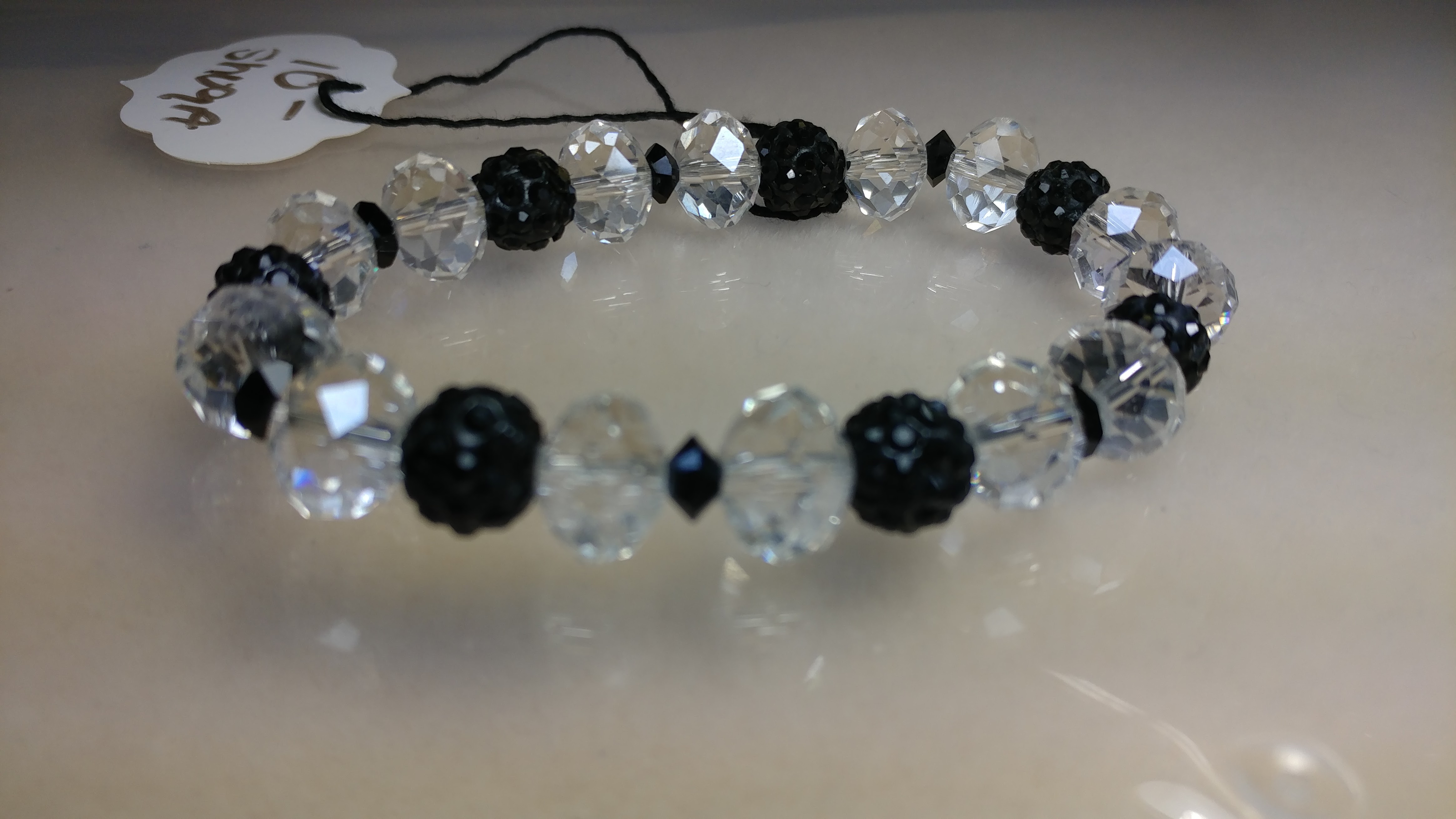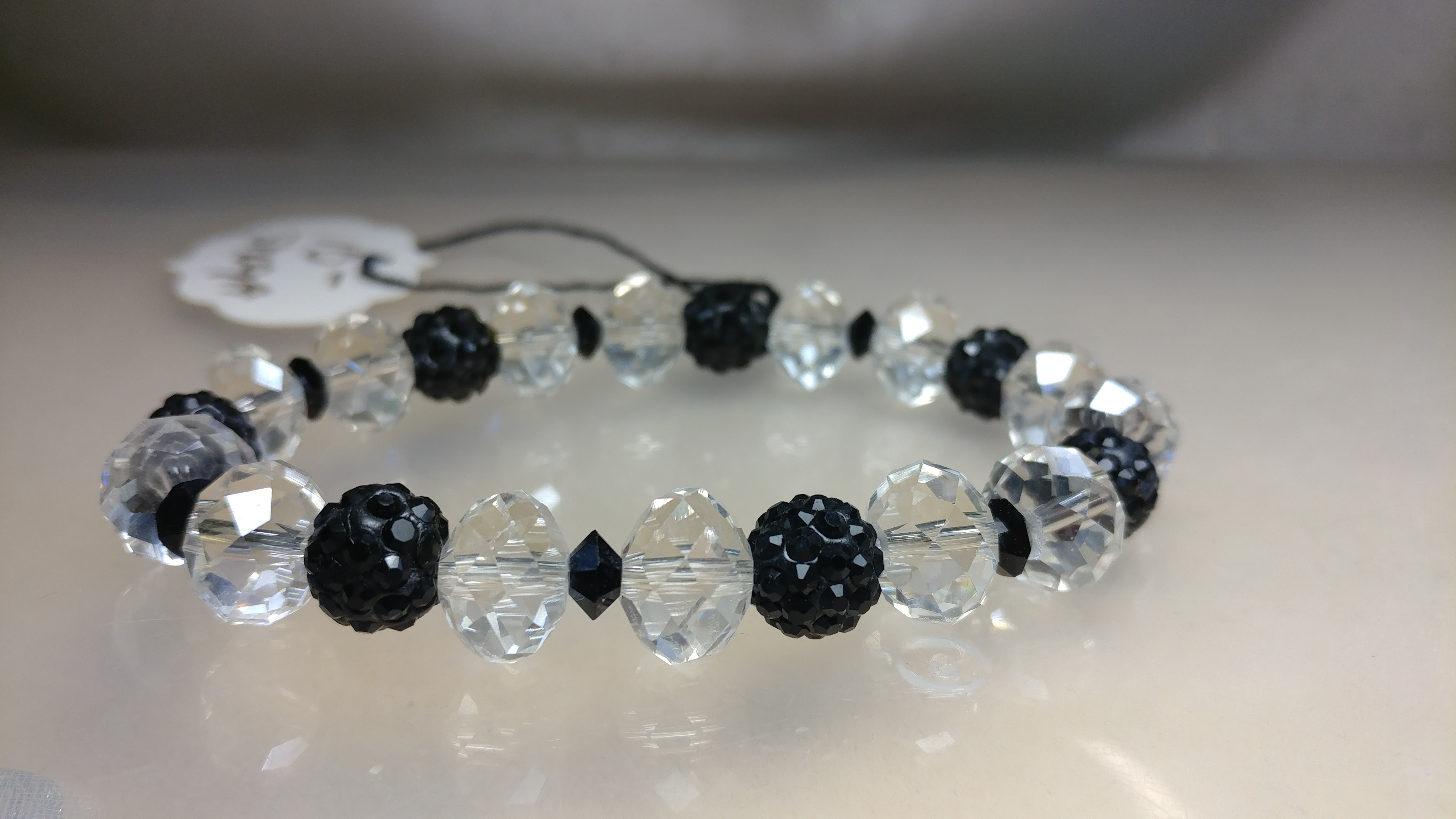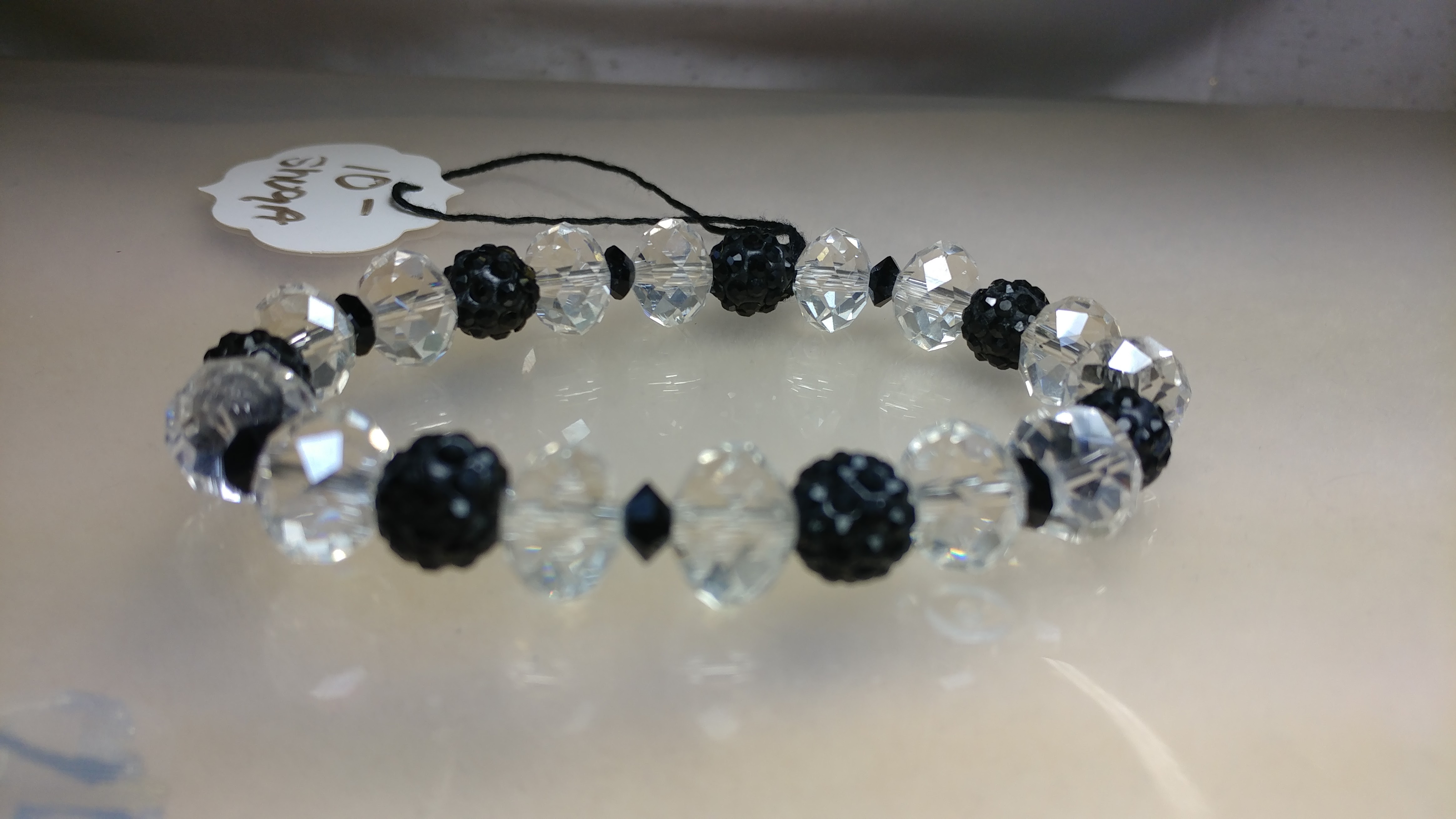 Handmade with clear and black glass crystal beads, black rhinestone pave beads on a clear stretchy cord.