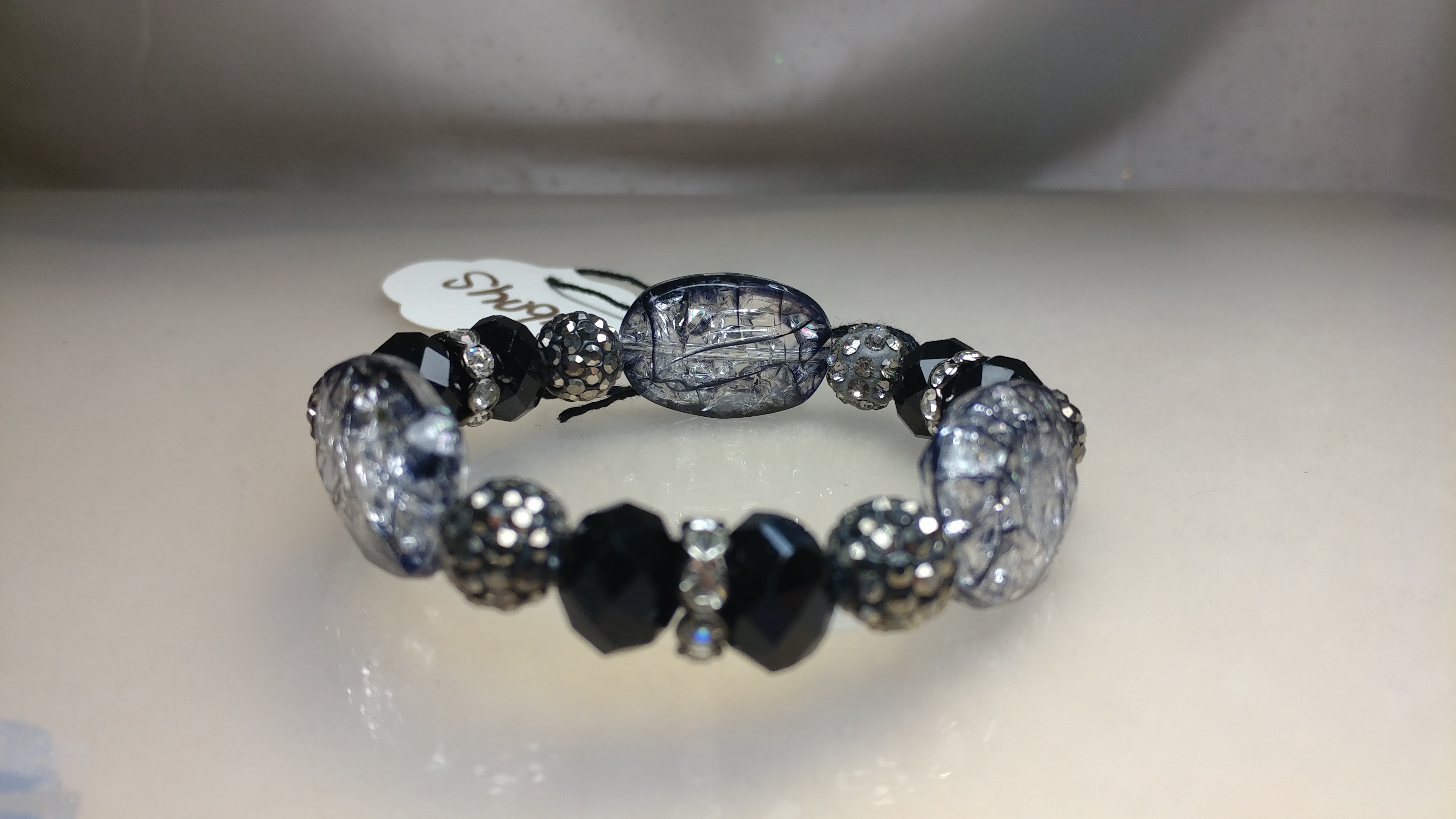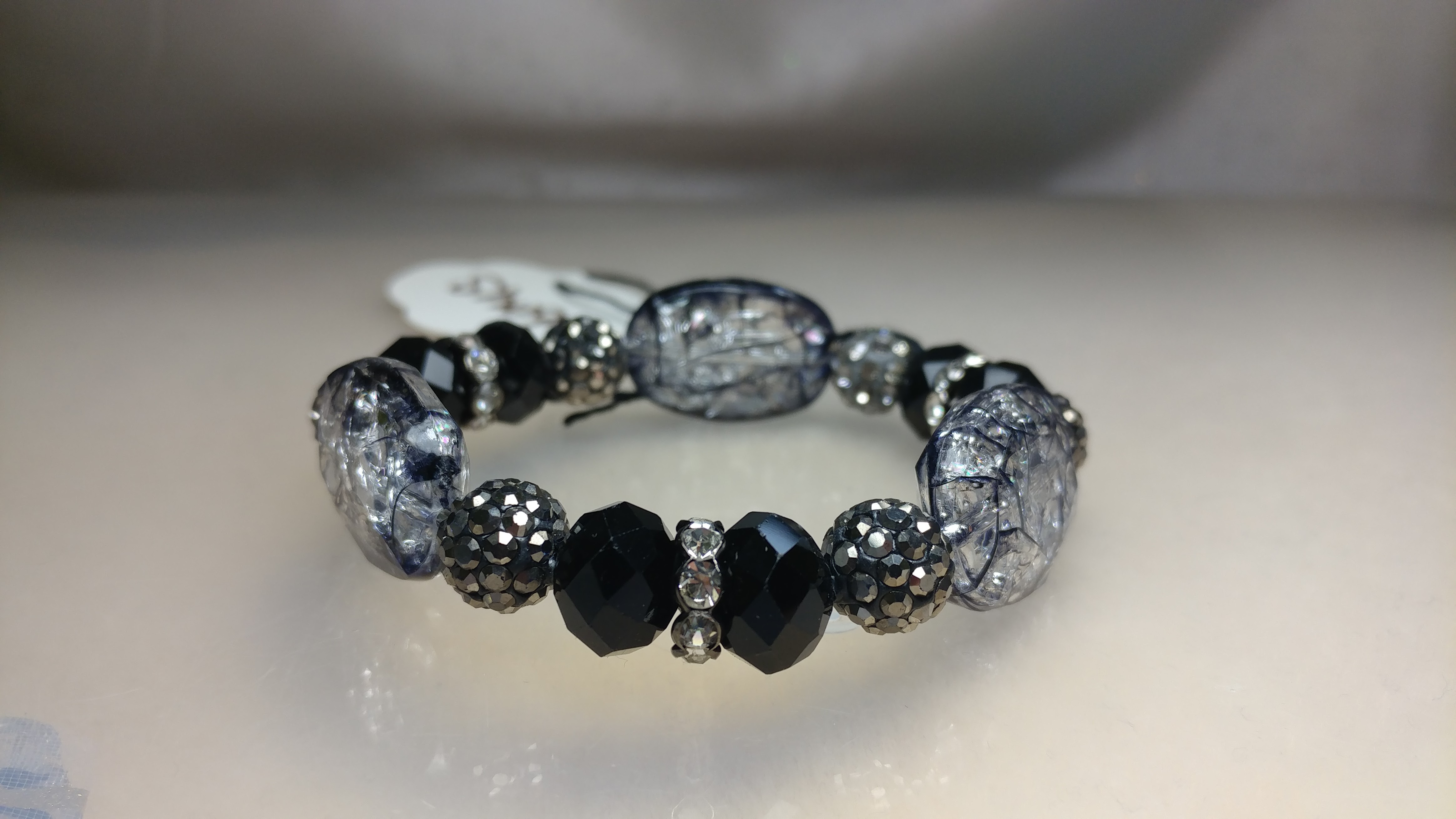 Handmade with large acrylic beads, black crystal beads, gray rhinestone pave beads, silver clear rhinestone spacers on a clear stretchy cord.