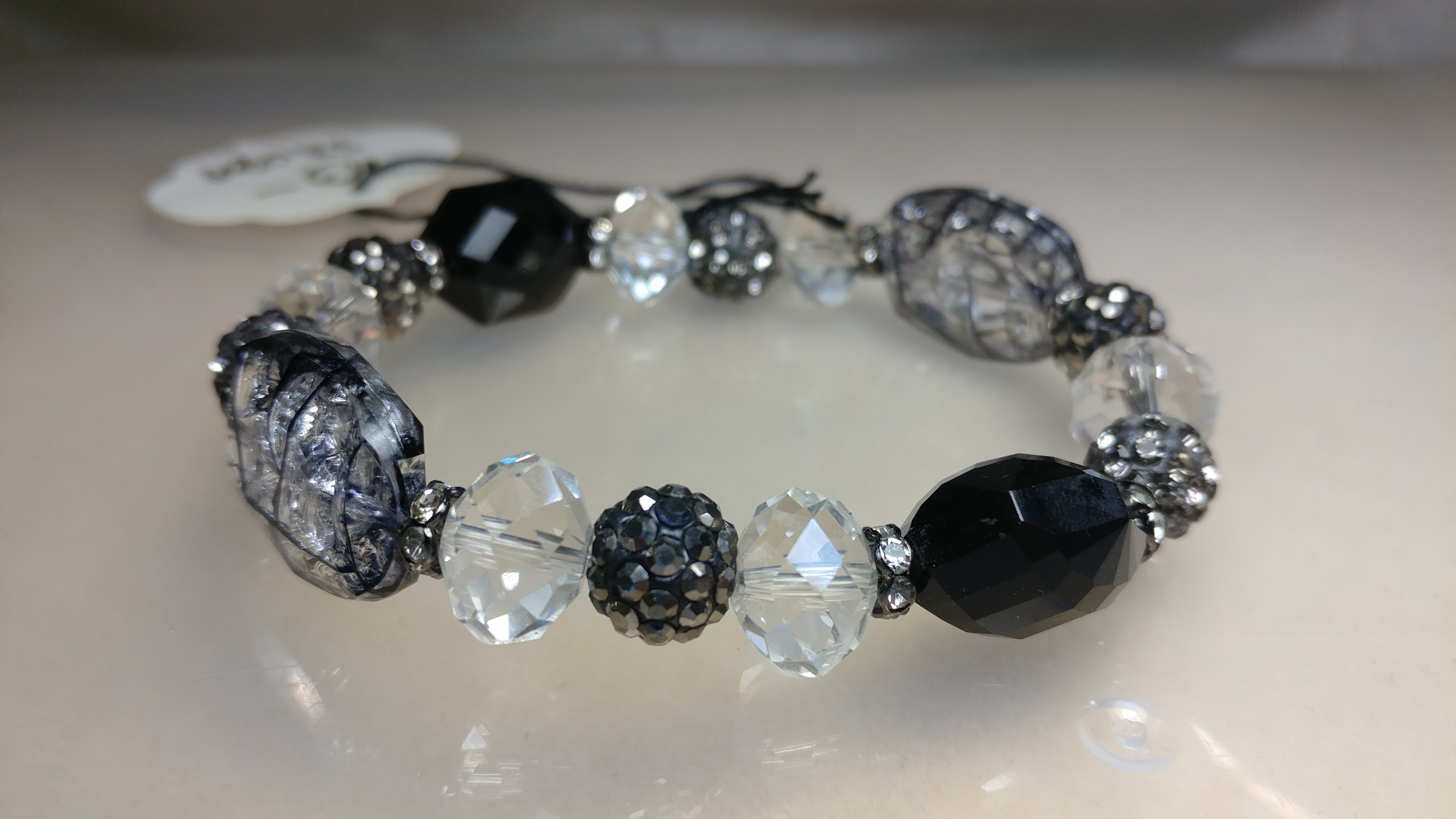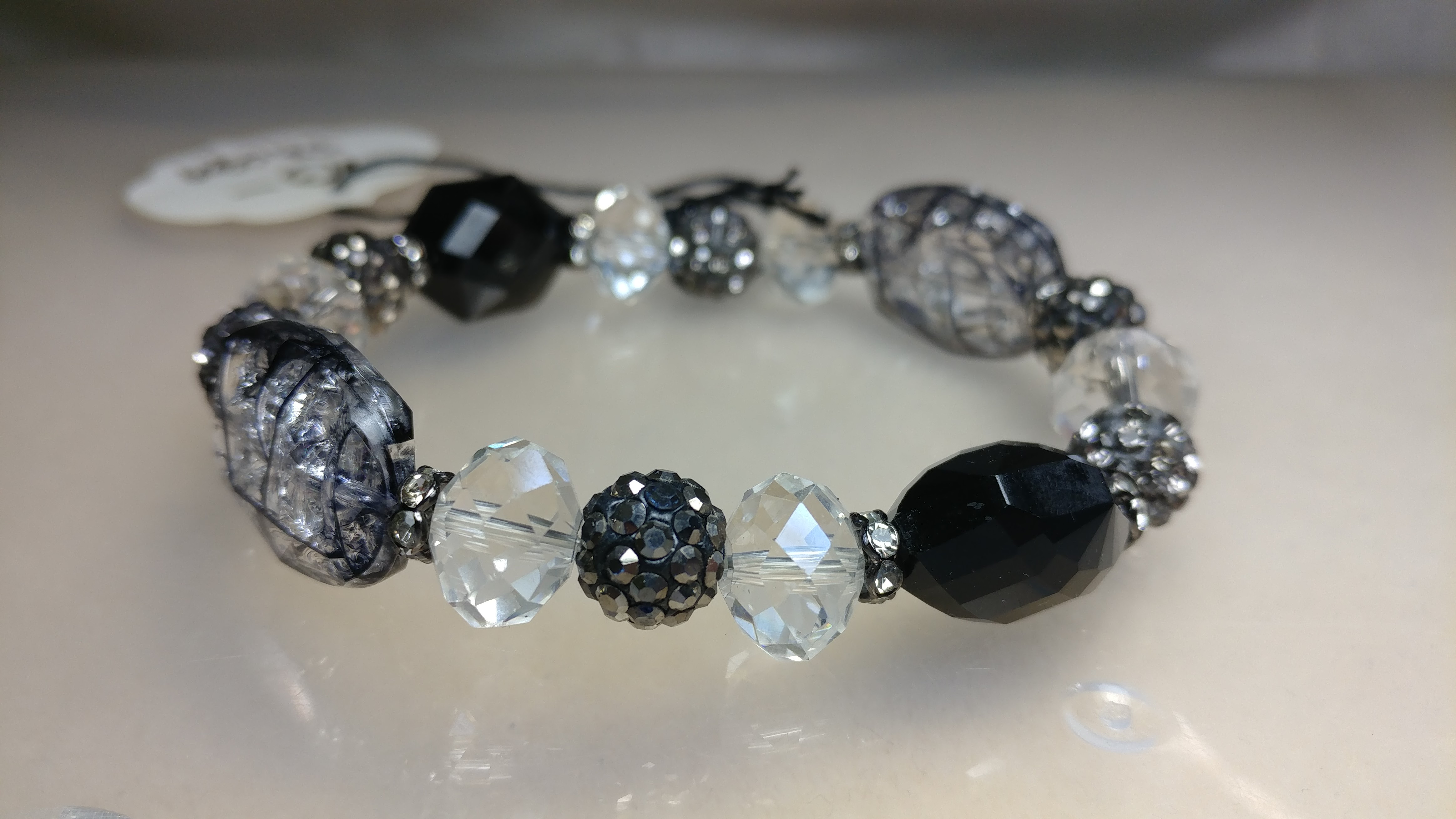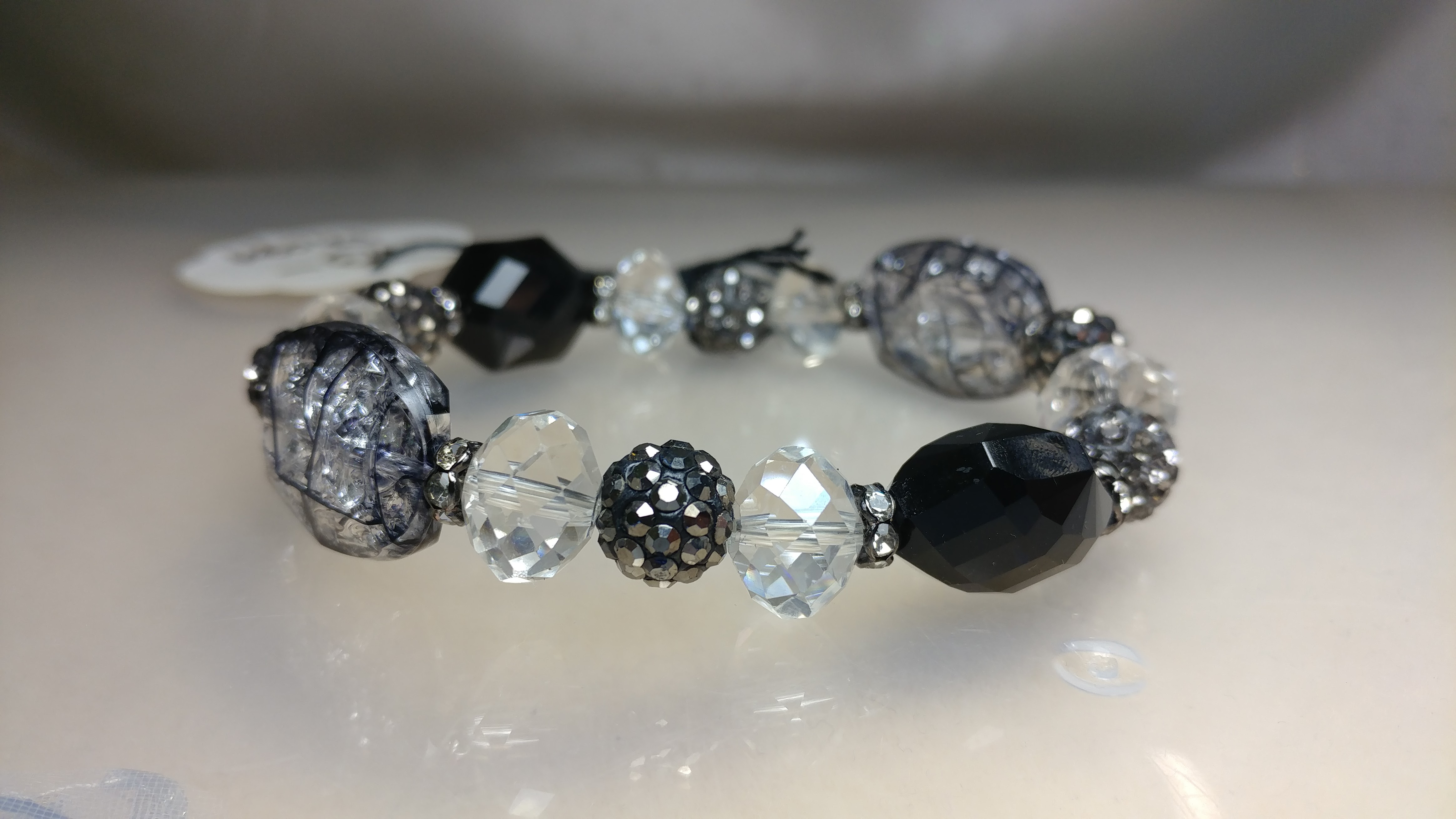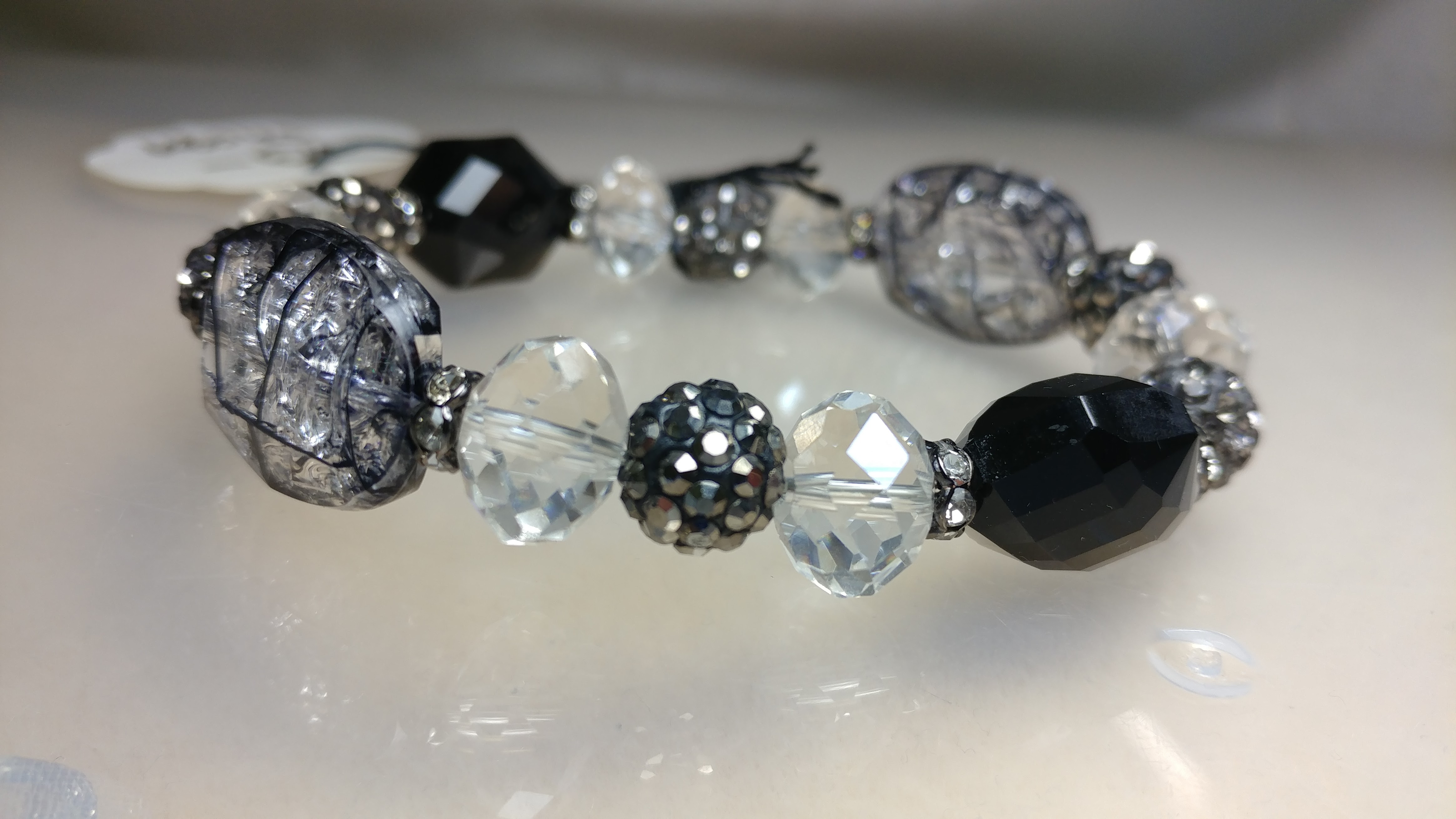 Handmade with large acrylic beads, black and clear crystal beads, gray rhinestone pave beads, silver clear rhinestone spacers on a clear stretchy cord.