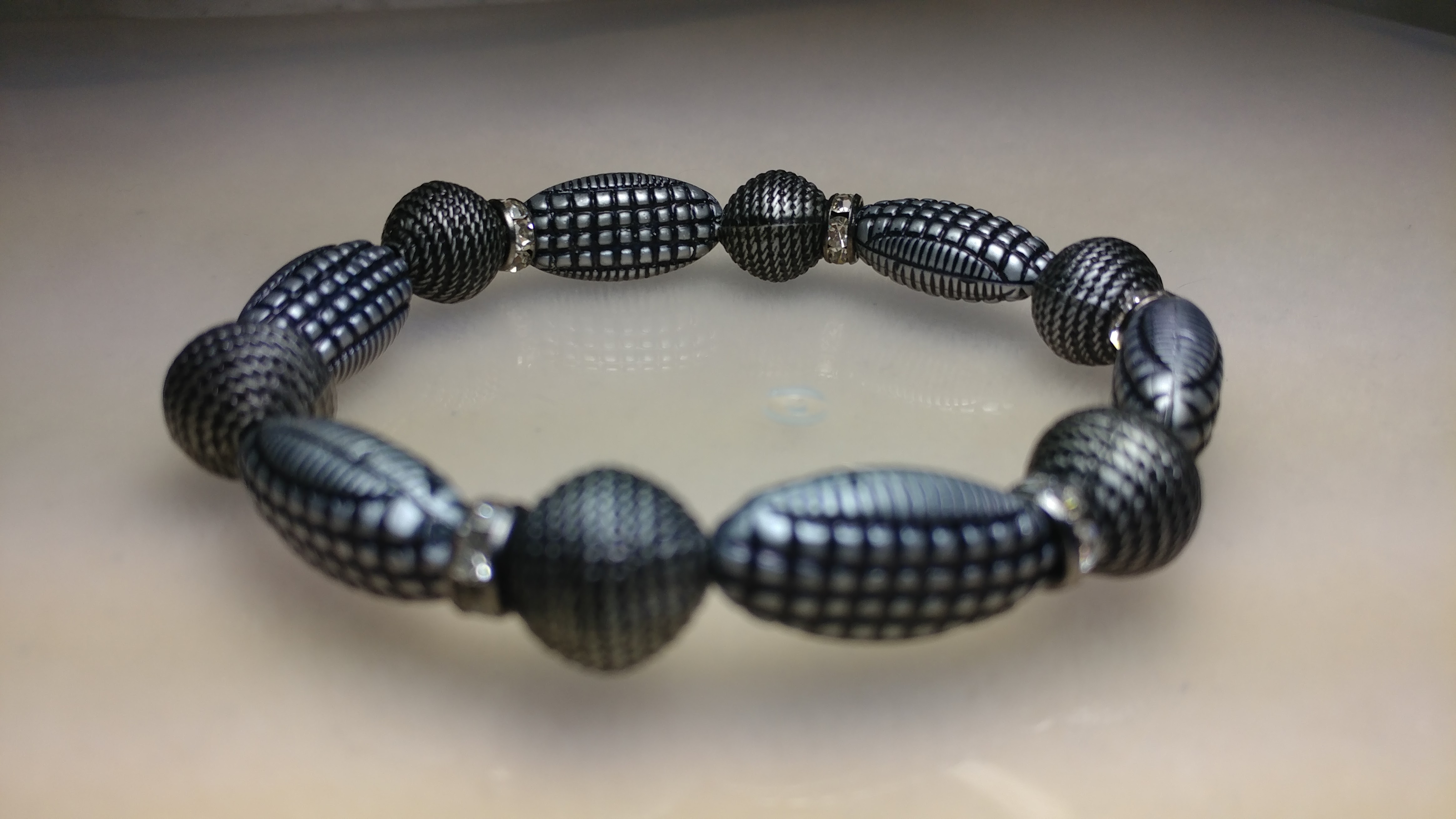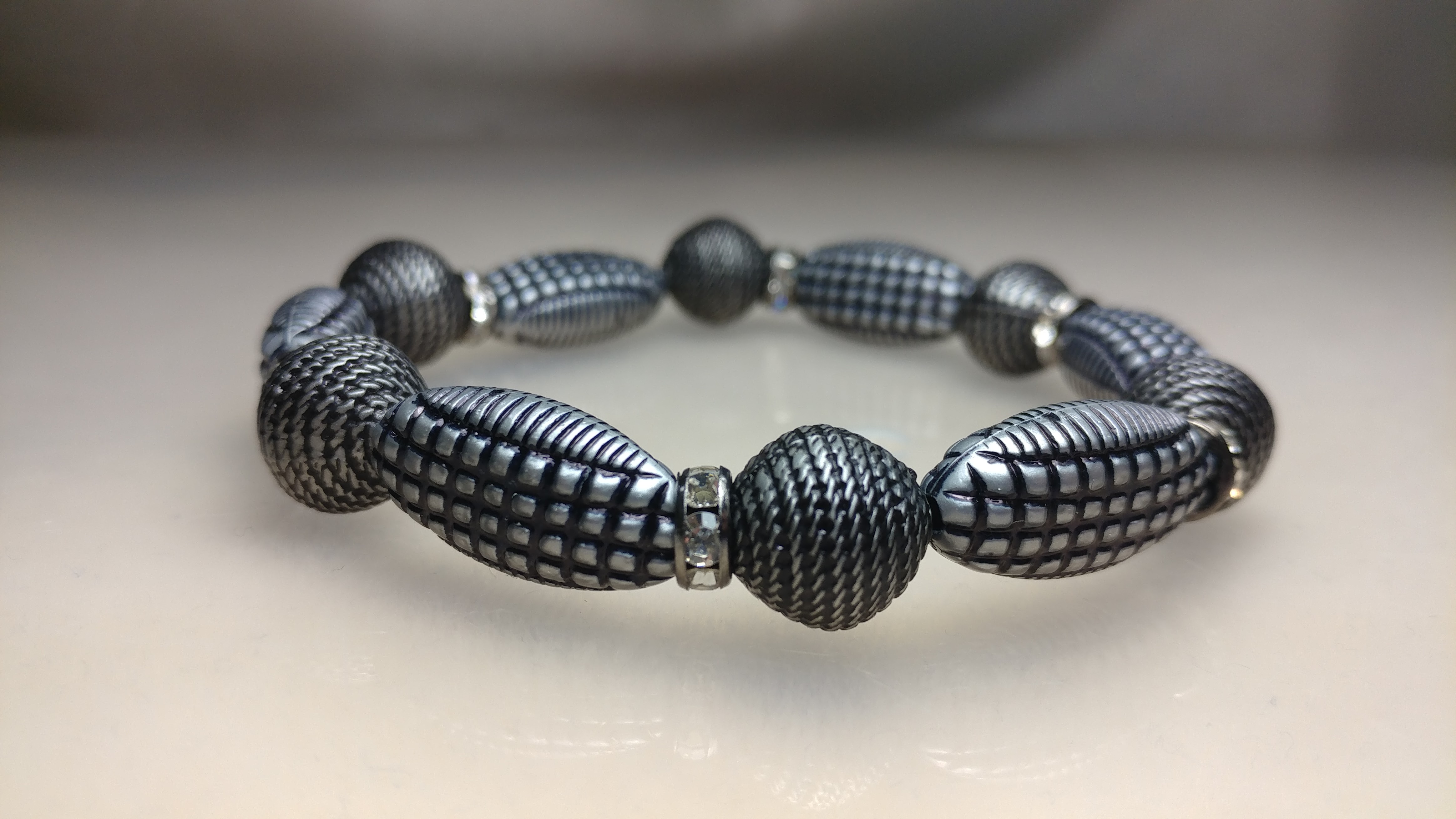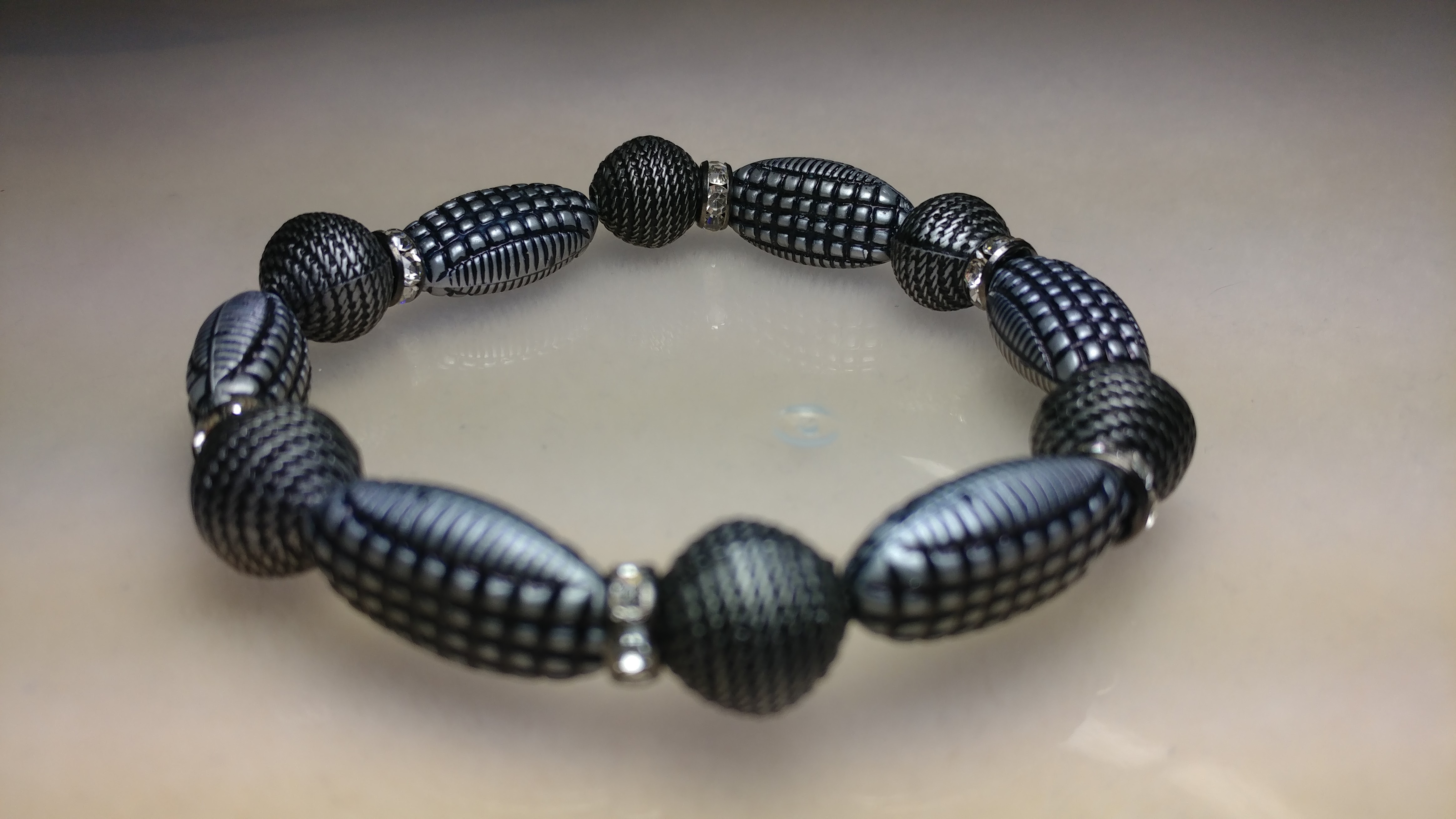 Made with acrylic beads, silver rhinestone spacers on a clear stretchy cord.