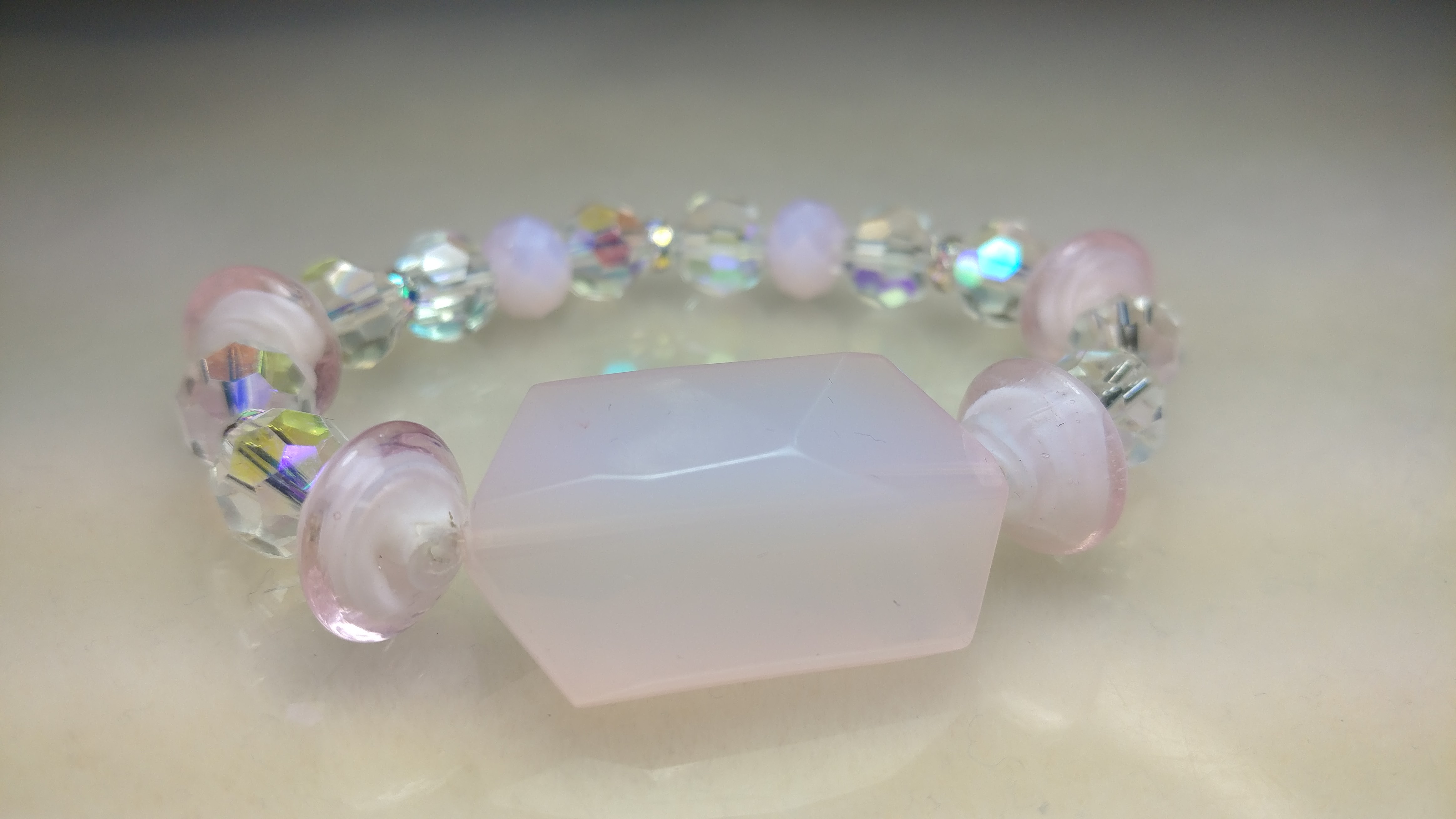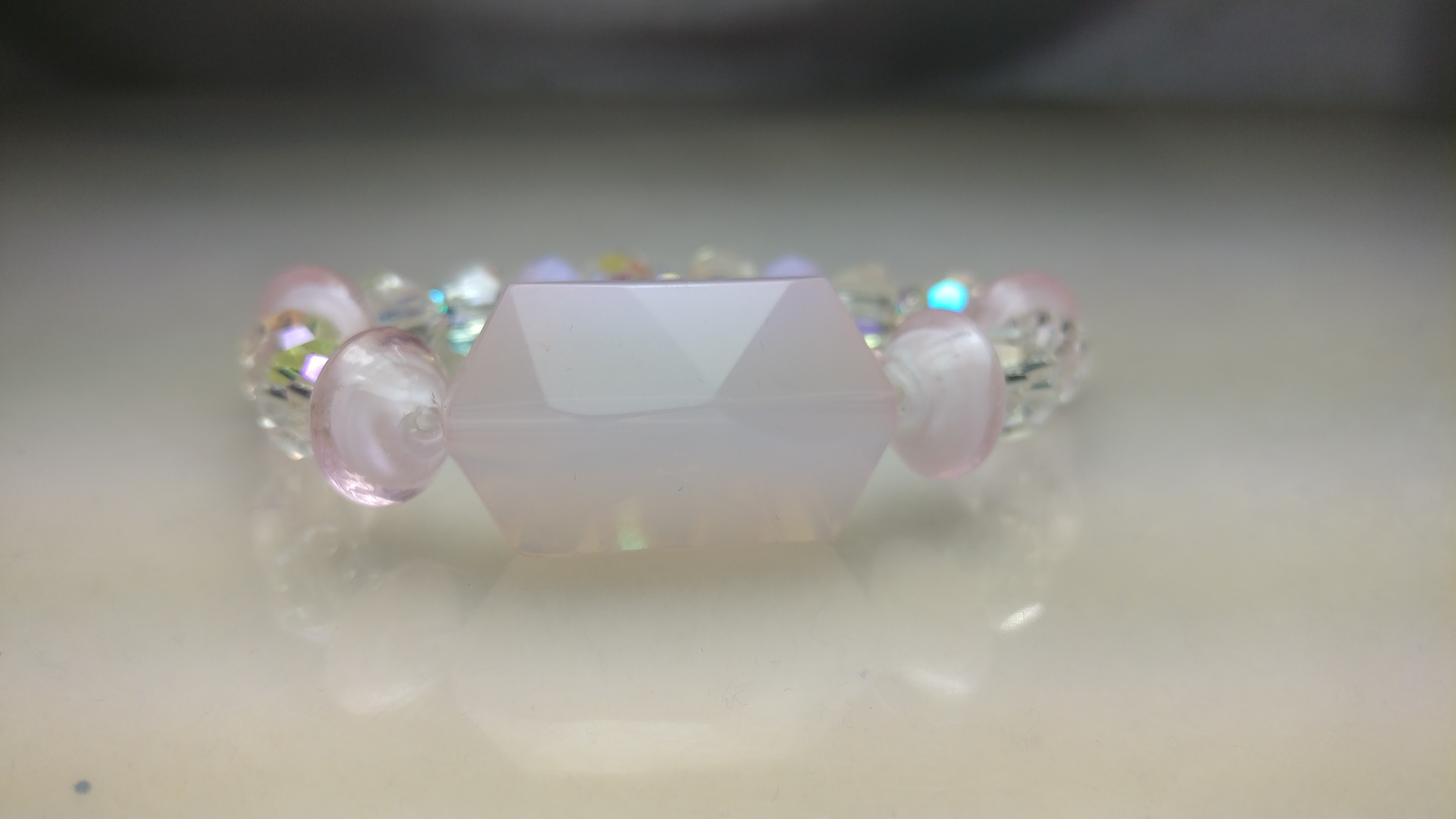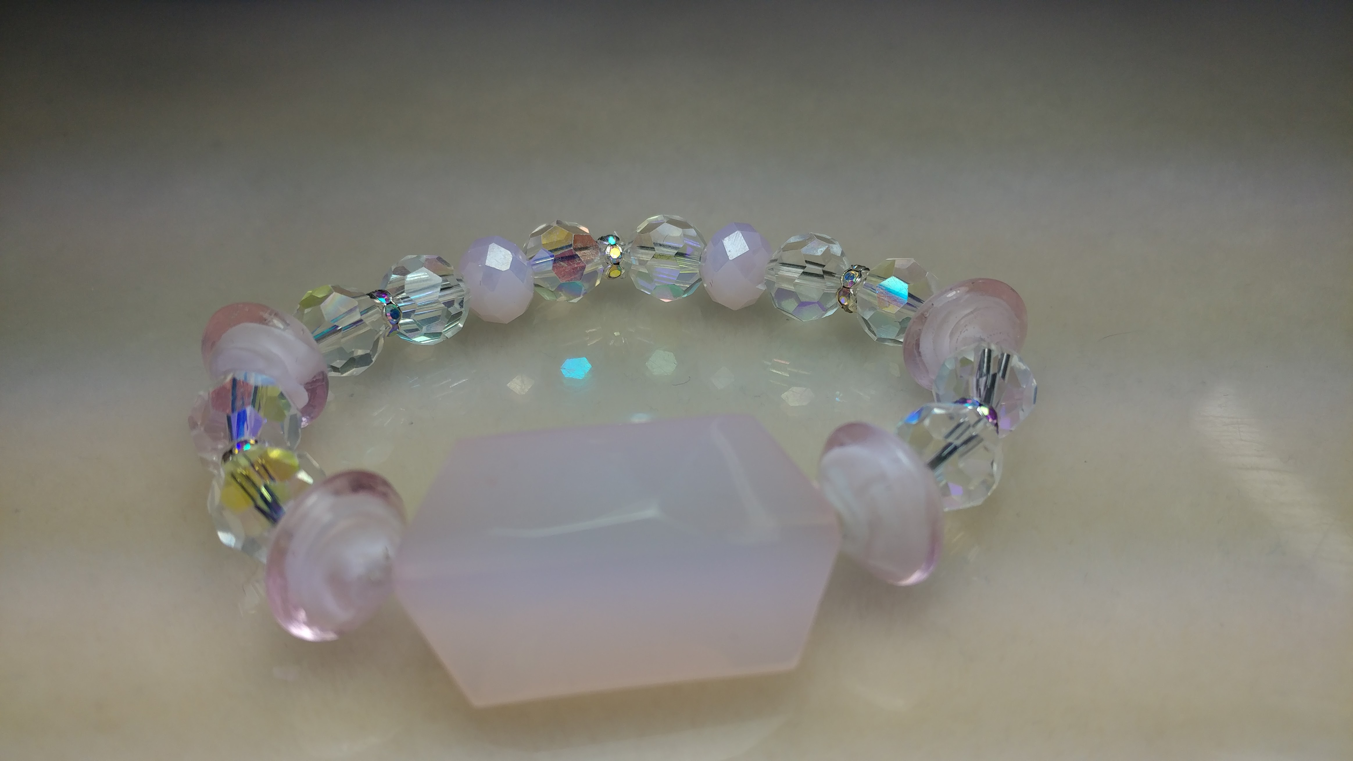 Made with pink and clear glass bead accented with AB silver rhinestone spacers on a clear stretchy cord.