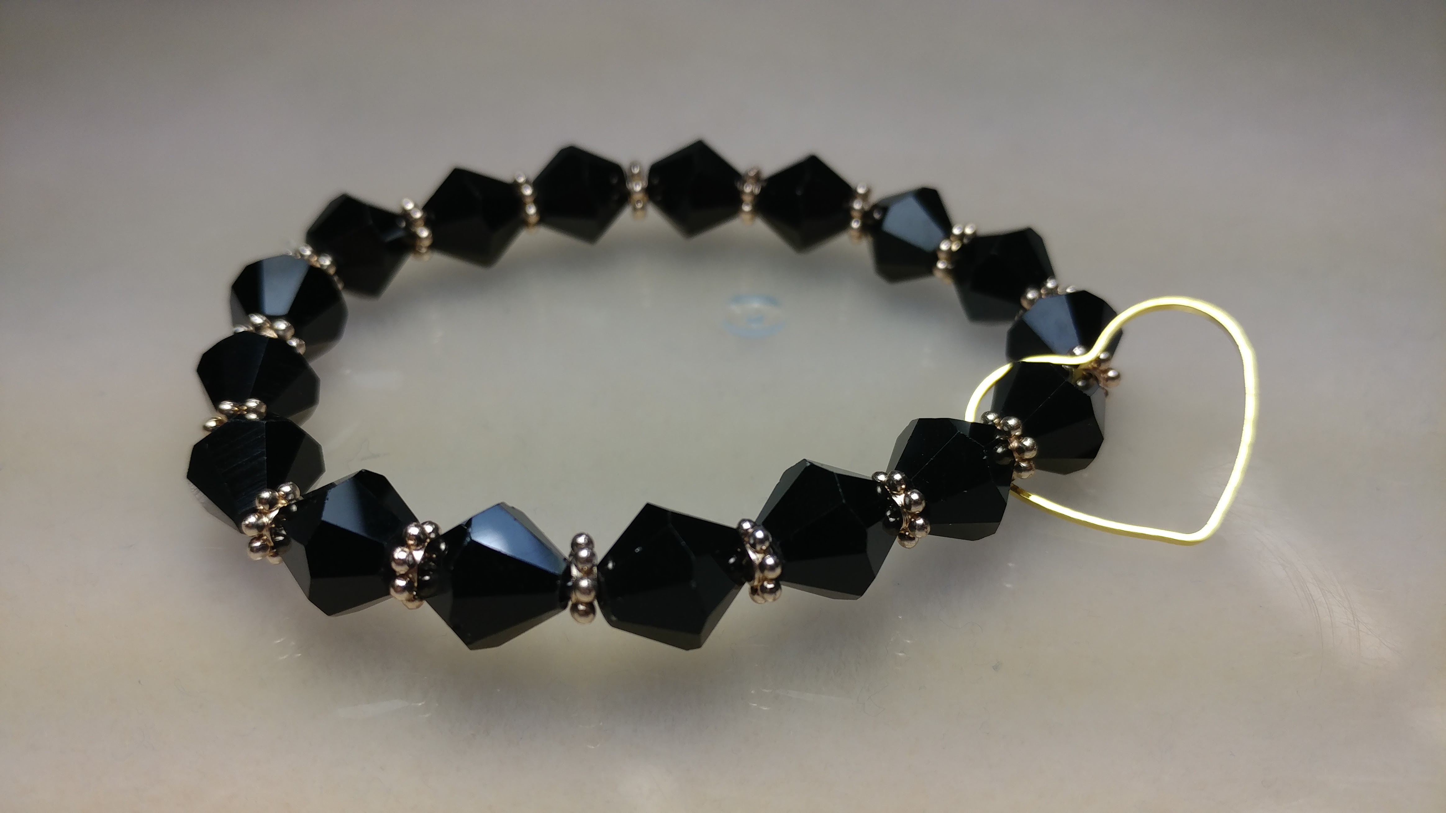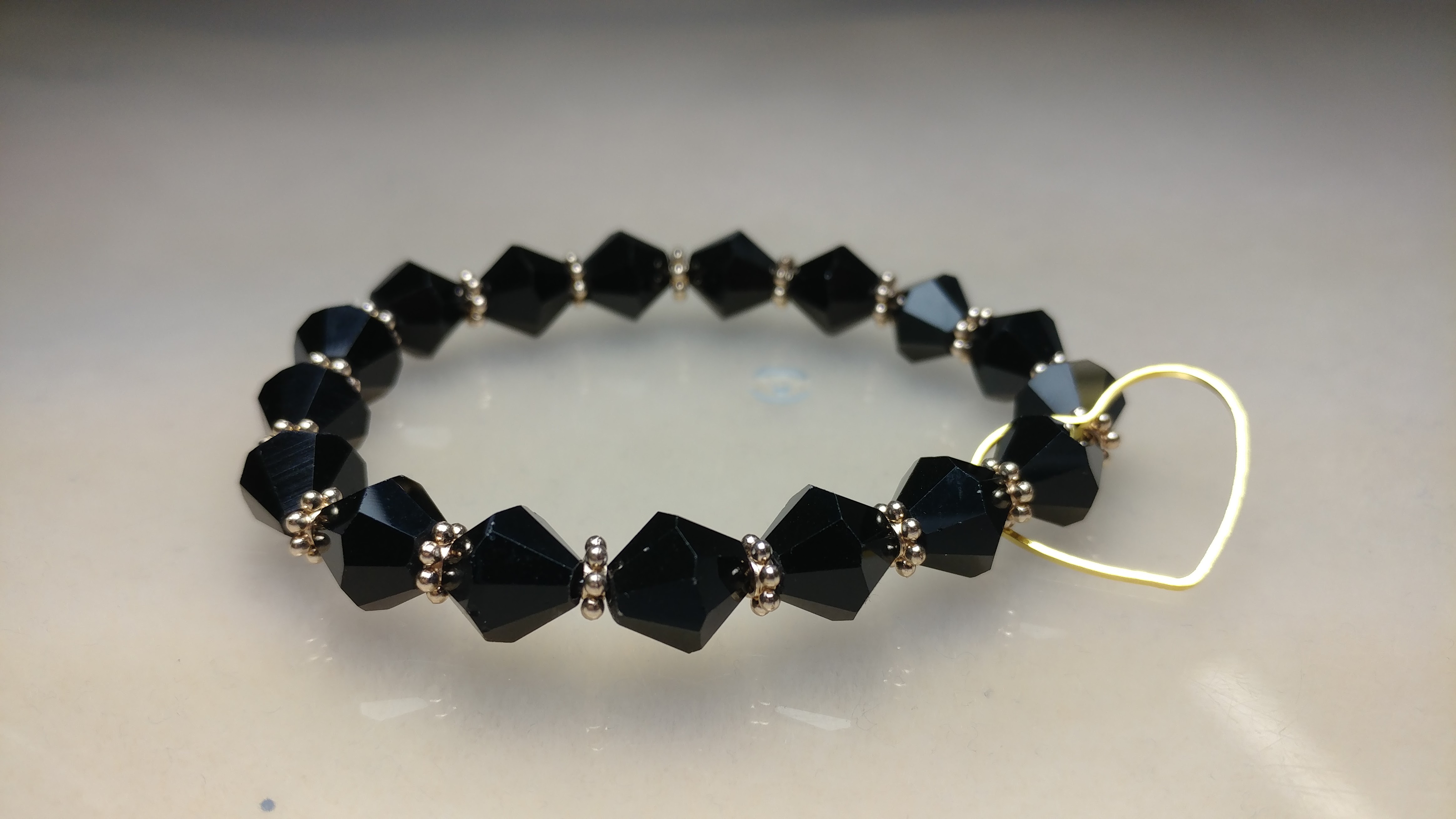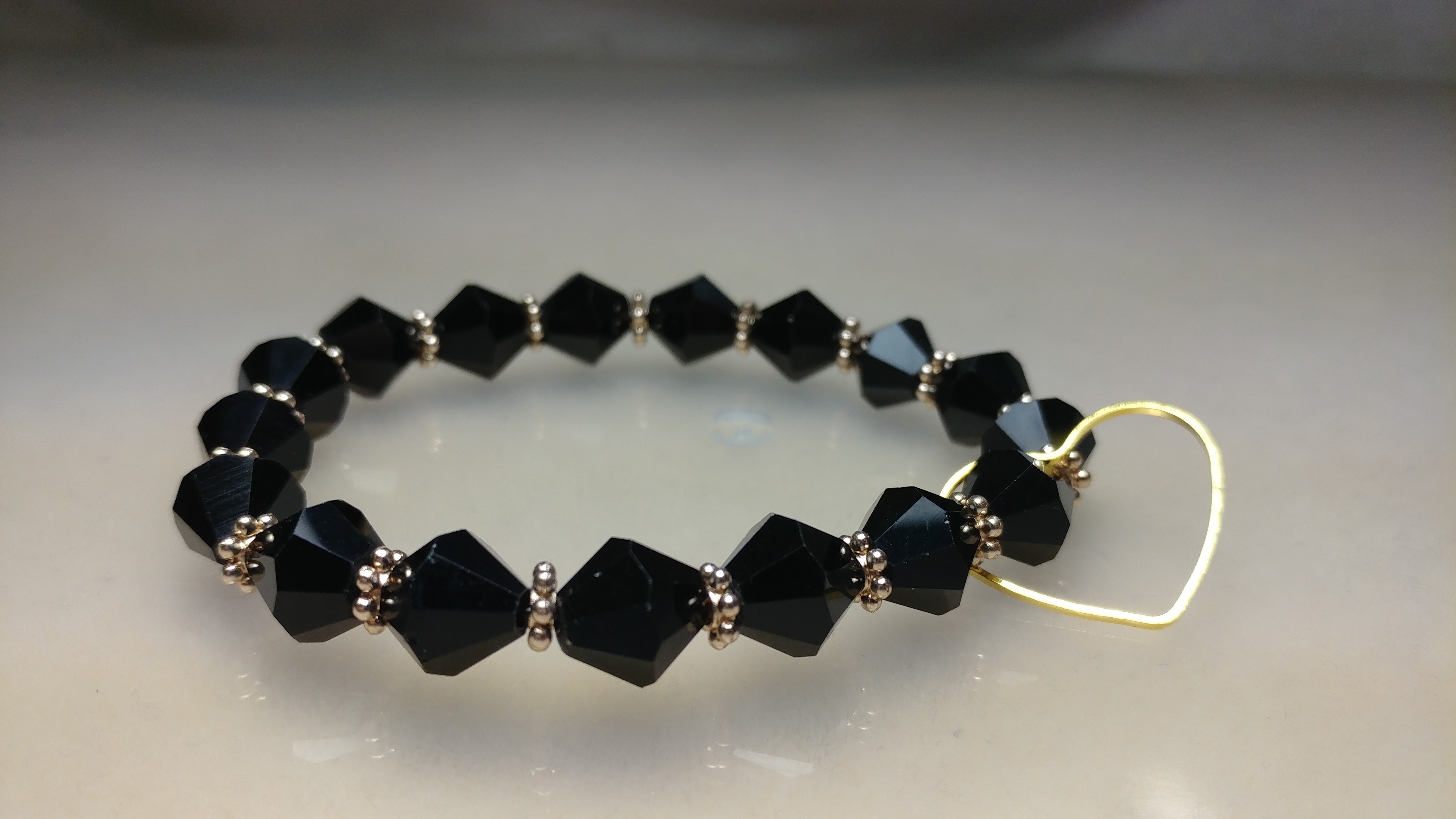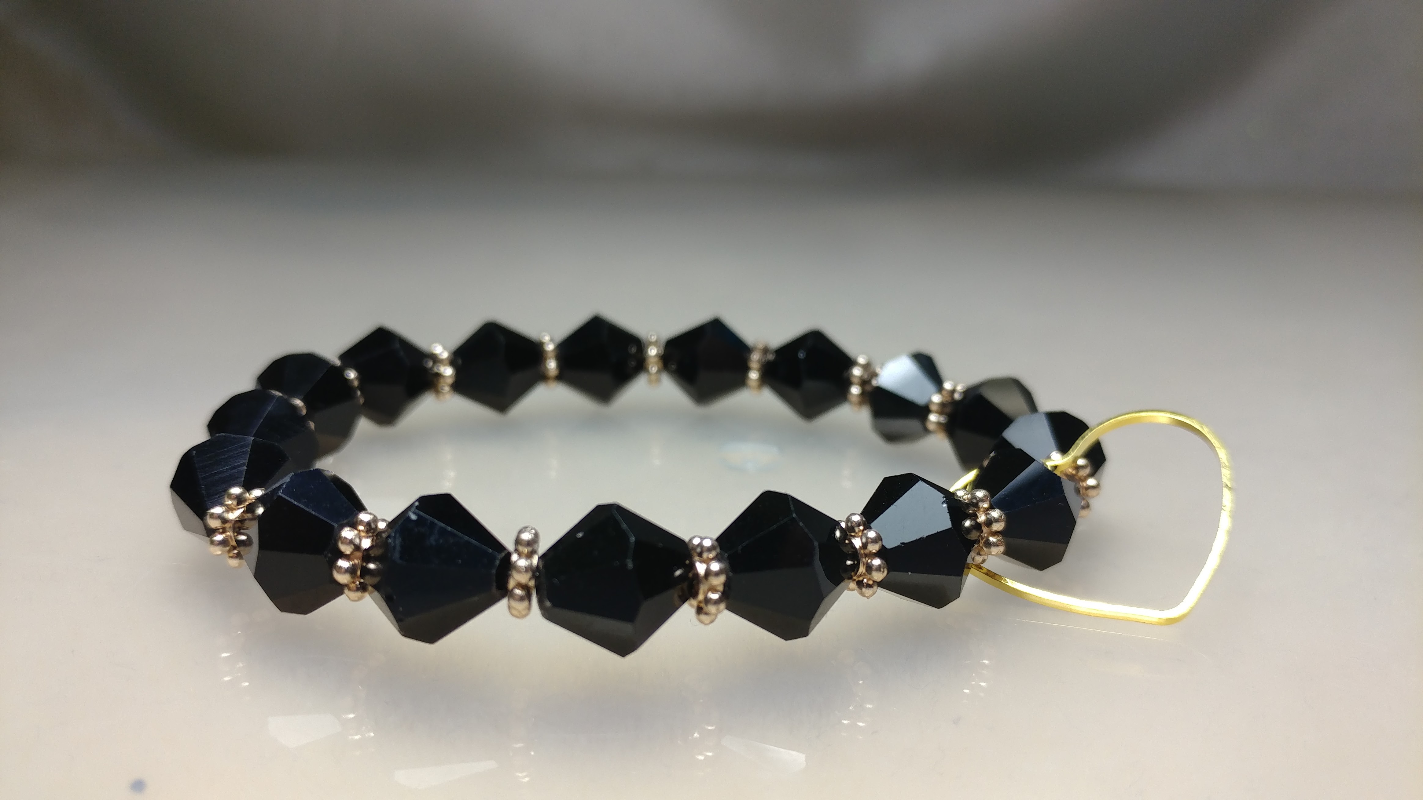Handmade with black glass beads accented with gold spacers on a clear stretchy cord.